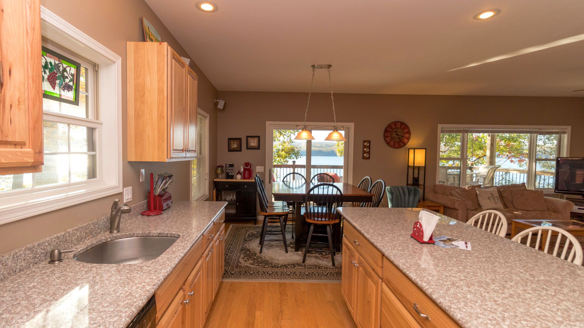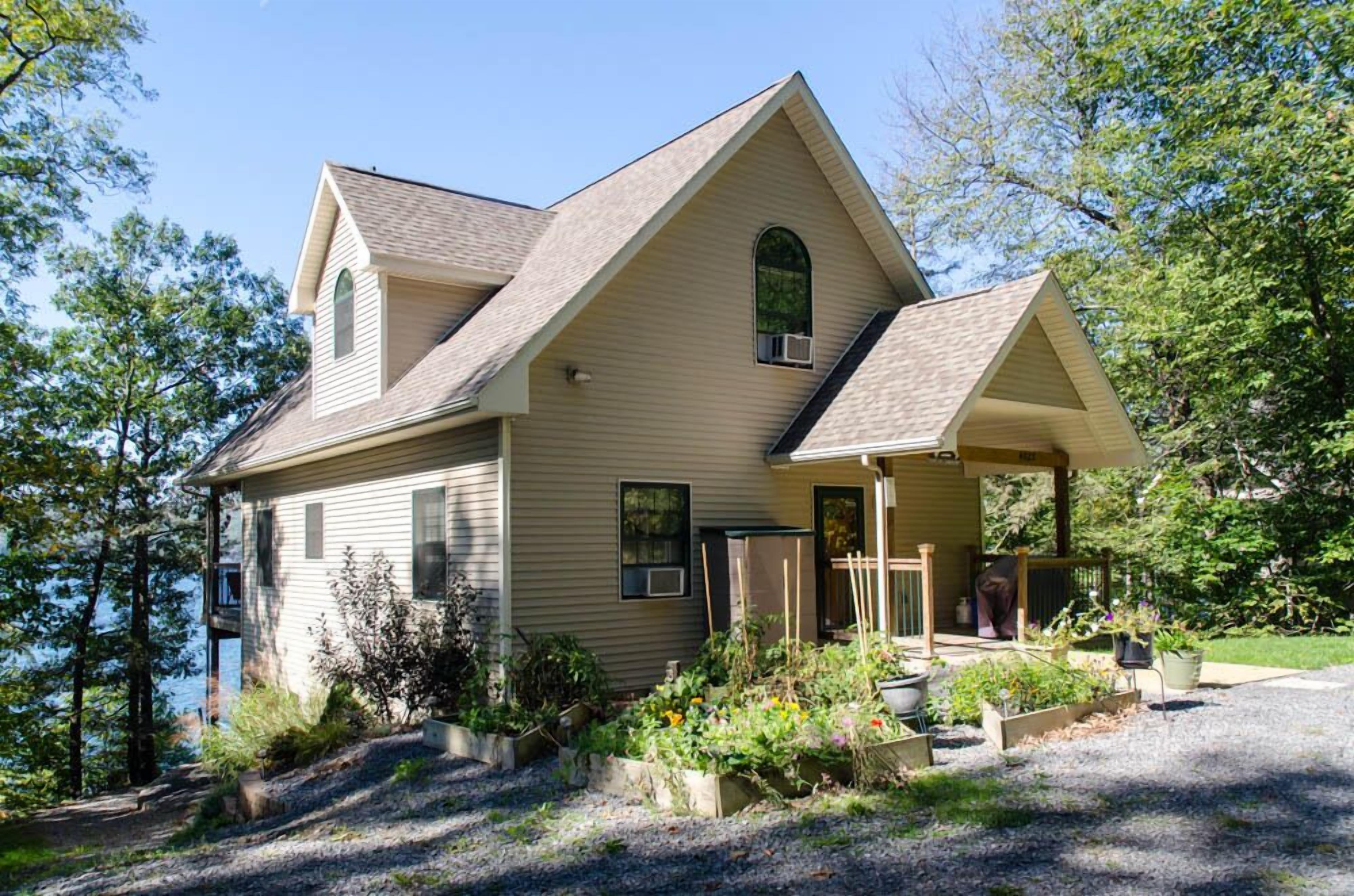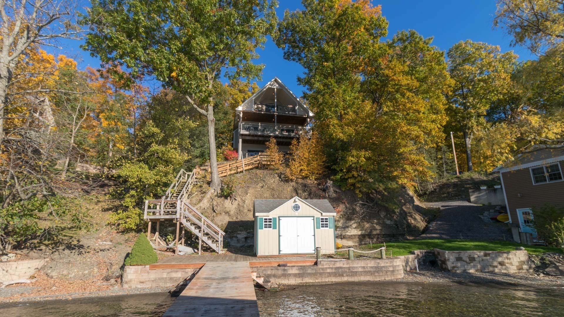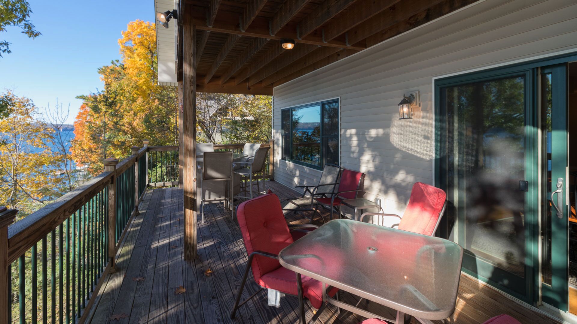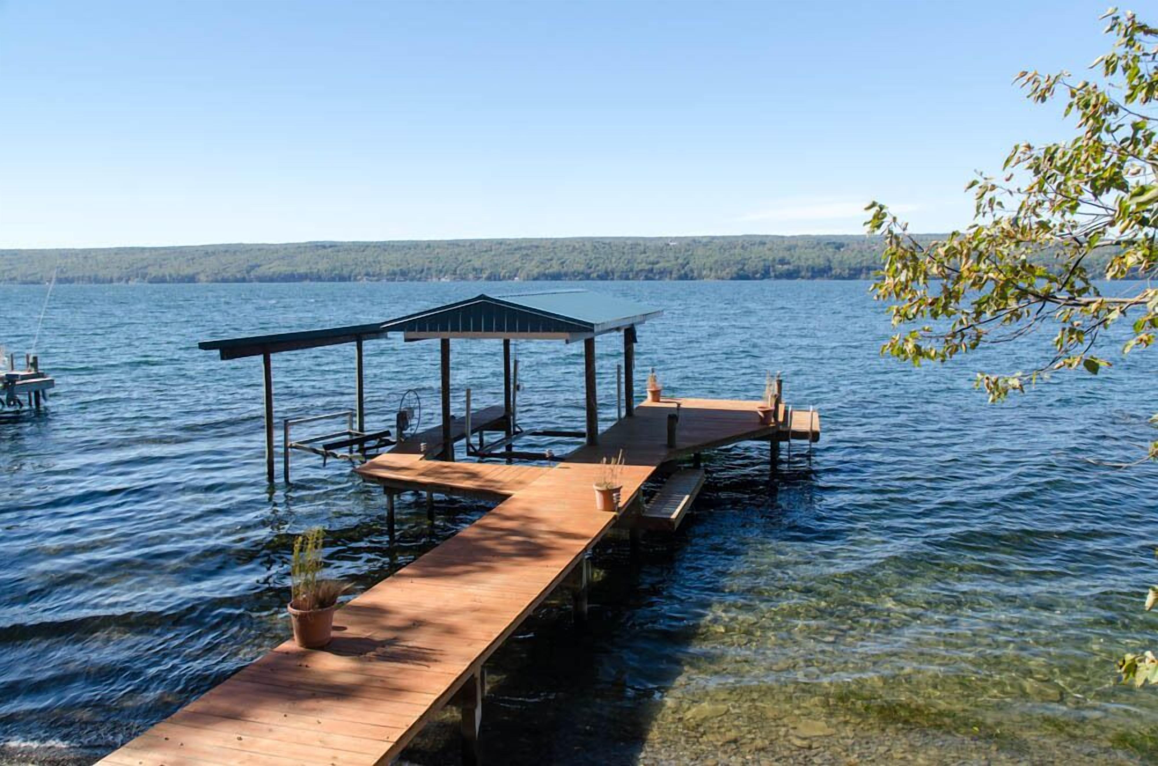 English Lakehouse:"Spectacular views on the Seneca Lake Wine Trail" Welcome to the English Lake House! This highly sought after vacation home is located on the east side of Seneca Lake, where you can enjoy the gorgeous sunsets of the Finger Lakes from the comfort of three levels of decks, or right by the lake on more than 100 feet of gradual entry lakefront. With ample parking for five cars, and dedicated common facilities on two separate levels, English Lake House is the perfect retreat for two families vacationing together. Entering the home, you are greeted with an open floor plan for the main common areas. The kitchen is both spacious and has enough counter space to cook meals for the whole family. An island offers seating for three in the kitchen, while a dining table that can seat eight offers views of the lake through the sliding glass doors. Opposite the kitchen and dining area, you'll find the living area. A comfy couch, recliner, and overstuffed armchair offer seating in the living area, while you watch TV on the large flat screen TV [which comes with HBO, Showtime and a DVR], enjoy the cozy fireplace, or just enjoy the view through the large, lake-facing, picture window. On this main floor, those with limited mobility will enjoy the convenience of having a spacious bedroom with a queen bed, flat-screen TV, a full bathroom, as well as access to a covered deck that spans the entire width of the house. Full-size laundry facilities are also located on this floor.The upper floor hosts the master bedroom with king size bed, flat-screen TV, vaulted ceiling, and sliding glass doors that let you enjoy the view from inside the bedroom, or on the private covered deck that spans the width of the home. An additional bedroom on this level faces the rear of the property, and has one queen bed and one full. A full bathroom with tub is also located on this floor.The lower level of the home features one more bedroom with queen bed and a 3rd full bathroom. Additionally, you will find a second fridge, and common area living space with flat-screen TV. This room also encompasses a day bed, with a trundle bed, and there is a second set of stackable laundry facilities. A walk-out door on this level will take you down to the lakefront.A/C windows units are located in every bedroom, along with the main living room to keep you cool on those warm summer days. Additionally, the home gets excellent wireless reception, so you can stay connected to family, and keep them up to date with your vacation photos!Are you ready to head outside? Take the stairs to the large permanent dock, with covered boat lift, and kayaks for your boating enjoyment. A gas grill for cooking is located on the main level of the home by the front door, and a fire pit for those late night star gazers can be found on the lakefront. The natural entry beach is great for beginning swimmers, or children to play in the shallows, and the fishing on Seneca Lake can't be beat!* Boats are not able to be tied to the dock.** 4 Wheel Drive Vehicle or All Wheel Drive Recommended for the Drive-way.**Please Note: GPS directions are not accurate. You must use the Driving Directions provided by Finger Lakes Premier Properties.Occupancy: This property is closely monitored for responsible renting. The maximum occupancy of each home is the number of guests allowed on the premises at any given time. This includes both day and overnight guests. Note: 1. Smoking is not allowed in any rental property.2. Homes are not handicap accessible, unless stated in description.3. Air conditioning is not available unless otherwise noted as available in the amenities. If air conditioning is noted as available, this is considered a seasonal amenity and is only available May 15 - October 15.4. Where pets are allowed it is indicated. Otherwise, pets are not allowed. Homes are not guaranteed allergen-free, even those that do not allow pets.5. Docking capabilities may vary based on current water levels. Docking is not guaranteed if water levels are low and/or high due to seasonal weather and climate changes.6. *Outdoor amenities, including furniture/watercraft are not available between October 15 - May 15*