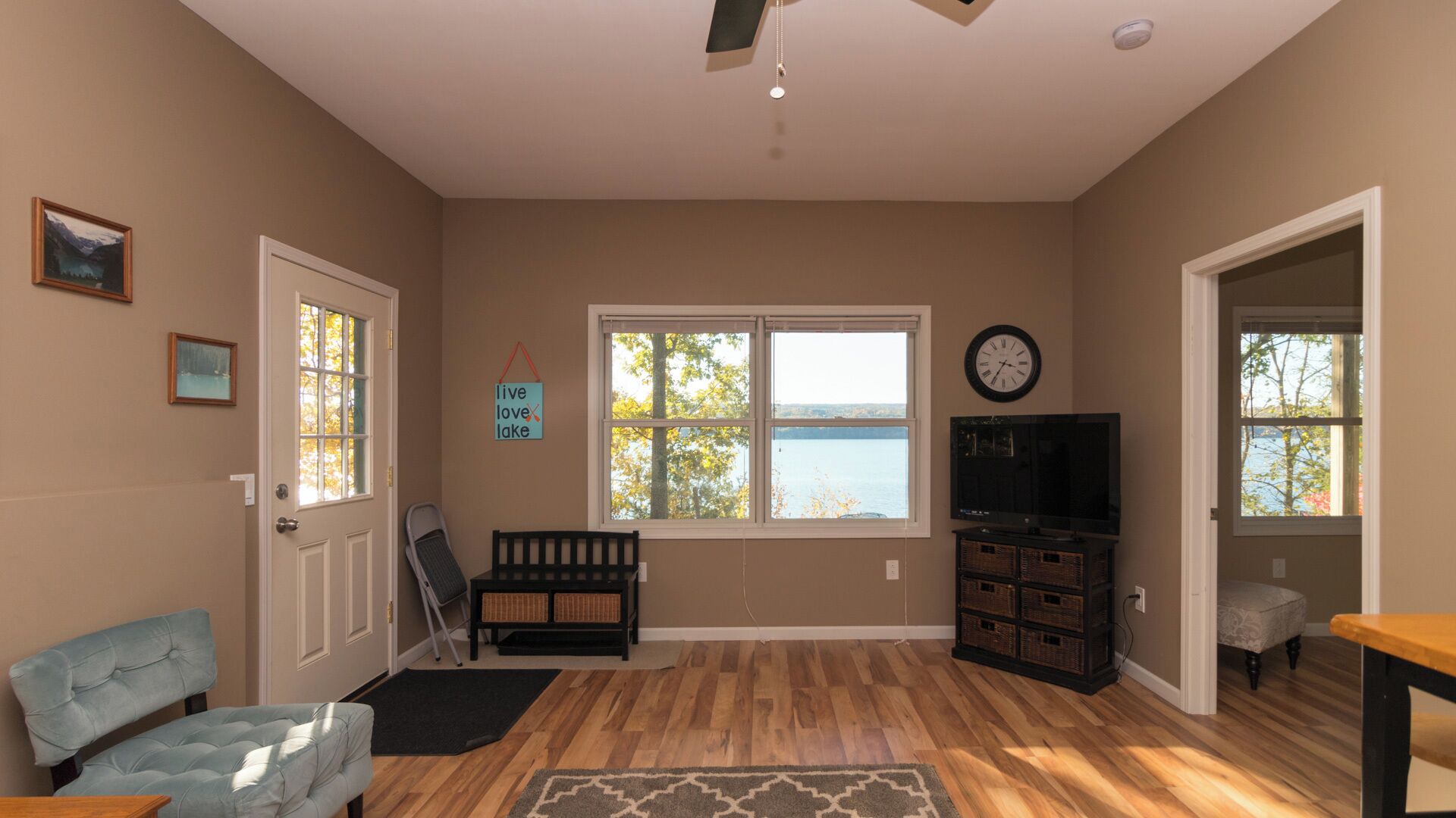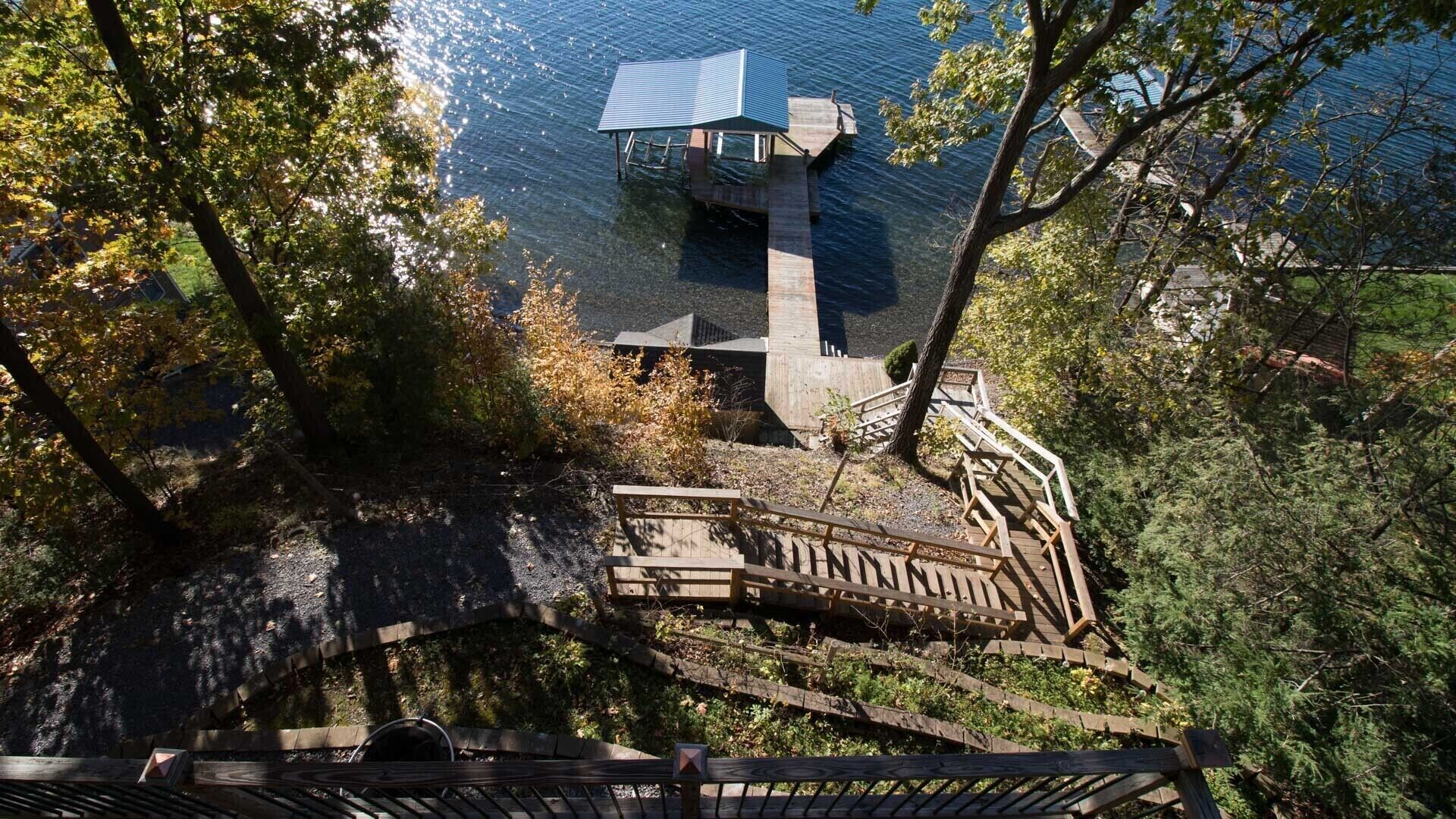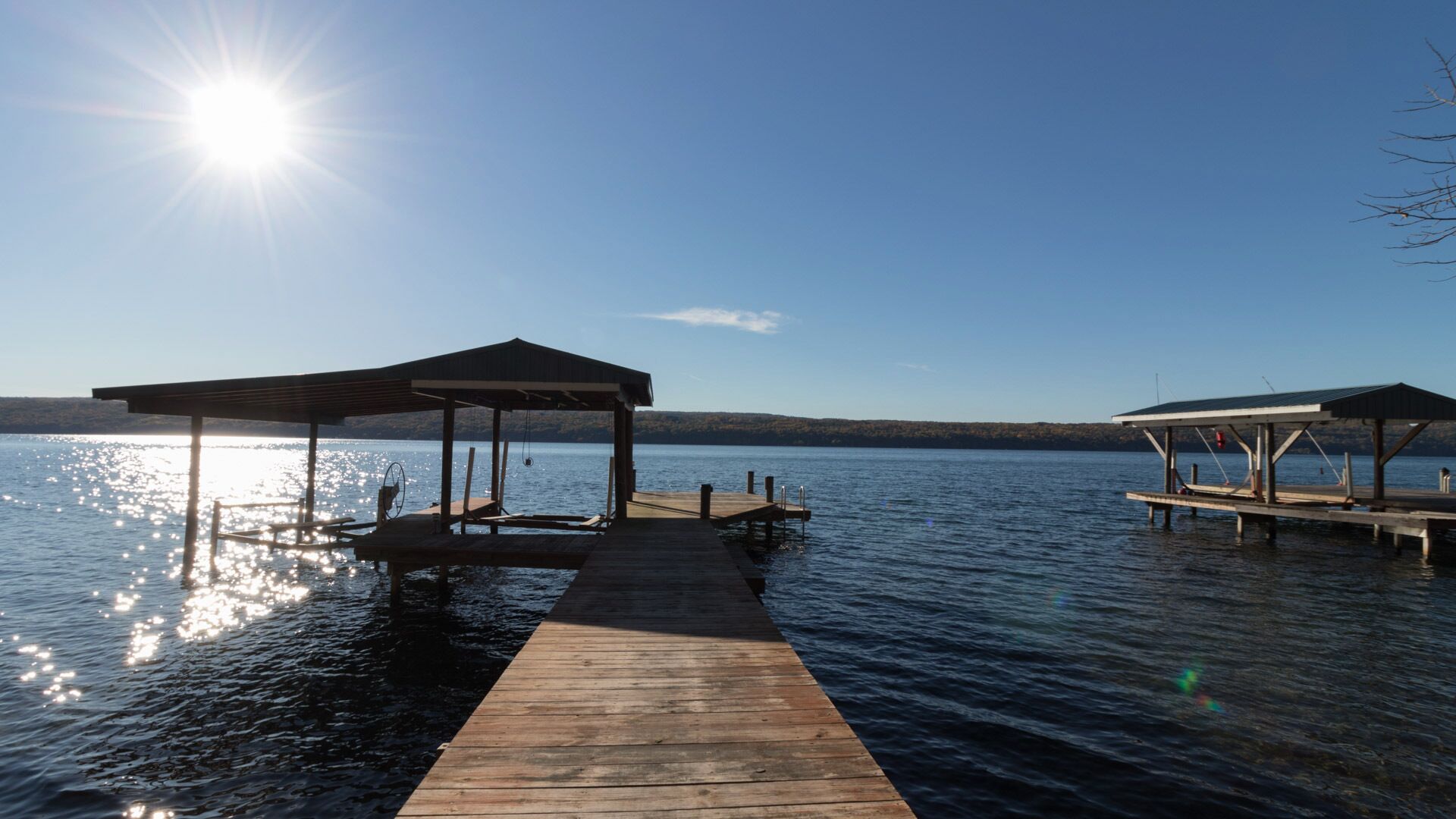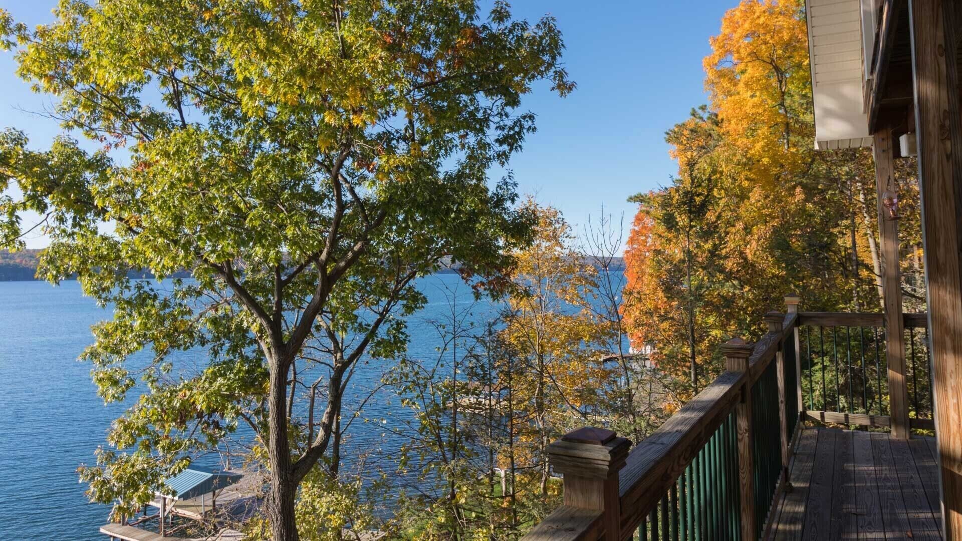 English Lakehouse:"Spectacular views on the Seneca Lake Wine Trail" Welcome to the English Lake House! This highly sought after vacation home is located on the east side of Seneca Lake, where you can enjoy the gorgeous sunsets of the Finger Lakes from the comfort of three levels of decks, or right by the lake on more than 100 feet of gradual entry lakefront. With ample parking for five cars, and dedicated common facilities on two separate levels, English Lake House is the perfect retreat for two families vacationing together. Entering the home, you are greeted with an open floor plan for the main common areas. The kitchen is both spacious and has enough counter space to cook meals for the whole family. An island offers seating for three in the kitchen, while a dining table that can seat eight offers views of the lake through the sliding glass doors. Opposite the kitchen and dining area, you'll find the living area. A comfy couch, recliner, and overstuffed armchair offer seating in the living area, while you watch TV on the large flat screen TV [which comes with HBO, Showtime and a DVR], enjoy the cozy fireplace, or just enjoy the view through the large, lake-facing, picture window. On this main floor, those with limited mobility will enjoy the convenience of having a spacious bedroom with a queen bed, flat-screen TV, a full bathroom, as well as access to a covered deck that spans the entire width of the house. Full-size laundry facilities are also located on this floor.The upper floor hosts the master bedroom with king size bed, flat-screen TV, vaulted ceiling, and sliding glass doors that let you enjoy the view from inside the bedroom, or on the private covered deck that spans the width of the home. An additional bedroom on this level faces the rear of the property, and has one queen bed and one full. A full bathroom with tub is also located on this floor.The lower level of the home features one more bedroom with queen bed and a 3rd full bathroom. Additionally, you will find a second fridge, and common area living space with flat-screen TV. This room also encompasses a day bed, with a trundle bed, and there is a second set of stackable laundry facilities. A walk-out door on this level will take you down to the lakefront.A/C windows units are located in every bedroom, along with the main living room to keep you cool on those warm summer days. Additionally, the home gets excellent wireless reception, so you can stay connected to family, and keep them up to date with your vacation photos!Are you ready to head outside? Take the stairs to the large permanent dock, with covered boat lift, and kayaks for your boating enjoyment. A gas grill for cooking is located on the main level of the home by the front door, and a fire pit for those late night star gazers can be found on the lakefront. The natural entry beach is great for beginning swimmers, or children to play in the shallows, and the fishing on Seneca Lake can't be beat!* Boats are not able to be tied to the dock.** 4 Wheel Drive Vehicle or All Wheel Drive Recommended for the Drive-way.**Please Note: GPS directions are not accurate. You must use the Driving Directions provided by Finger Lakes Premier Properties.Occupancy: This property is closely monitored for responsible renting. The maximum occupancy of each home is the number of guests allowed on the premises at any given time. This includes both day and overnight guests. Note: 1. Smoking is not allowed in any rental property.2. Homes are not handicap accessible, unless stated in description.3. Air conditioning is not available unless otherwise noted as available in the amenities. If air conditioning is noted as available, this is considered a seasonal amenity and is only available May 15 - October 15.4. Where pets are allowed it is indicated. Otherwise, pets are not allowed. Homes are not guaranteed allergen-free, even those that do not allow pets.5. Docking capabilities may vary based on current water levels. Docking is not guaranteed if water levels are low and/or high due to seasonal weather and climate changes.6. *Outdoor amenities, including furniture/watercraft are not available between October 15 - May 15*