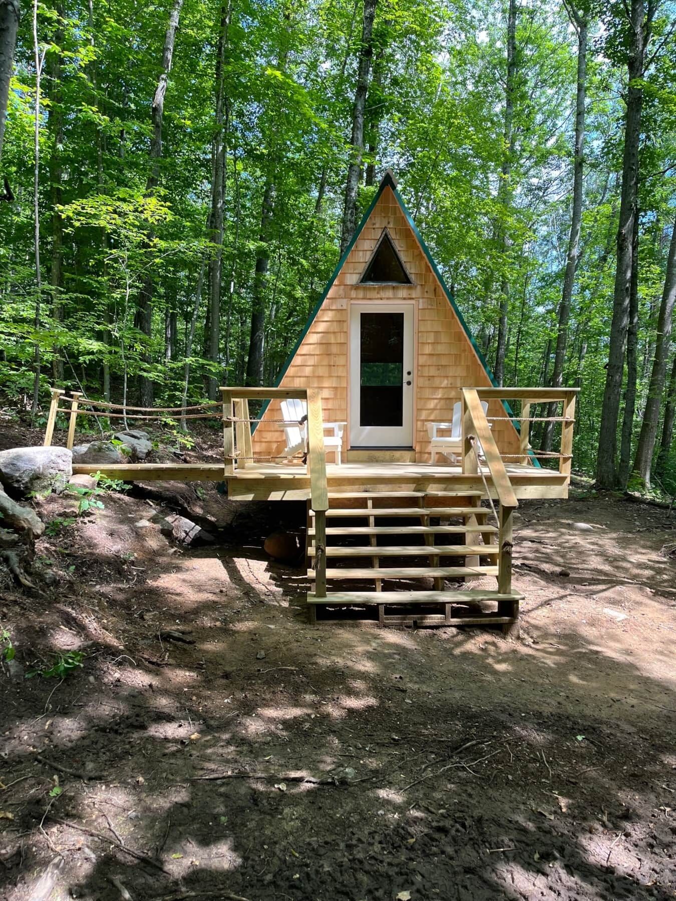 Cabin in Maine Woods-The Bogey Cabin located at In The Trees Maine Treehouse Rentals & Mountain Disc Golf in Stoneham, Maine. A real and rustic Maine woods experience! This is a primitive style cabin similar to camping. It lies 400 feet up the mountain nestled in the disc golf course. Sleeps 2, 2 twin size beds, bedding included, 12v solar powered electric with usb, no running water, private outhouse right outside the cabin, private fire pit and deck, small table and chairs, grill, free disc golf and a mountain hike to the summit where you can scale a 5-story lookout tower with incredible views of the White Mountains! This is a hikers dream! To access the cabin, you have to park in the parking lot then hike approximately 400ft. up the mountain. We have an ATV so we can transport your belongings to the cabin if needed.