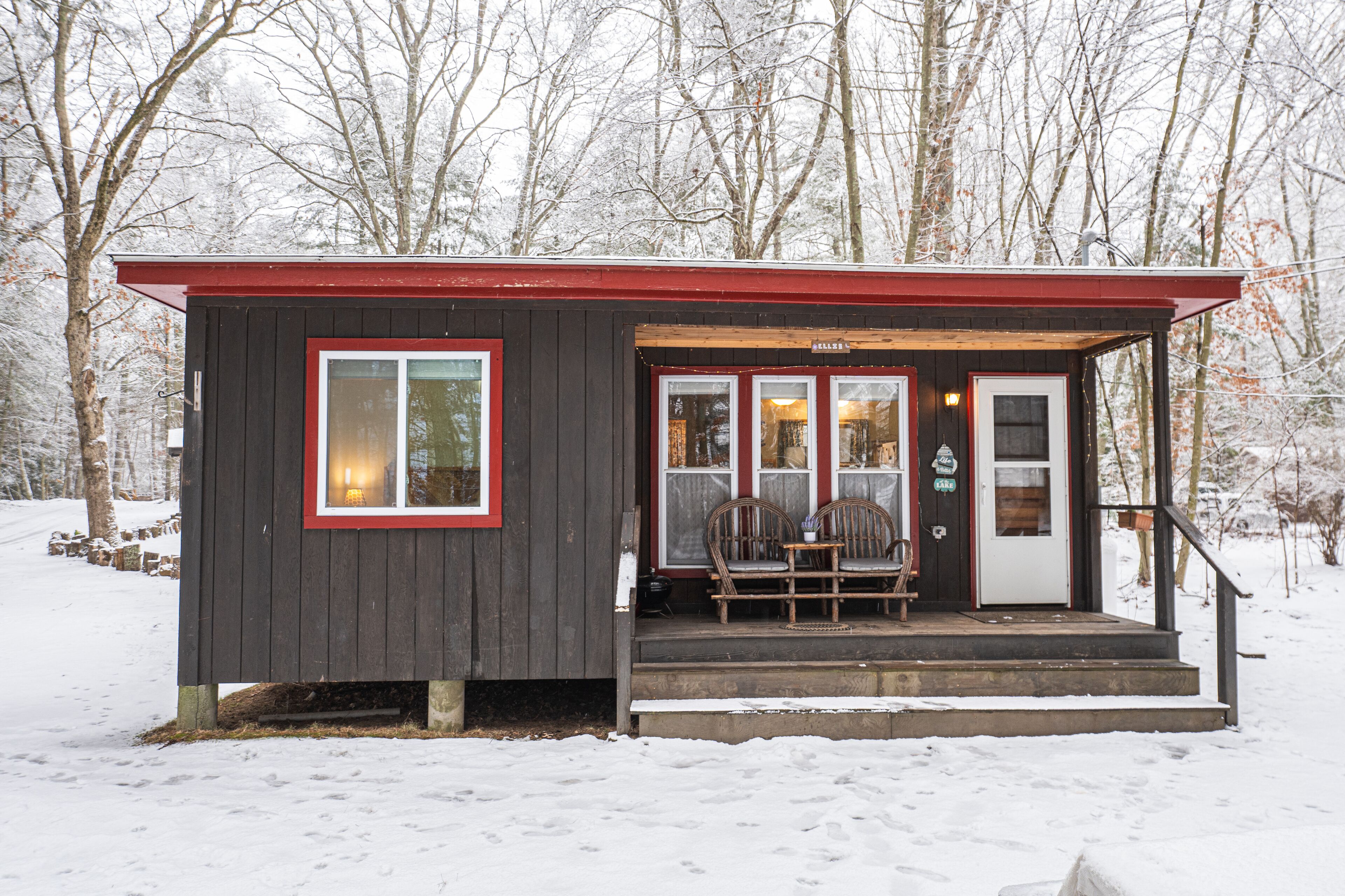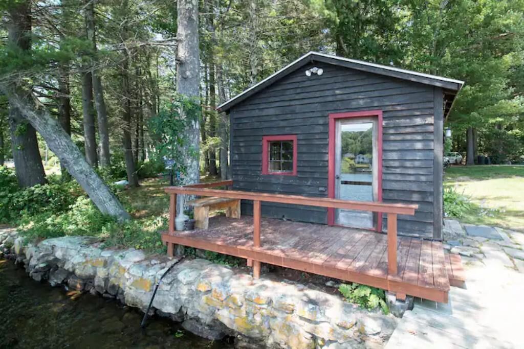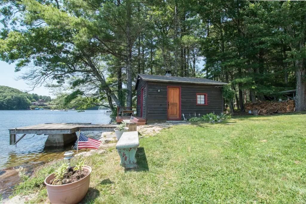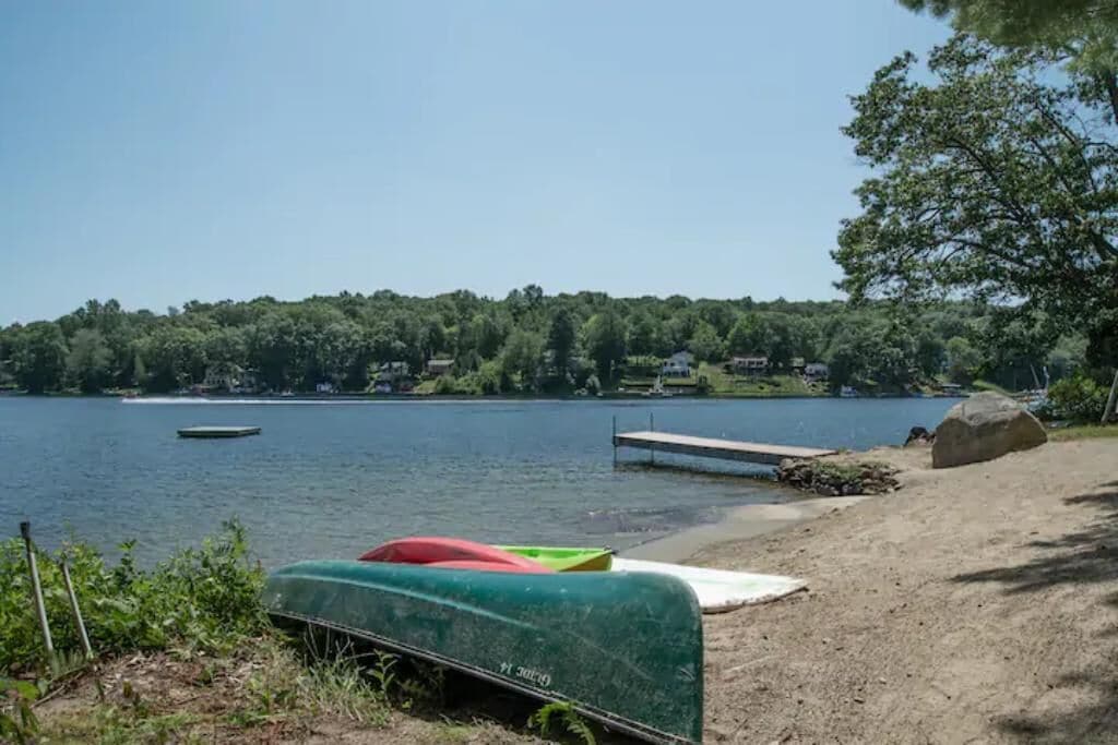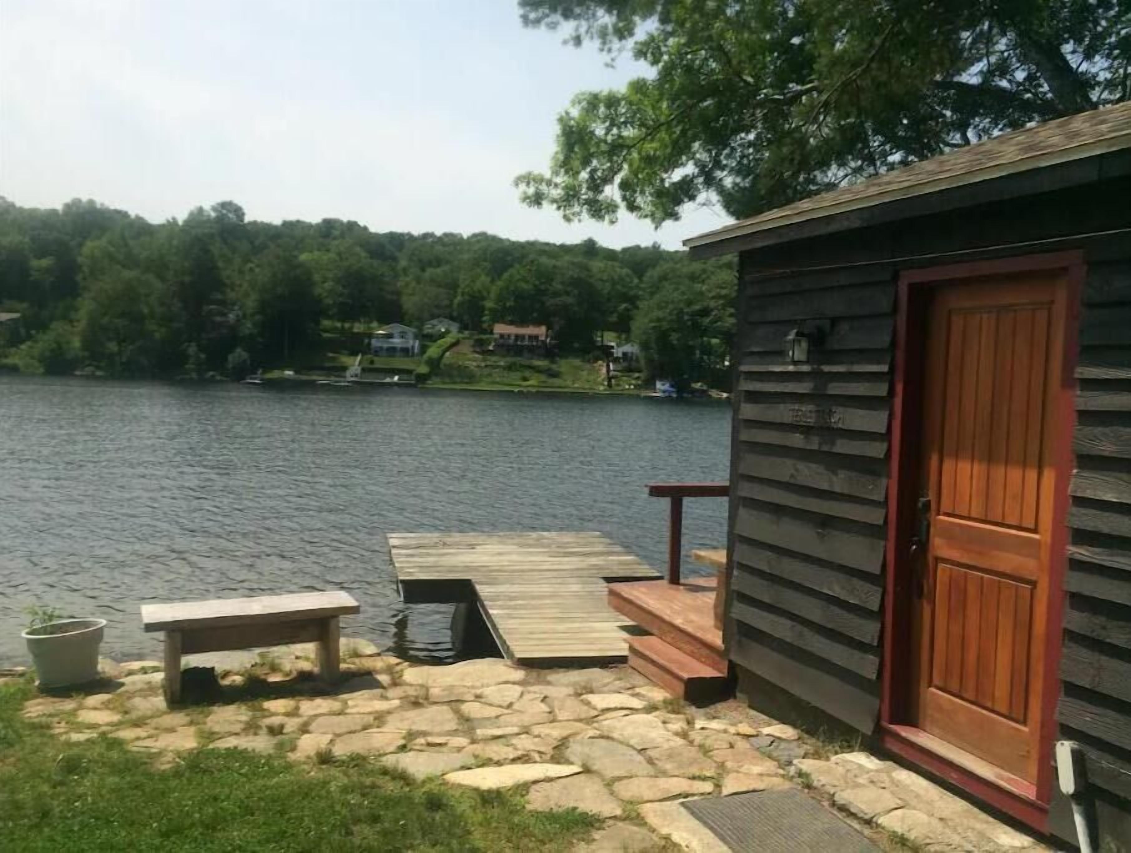 Ellis -Lakeside Cabin on Beach Pond with Wood Fired Finnish Sauna Attention! We have 1 summer week left this August 24-31st, 2024. In order to see it, please request or book Saturday to Saturday. "Ellis" is a cute fully heated and winterized camp cottage built in the 1960's by the students of Ellis Tech. It has two bedrooms and sleeps 5. The detached bunkhouse has 3 single beds and is available for larger groups (summer only) Very peaceful lakeside location on Beach Pond. Walking distance to trails. Enjoy the quintessential lakeside vacation!The spaceThe Top 5 questions we get:1. Do we need to bring firewood?You are welcome to collect deadwood from the forest surrounding the cabin for free. We also provide firewood bundles for $4/armload2. Does the cabin have pots and pans and linens?Yes, the cabin is equipped with everything you need for basic cooking and has linens and towels.3. Does the sauna work?Yes! The sauna is available year round.4. Does the cabin have heat?Yes, the cabin has both propane and electric heat to keep you toasty on even the coldest New England nights.5. Is there a grill?Yes! The cabin has a propane and a charcoal grill. We do not provide charcoal, so bring your own please.Ellis has two bedrooms, one with a queen bed and one with two single beds. The detached bunkhouse has 3 single beds and is available for larger groups in the summer only. The space is newly remodeled and very cozy! Full kitchen with 4 burner stove and oven, refrigerator, and microwave. The kitchen has a table with 4 chairs and a sofa that can one person can sleep on. The bathroom has a shower, small sink and toilet. There is no TV. (you won't miss it, we promise!) Ellis has a lovely porch on the front with views of Beach Pond. This is not a secluded cabin. There is a house next door, another cabin behind, and a camp trailer that is occasionally occupied across the driveway. See the aerial photos in the listing to get a better feel for the layout.Guest accessGuests have private access to the entire cabin and bunkhouse. A short 300 foot walk from the porch leads to the property's private beach which guests are welcome to use. There is a picnic table and multiple fire pits for campfires. Guests are also welcome to use our 10 person wood fired Finnish sauna. The sauna has a lakeside deck and direct access to the water for a dip. Guests are welcome to use kayaks, canoe, paddle boat, paddle board, and row boat.Other things to noteMany guests find that they have little to no cell reception here on the lake. If using the App, you can access check in directions without cell reception. We have WiFi in the cabin, so you can get connected as soon as you get inside. The login info is on the table.We have another cabin on the property, one camp trailer (in the summer) as well as two main houses. We have many family members on the property at any given time and all are friendly and happy you are staying with us! Just remember that there are other people living here, so we expect respect for them as far as noise.