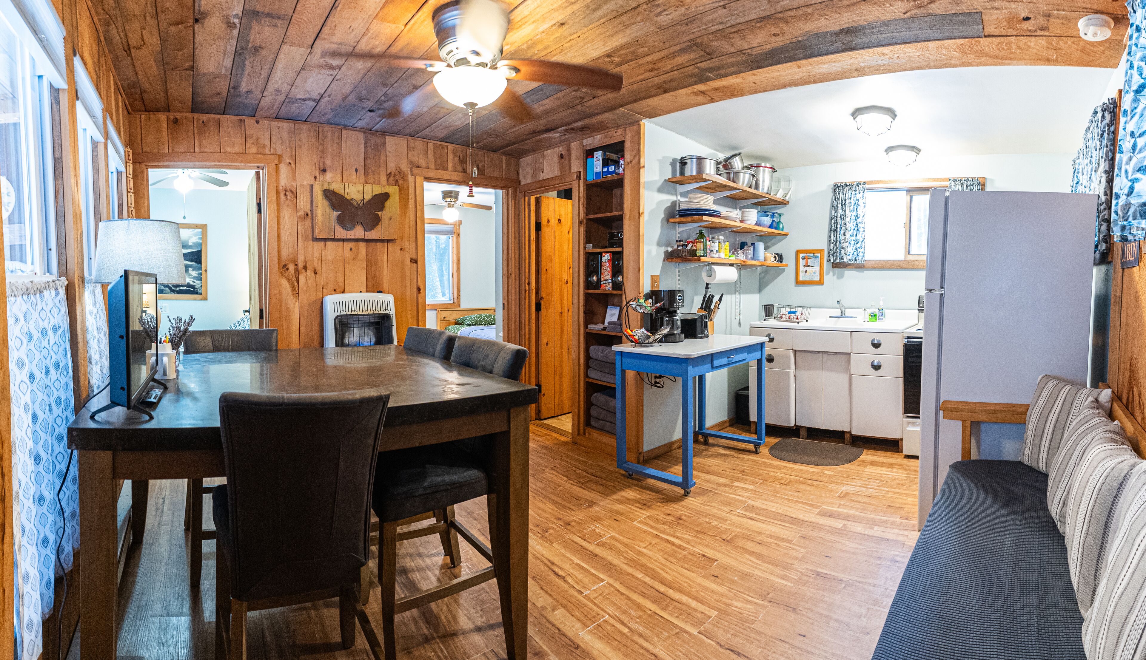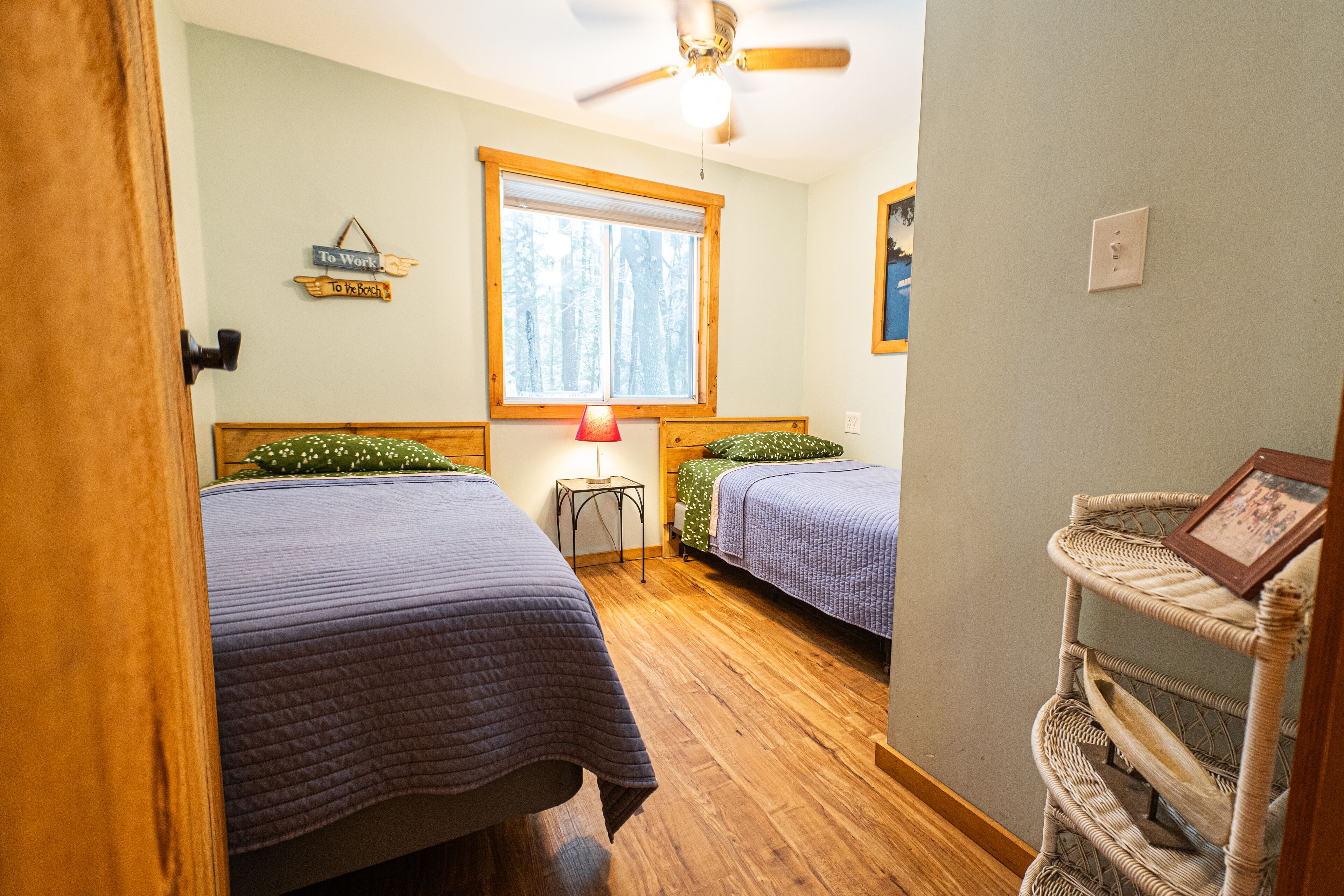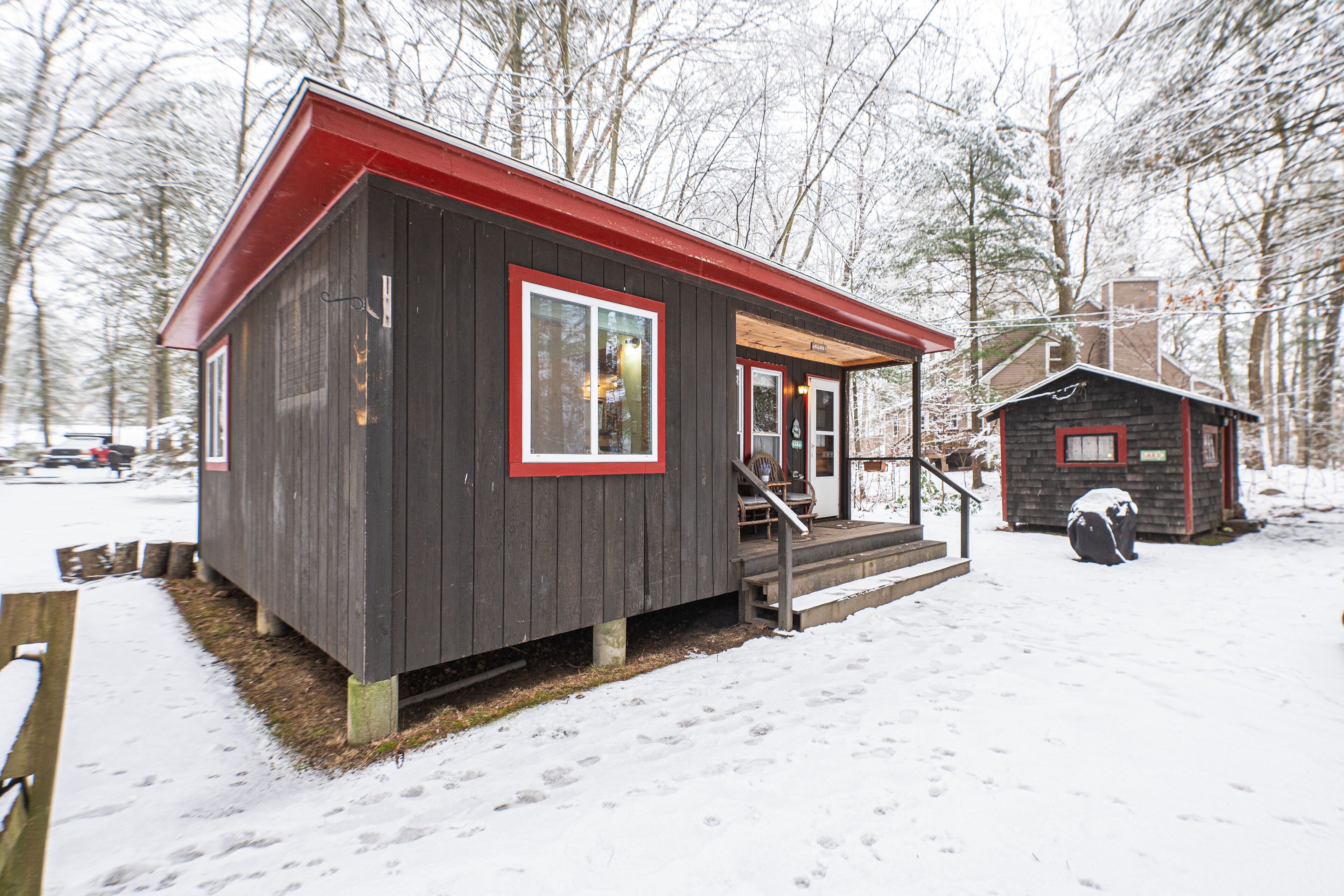 Ellis -Lakeside Cabin on Beach Pond with Wood Fired Finnish Sauna Attention! We have 1 summer week left this August 24-31st, 2024. In order to see it, please request or book Saturday to Saturday. "Ellis" is a cute fully heated and winterized camp cottage built in the 1960's by the students of Ellis Tech. It has two bedrooms and sleeps 5. The detached bunkhouse has 3 single beds and is available for larger groups (summer only) Very peaceful lakeside location on Beach Pond. Walking distance to trails. Enjoy the quintessential lakeside vacation!The spaceThe Top 5 questions we get:1. Do we need to bring firewood?You are welcome to collect deadwood from the forest surrounding the cabin for free. We also provide firewood bundles for $4/armload2. Does the cabin have pots and pans and linens?Yes, the cabin is equipped with everything you need for basic cooking and has linens and towels.3. Does the sauna work?Yes! The sauna is available year round.4. Does the cabin have heat?Yes, the cabin has both propane and electric heat to keep you toasty on even the coldest New England nights.5. Is there a grill?Yes! The cabin has a propane and a charcoal grill. We do not provide charcoal, so bring your own please.Ellis has two bedrooms, one with a queen bed and one with two single beds. The detached bunkhouse has 3 single beds and is available for larger groups in the summer only. The space is newly remodeled and very cozy! Full kitchen with 4 burner stove and oven, refrigerator, and microwave. The kitchen has a table with 4 chairs and a sofa that can one person can sleep on. The bathroom has a shower, small sink and toilet. There is no TV. (you won't miss it, we promise!) Ellis has a lovely porch on the front with views of Beach Pond. This is not a secluded cabin. There is a house next door, another cabin behind, and a camp trailer that is occasionally occupied across the driveway. See the aerial photos in the listing to get a better feel for the layout.Guest accessGuests have private access to the entire cabin and bunkhouse. A short 300 foot walk from the porch leads to the property's private beach which guests are welcome to use. There is a picnic table and multiple fire pits for campfires. Guests are also welcome to use our 10 person wood fired Finnish sauna. The sauna has a lakeside deck and direct access to the water for a dip. Guests are welcome to use kayaks, canoe, paddle boat, paddle board, and row boat.Other things to noteMany guests find that they have little to no cell reception here on the lake. If using the App, you can access check in directions without cell reception. We have WiFi in the cabin, so you can get connected as soon as you get inside. The login info is on the table.We have another cabin on the property, one camp trailer (in the summer) as well as two main houses. We have many family members on the property at any given time and all are friendly and happy you are staying with us! Just remember that there are other people living here, so we expect respect for them as far as noise.