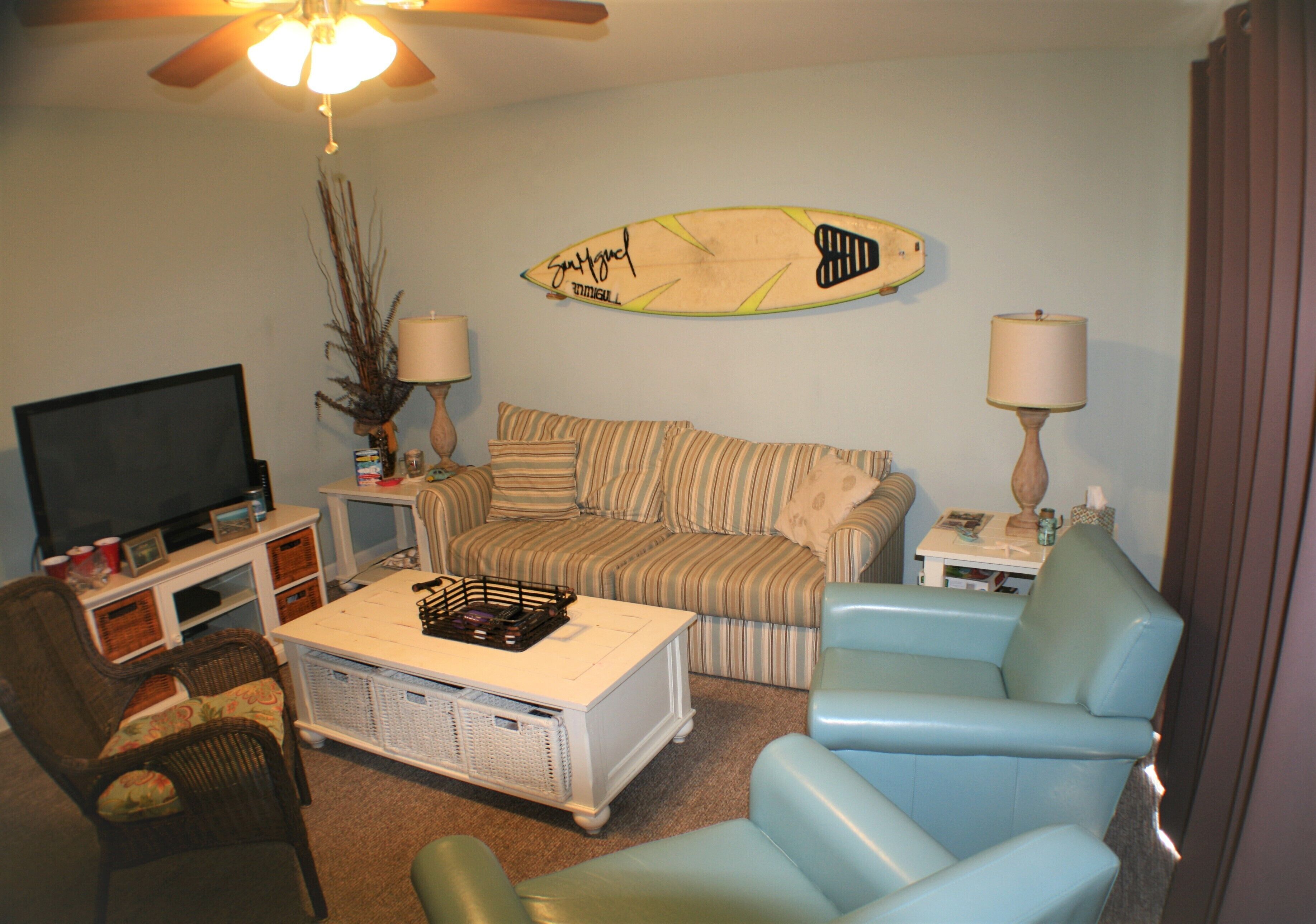 One Block to the Ocean Close to Everything Nicely decorated property, conveniently located in the center of Dewey Beach! We are located on the second floor of the Rainbow Cove condominium complex. This is a 3 bedroom condo, and includes a pull out sofa, which provides plenty of sleeping space. The master bedroom has a queen bed, and a private full bathroom, bedroom #2 has a queen bed, bedroom #3 has a full/twin bunk bed. These rooms share a hallway bath. Flat screen TV's are located in the living room and master bedroom. This is a pet friendly condo, our pet fee is $30 a day. There is private parking for 2 cars in the carport, located underneath the condo. We have extra street parking passes for a additional fee. The shady front porch is a great place to get out of the sun, relax, and enjoy reading a good book. This condo is equipped with WiFi and cable. We also rent the property directly above this one, if you have extra family or friends that are looking for a place to stay. That property number is 421375
