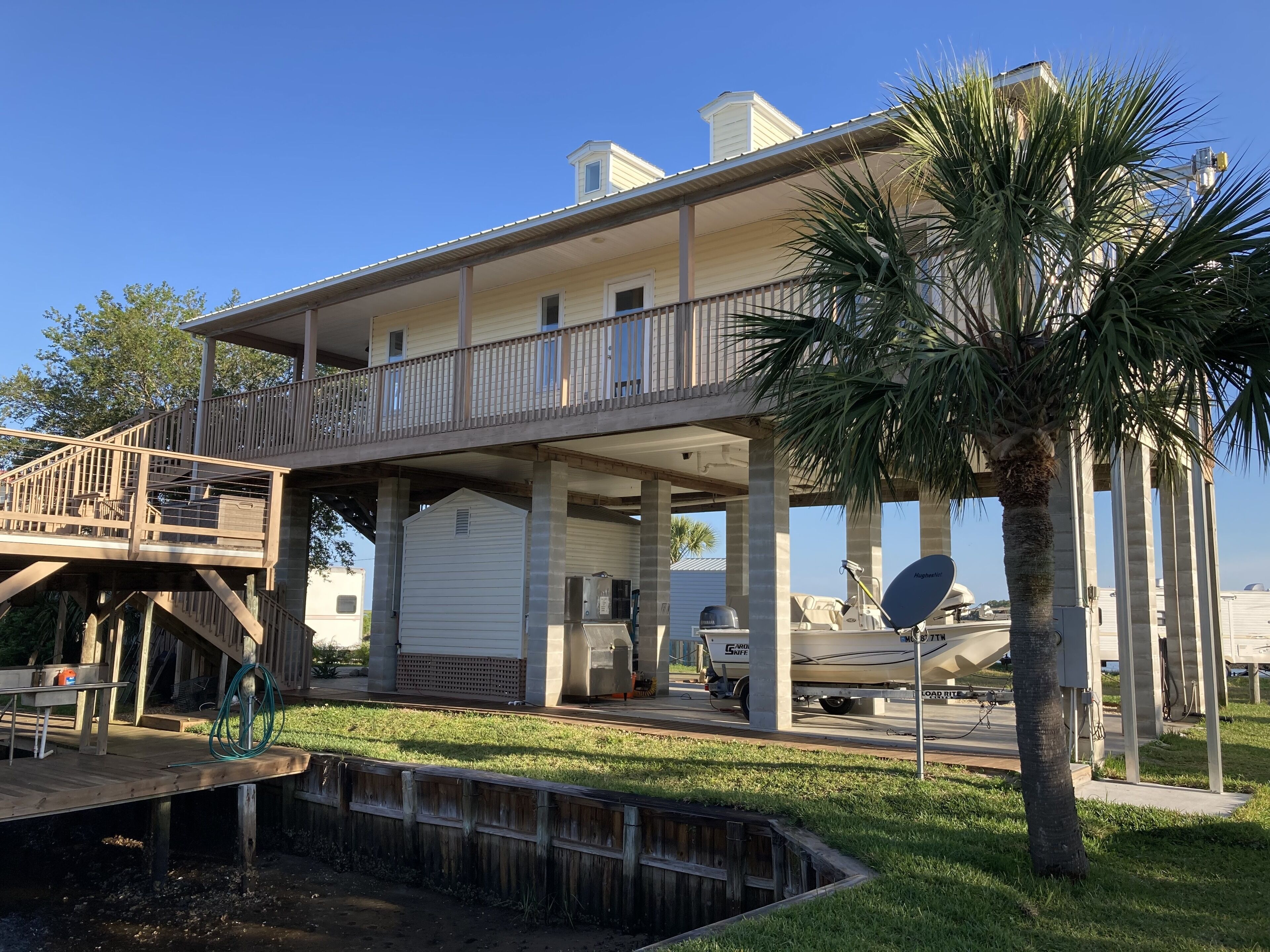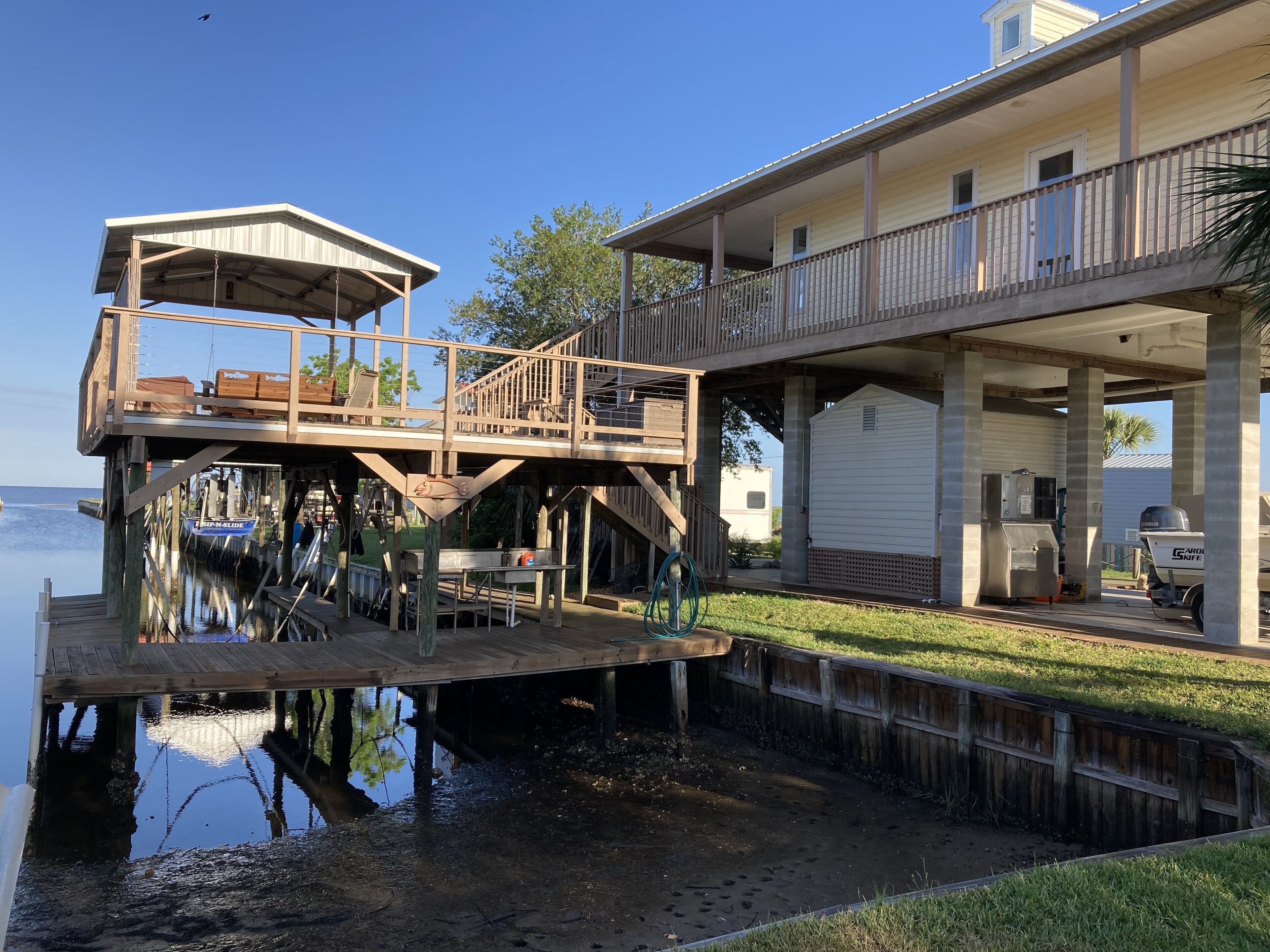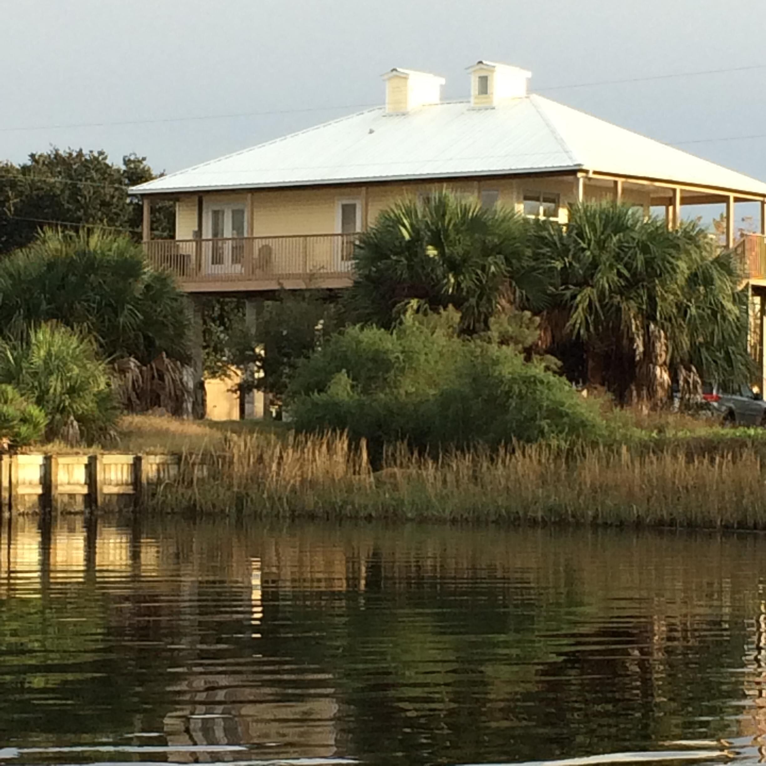 Outstanding Gulf Views and Direct Gulf Access This rental has breathtaking gulf views and has direct gulf access from the canal located directly beside the house. This short canal ends at our large over the canal deck which covers 2 boat lifts and a large fish cleaning station. Home has wrap around decks on three sides with plenty of room for relaxing, outside dining, watching the wildlife and viewing the beautiful sunsets. This cozy home (900 square feet) sleeps 4 with 1 1/2 baths. There are 2 bedrooms, one with a queen and the other with a double bed and a queen size sofa sleeper in the living room. Each bedroom has French doors that lead out on the outside decks that offer unique views. The kitchen is fully stocked with everything you might need, including ice maker, toaster, coffee maker, mixer, blender, microwave, dishwasher and some spices. There also is a gas grill on the deck for your use as well as other deck furniture for your enjoyment. Below the house we have a large ice machine for your use that a few neighbors and friends may also use, there is plenty for everyone! Home also includes washer and dryer.In the living room there is a flat screen TV that has Dish network and a DVD player for your use. The DVR has many movies that have been recorded if you feel like a movie. There is WiFi for your use.Since there are no grocery stores in town, we suggest you do your shopping prior to your stay.