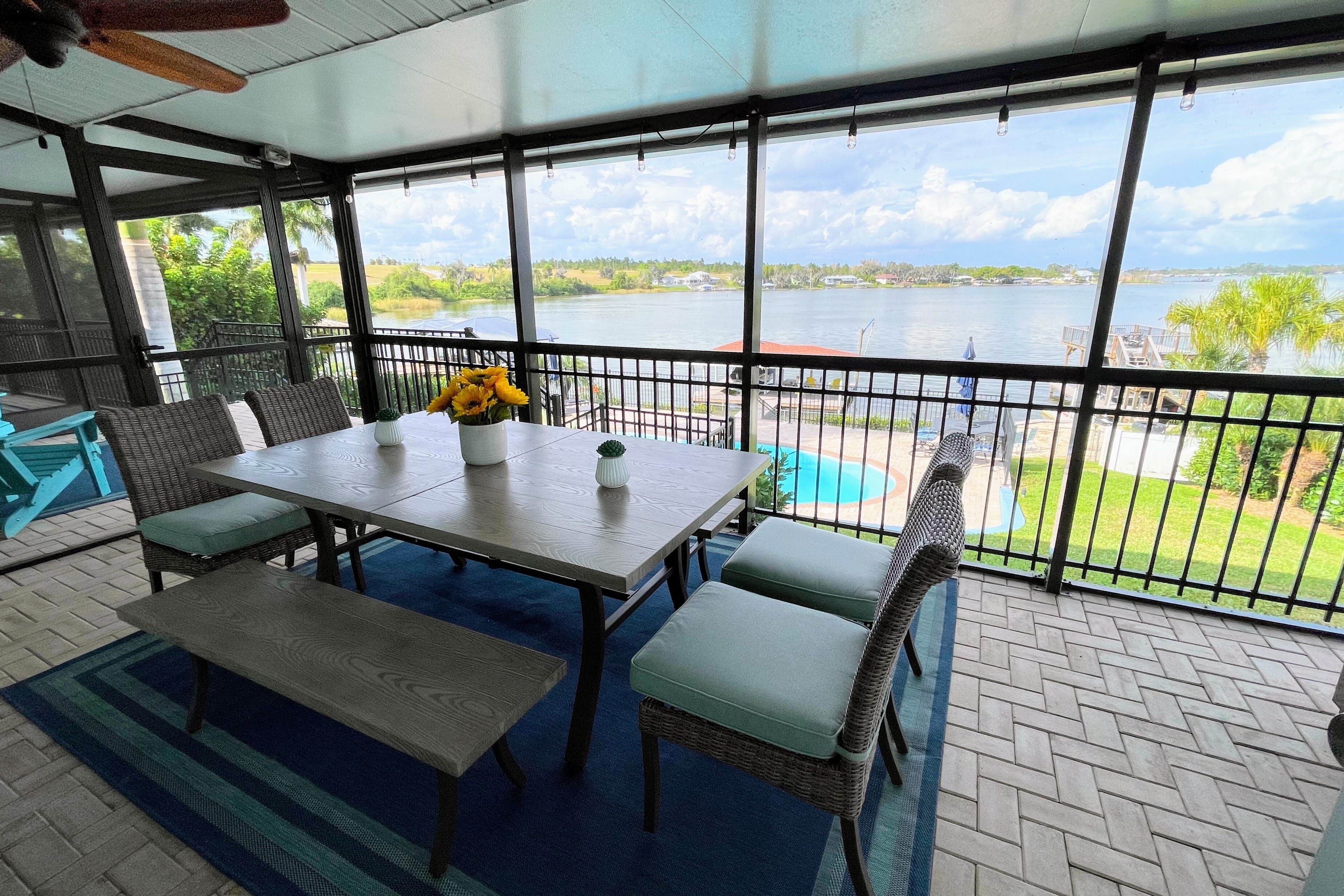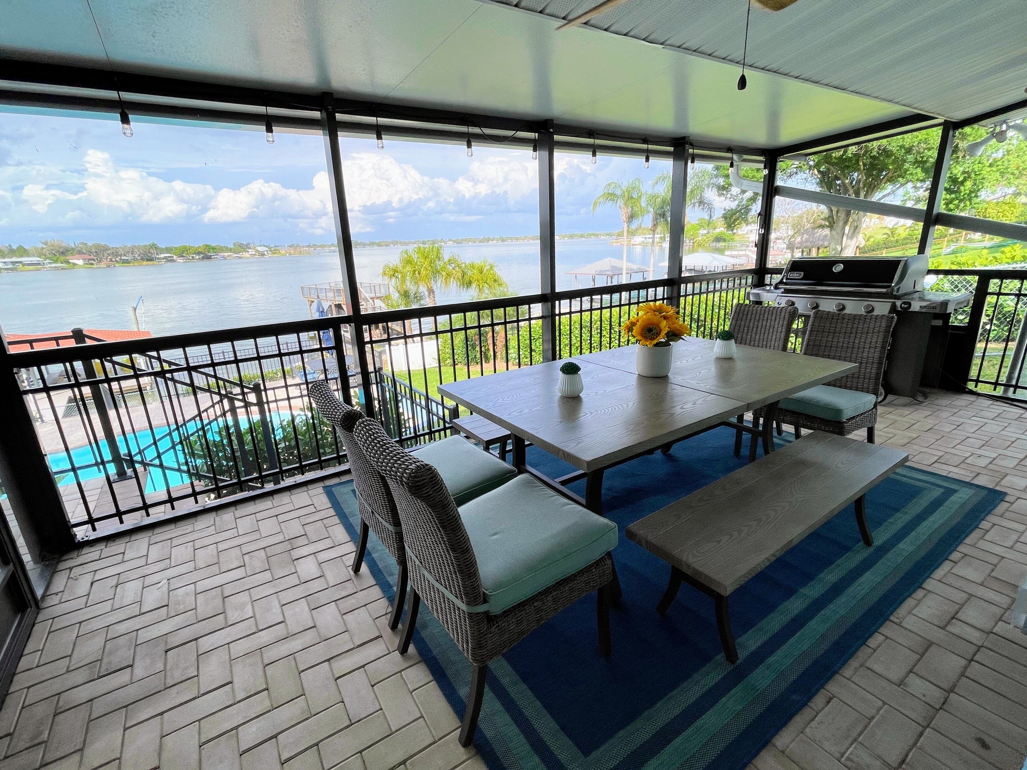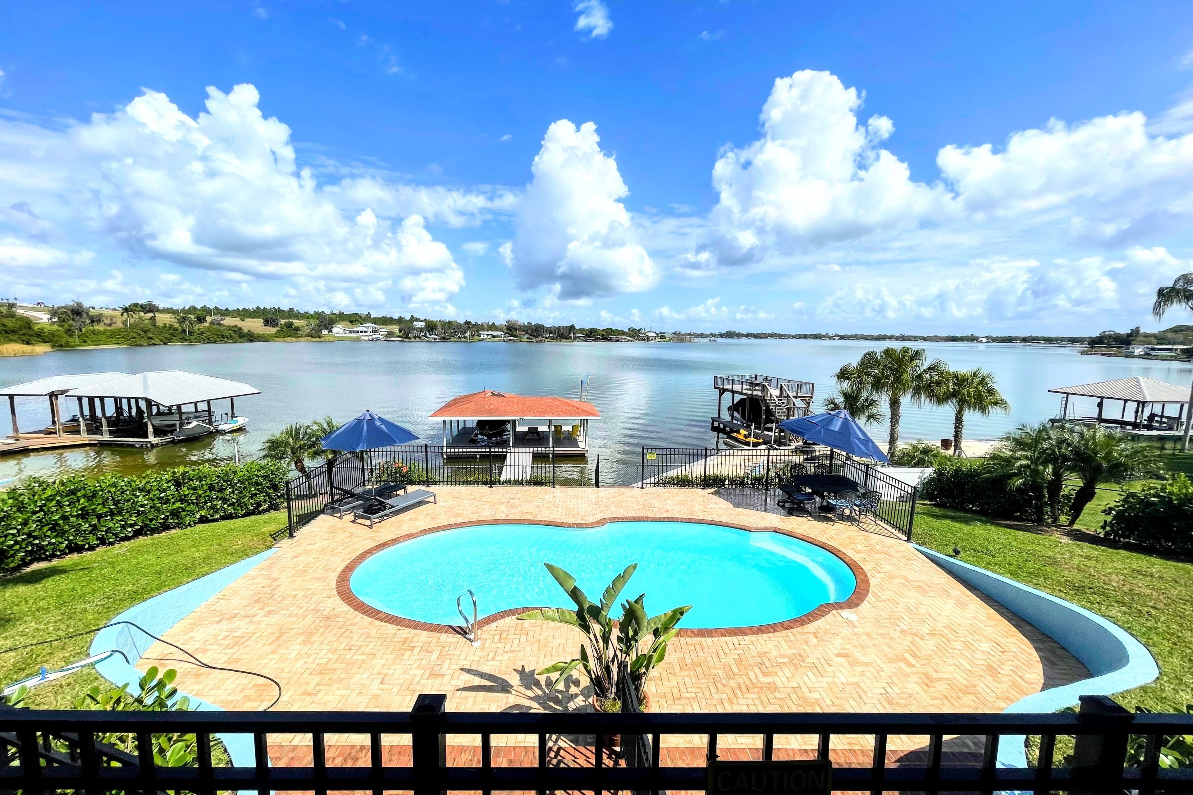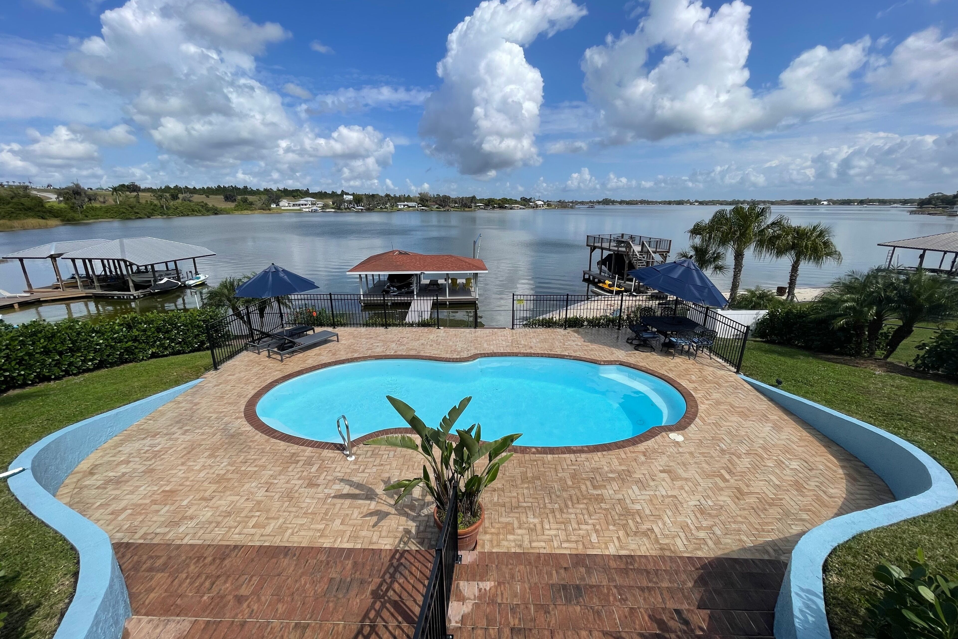 Lake Retreat for10 has Pool-Dock-4 Bedrooms-2 Bath Expansive Lakefront Views This Beautiful Property on Lake Clay is an unbeatable location for outdoor play. Bring your boat or jet-ski for unlimited memories with family & friends! There are Kayaks available onsite.Pet friendly for dogs under 30 lbsOUTDOOR SPACE:- Private pool- Dock (fishing allowed)- 3 screened porches - 2 Outdoor dining areas- Lounge chairs- Large Fenced yard- Gas grill- High speed internet LIVING AREA: Panoramic Views of Pool and Lake- Comfortable seating in living room with a super size TV- Large dining room table for 12 guests- Large open plan living room- Multiple Ceiling Fans KITCHEN: - Panoramic views of the pool and Lake Clay that opens out the the patio- Granite counter tops and deluxe gas stainless steel appliances.- Fully equipped for cooking and dining.- Also includes a Keurig coffee maker, toaster, blender, cooking basics & spices BEDROOMS: (4)- The Principle bedroom opens to the Patio, with a king bed and a connecting bathroom with a deluxe steam shower, and streaming TV.- 2nd Bedroom has a Queen size bed, streaming TV and queen size futon.- 3rd Bedroom has 3 twin beds and a streaming TV.- 4th bedroom has a queen-size bed and 2 roll-away beds.- Pac and Play crib with a bassinet and high chair are provided.- All linens are provided.BATHROOMS: (2)-All bathrooms are provided with a starter set of toiletries (TP, soap, and shampoo) and plush towels. A hairdryer is also available. PATIO: Screened in and furnished and opens out from every room, dining table with Weber Grill and piped in natural gas.GUEST ACCESS: -This fully fenced property is entirely yours for your private enjoyment.INTERNET: Highspeed and wireless throughout. CLEANING:- All of our properties are professionally cleaned and sanitized up to CDC guidelines and inspected before each stay to ensure your safety.- Starter dishwasher pods are provided- Washer and dryer with a starter set of laundry pods provided. LOGISTICS:- Check-in: 4:00 PM.- Check-out: 11:00 AM.- An early check-in or late check-out time may be available, please inquire about availability and pricing. TVs: All 4 of our TVs are Smart with access for you to log into your favorite streaming channels. MAINTENANCE SCHEDULE: Weekly Landscaping service Weekly Pool cleaning services POOL: Please note there is no lifeguard on duty and we ask that all guests enjoy the pool responsibly. The property owner is not liable for any pool-related accidents, drowning, or bodily harm/personal injuries. No diving is permitted. No glass is permitted in or near the pool or hot tub, the kitchen is supplied with plastic cups. GARBAGE: We ask that you please put out any used garbage bins in the front of the driveway Monday night and Thursday night before collection on Garbage Removal days, Tuesday and Friday mornings. Please bring the bins back to the side of the house when the trash has been picked up. PARTIES & EVENTS: We do not allow parties, receptions, or events. This is our most important rule that can result in the termination of your reservation along with additional fees. If you have any questions regarding entertaining on the property please contact us. ALL OUTDOOR NOISE must end by 10 PM- no Exceptions. PARKING: The driveway accommodates 5- 6 cars. Please refrain from parking on the street or the lawn PETS: Pets are permitted Government-issued photo identification is required before check-in. PERSONAL BELONGINGS: ValGal isn’t responsible for any package delivery or personal belongings left at the property after checkout. ADDITIONAL DETAILS: If you have any specific requests feel free to ask us, while we do not guarantee it, we will do our best to accommodate you. Some special requests may incur additional charges. Please note, that by booking this property, you are agreeing to our rental terms and conditions.