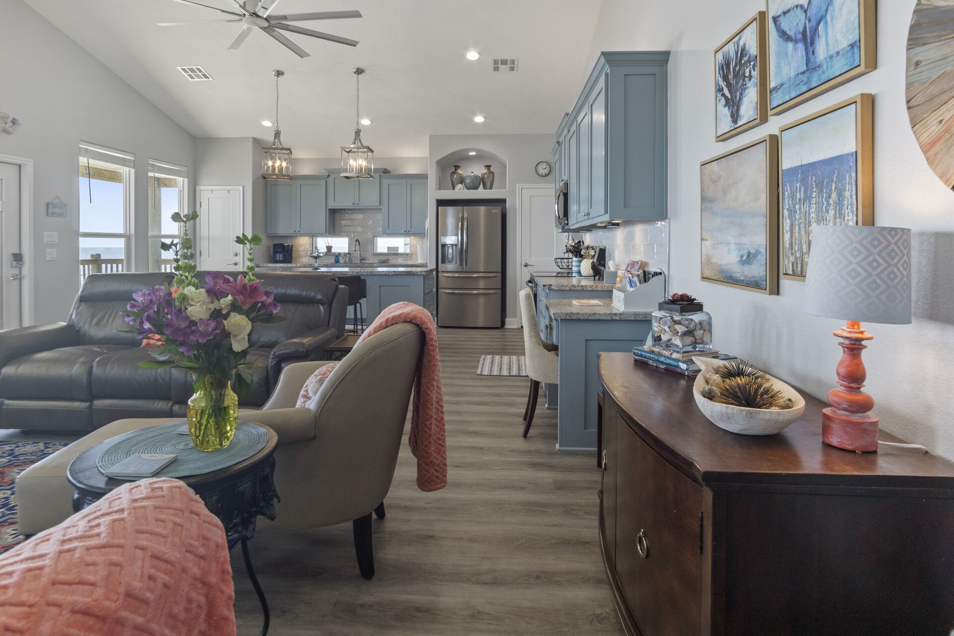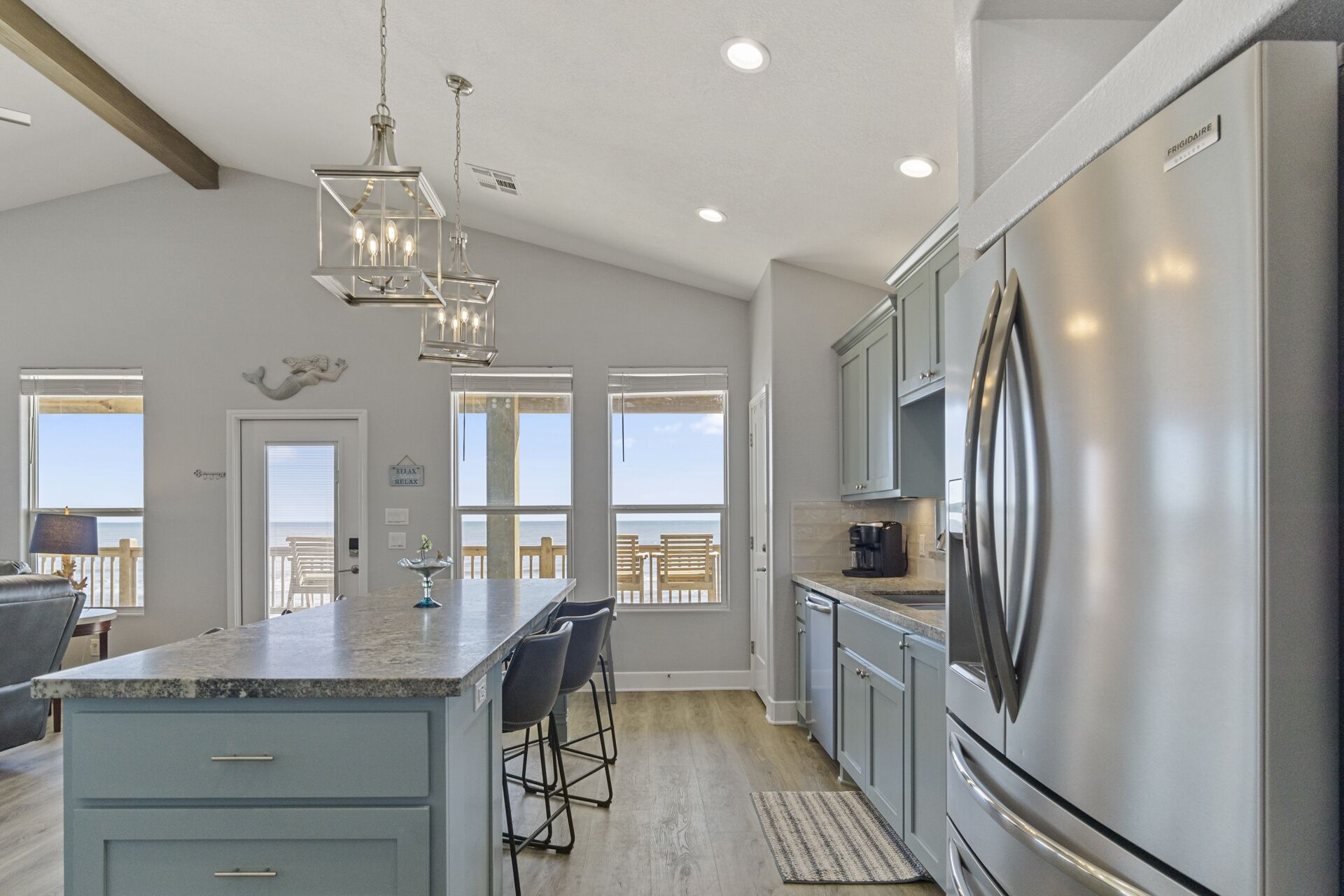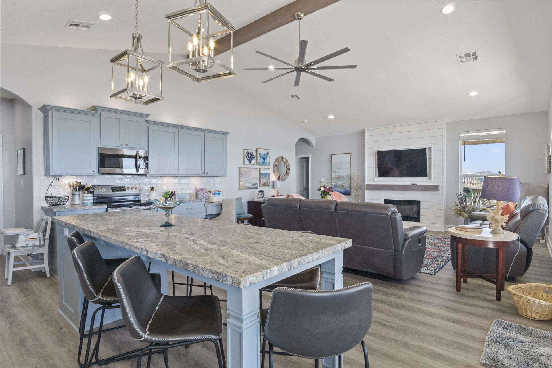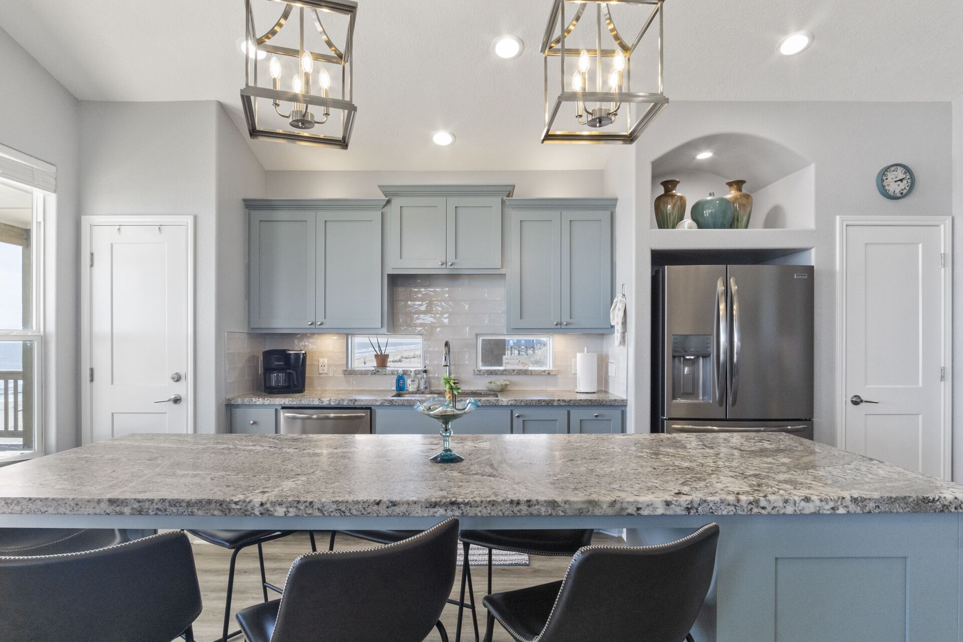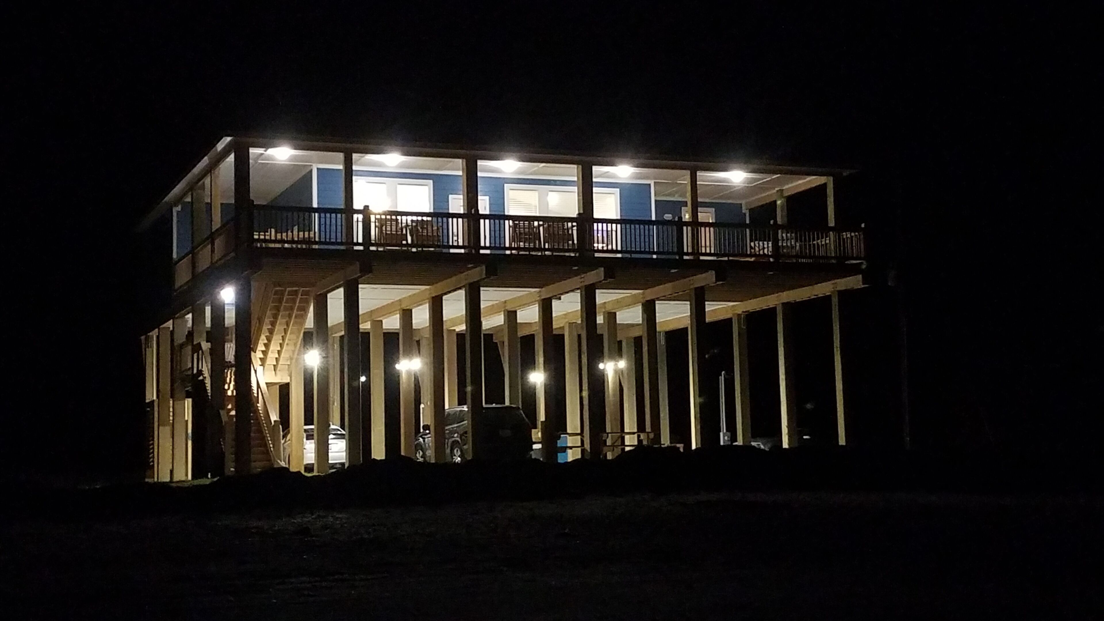 Bella Luna ! Awesome beach getaway., cargo lift Calm Breezes, the quiet roar of the restless gulf, a choreography of pelicans above, and an endless view from your private deck. Bella Luna is your brand new getaway practically built on the beach. She features four bedrooms and four bathrooms with two king master en-suites and two Queen over Queen bunk rooms, and comfortably sleeps 12. Fully equipped gourmet kitchen with large island that seats 7, comfortable living area with TVs and fans in every room. This beautiful home features an expansive front and side deck and screened-in back porch for spectacular sunset viewing. Covered downstairs area with picnic table, BBQ pit along with hot/cold outdoor shower to rinse off after fun at the beach. Bring your family & friends to enjoy the beach, quiet relaxation, fishing or bird watching on the Texas gulf coast or take a ferry for a day trip to Galveston, NASA or Houston. Make memories for a lifetime.Cargo Lift!We are excited to offer this upgrade to guests. You will be able to relax, settle in and start your vacation even sooner. Cargo lift is for cargo only. Not for use as an elevator for people.
