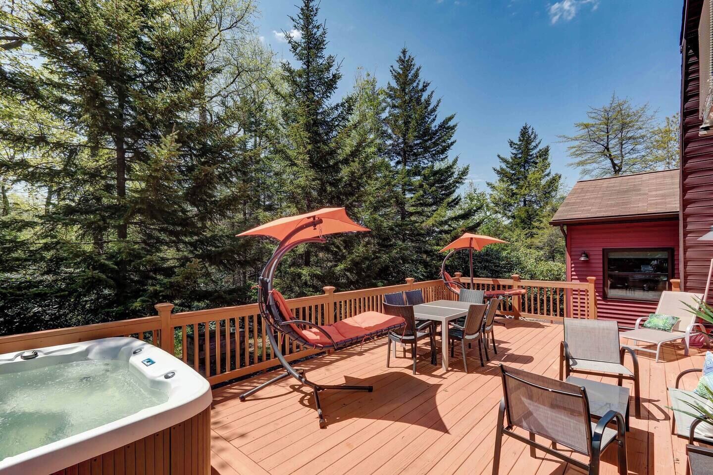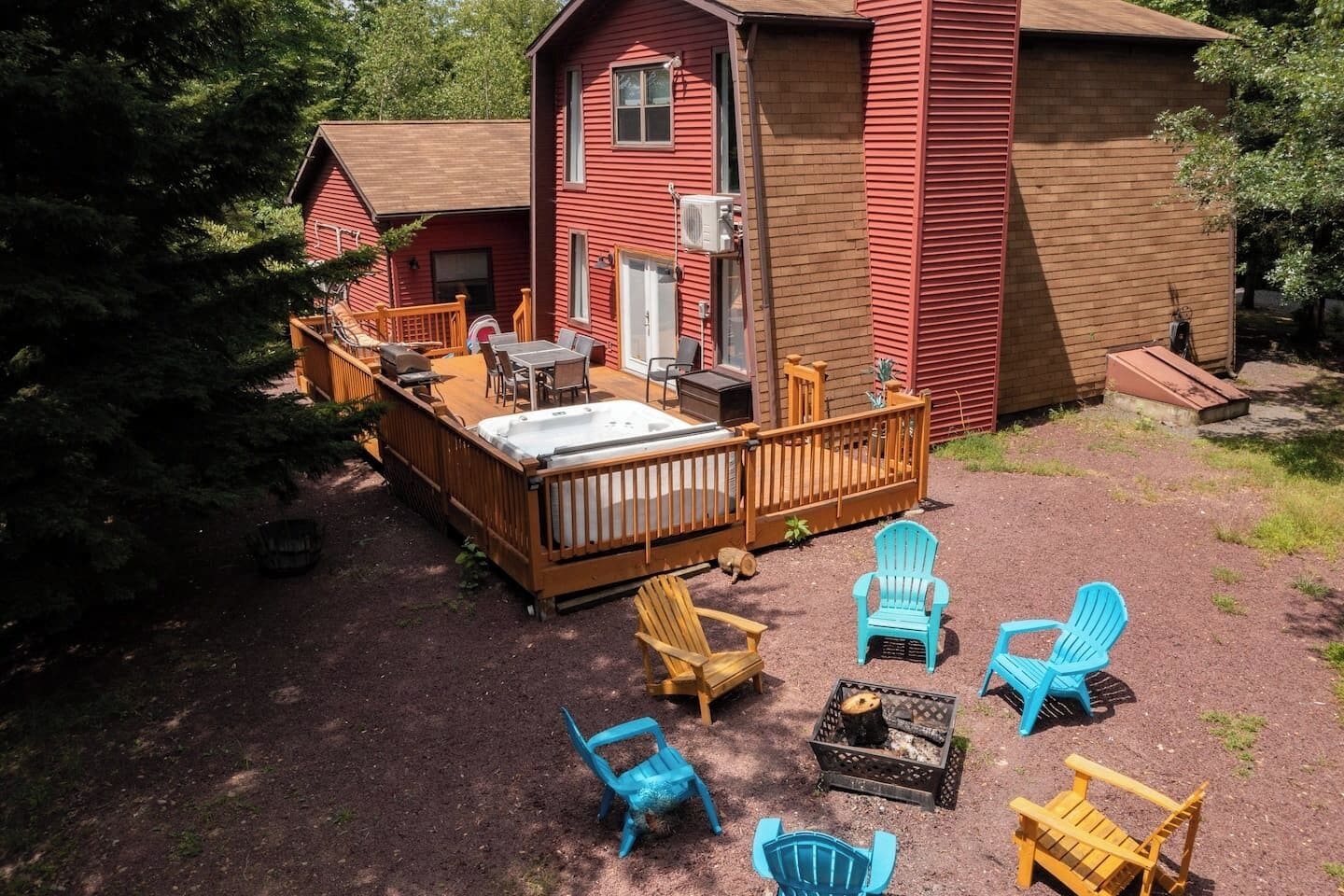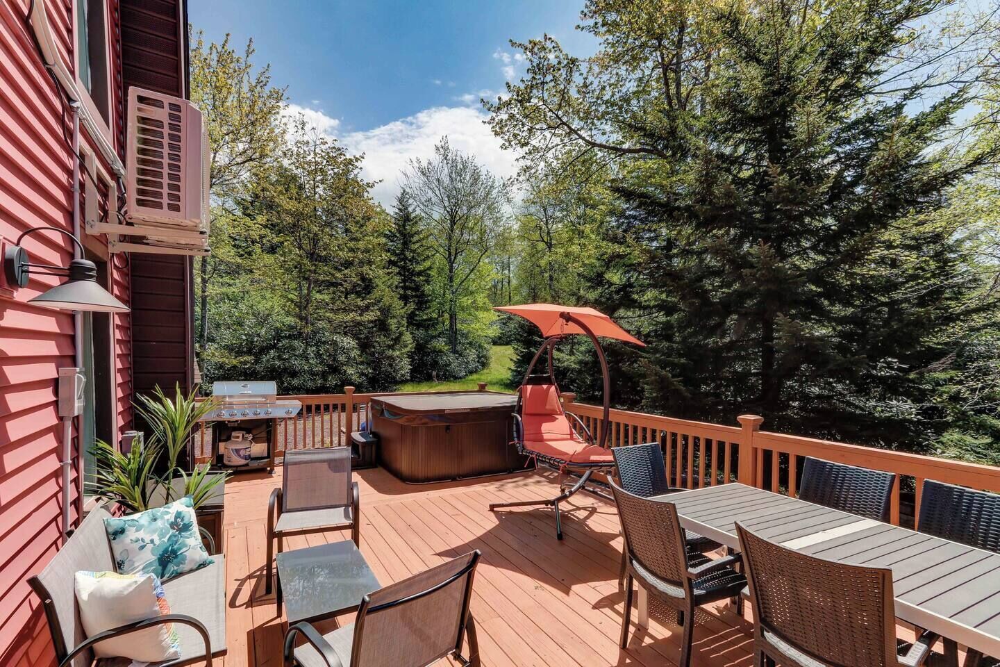 Super Private! Modern Farmhouse Surrounds by Woods! No Cleaning Fee! Welcome to your ultimate Pocono retreat at our stunning modern farmhouse! Nestled on 2 serene wooded acres, this beautifully renovated property promises an unforgettable escape for your group.Step inside and discover a world of entertainment in our newly added game room. With theater-style seating for 4, a ping pong table, and arcade-style basketball and roll-and-score games, fun-filled evenings are guaranteed! And when it's time to unwind, slip into the inviting hot tub on the deck for a soothing soak under the stars.Embrace the great outdoors in our outdoor lounge seating, perfect for al fresco meals and relaxed conversations. Inside, the country modern flair continues in all 5 bedrooms, ensuring a comfortable and stylish stay for your entire party.Our space boasts updated bathrooms, including a tub on the first floor and a walk-in shower on the second, offering both convenience and luxury. And with an open-concept layout in the kitchen, dining room, and living room, you'll never miss a moment of togetherness with friends and family.Every corner of our farmhouse is thoughtfully designed and inspired by modern country aesthetics. From the charming decor to the sweeping views of nature from every window (keep an eye out for deer!), every detail contributes to the ambiance of relaxation and rejuvenation.Whether you're seeking a simple weekend getaway or a longer vacation, our farmhouse is the perfect sanctuary for your escape. So why wait? Book now and start planning your unforgettable Pocono adventure!Other things to noteMinimum 3 day booking required for major holiday weekends. Labor Day, Independence Day, Thanksgiving, and Memorial Day.