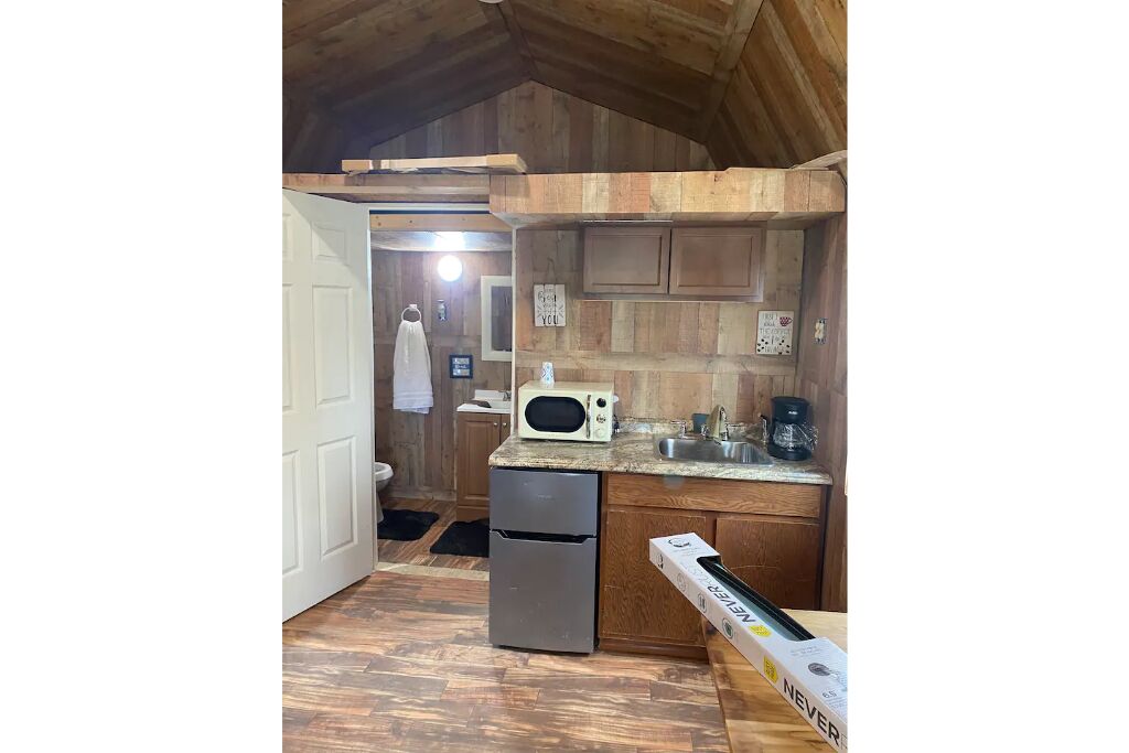 Delightful kitchenette style tiny home with loft. Reconnect with nature at this unforgettable escape. Surrounded by forestry you can’t resist the urge to read a great book. Take advantage of the beautiful night life with a picnic under the stars or s’mores at the fire pit. Grab a cold drink from the tiny village store or maybe a famous Snow Cone B Gone (hot dog) prepared fresh at their very own ti...