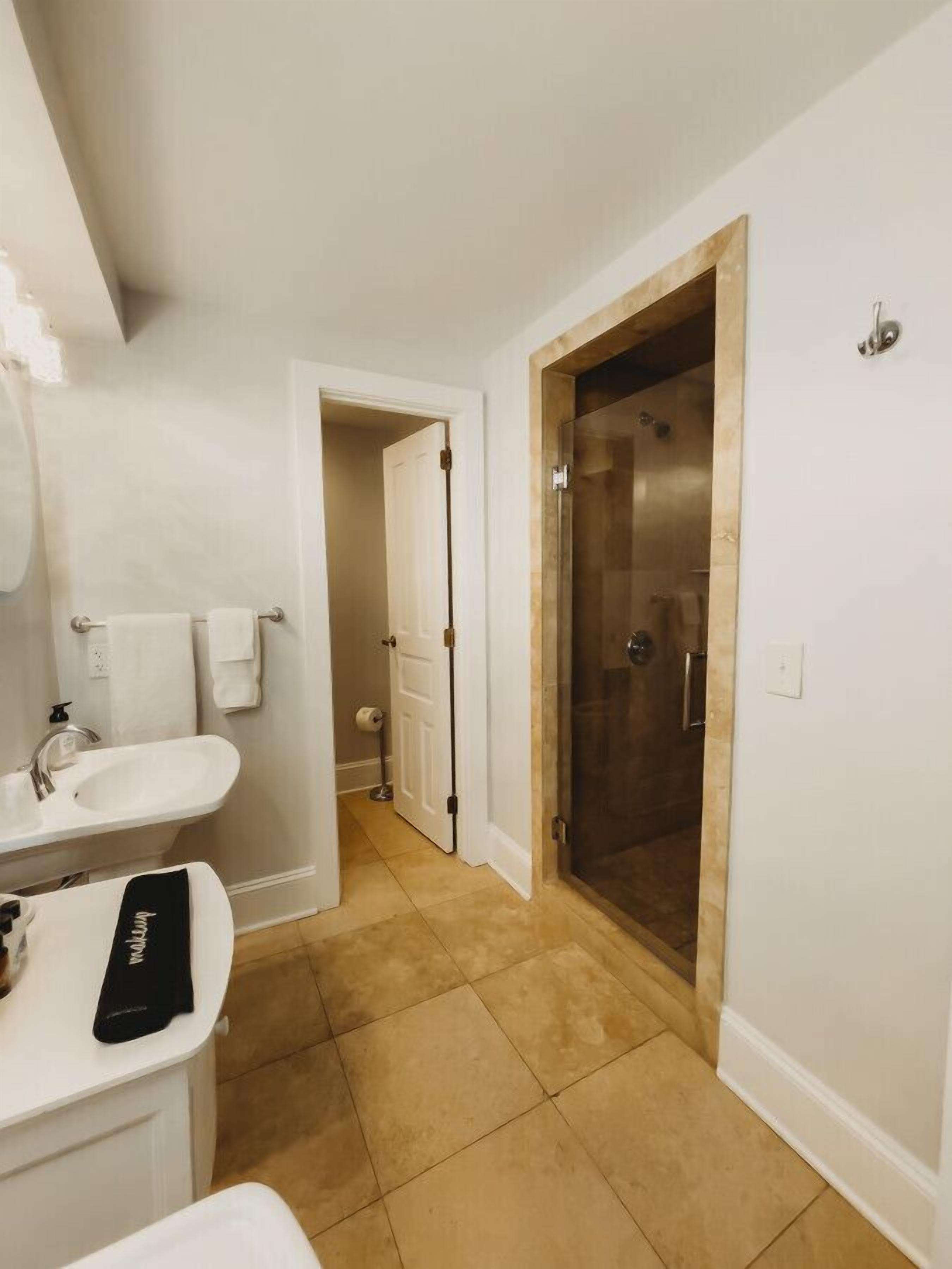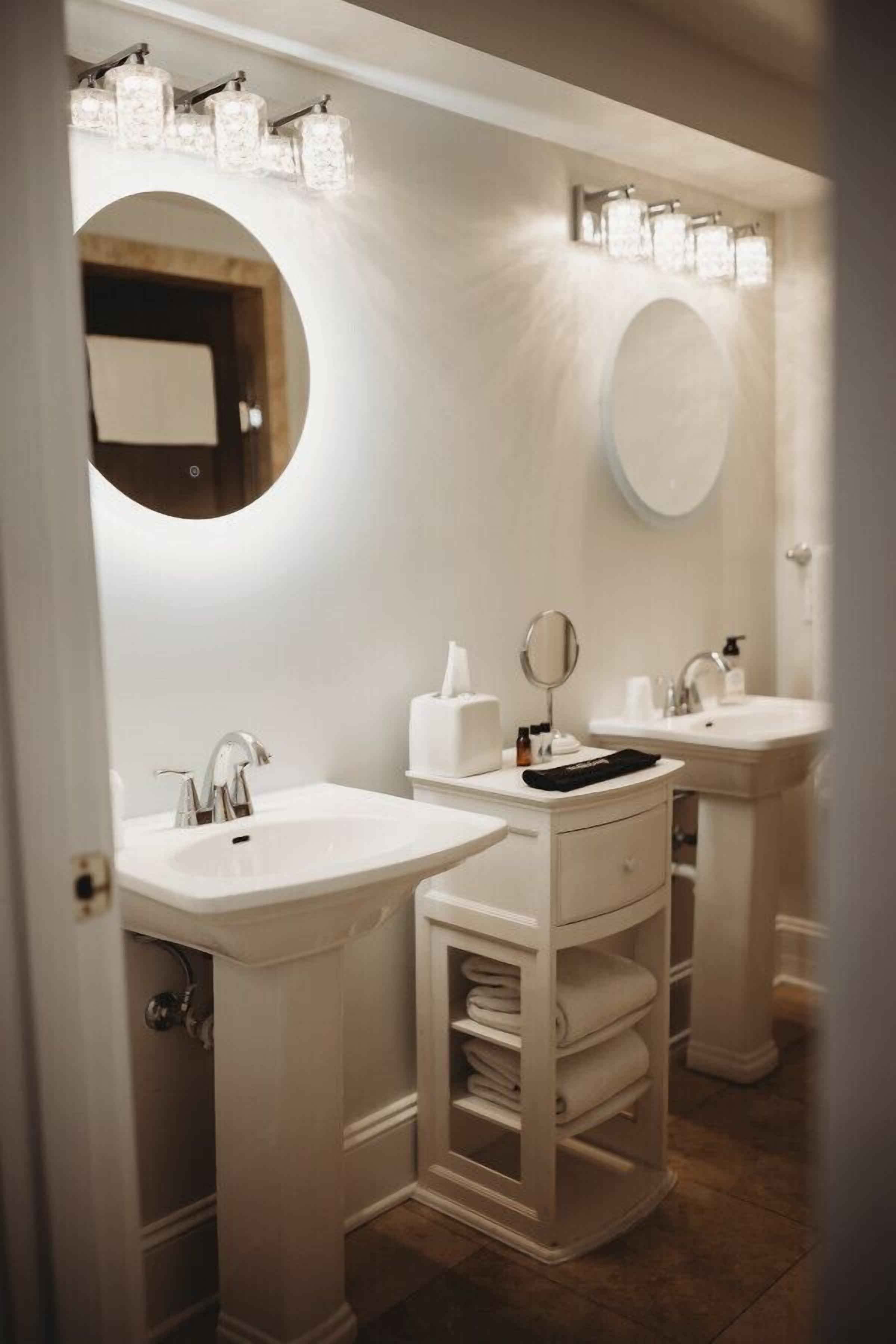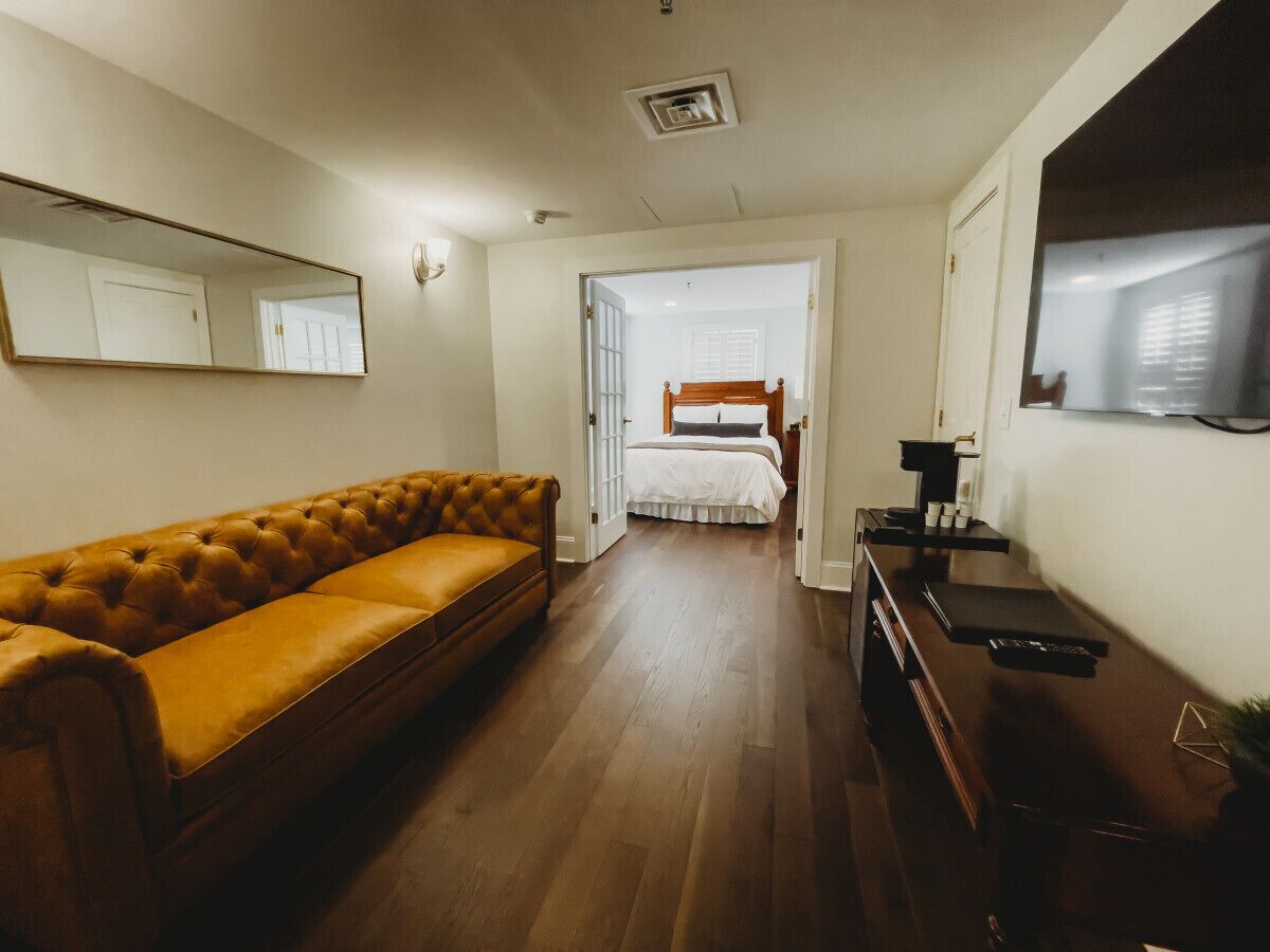 Standard Suite - 2 Queens · The Jefferson Inn Rm. 9 Welcome to the historic Jefferson Inn & 1901 Lounge in beautiful Southern Pines, NC!Room 9 is one of our loveliest suites, featuring two queen beds. The bedroom, which is separated from the living area by covered french doors, has a smart TV. The living area, features a second smart TV and sitting area, along with mini fridge and coffee maker is perfect for some privacy and separate space! The bathroom is well appointed with dual pedestal sinks, and an oversized walk-in shower with both a regular and rain shower head.Make sure to visit 1901 Lounge during your stay! Located in the lobby and open Tuesday - Saturday, you will love the speakeasy atmosphere, delicious craft cocktails and awesome local bites!The Jefferson Inn is a digital access property, allowing guests ease of check-in and check out.Don't miss the historic charm of Southern Pines, NC right out your front door - book your stay today, we can't wait to welcome you.There will be a $300 security deposit hold on your card at check in that gets released 7 days after check in provided there are no damages in the unit.