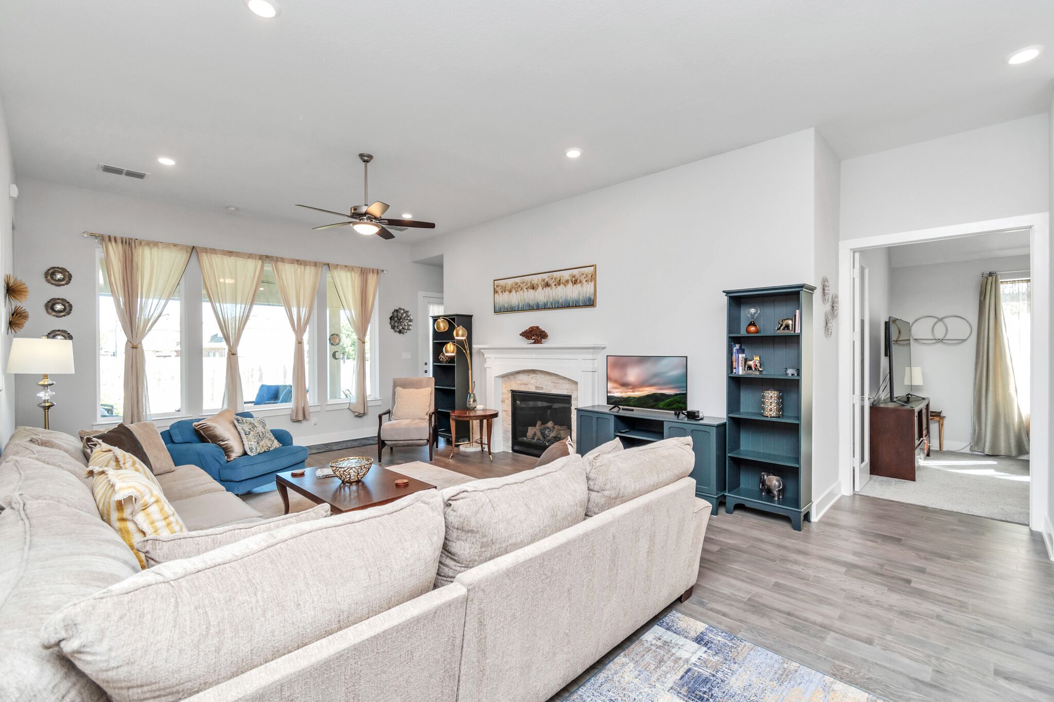 All the comforts of Home 1-story home, 4 bed, 3.5 bath. Close proximity to the Woodlands community, shopping and trail areas where you can ride a bike, jog or just take a relaxing nature walk. Perfect for traveling professionals that need a temporary home.Also perfect for people needing a home while their home is under repair due to insurance claim, repair, remodeling or construction or any other life situation.Equally so it can fit a family in a nice, comfortable and safe environment. Close to wooded areas, great for walking and biking.Th e community also has a volleyball court. Very easy access to the Woodlands area, shopping and lakes.