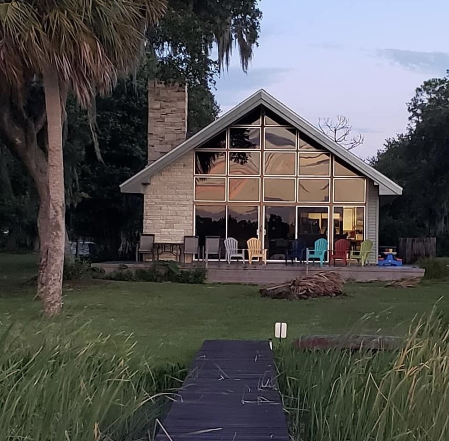 McRobinstone Lakehouse - perfect mid century getaway on sleepy Lake Pierce Two story, glass front lake house on sleepy Lake Pierce! The mid century A-frame provides a great gathering place for the family or friends getaway. The 3 bedroom, plus loft, 2 bath, main house ($225/night), with an open living area sleeps 10 in beds, (2 rooms have 2 beds in each room) with sleeping mats for 4 children. The...