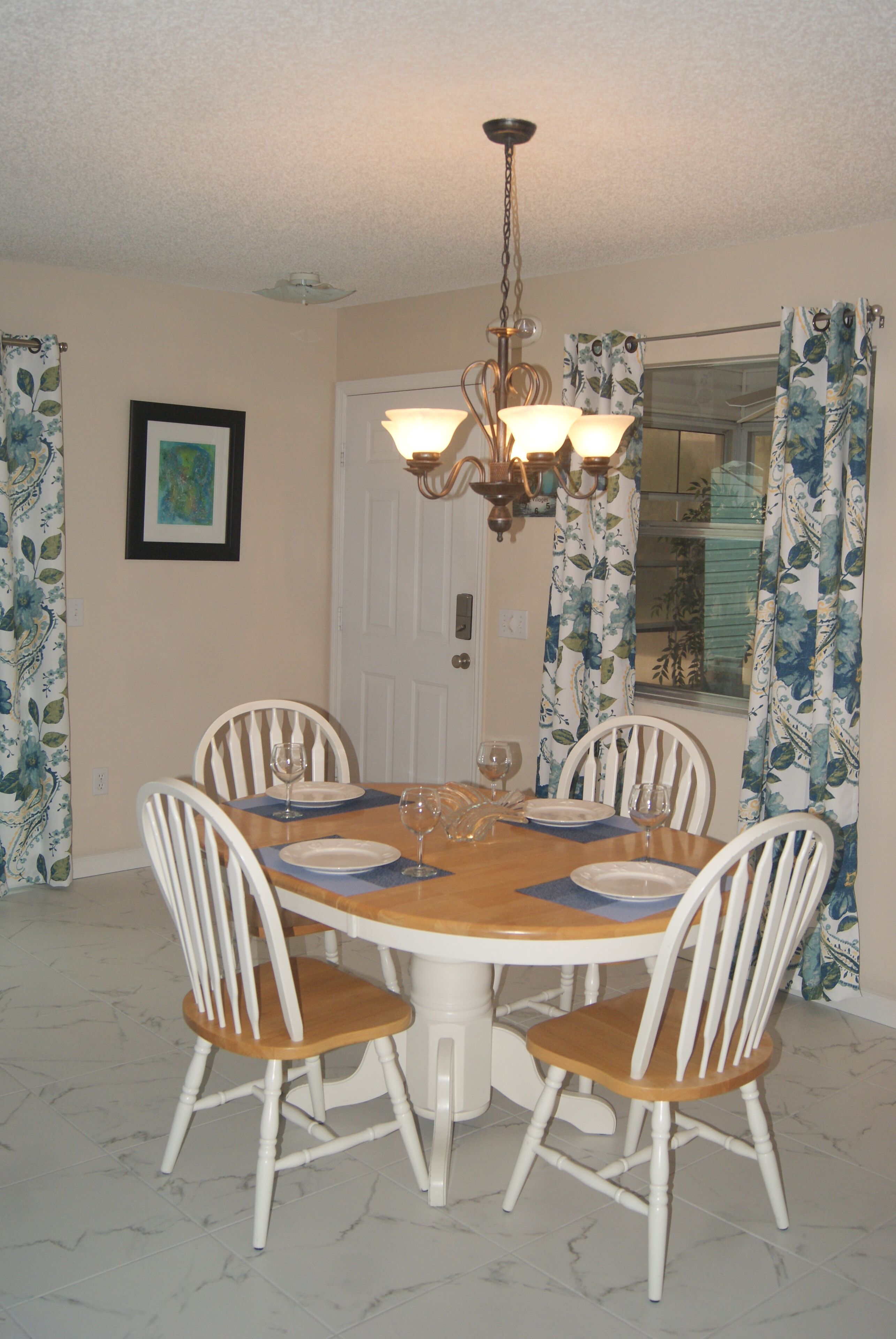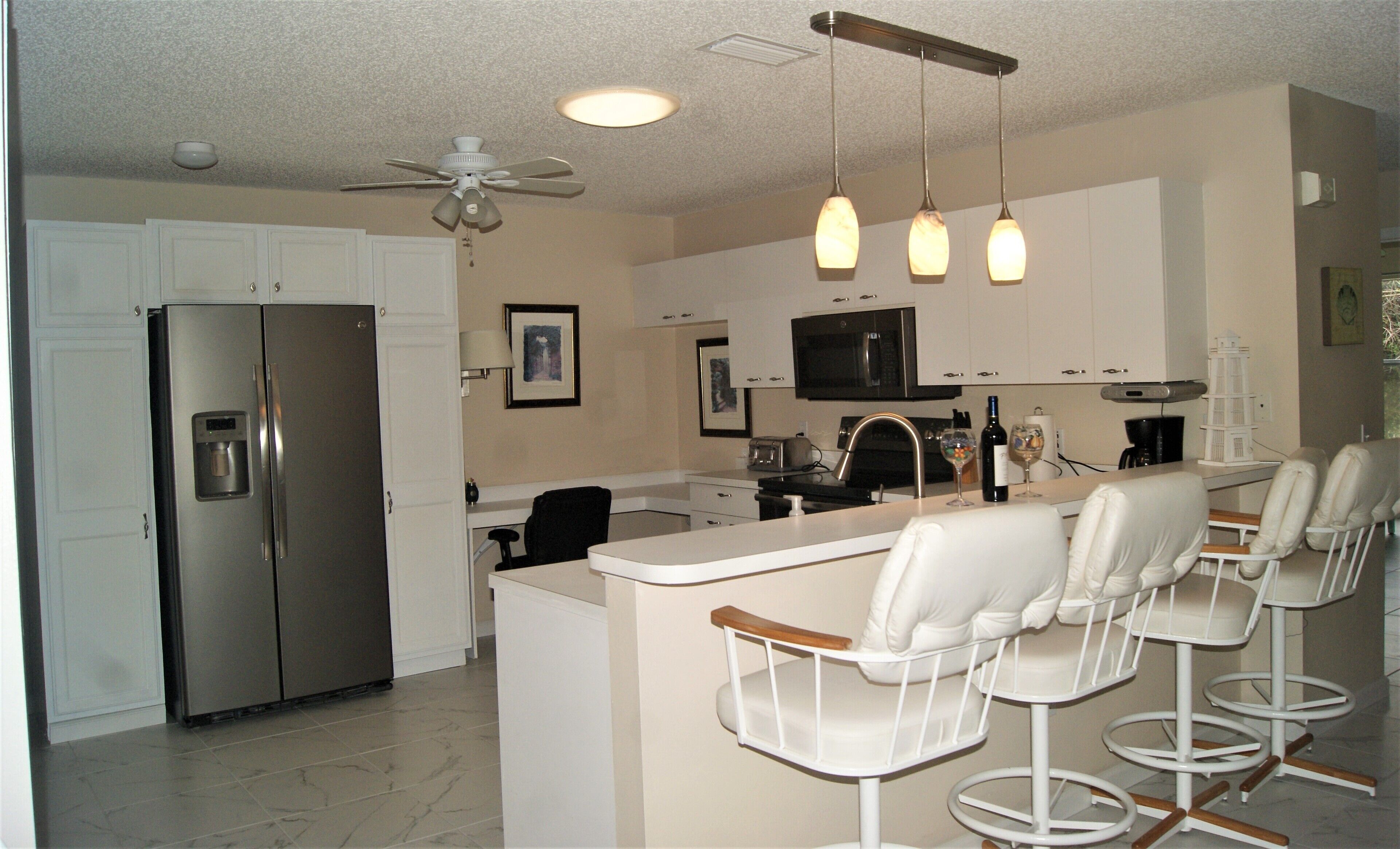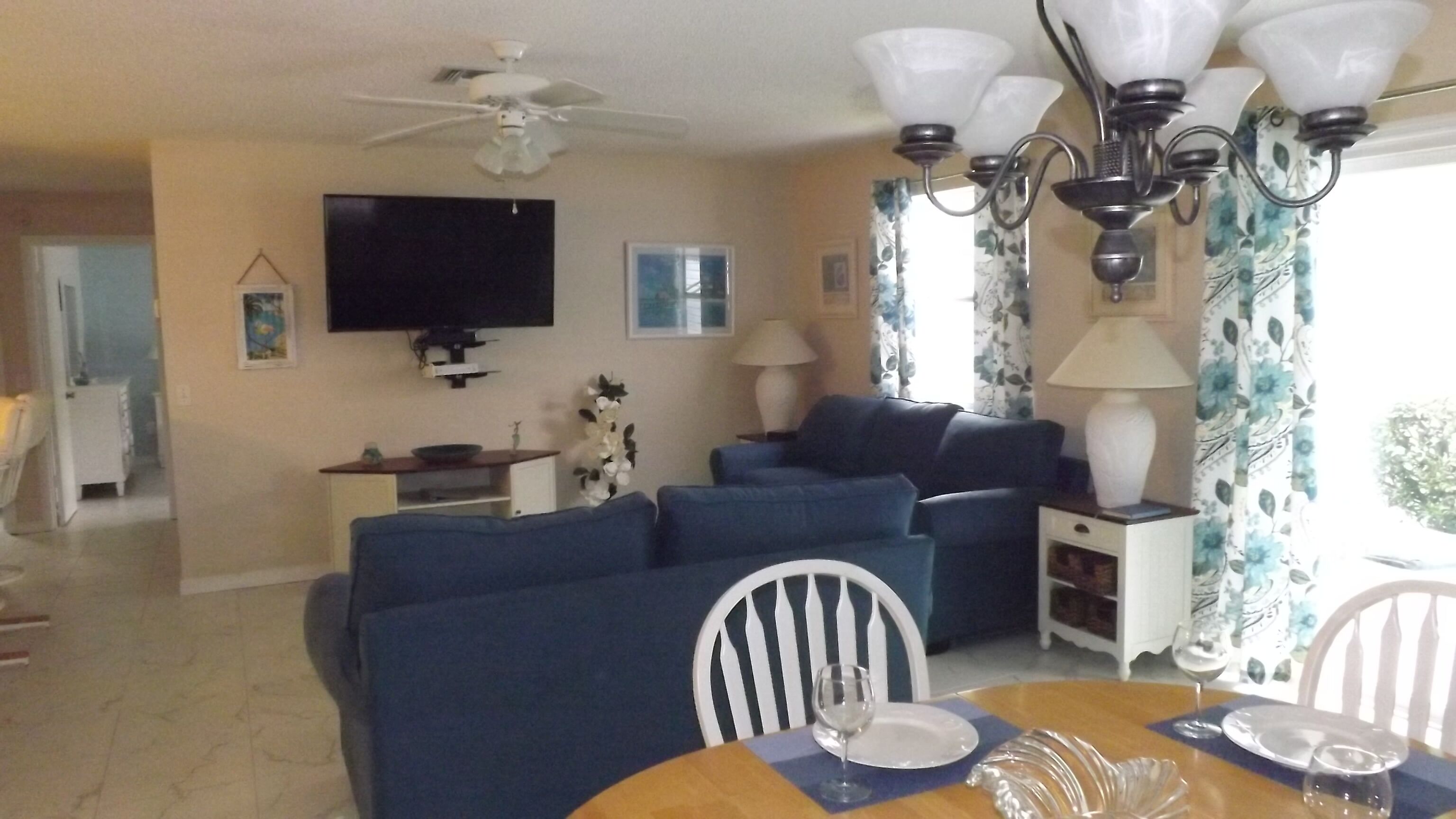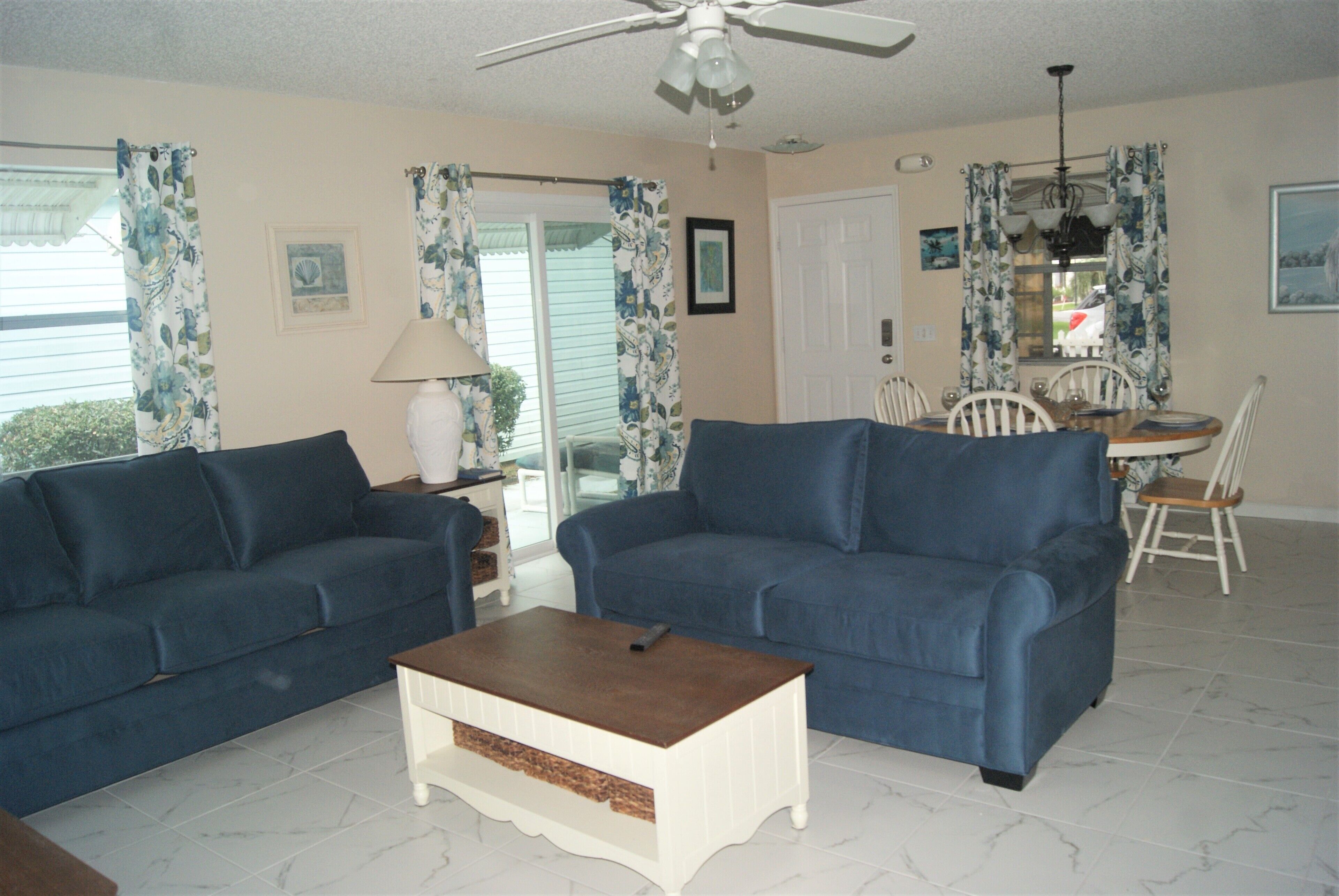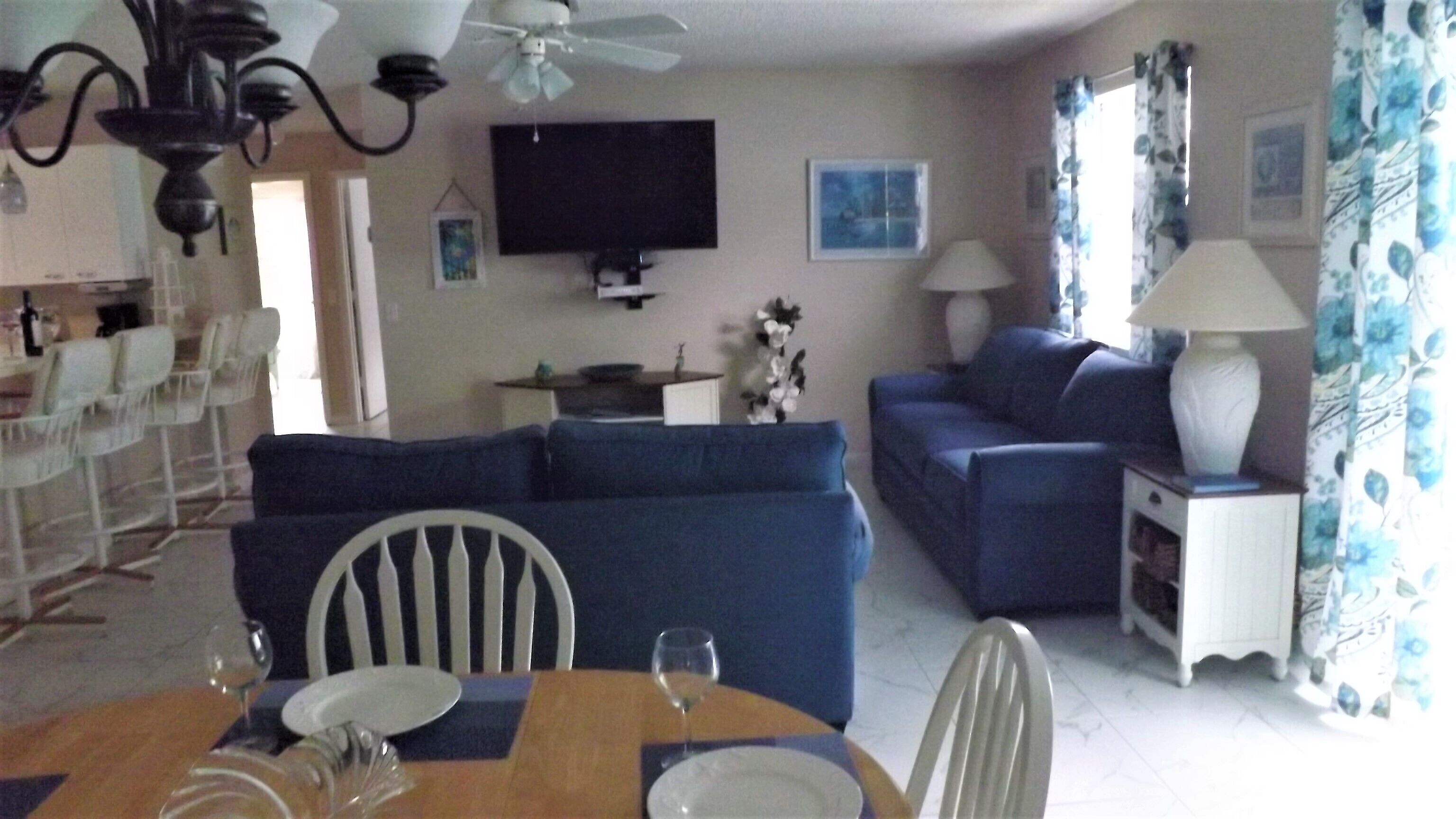 The Villages, Fl-The World's Friendliest Home Town for Retirees-55+ The Villages, Florida is the largest retirement (55+) community in the world. There are over 150,000 people who enjoy The Villages active lifestyle. The community is spans over parts of three counties. We are a golf cart community with over 100 miles of golf cart paths. We have 12+ championship golf courses and 40+ executive golf courses. The executive golf is free, although a trail fee is assessed when riding your golf cart. We have over 70 adult and family pools which may be used by the residents. Shuffleboard, bocce courts, pickleball and tennis are also available. There are three town squares that have music from 5-9 PM every night of the week and shops are open during these hours. Dancing, especially line dancing is very popular. There are also over 100 excellent restaurants and many have entertainment each night. The Villages is a very safe community with three police and fire departments serving the area. There is also a hospital, assisted living facilities and memory care facilities. We have neighborhood watch on patrol 24/7. Our patio villa is a two-bedroom, two-bathroom single home with a screened in lanai and a patio. There is a car and a half garage. It has been recently updated with new appliances and beautiful furniture. The master bedroom has a comfortable king size bed with an attached bathroom with a walk-in shower. There is a large walk in closet in the master. The guest bedroom has a queen bed and looks out on a preserve in the back of the home. The guest bath has a tub and shower. There is a washer and dryer for your convenience. The home is fully turnkey (hairdryer, linens, towels, pool towels, kitchen supplies, etc.). Internet and cable TV are provided.We have monthly rates during the prime winter months of January through March. We have weekly rates during the summer months (May-Aug). A golf cart is available for your use while renting our home. Our prices include all utilities and taxes. There is an additional cleaning fee of $125.00 and taxes.