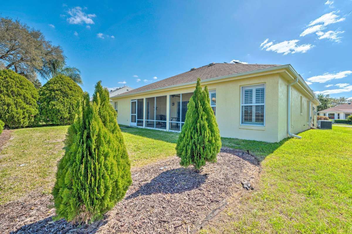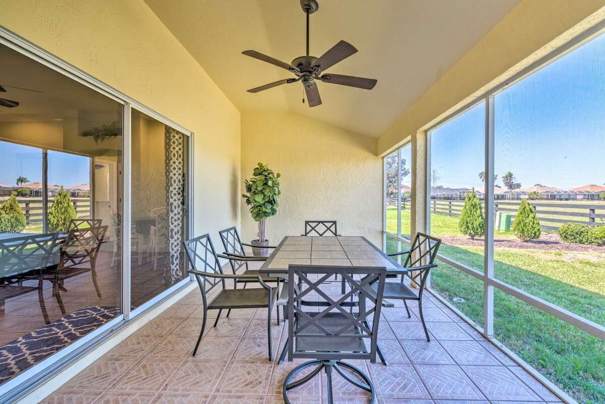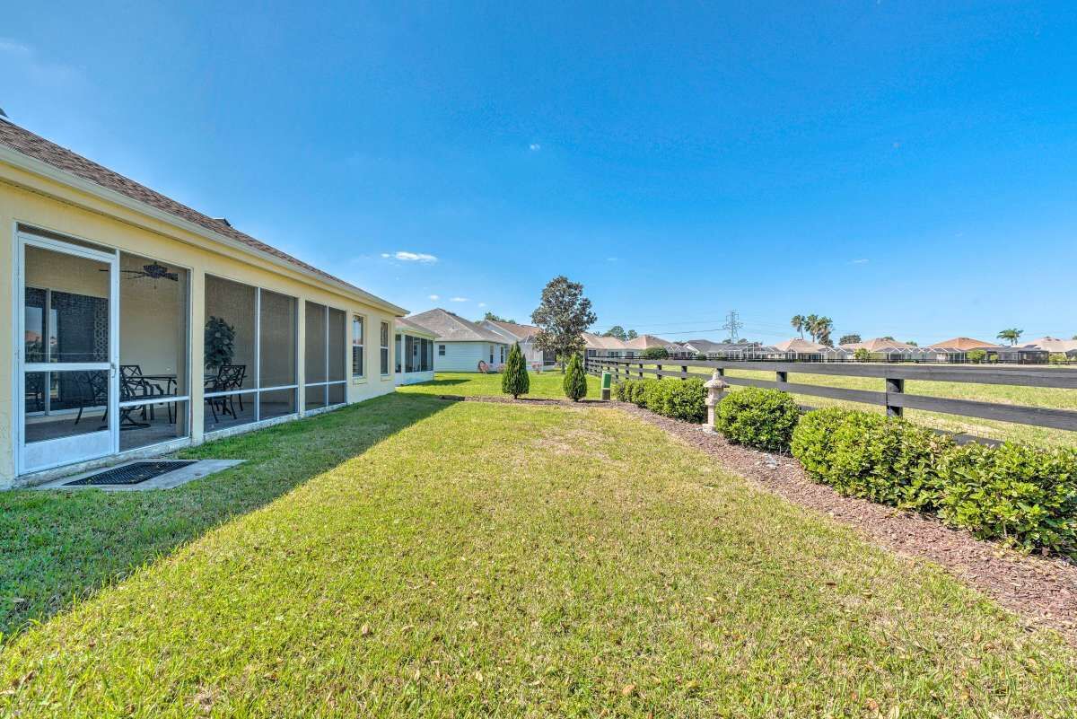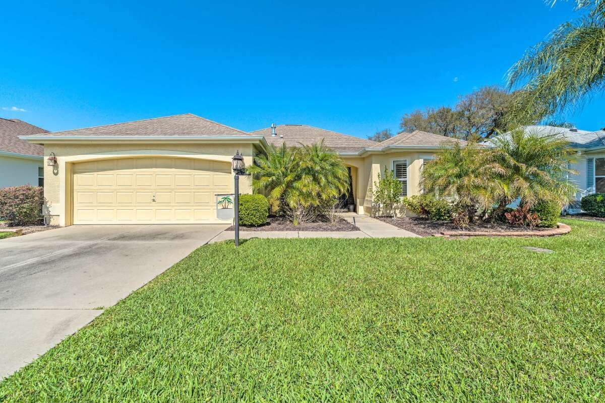 Chic Home in The Villages, close to Spanish Square, Sumter Landing & more! SUMMARY:Trade the snow for sunshine when you escape to this peaceful Florida home! Featuring 2 bedrooms, 2.5 bathrooms, and a chic interior, this home is perfect for a laid-back excursion. With Lake Sumter Landing less than 3 miles up the road and access to ample community amenities like an outdoor pool and a tennis court, there’s no need to travel far. You’ll feel refreshed at the end of each day while relaxing on the lanai and enjoying a meal prepared in the fully equipped kitchen! THE HOME:- 1,804 Sq Ft | In-Unit Laundry | Free WiFi- Bedroom 1: King Bed | Bedroom 2: Queen Bed- Kitchen: Fully equipped w/ stainless steel appliances, drip coffee maker w/ grinder, dishware & flatware, wine cooler, spices, knife set, toaster, Crock-Pot, cooking basics- Indoor Living: 2 Smart TVs, gas fireplace, dining table, ceiling fans, laptop-friendly office, books, board games- General: Central A/C & heat, towels & linens, hair dryer, iron & board- Suitability: 55+ community, step-free access, grab rails in shower, not suitable for children (lack of child-friendly amenities)- Parking: Driveway (2 vehicles), Garage (2 vehicles)COMMUNITY GUEST PASS:- Guest with a Guest Pass (one per person, two allowed per household) will have access to executive golf courses and community pools.- Instruction and information required to obtain Guest Pass(es) will be provided upon booking confirmation. - There is a one-time Guest Pass fee of $50 charged by The Villages Community Center.THE VILLAGES GATE PASS: - The property is located in a gated community. A gate pass will be provided for the guest.