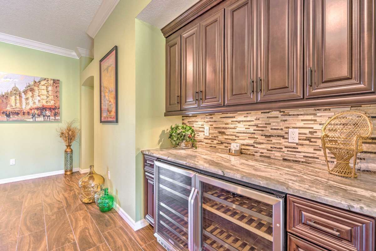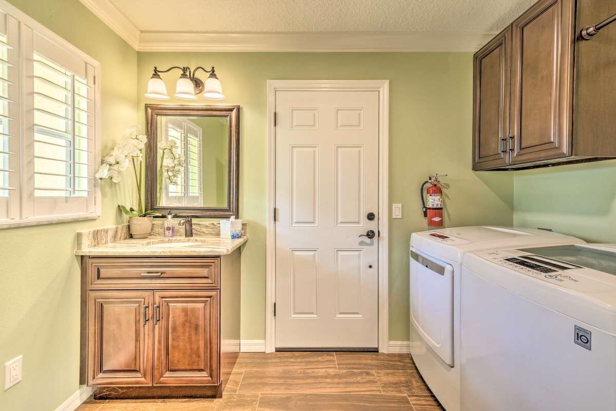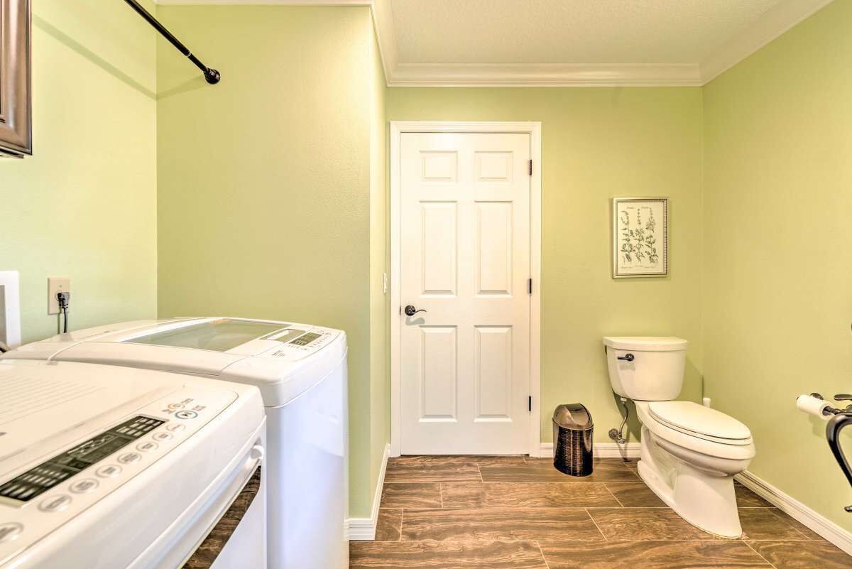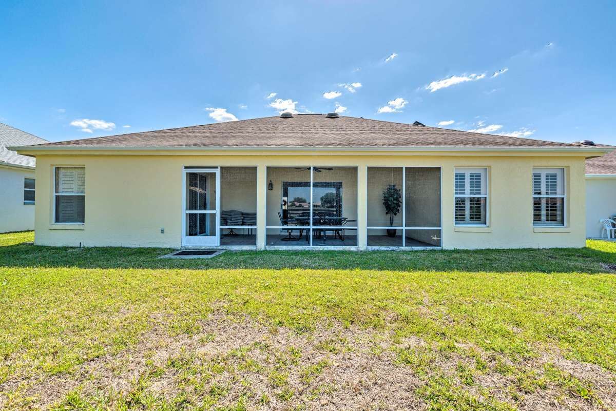 Chic Home in The Villages, close to Spanish Square, Sumter Landing & more! SUMMARY:Trade the snow for sunshine when you escape to this peaceful Florida home! Featuring 2 bedrooms, 2.5 bathrooms, and a chic interior, this home is perfect for a laid-back excursion. With Lake Sumter Landing less than 3 miles up the road and access to ample community amenities like an outdoor pool and a tennis court, there’s no need to travel far. You’ll feel refreshed at the end of each day while relaxing on the lanai and enjoying a meal prepared in the fully equipped kitchen! THE HOME:- 1,804 Sq Ft | In-Unit Laundry | Free WiFi- Bedroom 1: King Bed | Bedroom 2: Queen Bed- Kitchen: Fully equipped w/ stainless steel appliances, drip coffee maker w/ grinder, dishware & flatware, wine cooler, spices, knife set, toaster, Crock-Pot, cooking basics- Indoor Living: 2 Smart TVs, gas fireplace, dining table, ceiling fans, laptop-friendly office, books, board games- General: Central A/C & heat, towels & linens, hair dryer, iron & board- Suitability: 55+ community, step-free access, grab rails in shower, not suitable for children (lack of child-friendly amenities)- Parking: Driveway (2 vehicles), Garage (2 vehicles)COMMUNITY GUEST PASS:- Guest with a Guest Pass (one per person, two allowed per household) will have access to executive golf courses and community pools.- Instruction and information required to obtain Guest Pass(es) will be provided upon booking confirmation. - There is a one-time Guest Pass fee of $50 charged by The Villages Community Center.THE VILLAGES GATE PASS: - The property is located in a gated community. A gate pass will be provided for the guest.
