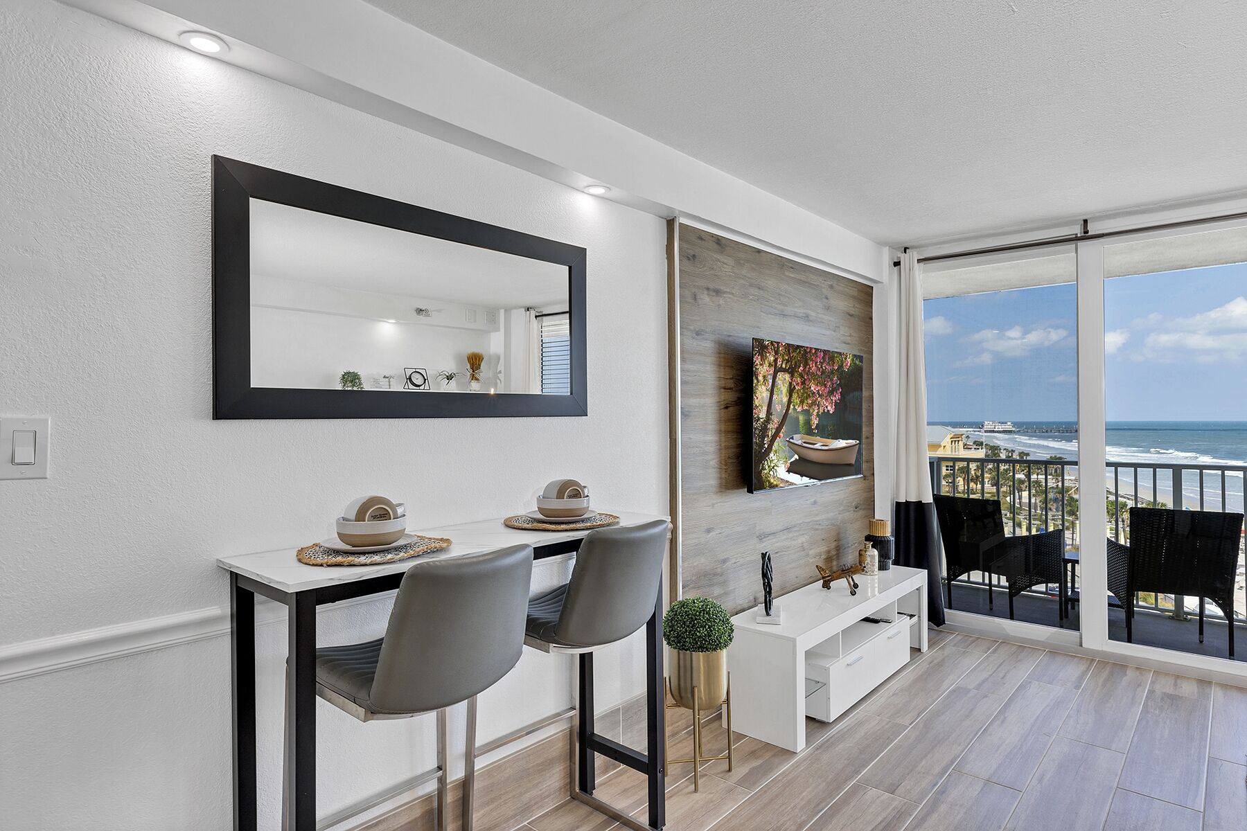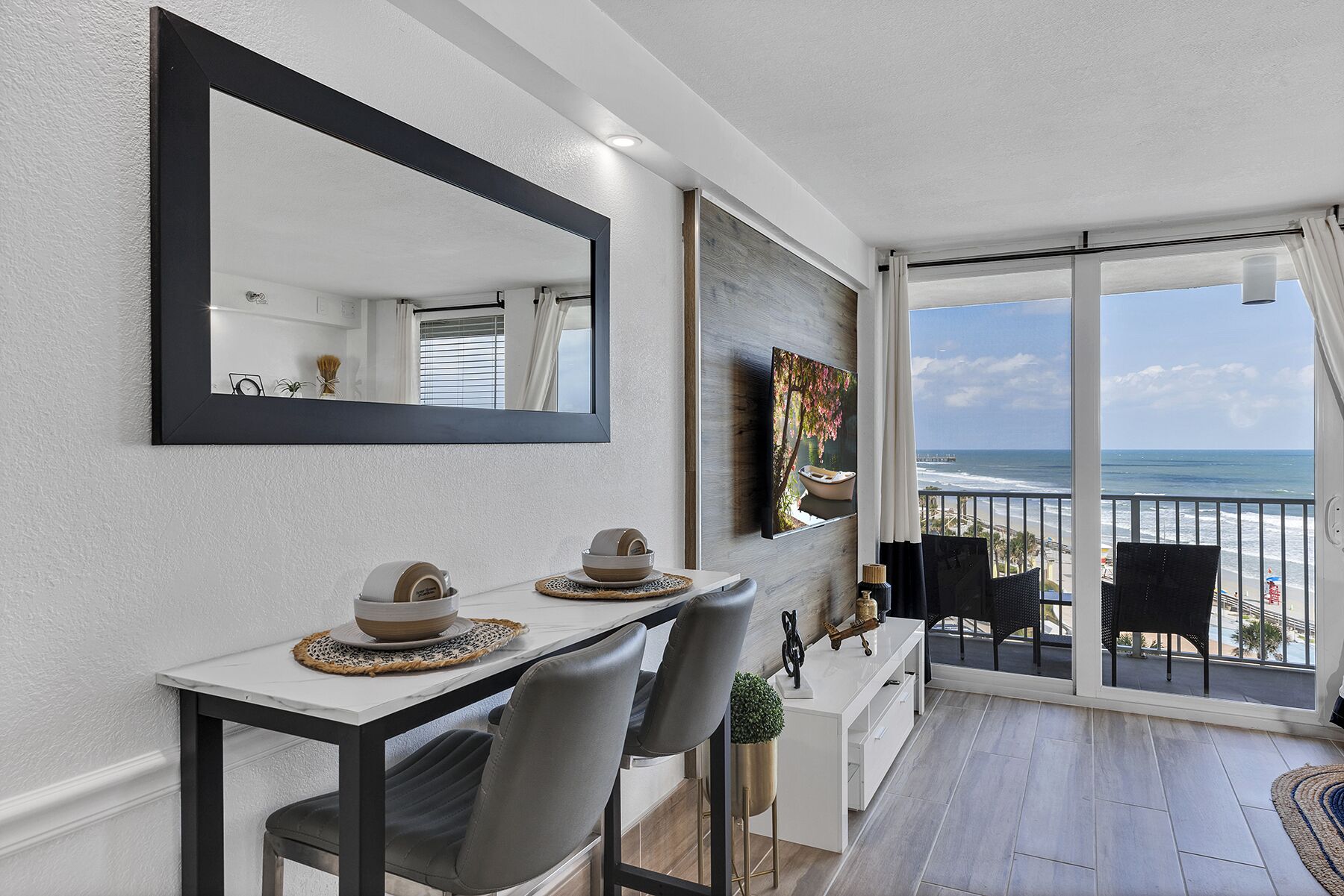 Beachfront Remodeled Studio in Daytona Beach with King-Size Bed Oceanfront and fully renovated studio in Daytona Beach. The studio offers a king-size mattress, gel-cooling pillows, and a sofa bed. You can relax watching the ocean view while enjoying a freshly made espresso coffee. It also offers a 55-inch smart TV from which you can choose channels or movies from Netflix, Prime Video, or Paramount Plus. Located in the Habour Beach Resort, this complex offers free amenities such as a pool, workout area, parking, wifi, and beach access. Don`t think twice!