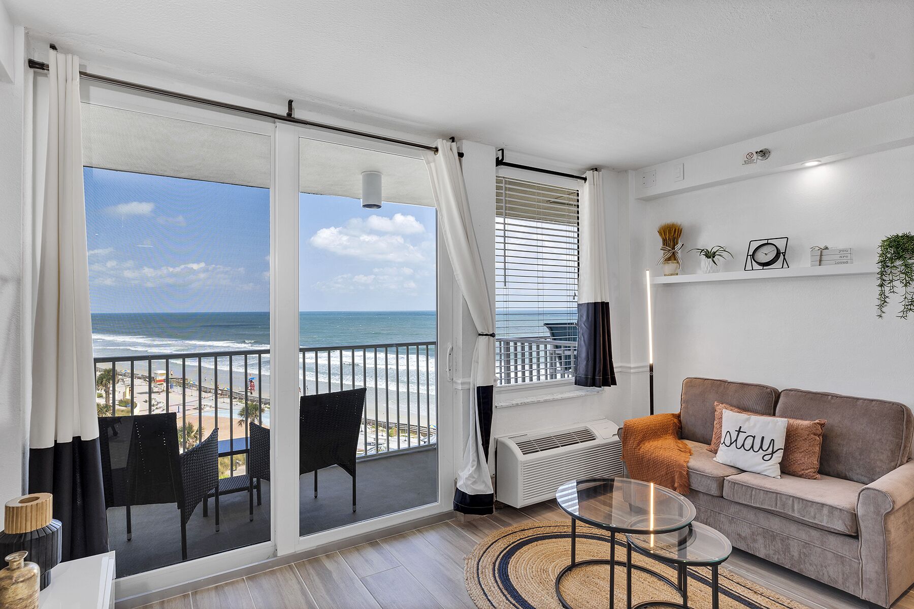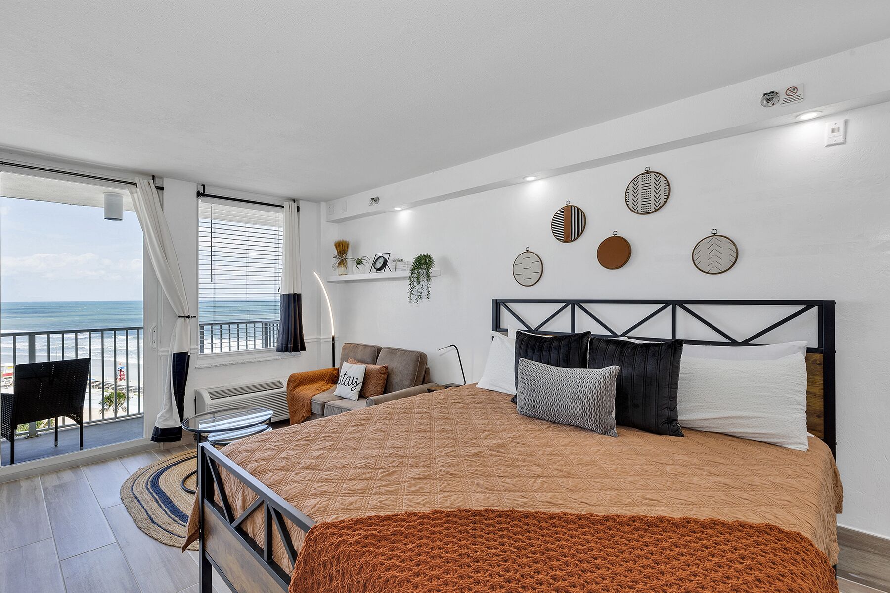Beachfront Remodeled Studio in Daytona Beach with King-Size Bed Oceanfront and fully renovated studio in Daytona Beach. The studio offers a king-size mattress, gel-cooling pillows, and a sofa bed. You can relax watching the ocean view while enjoying a freshly made espresso coffee. It also offers a 55-inch smart TV from which you can choose channels or movies from Netflix, Prime Video, or Paramou...