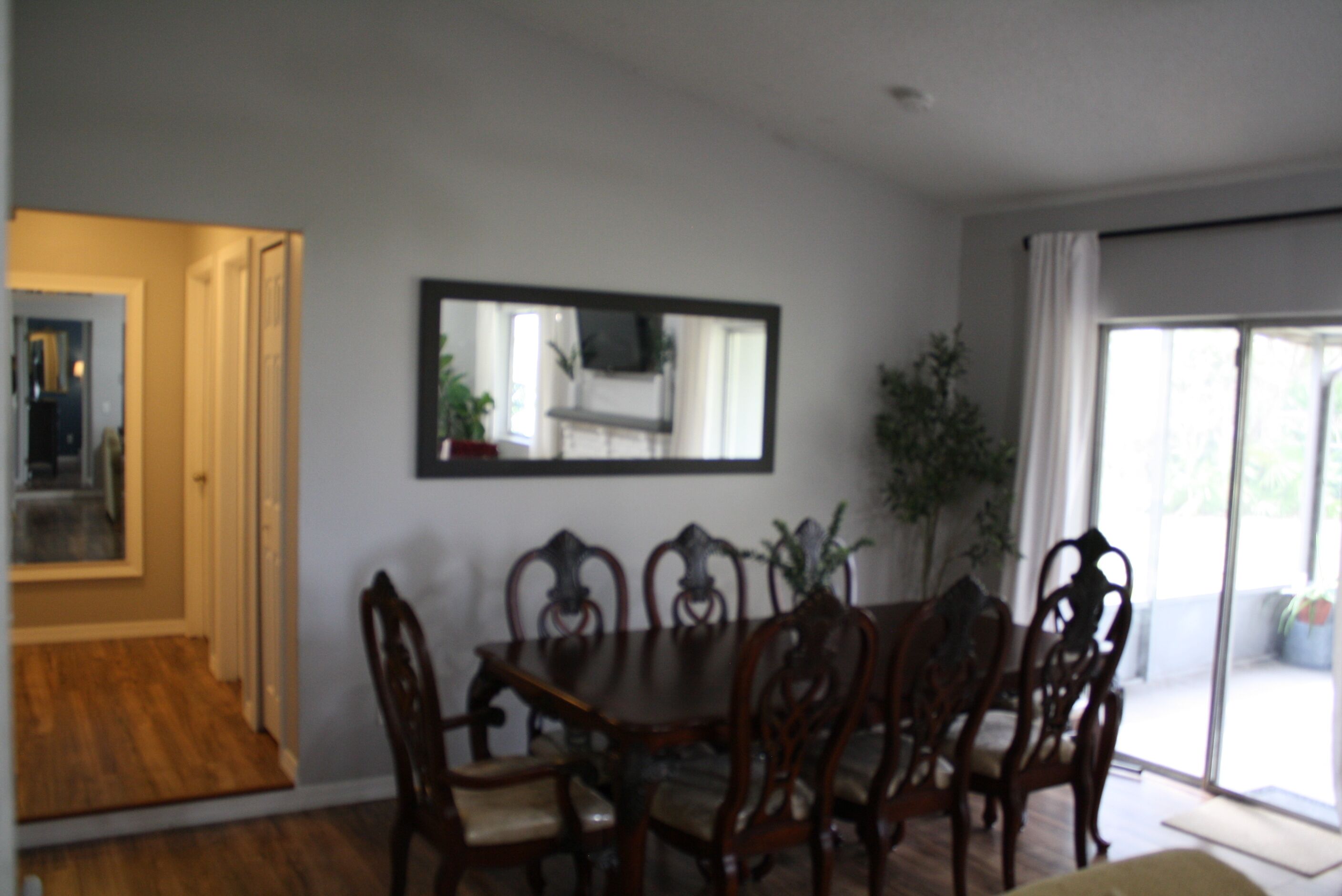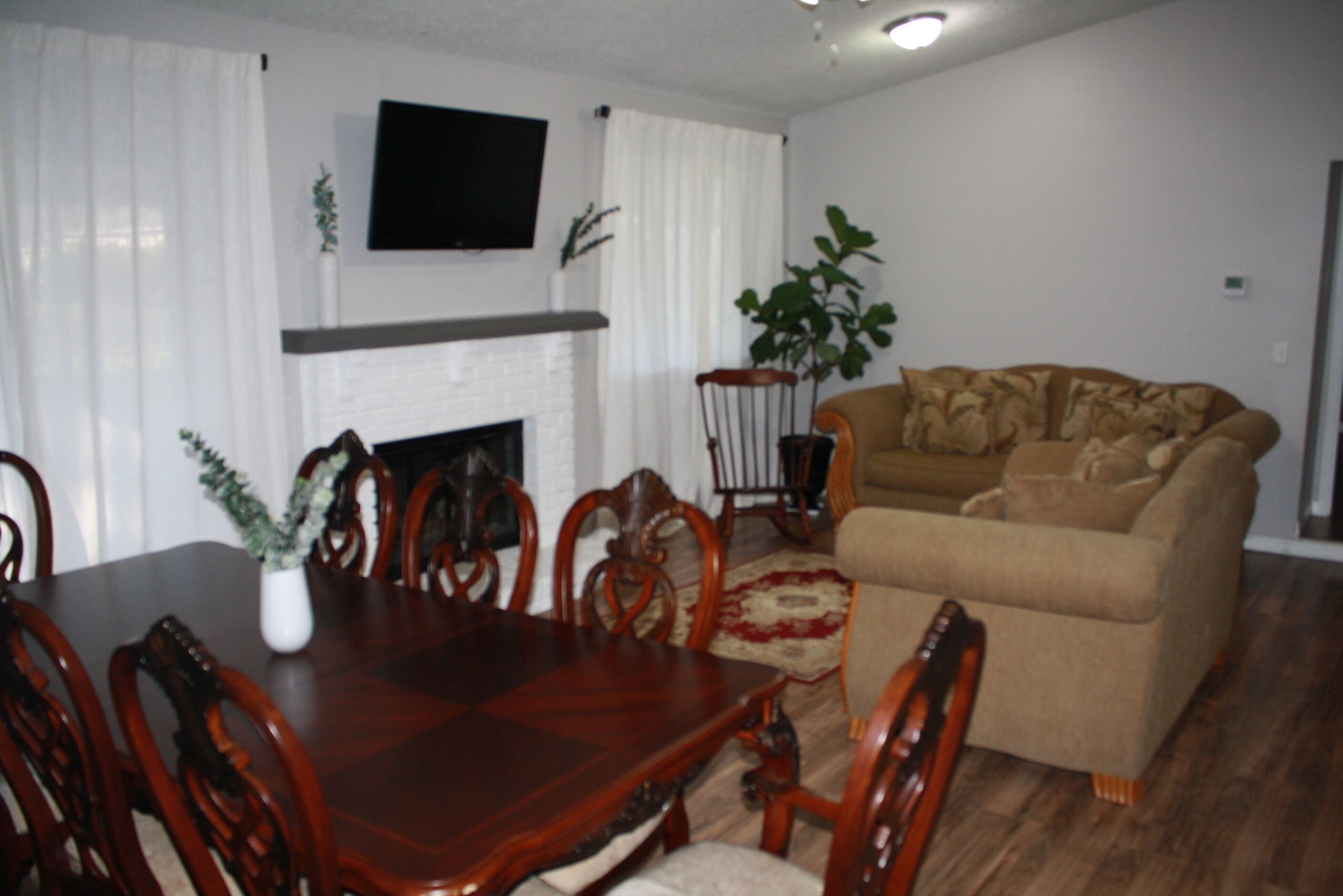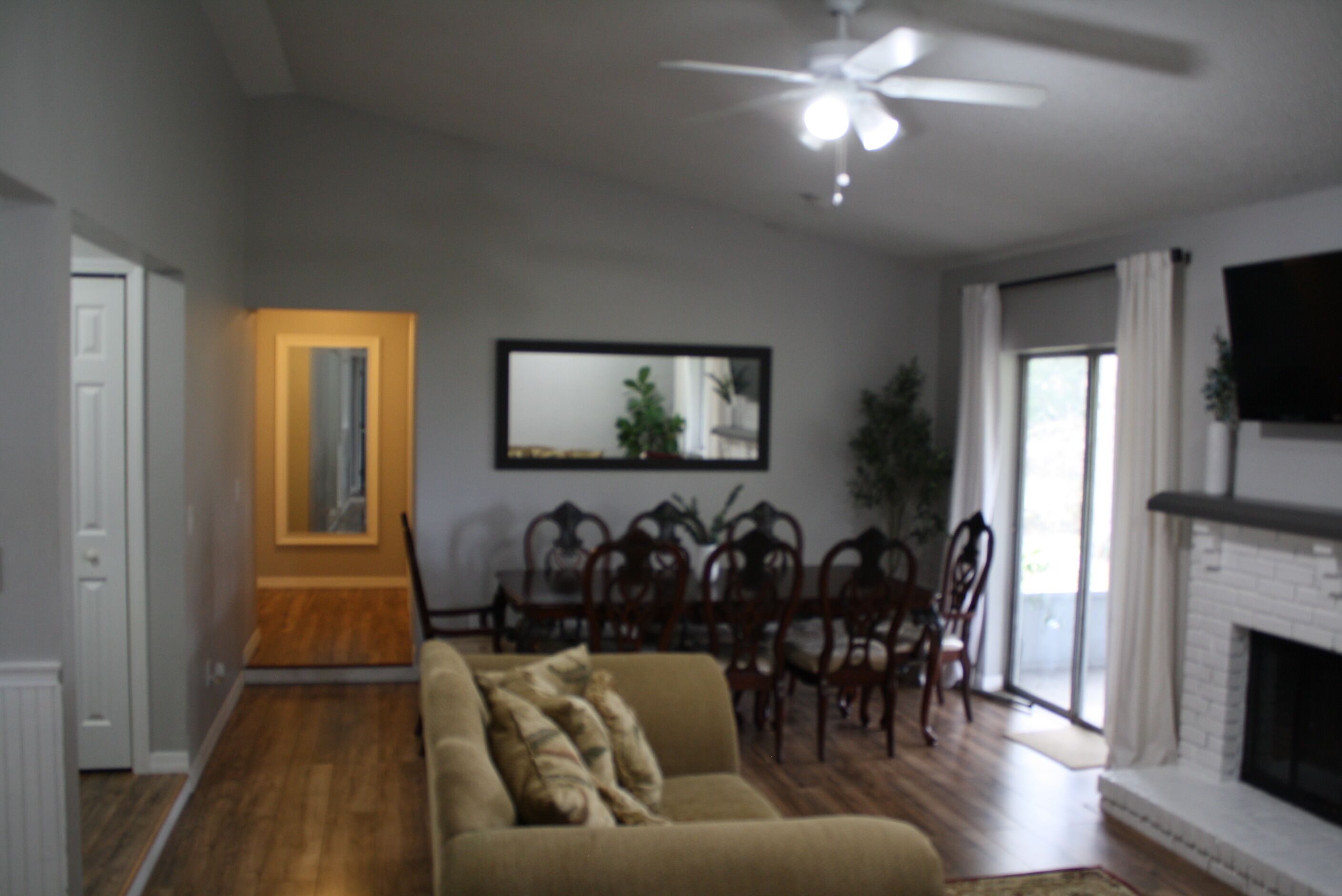 4 Bedroom Home 30 min from Daytona with King Size Bed and onsite Laundry room! From the moment you enter the home, you will notice the natural light coming from the front door kitchen and patio areas as the family and dining rooms are in the center of the home with a 55-inch TV above the fireplace. You will notice the master bedroom on the right side of the house has a Smart TV, a king-size bed, and a private master bathroom. The other three bedrooms are on the opposite side of the home with the second full bathroom and contain only queen-sized beds. The first guest bedroom has a list of classic VHS movies that we hope you love watching on a 24-inch TV. The second guest bedroom has a DVD player a small collection of DVD movies and another 24-inch TV. The third guest bedroom has no TV but a closet space that opens up to a mini workstation.You will love how we turned our garage space into another entertainment room with lots of space and a smart 32-inch TV for streaming your favorites.If you are interested in the activities in the area please message us and we will be happy to help.