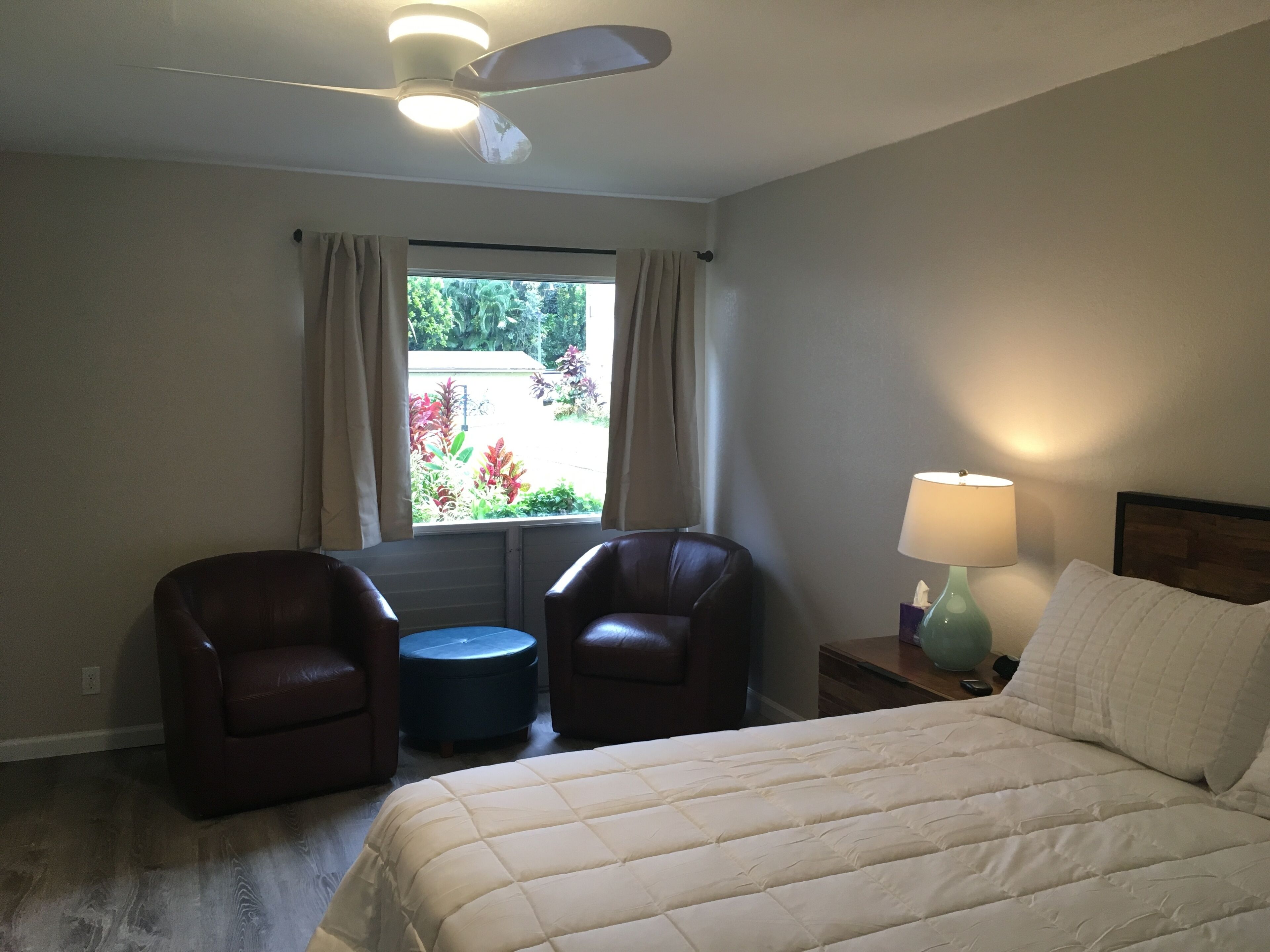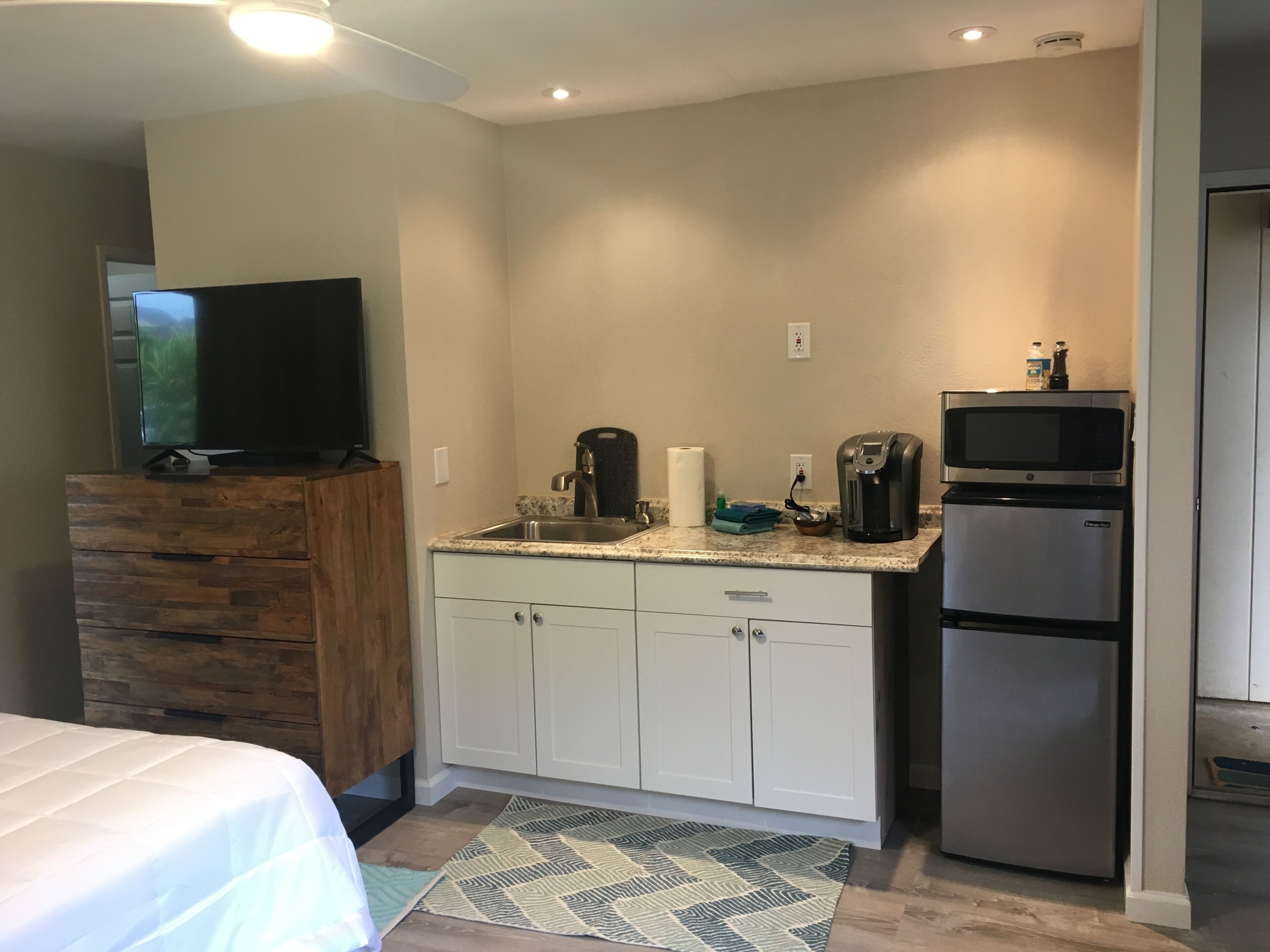 Adorable Studio, sleeps 3 - Totally renovated in 2018 Studio with queen bed (and air mattress available upon request). Totally renovated in 2018 with new floors, new tiled shower, new vanity, new interior paint, new ceiling fan, new furniture.. Studio has small refrigerator, microwave, coffee maker, toaster, and blender. There is no stove or oven. There is a gas grill at the pool.. We provid...