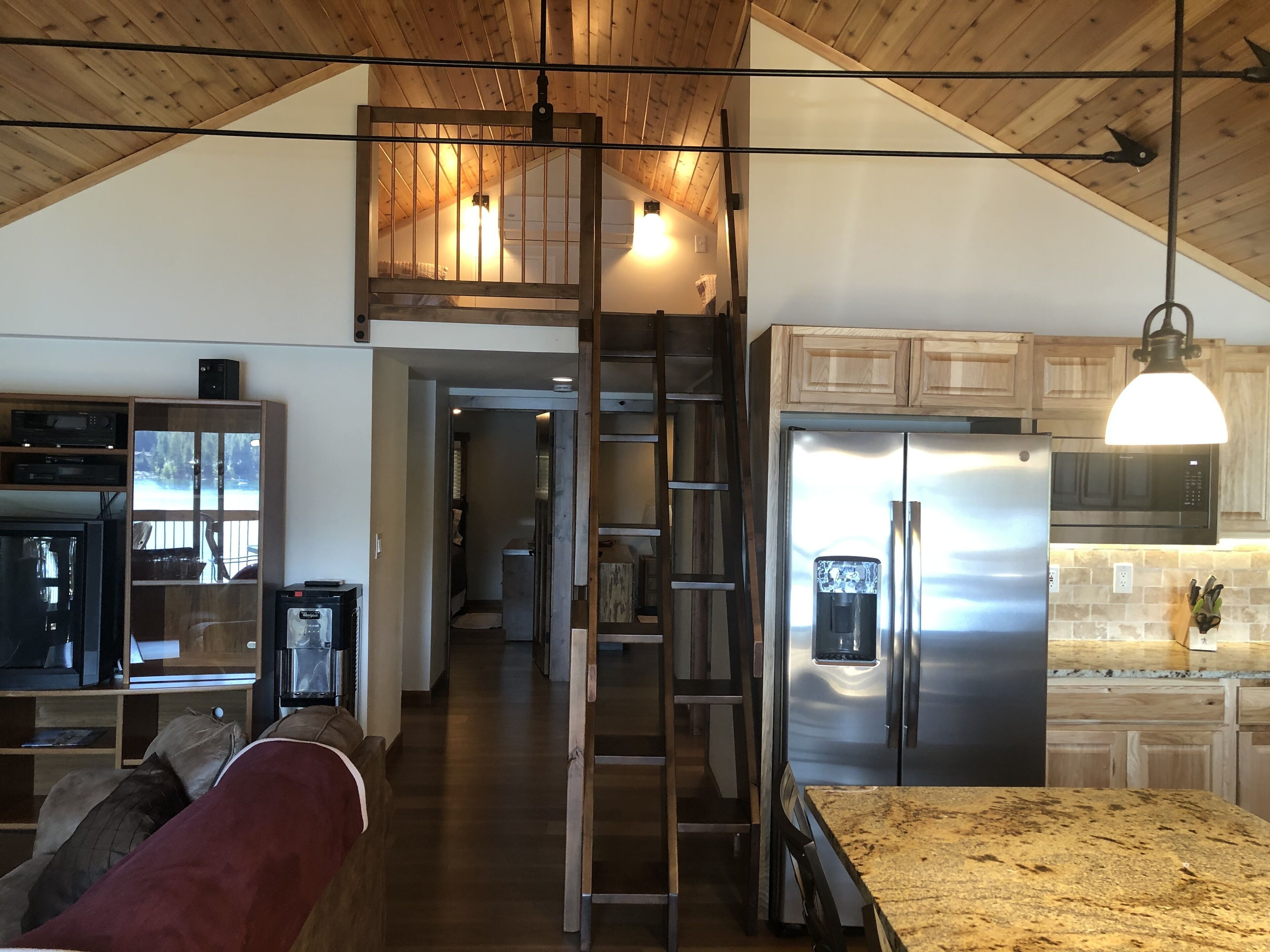 Quiet getaway on beautiful Hayden Lake. Leave the hustle and bustle behind. 1,000 sf two bedroom plus sleeping loft, with large bath and stacked full size washer and dryer. This cabin has been totally renovated and is waiting for you to enjoy it's southern exposure, covered deck and semi private sandy beach. The cabin is air conditioned and dish satellite tv is provided. Kitchen is fully equiped with new microwave, side-by-side refrigerator/freezer with ice and water dispenser, electric oven/cook-top and dishwasher.