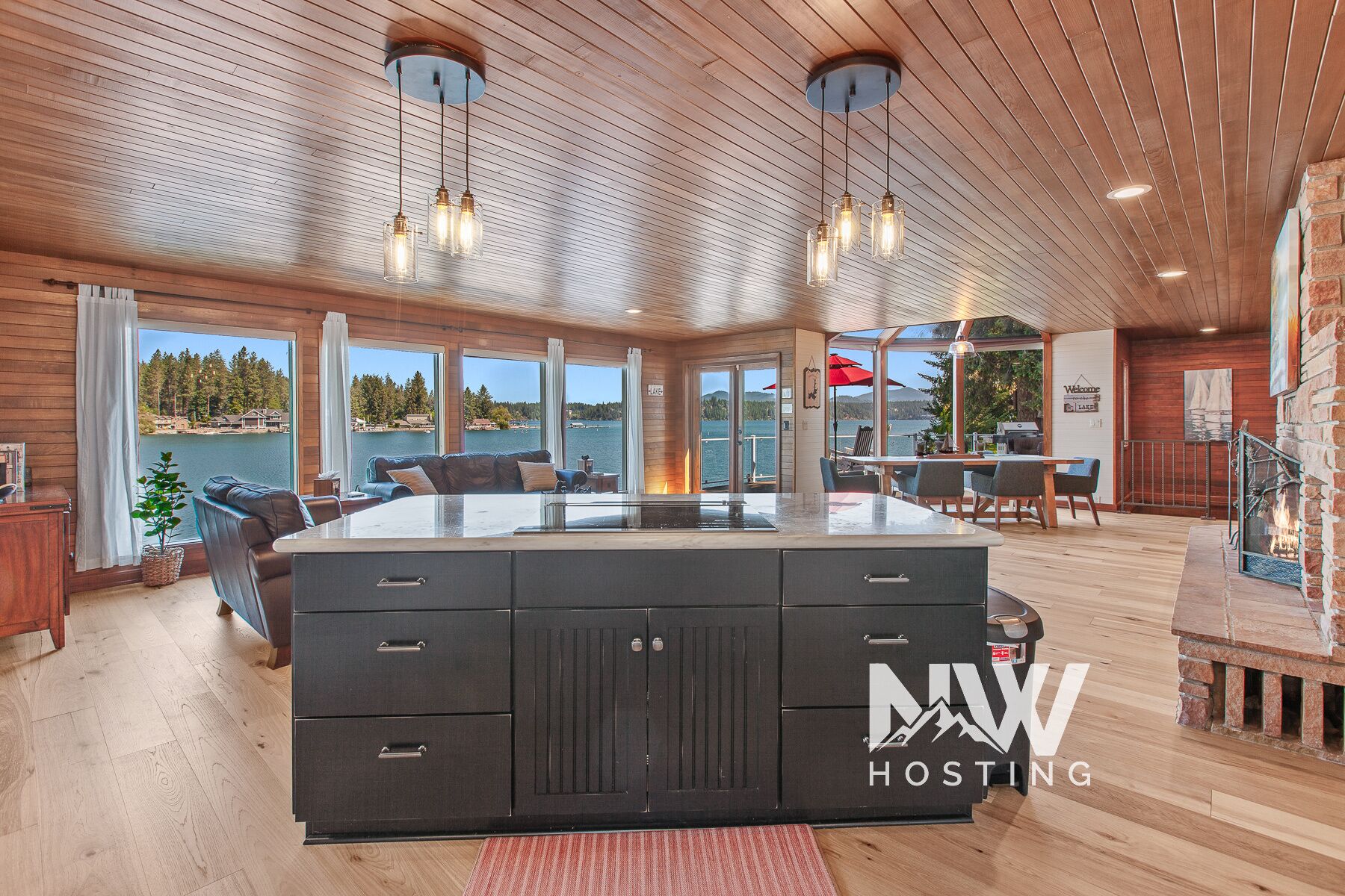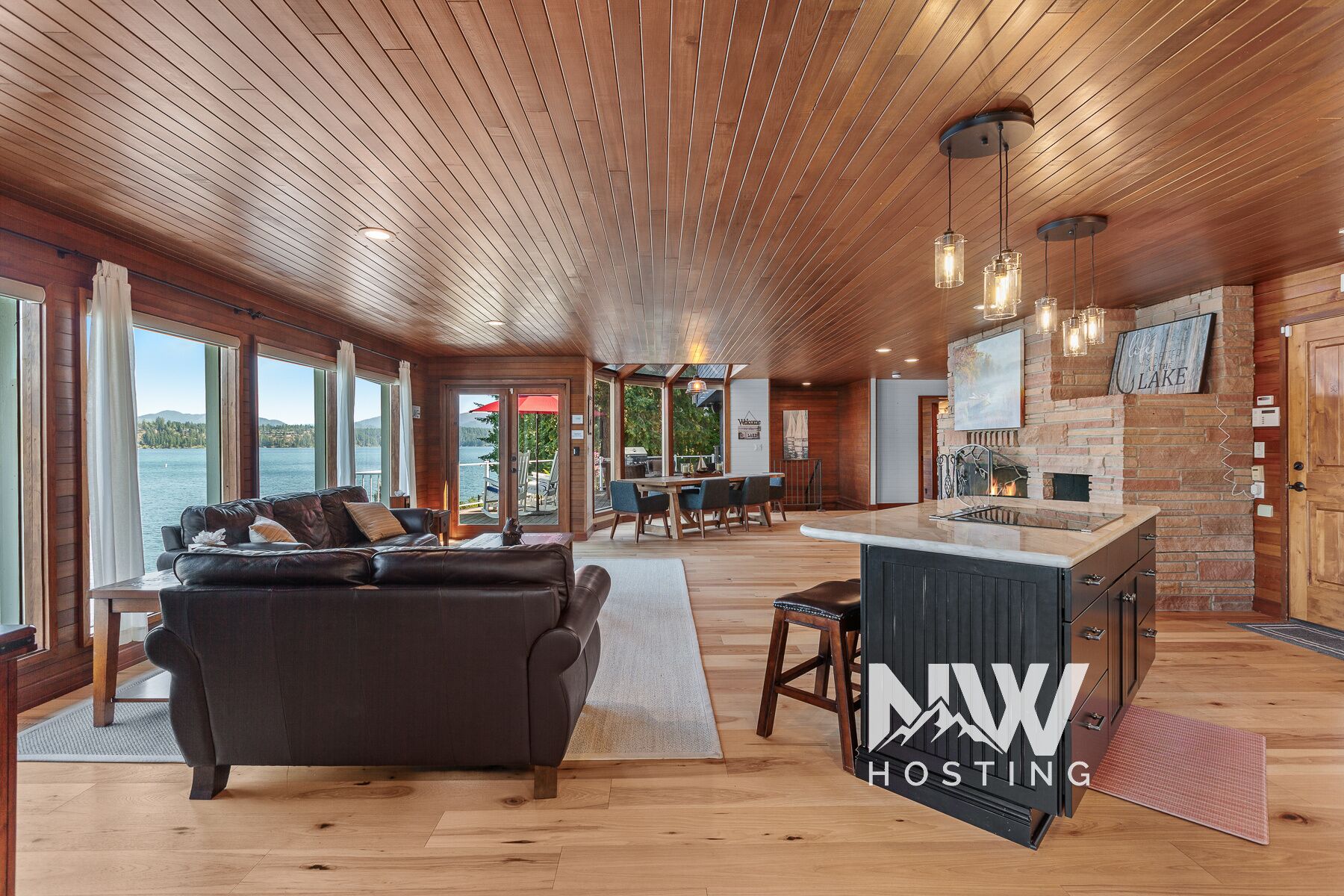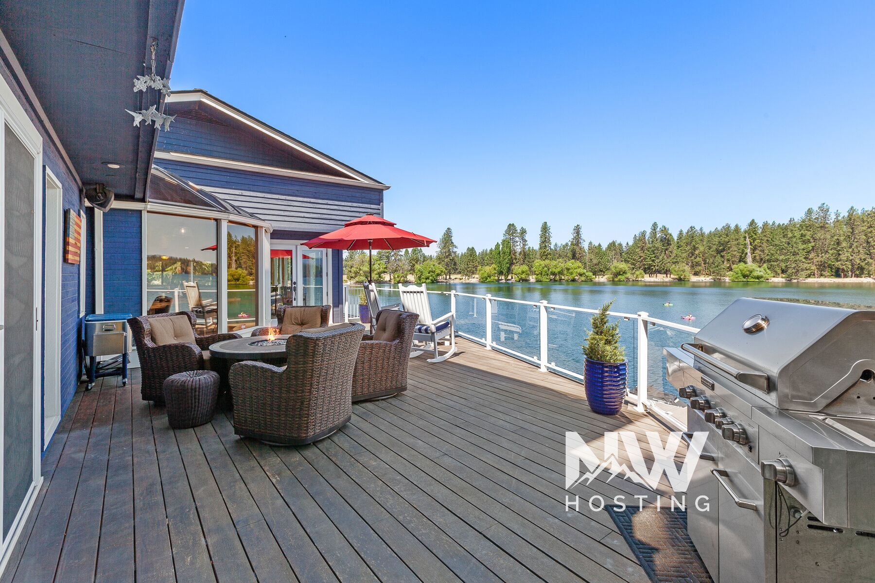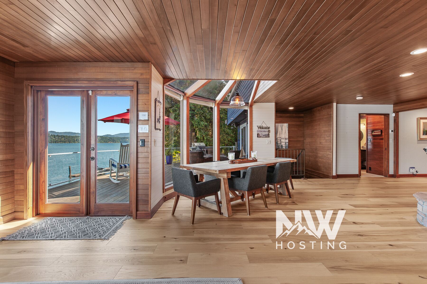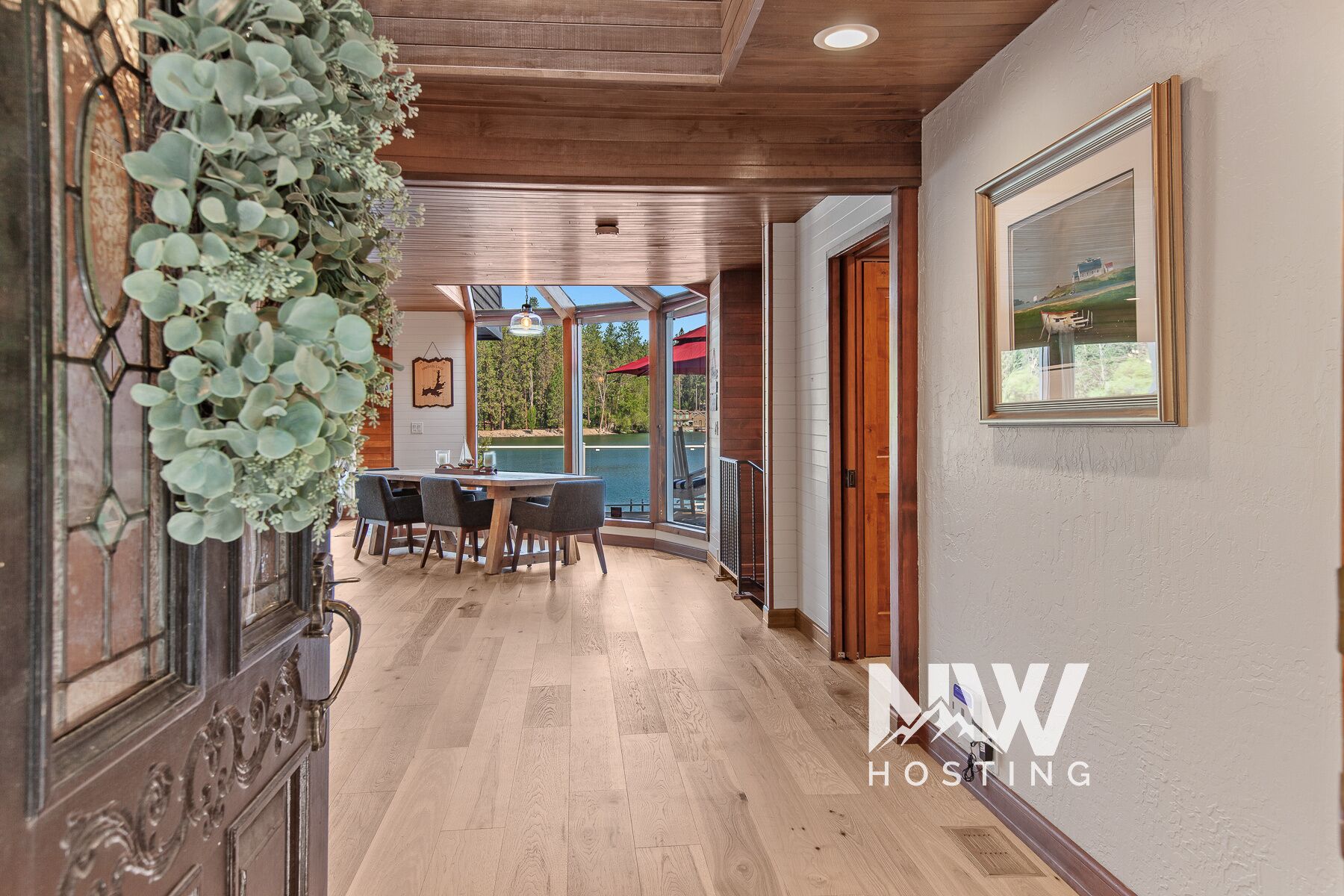 Hayden Lake | Waterfront & Hot tub | Sleeps 10 Welcome to your dream vacation home on the shores of Hayden Lake! Experience the ultimate lakeside retreat at this luxurious property, perfect for families and friends looking to create unforgettable memories. This spacious home offers a blend of relaxation and adventure with breathtaking lake views and top-notch amenities. With 4 bedrooms and 3 bathrooms, and spanning 3,416 sq. ft., there's ample space for everyone.The Space:Entry: Master Suite with a king bed, access to patio, and a bathroom with a standing shower. Washer and dryer are located in the first closet when entering the bedroom. Life jackets are kept in a double-door hallway closet, organized by size.Bay Window: Large dining table with seating for 6.Living Area: Large stone fireplace.Kitchen: Marble countertops and island.Dining Area: Seating for six.Upper Level:Master Suite: King bed, TV, sitting area, and bathroom with a standing shower. The master suite occupies the entire upper level and is open to the stairs.Lower Level:Living Room: Ample seating, access to lower-level patio, TV, and gas-burning fireplace.Guest Bedroom #3: Queen bed.Guest Bedroom #4: Bunk room with two twin bunk beds.Guest Bathroom: Standing shower.Outside:Plenty of parking and room for your boat trailer.Enjoy a pickleball net that easily moves from the garage to the driveway, along with cornhole and giant Jenga sets.Two kayaks, three paddle boards, a lily pad, and life jackets are provided for endless fun on the water.Direct access to the lake with your own private dock and boat slip.Hot tub.Fire table.BBQ.This Hayden Lake home is designed for comfort and enjoyment, ensuring a perfect getaway. Whether you're lounging on the dock, exploring the lake, or engaging in friendly competition with the provided games, there's something for everyone.Important Information: Upon booking, you'll receive an email with your stay agreement. Please review and sign it, as it contains important details about your reservation.Cancellation Policy: In the event of a canceled reservation, a credit card processing cancellation fee equivalent to 4% of the total reservation amount will apply. This fee will be charged to the credit card used for the initial booking and will be deducted from any refund issued.