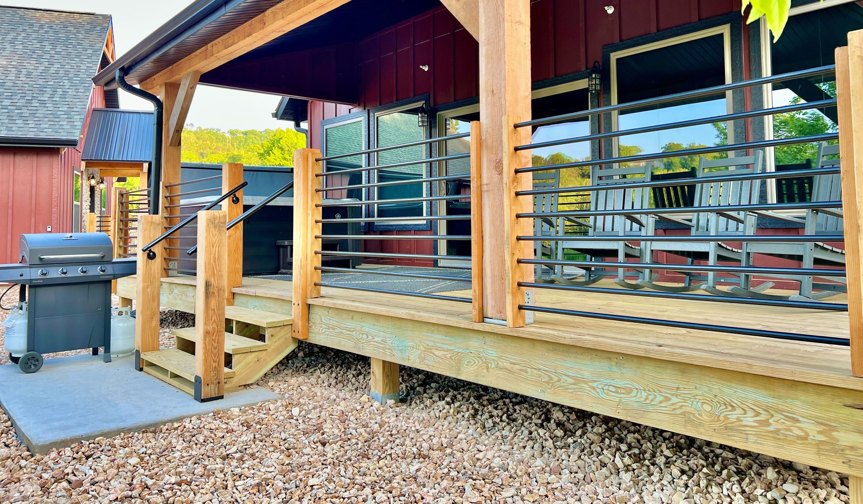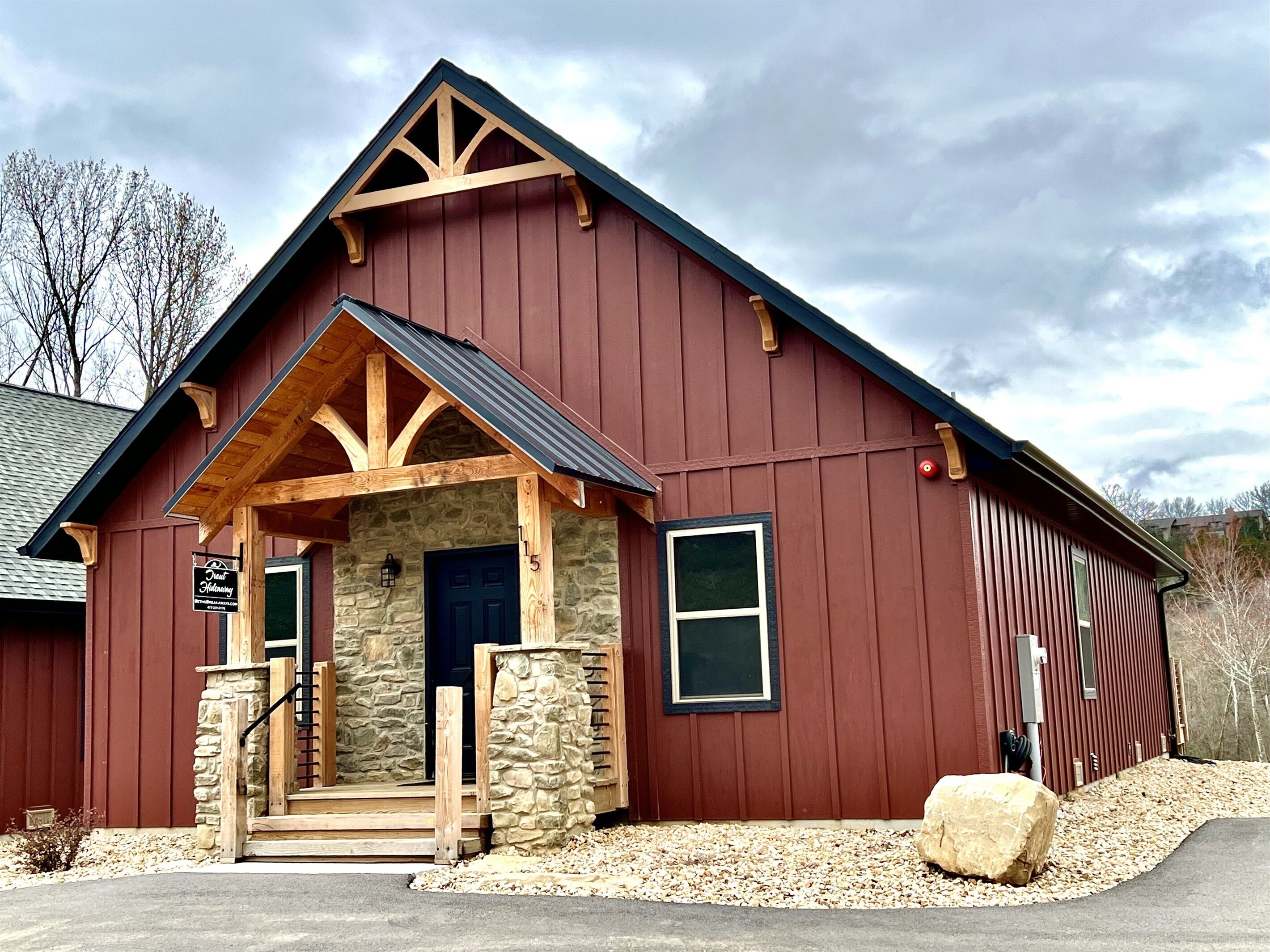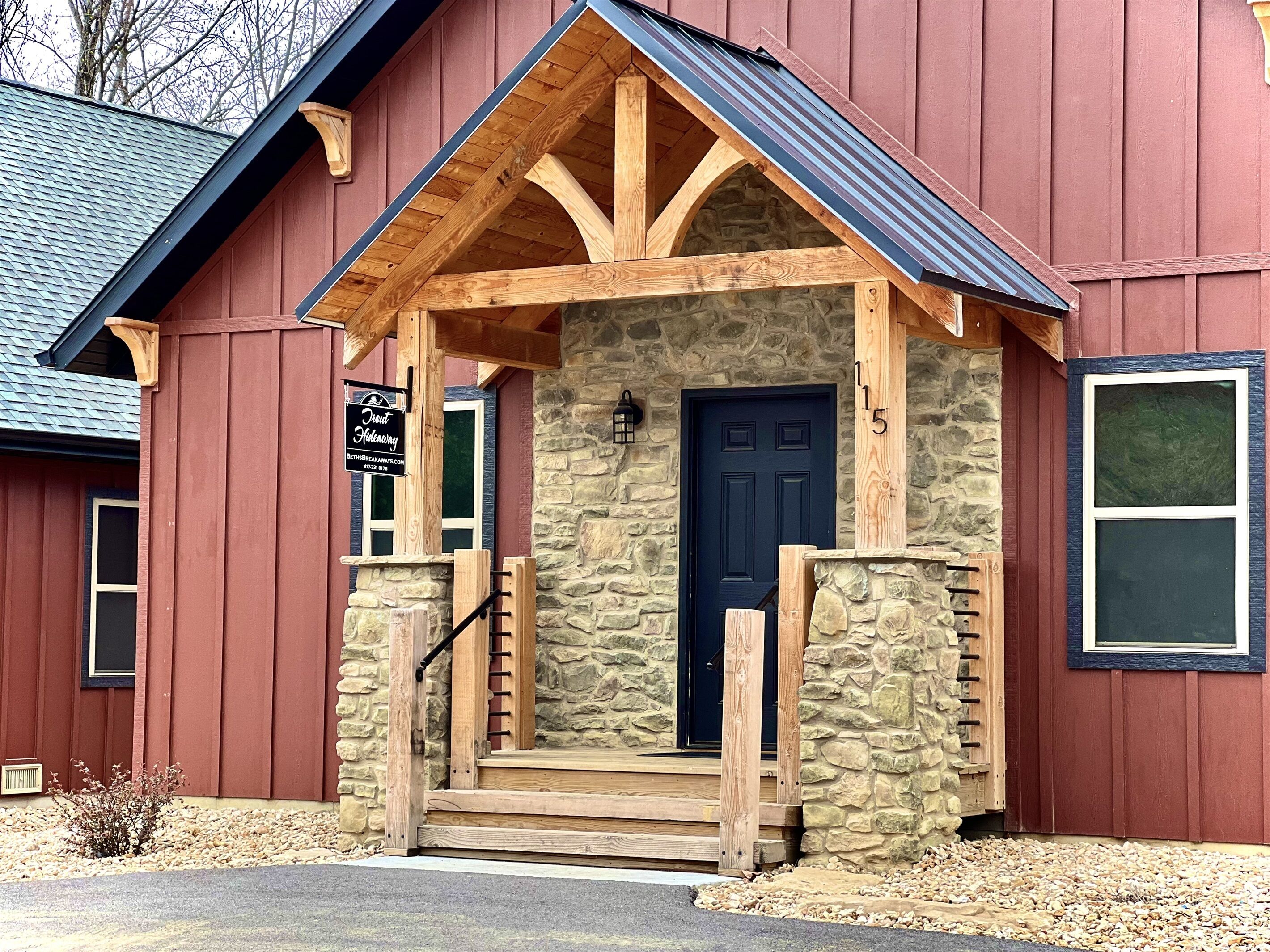New Lakefront cabin with private hot tub Trophy Run is known for its Custom Adirondack style quality construction and upscale furnishings, containing only the best leather and solid wood furniture. Anglers Lodge is in a 42-acre resort nestled along the banks of the Midwest's premier trout fishing area of Lake Taneycomo. Accessible directly from the resort are over 13 miles of manicured hiking and biking trails along Table Rock Lake as well as Lake Taneycomo.** CONSTRUCTION NOTICE**Construction is still ongoing in the Trophy Run resort. Construction will not prevent access to the lodge or amenities. Please be aware there will be construction noise, usually during the week between the hours of 8a-5p.Location and proximity to Branson attractions:-15 minutes from most major attractions...Branson Landing, Silver Dollar City, theatres with live entertainment, Titanic Museum, Dolly Parton Stampede, and so many more.-Less than a mile from the Showboat Branson Belle and Dewey Short Welcome Center, Moonshine Beach (seasonal mid-May to mid-September.)PROPERTY FEATURES:-Directly on Lake Taneycomo-3 bedroom/2 bath cabin, sleeps 8. Bedroom 3 is a small bunkroom with limited space (room for 4 twin bunks and very small storage).Fully equipped kitchen with small appliances, in-door ice and water dispenser.-Full-size stacked washer and dryer-Wallbox electric car charging station as well-PS5-Deck off the back of the home overlooks Lake Taneycomo-Private 5-person hot tub overlooking the Lake!-Propane grillHospitality items provided for your convenience such as paper towels, toilet paper, laundry soap, dish detergent, trash bags, shampoo, body wash, conditioner, hand soaps, iron and board, etc.Resort amenities and activities:-Fish for trout directly from Lake Taneycomo-Kids can fish in the two stocked ponds-playground-large swimming pool at Tad Pools Activity Center (Open Memorial Day - Labor Day)-near White River Valley TrailBEDROOM LAYOUTMAIN FLOOR* King bedroom with attached bathroom* King bedroom with attached bathroom that also serves as guest bath* Bunk room-4 twin bunks. Best suited for children as the majority of the space is bunk beds. (Please view photos to ensure this space will work for your needs).We provide great customer service and are always available for any questions or needs you may have. Stay with Beth's Breakaways and we guarantee you will have a vacation to reminisce about for years to come! Please contact us at 417-331-0176 or 319-461-0845.