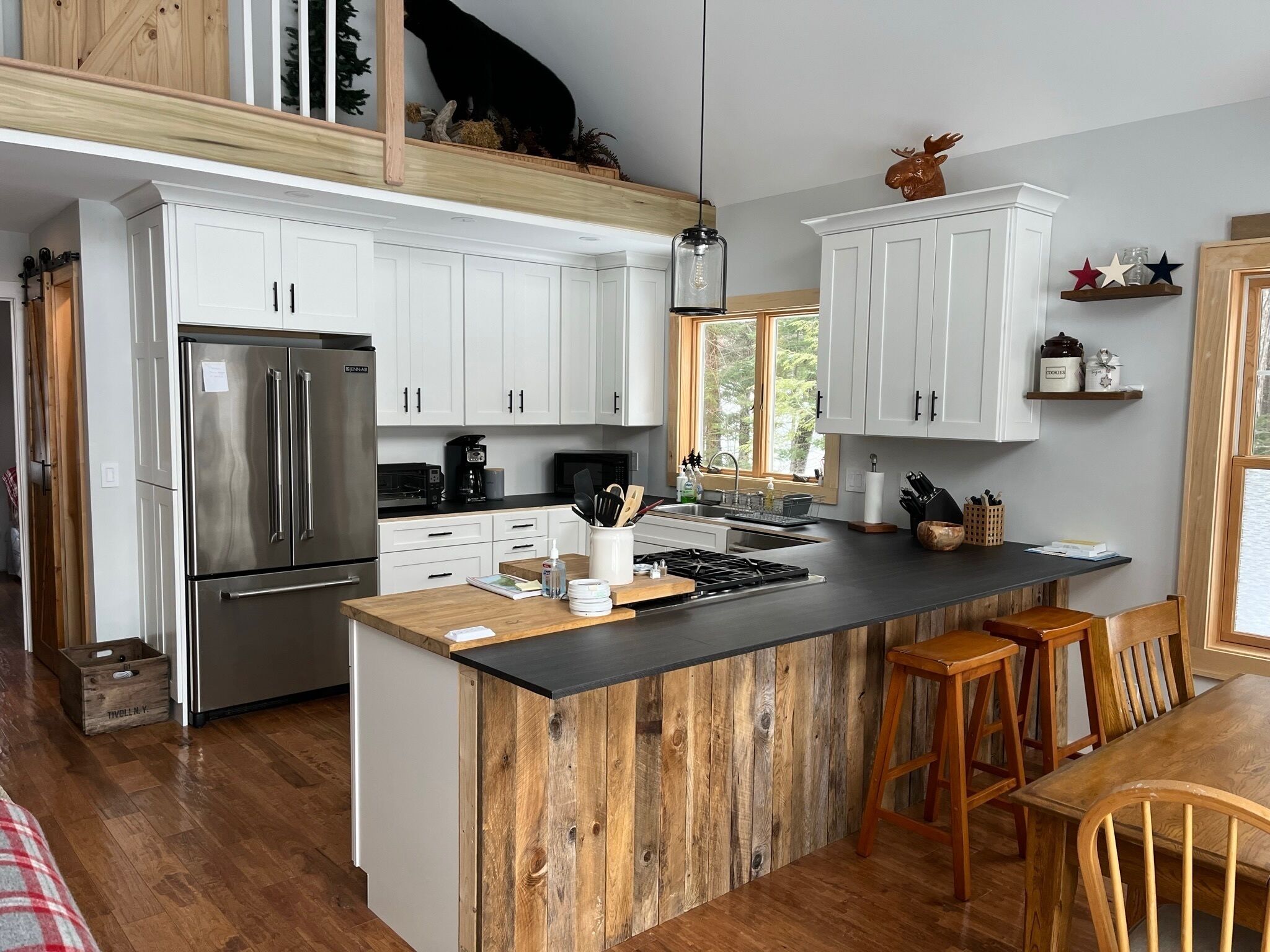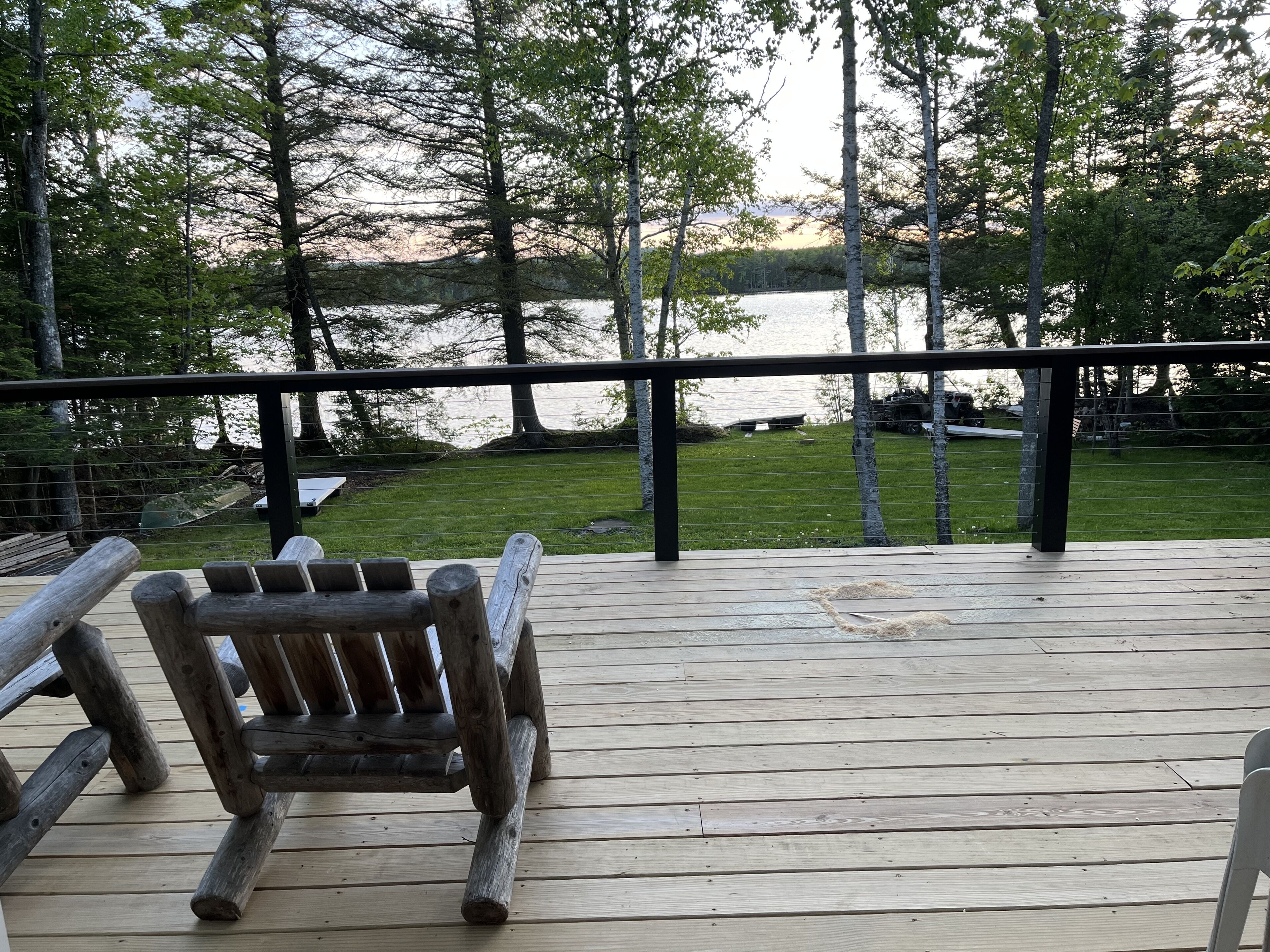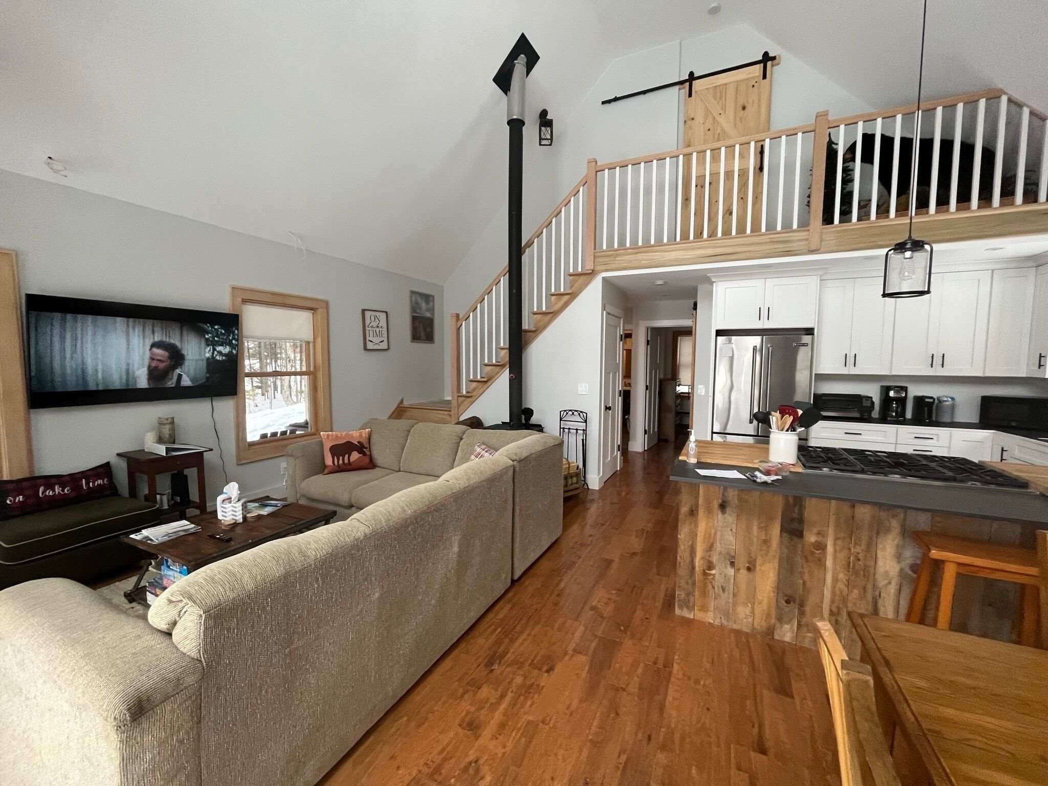 Lake front cabin Direct access to Snowmobile Trails. Hiking & Local shops! Newly constructed lake front cabin with large deck overlooking lake and beautiful sunsets! Gas fire pit on the deck to cozy up at evenings and glance at the open sky full of amazing stars. Open kitchen living room with vaulted ceilings with a wood stove for comfort or just click the thermostat for heat or air condition on w...