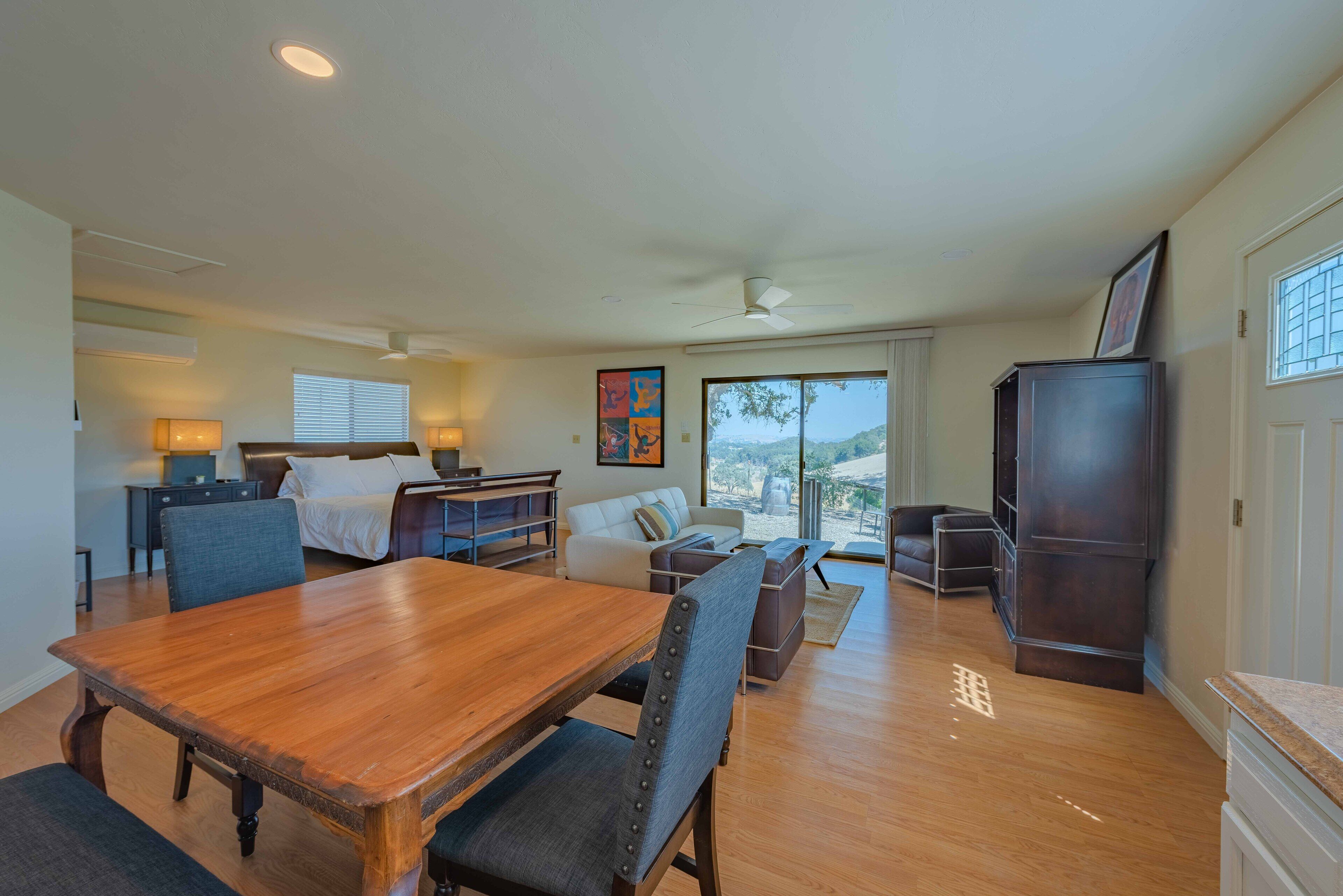 Stylish Cottage on 24 acres w/Endless Vineyard Views and Heart Hill on 46 West NEW LISTING! This beautiful, 24-acre gated property is situated on top of the hill, looking out onto 10 acres of premier vines, just off 46W, across from Niner Vineyards and Four Lanterns in the City of Paso Robles. This newly updated Wine Country Cottage, is outfitted for the quintessential wine-country vacation and is perfectly located in the coveted westside wine region with the perfect view of Heart Hill at Niner Wine Estate.It has quick and easy access to downtown Paso Robles, Route 101, Route 46 West, Paso Airport, PR Event Center and Vina Robles Amphitheatre....and over 200+ wineries in the Paso Robles AVA. This newly-renovated cottage is roomy and comfortable with an open concept space and a spectacular view of Heart Hill. It's the perfect getaway for a Romantic weekend or some good friends’ wine down weekend. It can sleep 4 people. Need to sleep a few extra bodies? Just add the main House which sleeps 6 (on the same property) to your stay and you can invite the whole gang.SLEEPING ACCOMMODATIONSThis cottage has a large great room with a king bed, ceiling fans and open concept living. The cottage has direct access to the outside, the bath is outfitted with a single vanity, tile floors, and stand-up walk-in shower.A hair dryer, bathroom amenities, quality luxe linens and luggage racks are all provided.LIVING & ENTERTAINING (Interior)The open concept great room is the heart of the cottage and entertainment central. It features a sliding glass door to the outside with incredible views of rolling, vine-covered hills.The lounge area has a modern sofa that converts to a full-size bed. So, if you need a little extra sleeping space, we have you covered. There are also two modern leather side chairs and an armoire housing a 45" SmartTV wired with DirecTV’s Entertainment Package and Roku for streaming your favorite movies. Don't forget your Netflix and Prime account numbers.The kitchen is equipped with stainless steel appliances, a 4-burner electric stove and oven combo along with all the cooking essential you'll need to prepare a gourmet meal.The dining area has a wooden table with 2 benches and 2 chairs, enough to accommodate 6 people.LIVING & ENTERTAINING (Exterior)The sliding glass door leads to the side yard which contains fun lounge chairs for great vineyard viewing. A Weber BBQ is available for cooking up your favorite meats from the local butcher.GUEST AMENITIESWe provide personal amenities including soap, shampoo, conditioner and body lotion, paper products, kitchen necessities such as dishwashing detergent, dishwasher soap and trash bags. The kitchen is stocked with the essential stapes: coffee, tea, olive oil, vinegar, salt, pepper and spices. THE IMMEDIATE AREAYou are in Paso Robles Central! This home is just 10 minutes from the town square where there are dozens of wine-tasting rooms, restaurants, shopping and a farmer's market every Saturday morning. Downtown there are over 12 wine tasting rooms, along with a distillery and local craft breweries. The downtown City Park offers free summer concerts from June through August every Thursday night. Pack a picnic basket, a bottle of wine or two, your beach chairs and enjoy local musicians belting out everything from Jazz to Rock and Blues.PROVISIONSA few miles from town there is an Albertson's on Niblick. A Smart & Final is located on on Spring Street at 20th. And Trader Joe's is just down the road a bit on Vineyard Drive in Templeton. While at the Trader Joe's you can pick up some fresh caught fish at Pier 46 Fish Market or head on over to the butcher, J&R Meats, for some grass-fed local meats and game. Back up in Paso you can find a few quality cheese shops, Vivant Fine Cheese and Di Raimondos Italian Market and Cheese Shop, along with some cigar shops, Boyd's and Third Base Market & Spirits.RESTAURANTSPaso is packed with great restaurants. Stay a week or two so you can try all of them!Italian, French, Irish, Asian, Mexican, even Argentinean are just a few. From pizza to 5-course meals, Paso Robles has come of age in its dining options. Just a bit to the south, in Templeton, offers a few more options including McPhee's where you can find some of the best wood-fired steaks in town.ACTIVITIESWine, beer and spirits tasting, hot air ballooning, horseback riding, water park, jeep rides, ziplining, Farmer's Markets, concerts at Vina Robles Amphitheatre, spas, beaches, Morro Bay, Hearst Castle, Cambria...take your pick. There are endless options to play until your heart's content. And don’t forget to check out Sensorio…Paso’s latest spectacular visual sensation.PLEASE NOTE! You will be required to sign a Digs Vacation Rentals rental agreement for booking this property. By booking you are agreeing to pay a Property Damage Protection non-refundable insurance fee of $33 (or $25)/night to cover any property damages up to $10,000 with $1,000,000 (or $100,000) in personal liability coverage. Further explanation of this insurance can be found in your Digs Vacation Rentals rental agreement.There will also be a 4% credit card/processing fee charged for any cancellations regardless of when cancellation occurs.