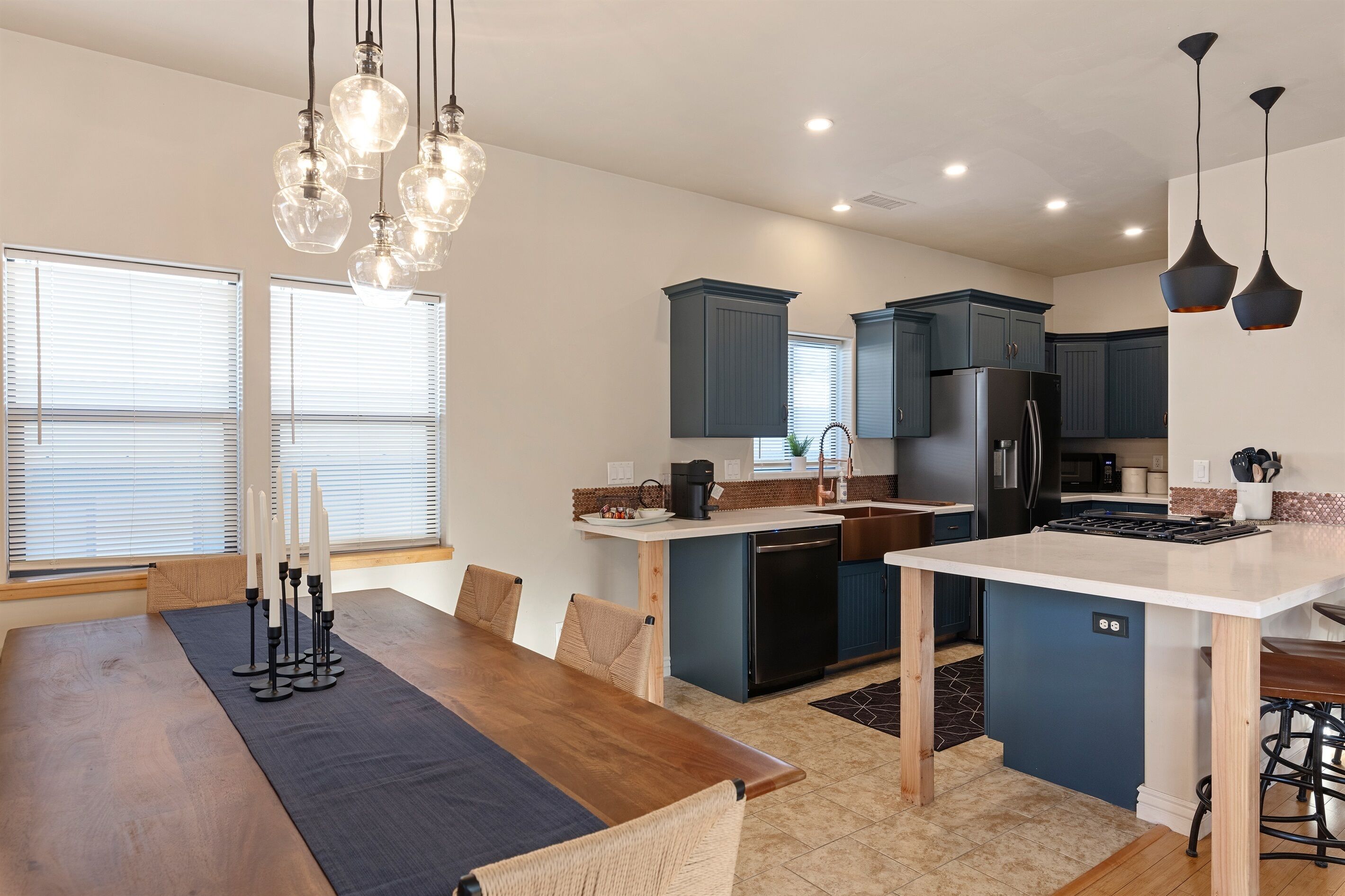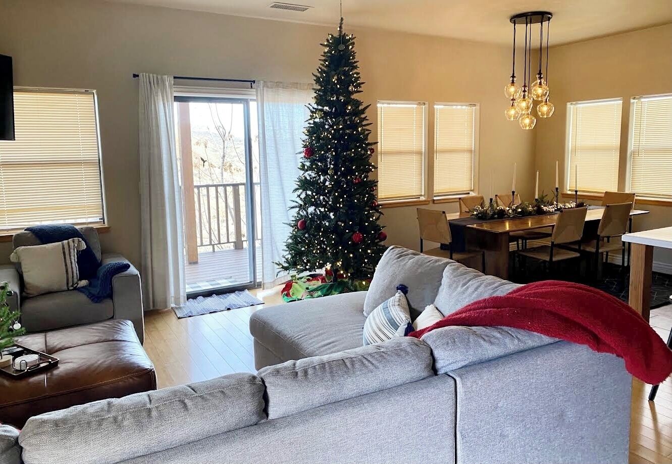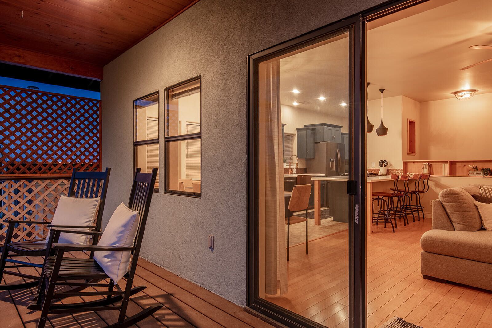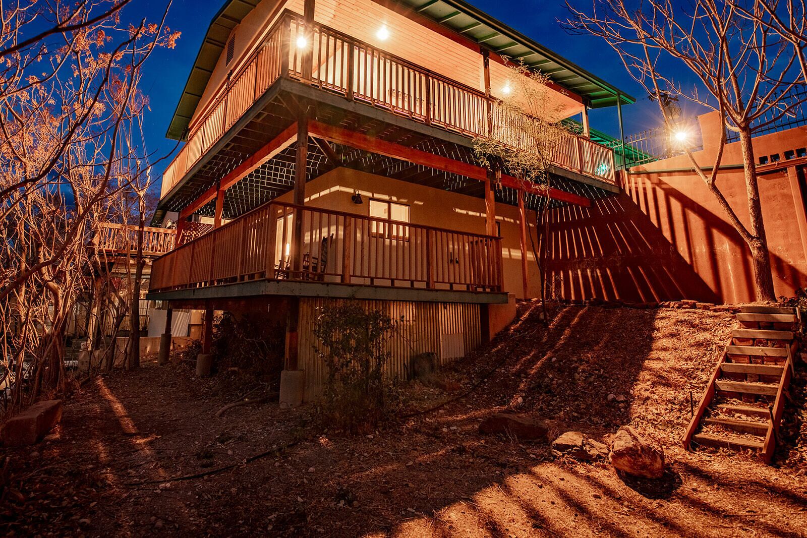 Fully Stocked Kitchen in AZ's Fav Mining Town, Shopping, Dining & Fun VIEWS! Stay with us in this brand new, 2-bedroom, 2 bath unit. Enjoy your cup of coffee in a rocking chair on a large deck overlooking the gorgeous panoramic views of the beautiful city on a hill (beautiful day and night), Verde Valley and Sedona red rocks in the distance. The bright, upscale and modern rustic design offers luxurious and homey feel with high-end furnishings and high thread count linens, 2 master bedrooms with comfy king beds you want to dive into, 700+ thread count linens, flat screen TV's in each room and a fully stocked kitchen, make it the perfect vacation home during any length of stay. The first level with attached garage features the living area, dining area, kitchen, bathroom #1 (with walk in shower and gorgeous onyx granite countertops) and bedroom #1. The lower-level (accessed by interior carpeted staircase) features one large bedroom on the lower level with a trundle day bed transforming into two very comfortable twin beds with ensuite bathroom with tub/shower combo bathroom. Note: we have a studio lock off with a separate entrance on the lower level of this home. Should you need more room for your party, inquire about adding this one bedroom, one bath with private deck and high-end kitchenette to your reservation, making the rental into a large three bedroom, three bathroom house with two decks! By renting this part of the house, you are acknowledging that you have the entire space to yourself with no access to the studio without having specifically rented the adjoining studio. Convenient parking is coveted in our town on a hill but that is no issue here with the attached two-car garage! People with mobility issues will find the first and main level very easy to maneuver. The kitchen is decked out with brand new white quartz countertops, navy blue custom cabinets, state-of-the-art copper-colored stainless-steel appliances including a third-row dishwasher, gas stove/oven with air fryer feature, upgraded lighting and great kitchen gadgets making family meal prep and entertaining enjoyable. There are features like old lanterns and copper penny backsplash giving a gentle nod to the old copper mining days that Jerome was built on in the late 1800's. Visitors to the historical and artsy city of Jerome will appreciate this upscale home conveniently located a short drive to hiking trails, cafes, wine tasting rooms, art galleries, famous Haunted Hamburger—this quaint town has all the charm. The top deck (the lower deck is reserved for our studio guests), with comfy outdoor lounge furniture, is a perfect spot for snack after a hike, sipping wine with a friends or working on your laptop (with our high speed wifi). Your new home-away-from-home is equipped with four smart tv's come with netflix and streaming options, board games and lots of space for the whole family to enjoy the beautiful surroundings! For those spending a full season in the area, this lock-and-leave home is a good place to use as a base for visiting the Grand Canyon, Sedona, Flagstaff, Prescott and Las Vegas. Nearby freeways/highways easily take you to Phoenix, Page Springs, Cottonwood, Flagstaff and beyond! Get all the comforts of home and then some in this great retreat in the serene and beautiful setting. Stay for a long weekend or an entire season. You just may return next year. This new property will book quickly so reach out today! We look forward to welcoming you as a future guest.