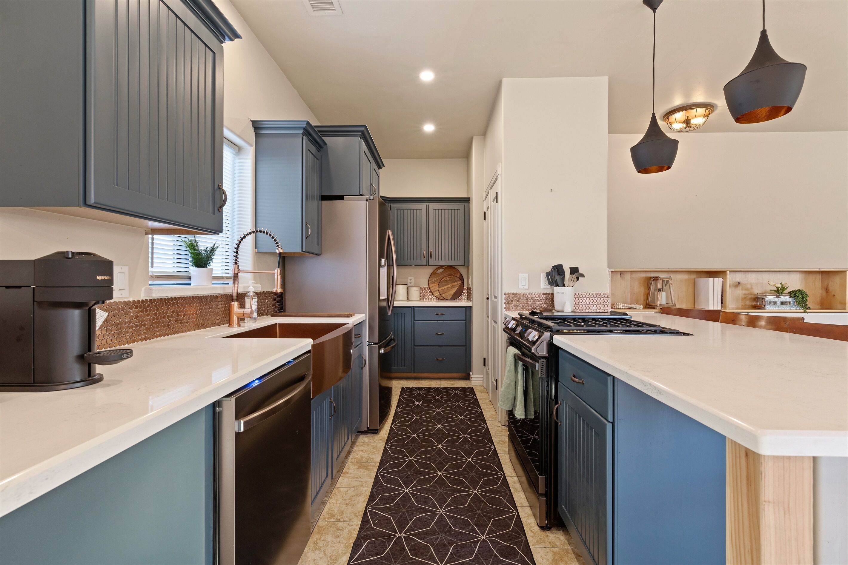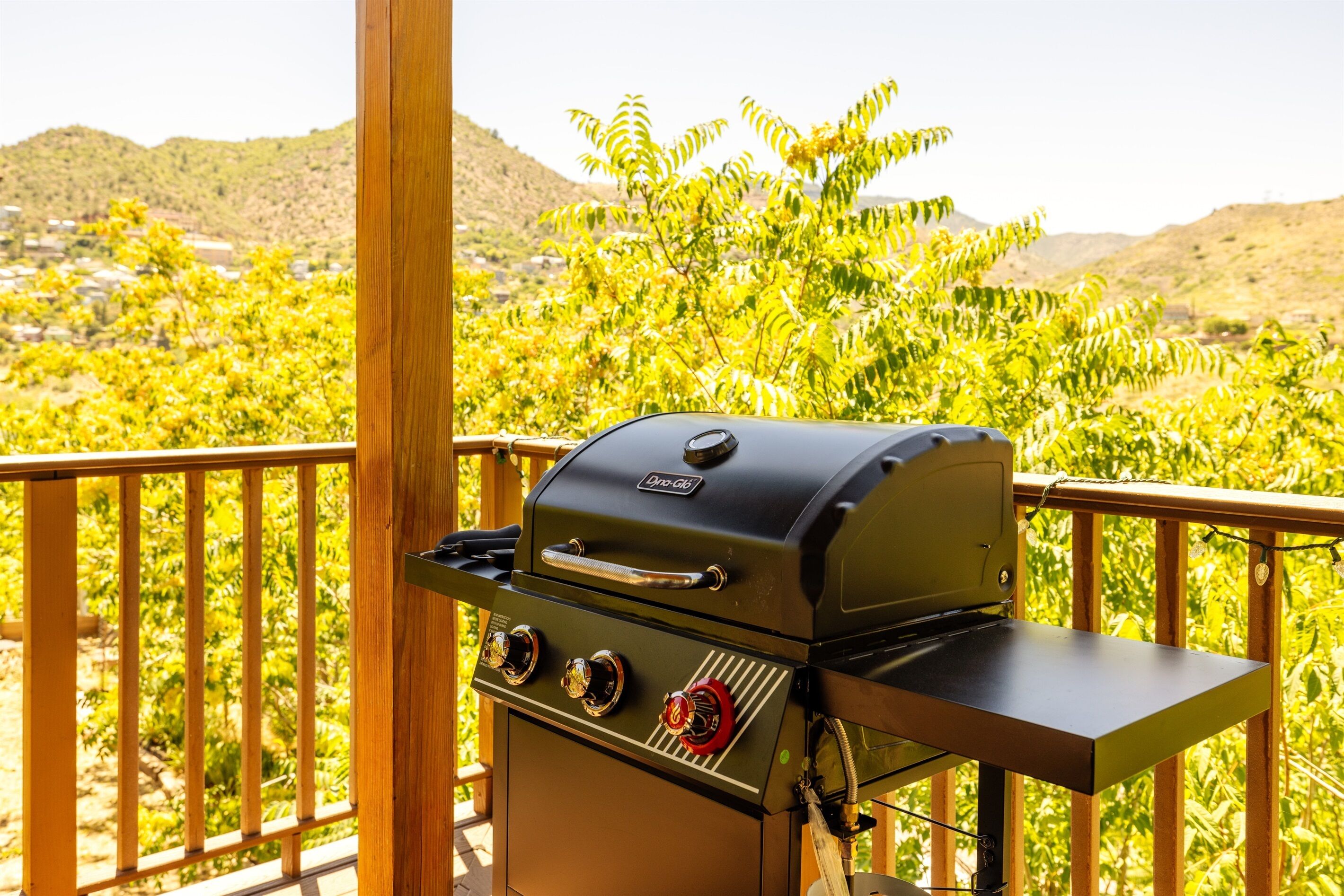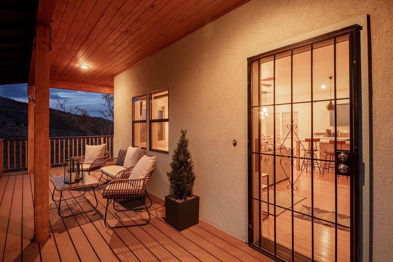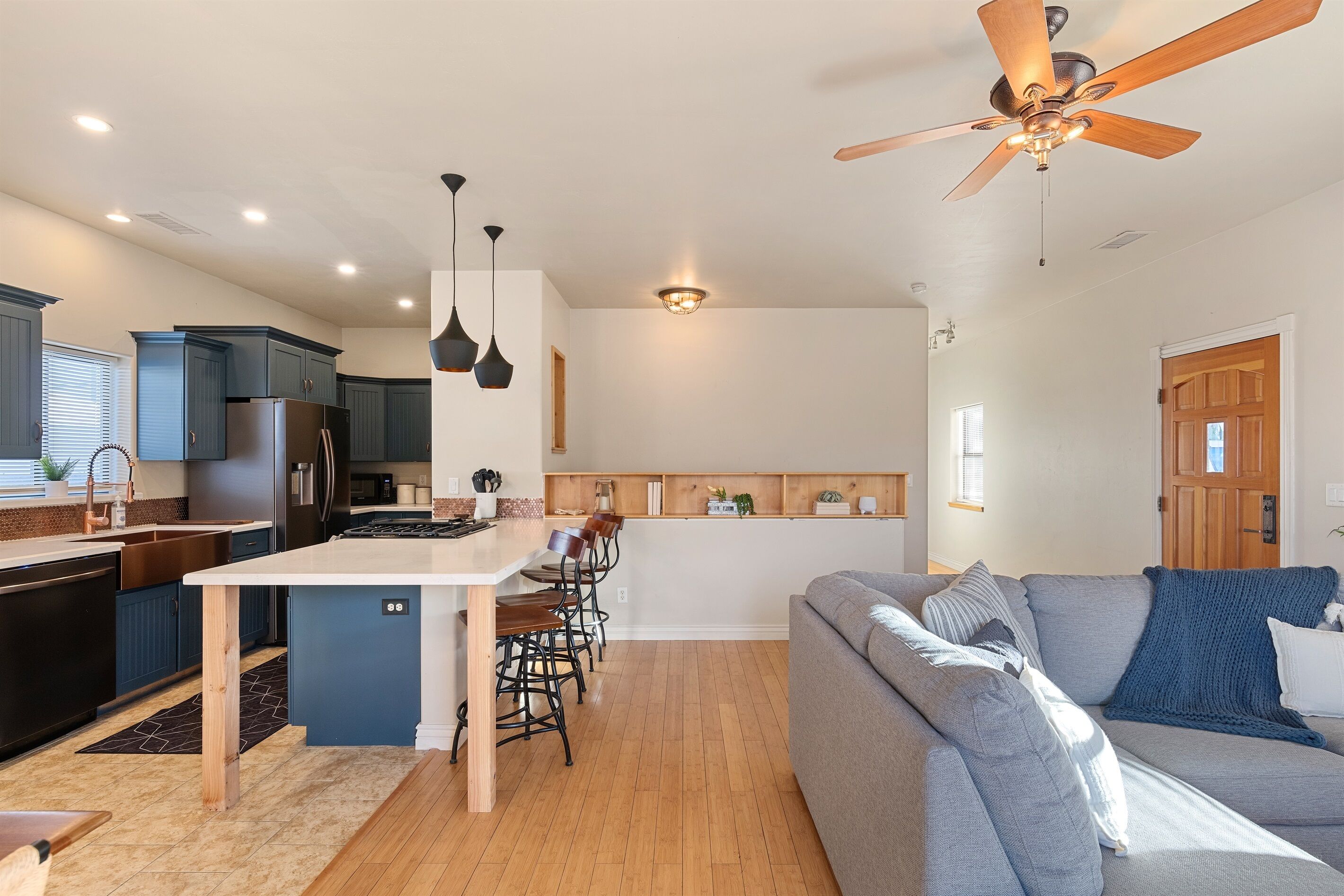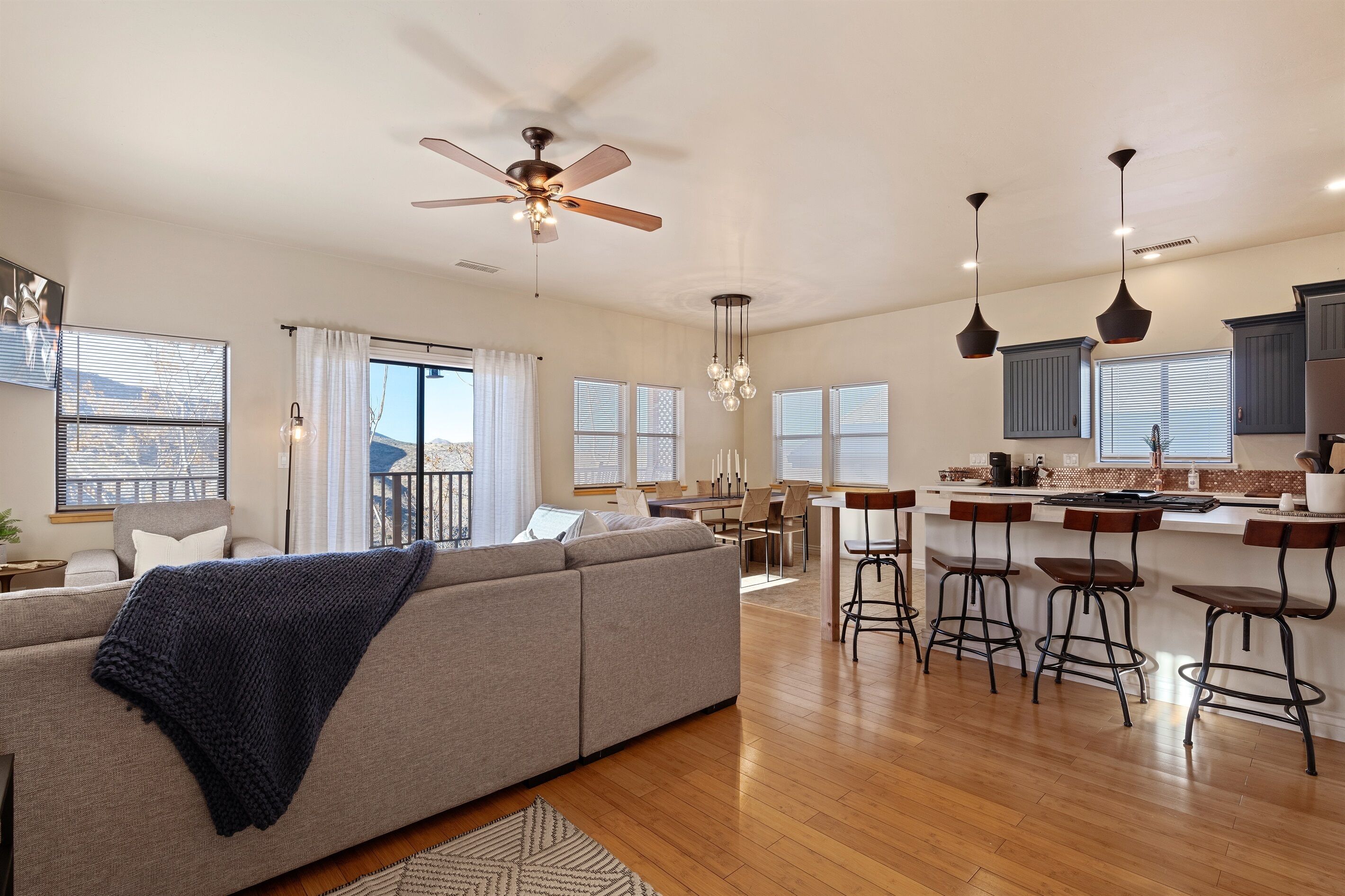Fully Stocked Kitchen in AZ's Fav Mining Town, Shopping, Dining & Fun VIEWS! Stay with us in this brand new, 2-bedroom, 2 bath unit. Enjoy your cup of coffee in a rocking chair on a large deck overlooking the gorgeous panoramic views of the beautiful city on a hill (beautiful day and night), Verde Valley and Sedona red rocks in the distance. The bright, upscale and modern rustic design offers luxurious and homey feel with high-end furnishings and high thread count linens, 2 master bedrooms with comfy king beds you want to dive into, 700+ thread count linens, flat screen TV's in each room and a fully stocked kitchen, make it the perfect vacation home during any length of stay. The first level with attached garage features the living area, dining area, kitchen, bathroom #1 (with walk in shower and gorgeous onyx granite countertops) and bedroom #1. The lower-level (accessed by interior carpeted staircase) features one large bedroom on the lower level with a trundle day bed transforming into two very comfortable twin beds with ensuite bathroom with tub/shower combo bathroom. Note: we have a studio lock off with a separate entrance on the lower level of this home. Should you need more room for your party, inquire about adding this one bedroom, one bath with private deck and high-end kitchenette to your reservation, making the rental into a large three bedroom, three bathroom house with two decks! By renting this part of the house, you are acknowledging that you have the entire space to yourself with no access to the studio without having specifically rented the adjoining studio. Convenient parking is coveted in our town on a hill but that is no issue here with the attached two-car garage! People with mobility issues will find the first and main level very easy to maneuver. The kitchen is decked out with brand new white quartz countertops, navy blue custom cabinets, state-of-the-art copper-colored stainless-steel appliances including a third-row dishwasher, gas stove/oven with air fryer feature, upgraded lighting and great kitchen gadgets making family meal prep and entertaining enjoyable. There are features like old lanterns and copper penny backsplash giving a gentle nod to the old copper mining days that Jerome was built on in the late 1800's. Visitors to the historical and artsy city of Jerome will appreciate this upscale home conveniently located a short drive to hiking trails, cafes, wine tasting rooms, art galleries, famous Haunted Hamburger—this quaint town has all the charm. The top deck (the lower deck is reserved for our studio guests), with comfy outdoor lounge furniture, is a perfect spot for snack after a hike, sipping wine with a friends or working on your laptop (with our high speed wifi). Your new home-away-from-home is equipped with four smart tv's come with netflix and streaming options, board games and lots of space for the whole family to enjoy the beautiful surroundings! For those spending a full season in the area, this lock-and-leave home is a good place to use as a base for visiting the Grand Canyon, Sedona, Flagstaff, Prescott and Las Vegas. Nearby freeways/highways easily take you to Phoenix, Page Springs, Cottonwood, Flagstaff and beyond! Get all the comforts of home and then some in this great retreat in the serene and beautiful setting. Stay for a long weekend or an entire season. You just may return next year. This new property will book quickly so reach out today! We look forward to welcoming you as a future guest.