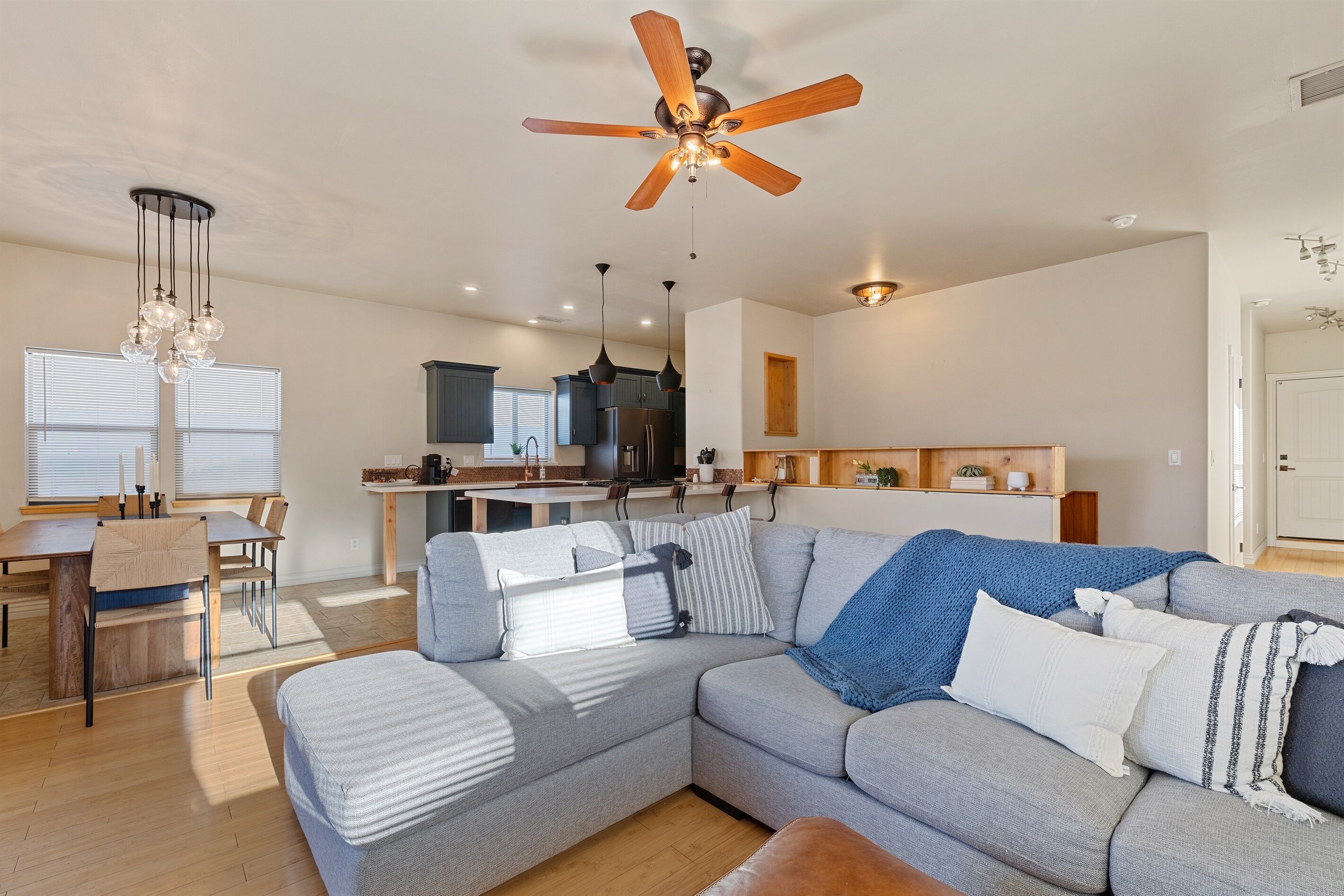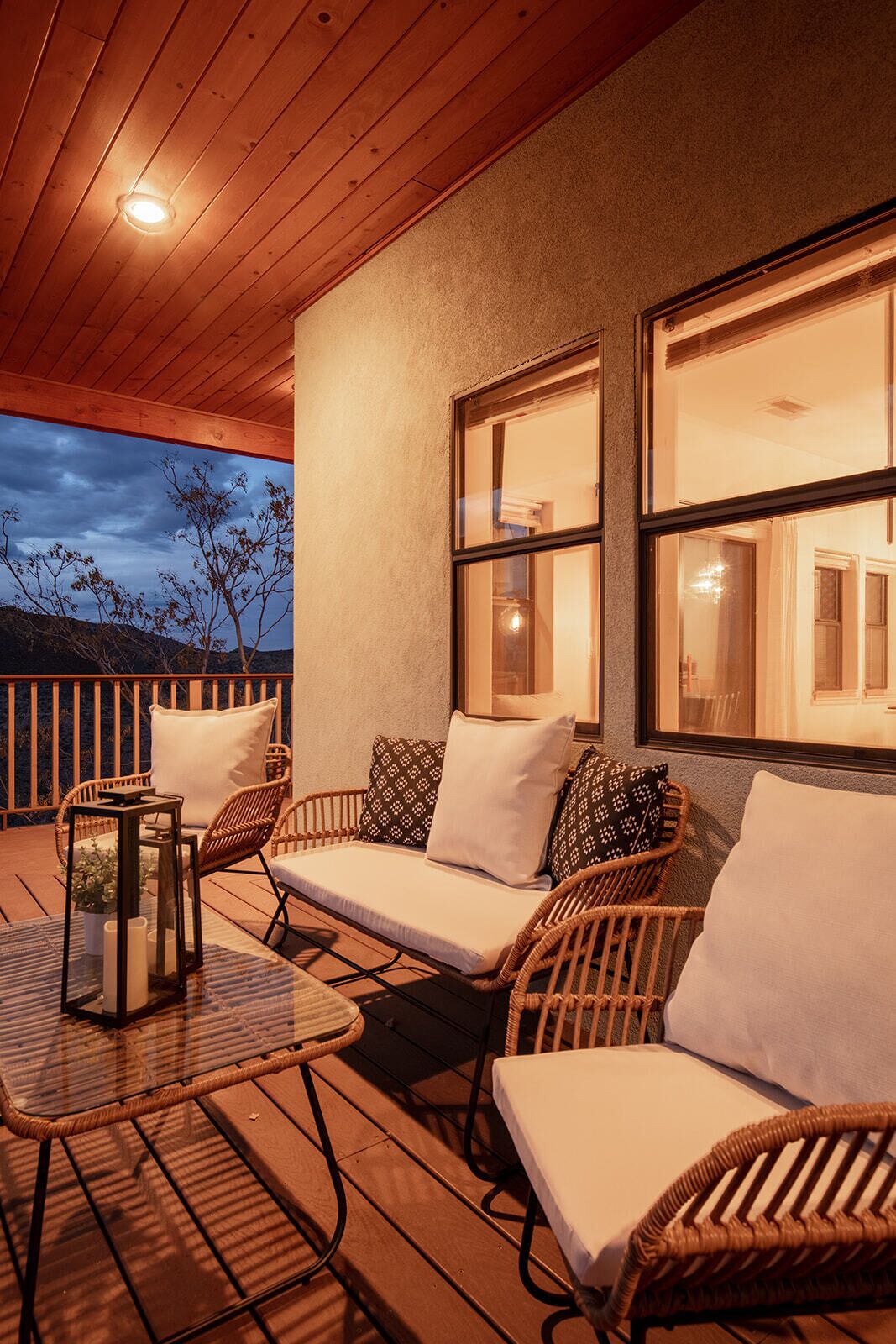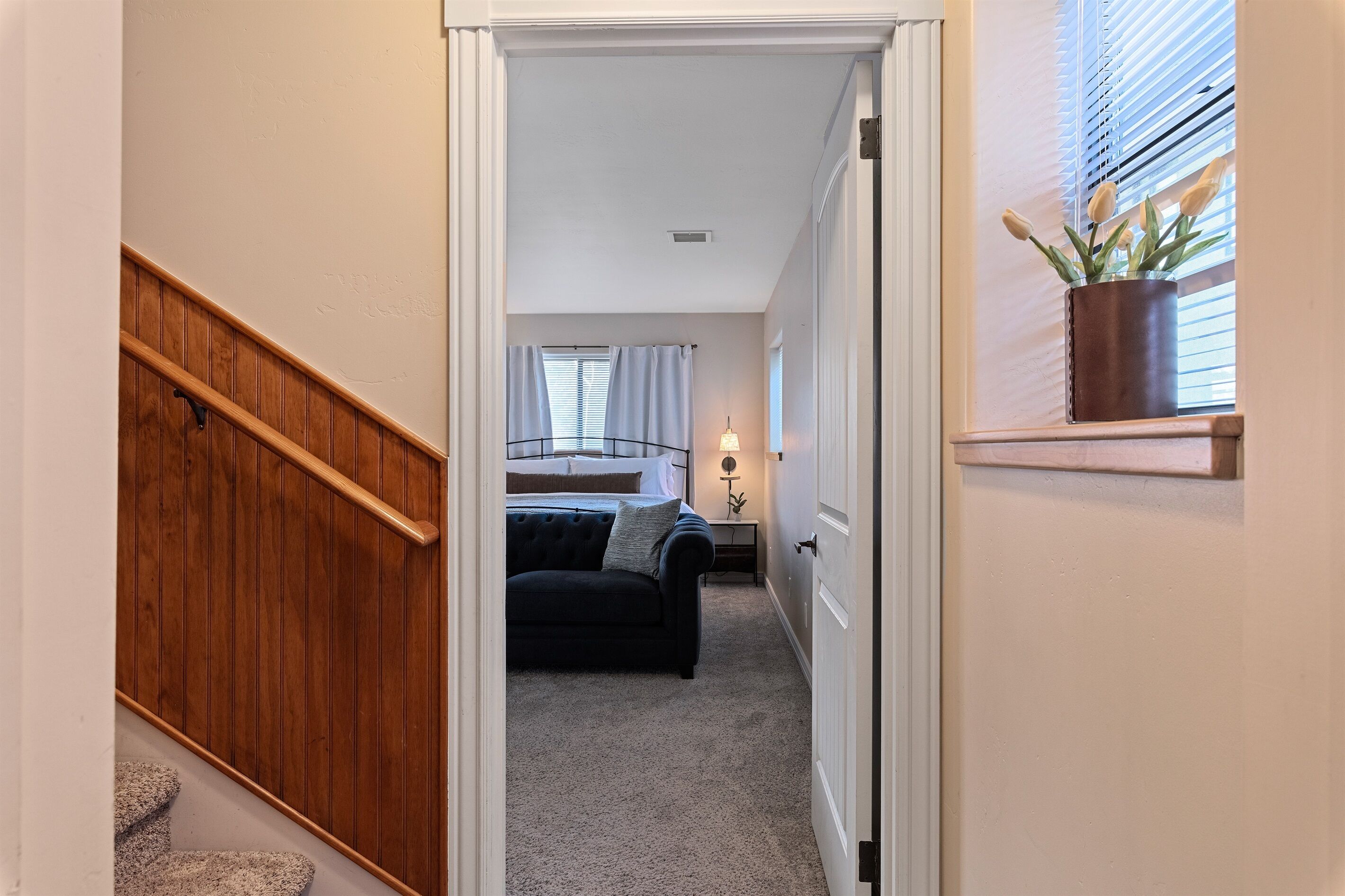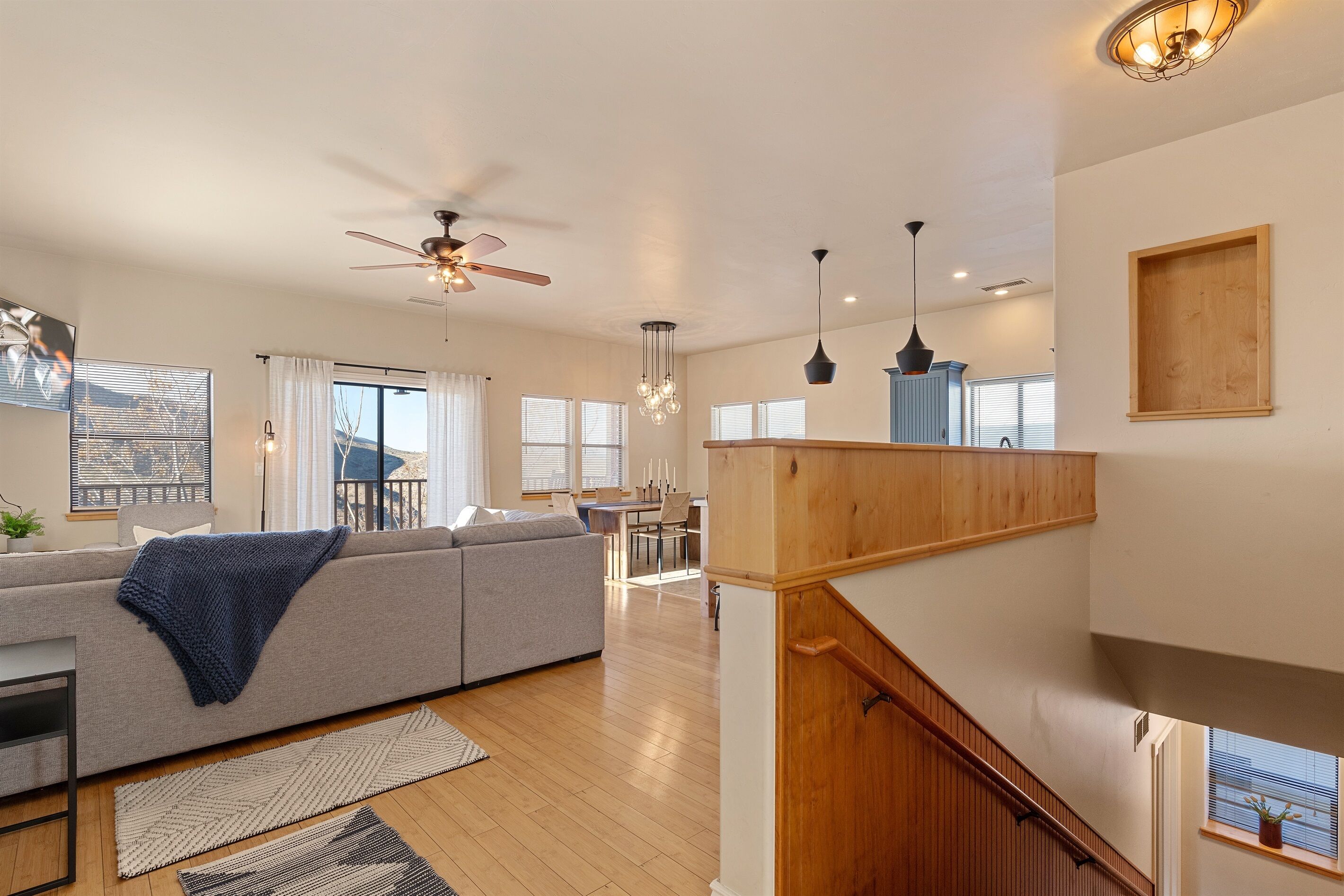 Fully Stocked Kitchen in AZ's Fav Mining Town, Shopping, Dining & Fun VIEWS! Stay with us in this brand new, 2-bedroom, 2 bath unit. Enjoy your cup of coffee in a rocking chair on a large deck overlooking the gorgeous panoramic views of the beautiful city on a hill (beautiful day and night), Verde Valley and Sedona red rocks in the distance. The bright, upscale and modern rustic design offers luxurious and homey feel with high-end furnishings and high thread count linens, 2 master bedrooms with comfy king beds you want to dive into, 700+ thread count linens, flat screen TV's in each room and a fully stocked kitchen, make it the perfect vacation home during any length of stay. The first level with attached garage features the living area, dining area, kitchen, bathroom #1 (with walk in shower and gorgeous onyx granite countertops) and bedroom #1. The lower-level (accessed by interior carpeted staircase) features one large bedroom on the lower level with a trundle day bed transforming into two very comfortable twin beds with ensuite bathroom with tub/shower combo bathroom. Note: we have a studio lock off with a separate entrance on the lower level of this home. Should you need more room for your party, inquire about adding this one bedroom, one bath with private deck and high-end kitchenette to your reservation, making the rental into a large three bedroom, three bathroom house with two decks! By renting this part of the house, you are acknowledging that you have the entire space to yourself with no access to the studio without having specifically rented the adjoining studio. Convenient parking is coveted in our town on a hill but that is no issue here with the attached two-car garage! People with mobility issues will find the first and main level very easy to maneuver. The kitchen is decked out with brand new white quartz countertops, navy blue custom cabinets, state-of-the-art copper-colored stainless-steel appliances including a third-row dishwasher, gas stove/oven with air fryer feature, upgraded lighting and great kitchen gadgets making family meal prep and entertaining enjoyable. There are features like old lanterns and copper penny backsplash giving a gentle nod to the old copper mining days that Jerome was built on in the late 1800's. Visitors to the historical and artsy city of Jerome will appreciate this upscale home conveniently located a short drive to hiking trails, cafes, wine tasting rooms, art galleries, famous Haunted Hamburger—this quaint town has all the charm. The top deck (the lower deck is reserved for our studio guests), with comfy outdoor lounge furniture, is a perfect spot for snack after a hike, sipping wine with a friends or working on your laptop (with our high speed wifi). Your new home-away-from-home is equipped with four smart tv's come with netflix and streaming options, board games and lots of space for the whole family to enjoy the beautiful surroundings! For those spending a full season in the area, this lock-and-leave home is a good place to use as a base for visiting the Grand Canyon, Sedona, Flagstaff, Prescott and Las Vegas. Nearby freeways/highways easily take you to Phoenix, Page Springs, Cottonwood, Flagstaff and beyond! Get all the comforts of home and then some in this great retreat in the serene and beautiful setting. Stay for a long weekend or an entire season. You just may return next year. This new property will book quickly so reach out today! We look forward to welcoming you as a future guest.
