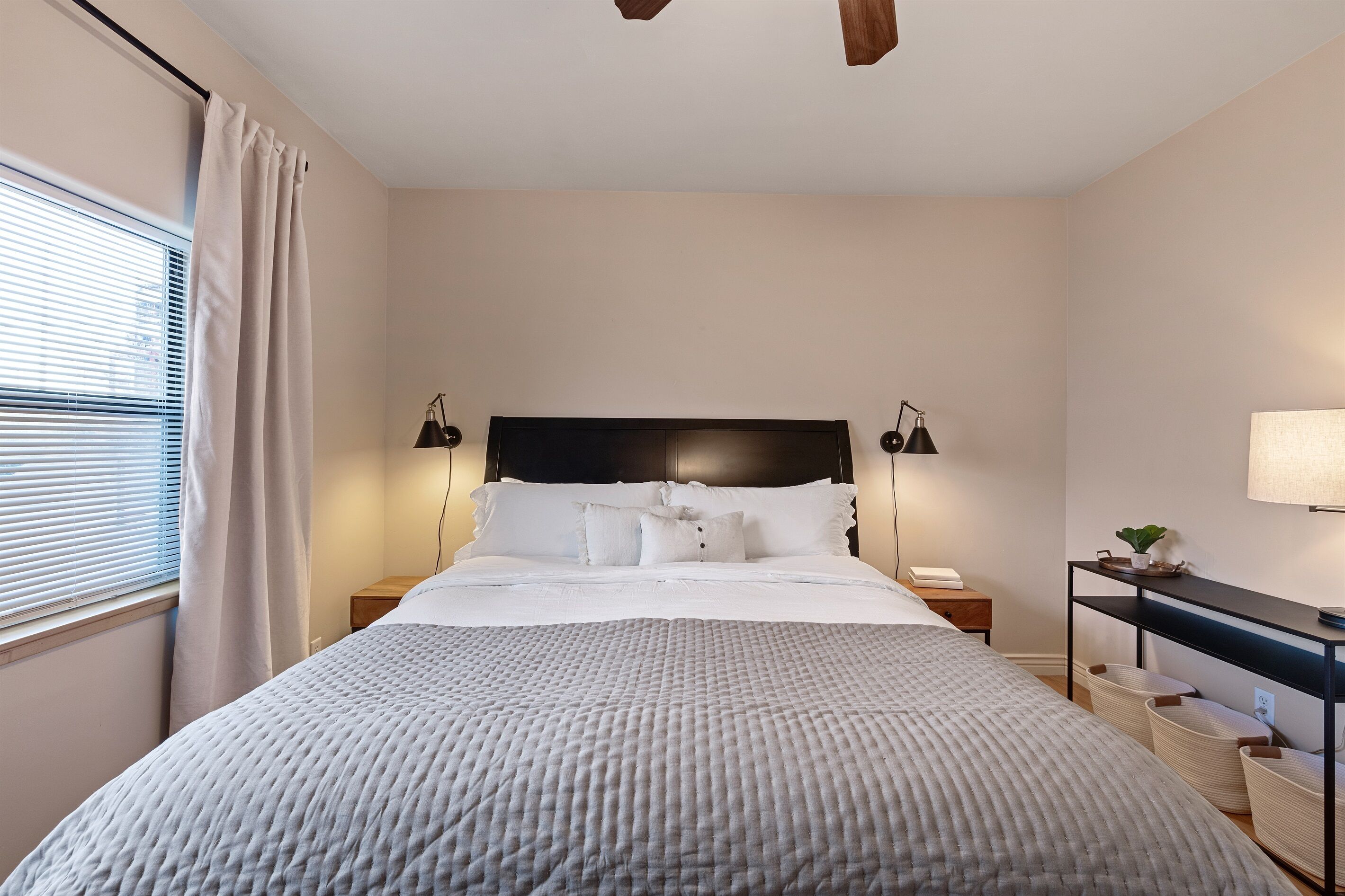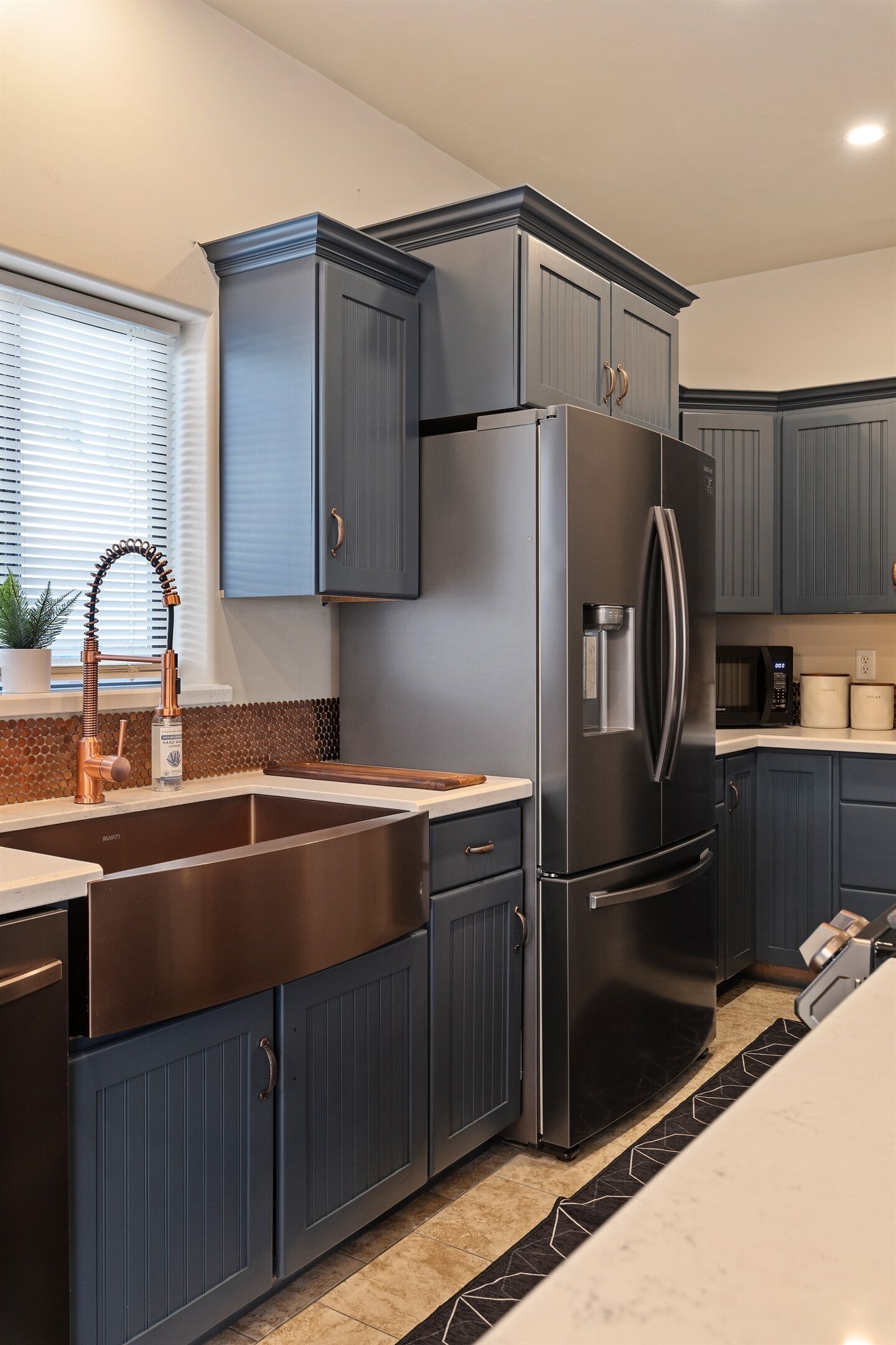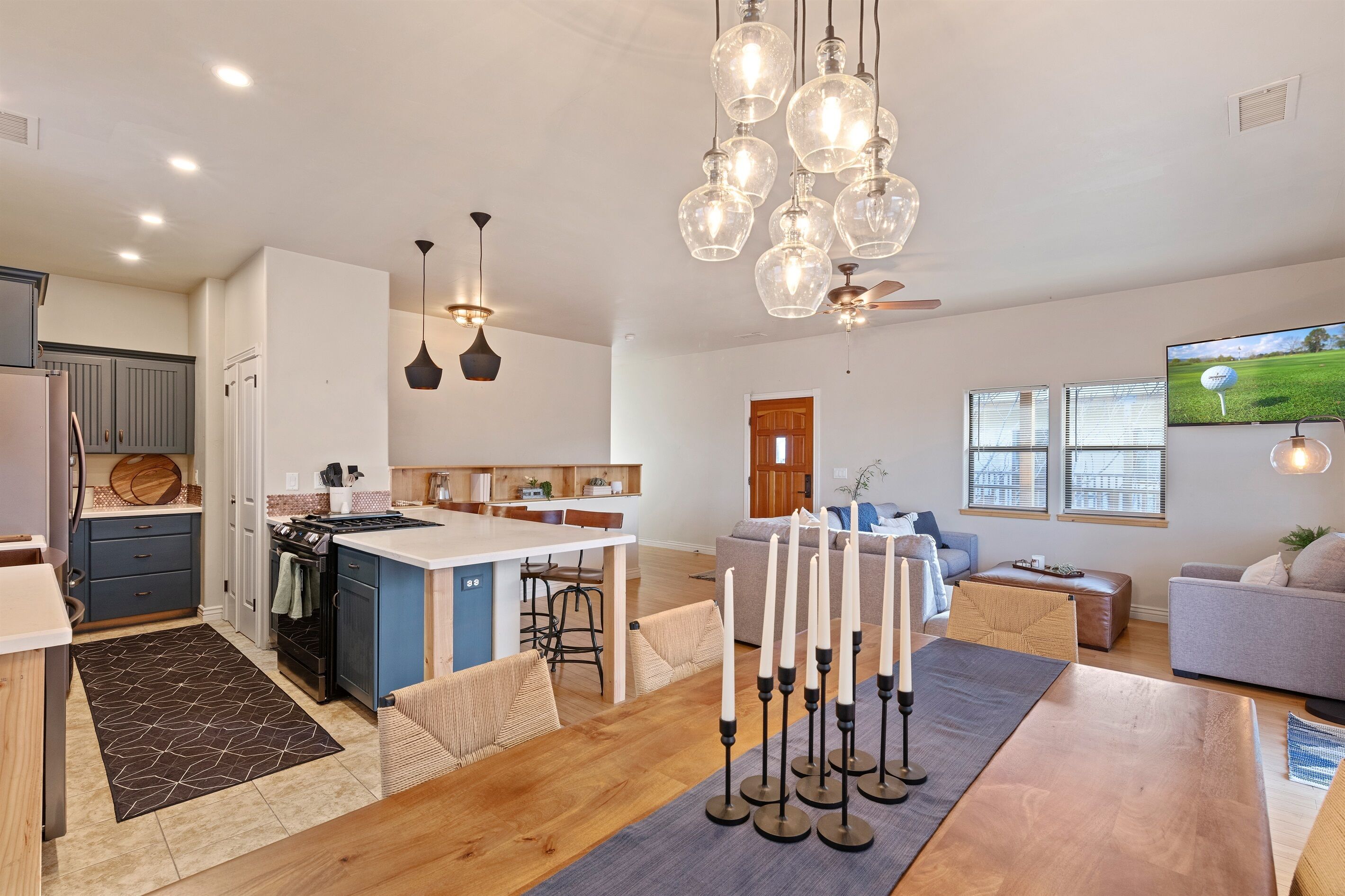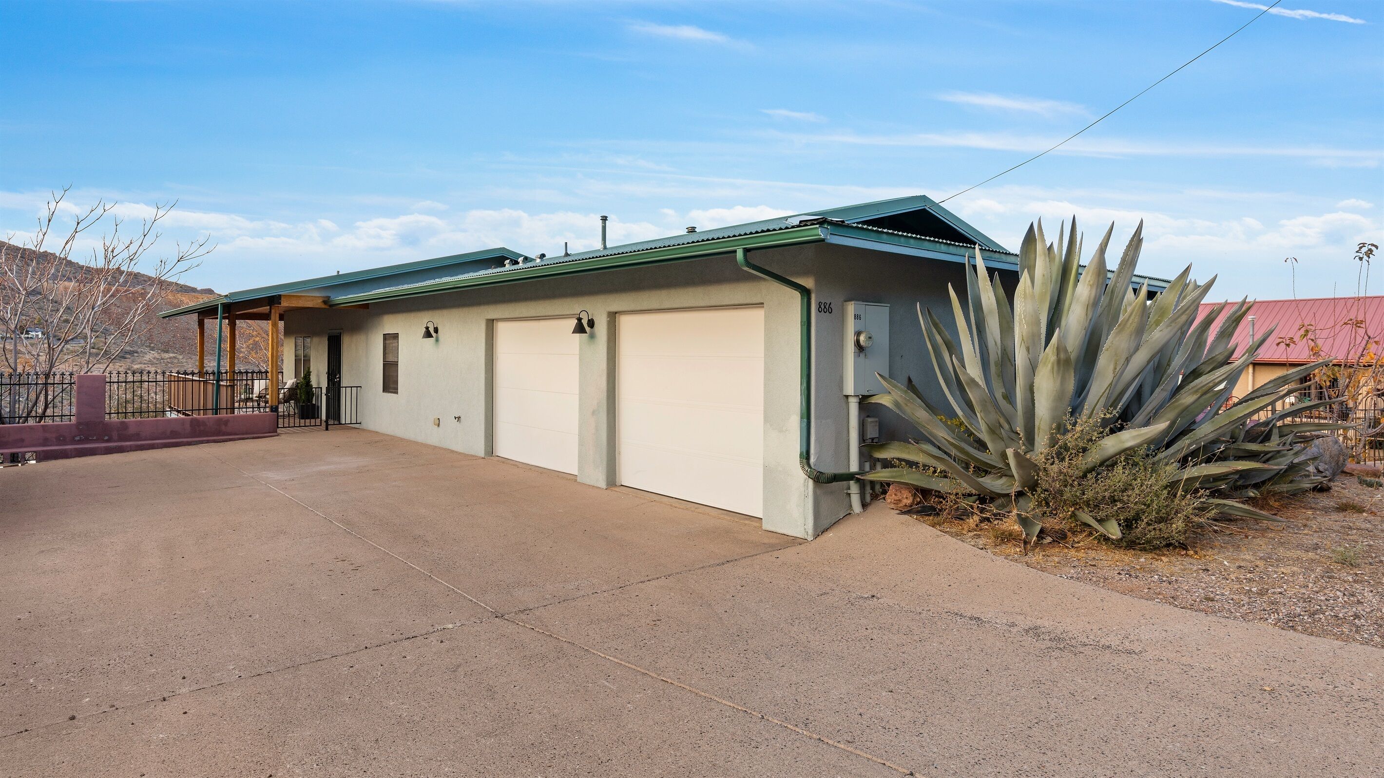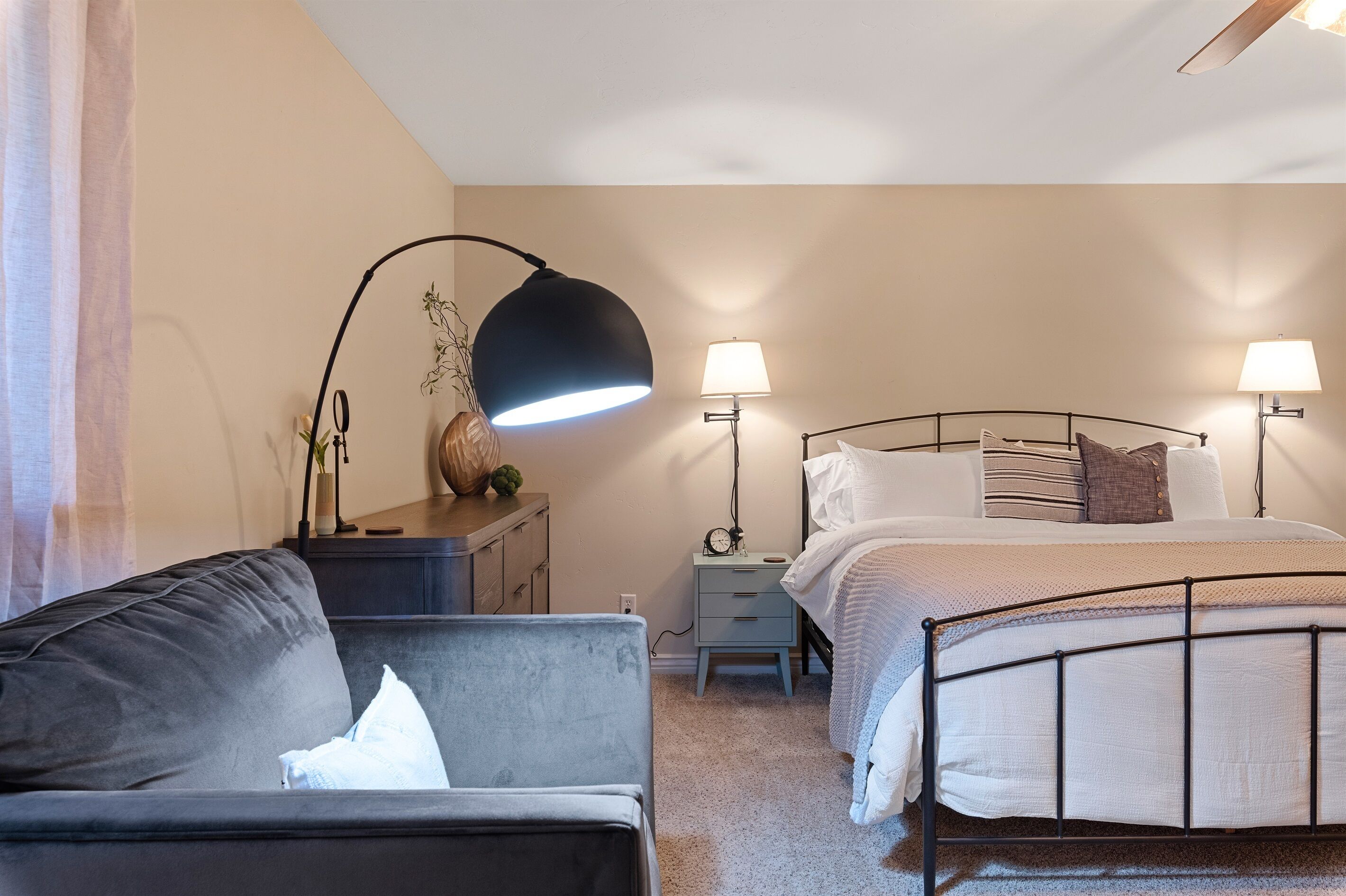 Fully Stocked Kitchen in AZ's Fav Mining Town, Shopping, Dining & Fun VIEWS! Stay with us in this brand new, 2-bedroom, 2 bath unit. Enjoy your cup of coffee in a rocking chair on a large deck overlooking the gorgeous panoramic views of the beautiful city on a hill (beautiful day and night), Verde Valley and Sedona red rocks in the distance. The bright, upscale and modern rustic design offers luxurious and homey feel with high-end furnishings and high thread count linens, 2 master bedrooms with comfy king beds you want to dive into, 700+ thread count linens, flat screen TV's in each room and a fully stocked kitchen, make it the perfect vacation home during any length of stay. The first level with attached garage features the living area, dining area, kitchen, bathroom #1 (with walk in shower and gorgeous onyx granite countertops) and bedroom #1. The lower-level (accessed by interior carpeted staircase) features one large bedroom on the lower level with a trundle day bed transforming into two very comfortable twin beds with ensuite bathroom with tub/shower combo bathroom. Note: we have a studio lock off with a separate entrance on the lower level of this home. Should you need more room for your party, inquire about adding this one bedroom, one bath with private deck and high-end kitchenette to your reservation, making the rental into a large three bedroom, three bathroom house with two decks! By renting this part of the house, you are acknowledging that you have the entire space to yourself with no access to the studio without having specifically rented the adjoining studio. Convenient parking is coveted in our town on a hill but that is no issue here with the attached two-car garage! People with mobility issues will find the first and main level very easy to maneuver. The kitchen is decked out with brand new white quartz countertops, navy blue custom cabinets, state-of-the-art copper-colored stainless-steel appliances including a third-row dishwasher, gas stove/oven with air fryer feature, upgraded lighting and great kitchen gadgets making family meal prep and entertaining enjoyable. There are features like old lanterns and copper penny backsplash giving a gentle nod to the old copper mining days that Jerome was built on in the late 1800's. Visitors to the historical and artsy city of Jerome will appreciate this upscale home conveniently located a short drive to hiking trails, cafes, wine tasting rooms, art galleries, famous Haunted Hamburger—this quaint town has all the charm. The top deck (the lower deck is reserved for our studio guests), with comfy outdoor lounge furniture, is a perfect spot for snack after a hike, sipping wine with a friends or working on your laptop (with our high speed wifi). Your new home-away-from-home is equipped with four smart tv's come with netflix and streaming options, board games and lots of space for the whole family to enjoy the beautiful surroundings! For those spending a full season in the area, this lock-and-leave home is a good place to use as a base for visiting the Grand Canyon, Sedona, Flagstaff, Prescott and Las Vegas. Nearby freeways/highways easily take you to Phoenix, Page Springs, Cottonwood, Flagstaff and beyond! Get all the comforts of home and then some in this great retreat in the serene and beautiful setting. Stay for a long weekend or an entire season. You just may return next year. This new property will book quickly so reach out today! We look forward to welcoming you as a future guest.