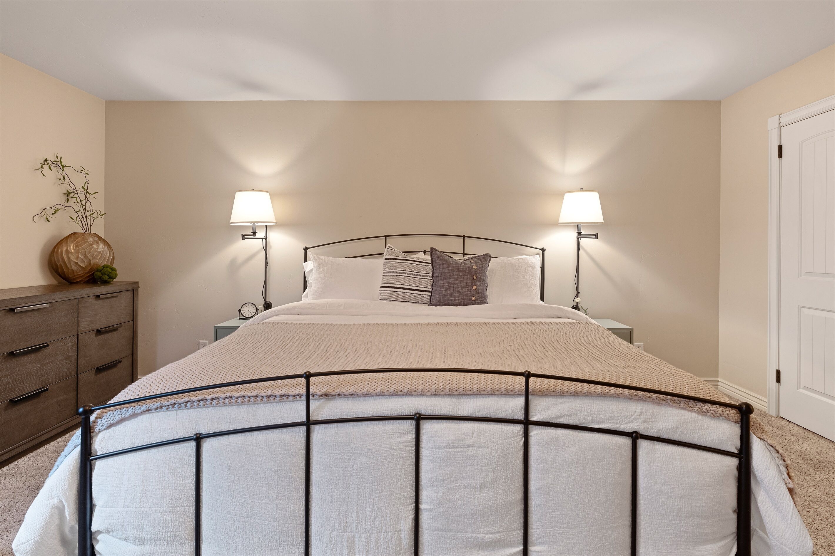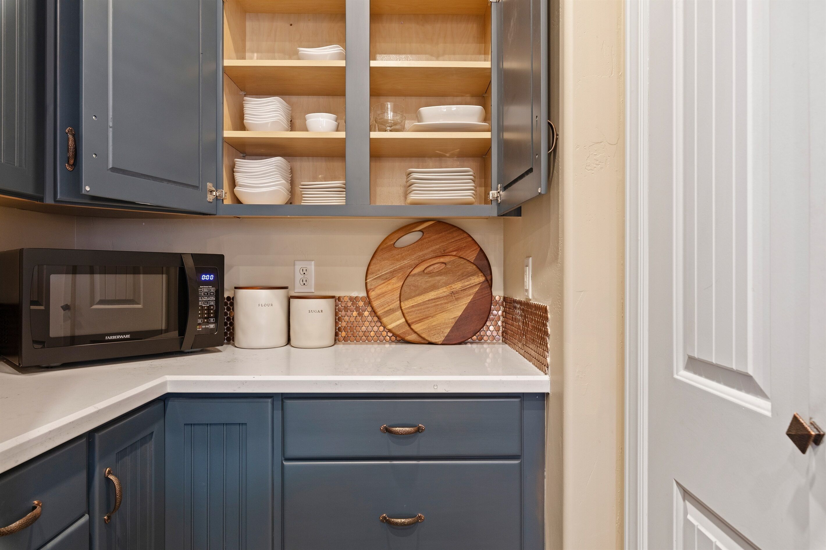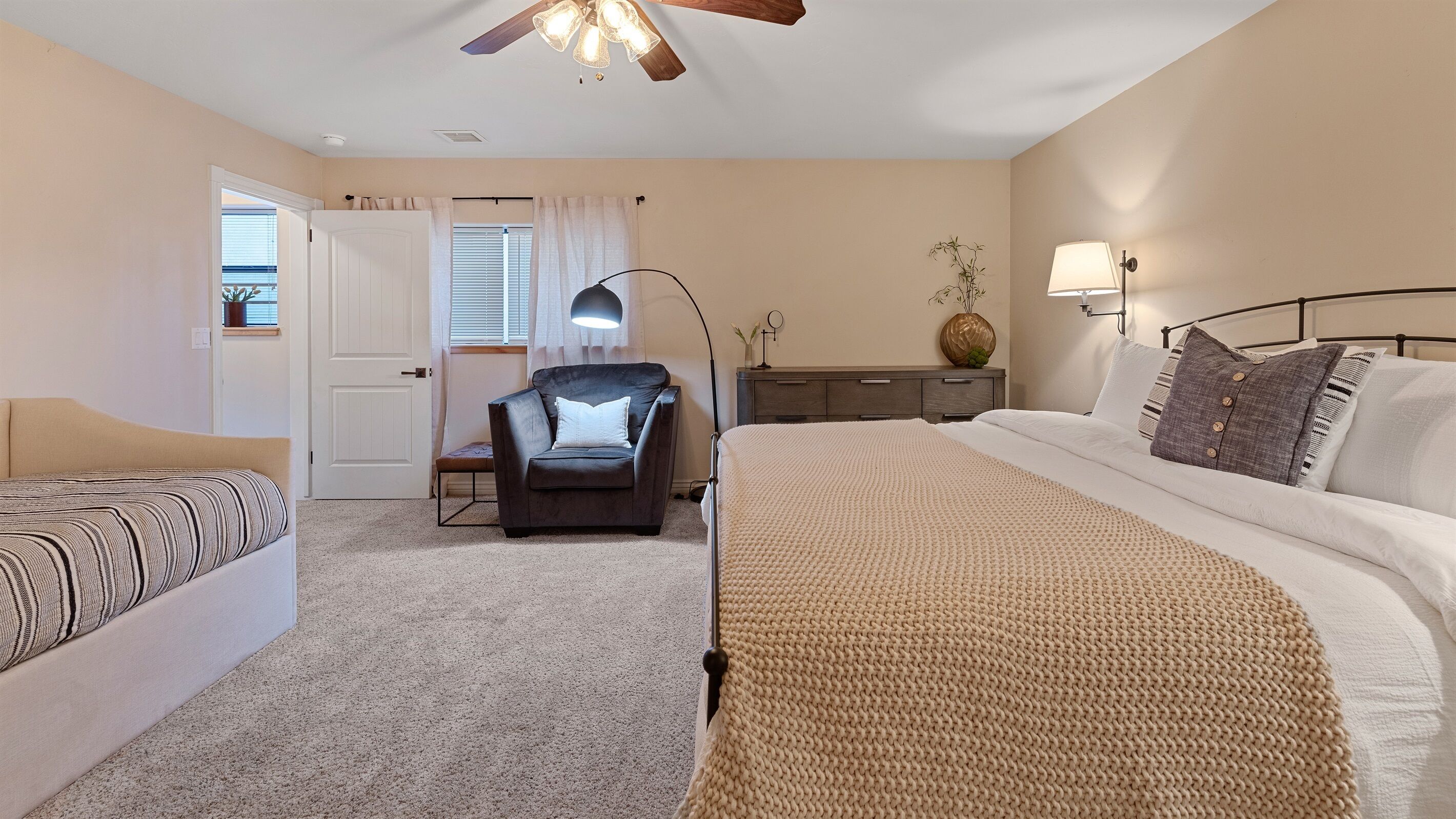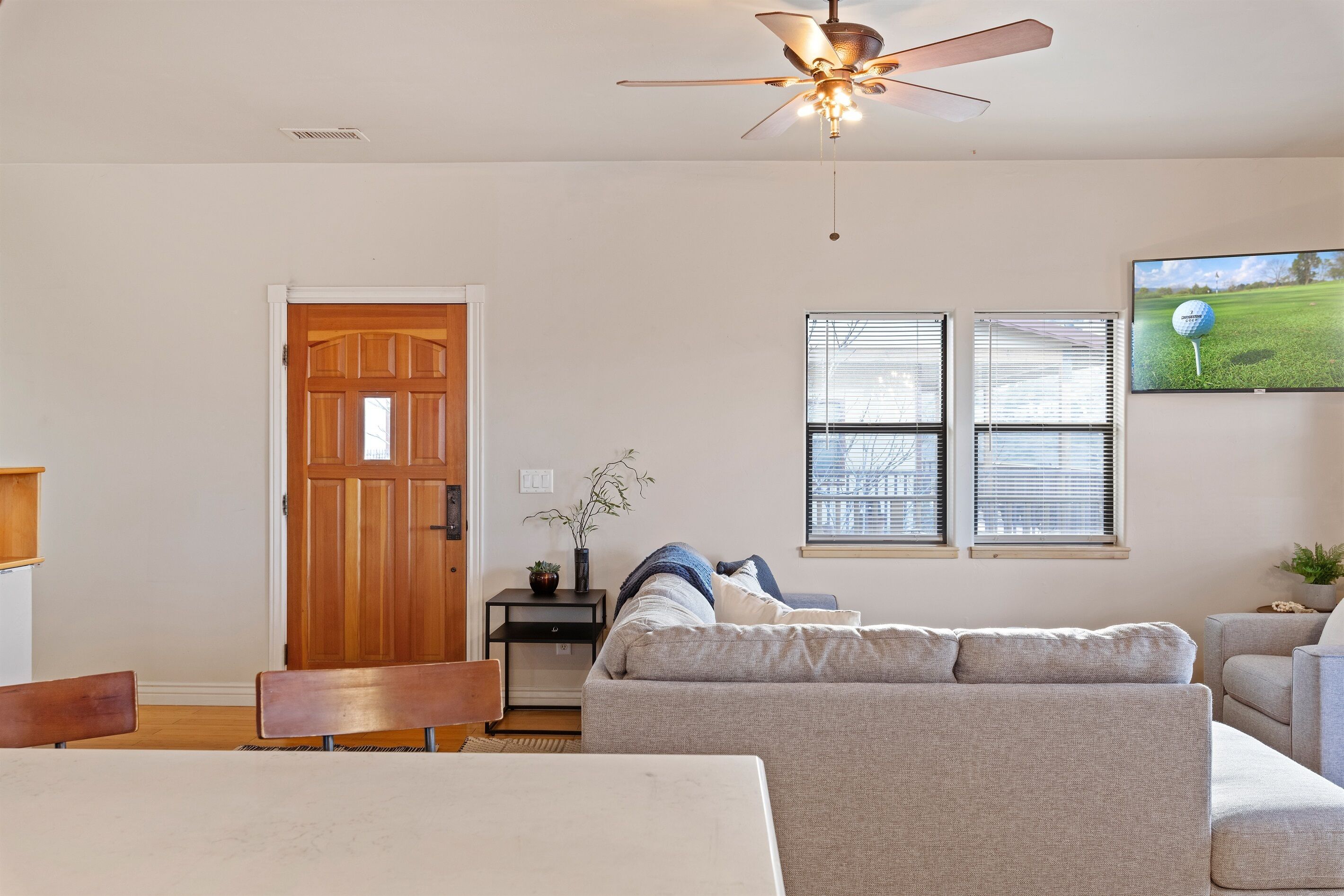 Fully Stocked Kitchen in AZ's Fav Mining Town, Shopping, Dining & Fun VIEWS! Stay with us in this brand new, 2-bedroom, 2 bath unit. Enjoy your cup of coffee in a rocking chair on a large deck overlooking the gorgeous panoramic views of the beautiful city on a hill (beautiful day and night), Verde Valley and Sedona red rocks in the distance. The bright, upscale and modern rustic design offers luxurious and homey feel with high-end furnishings and high thread count linens, 2 master bedrooms with comfy king beds you want to dive into, 700+ thread count linens, flat screen TV's in each room and a fully stocked kitchen, make it the perfect vacation home during any length of stay. The first level with attached garage features the living area, dining area, kitchen, bathroom #1 (with walk in shower and gorgeous onyx granite countertops) and bedroom #1. The lower-level (accessed by interior carpeted staircase) features one large bedroom on the lower level with a trundle day bed transforming into two very comfortable twin beds with ensuite bathroom with tub/shower combo bathroom. Note: we have a studio lock off with a separate entrance on the lower level of this home. Should you need more room for your party, inquire about adding this one bedroom, one bath with private deck and high-end kitchenette to your reservation, making the rental into a large three bedroom, three bathroom house with two decks! By renting this part of the house, you are acknowledging that you have the entire space to yourself with no access to the studio without having specifically rented the adjoining studio. Convenient parking is coveted in our town on a hill but that is no issue here with the attached two-car garage! People with mobility issues will find the first and main level very easy to maneuver. The kitchen is decked out with brand new white quartz countertops, navy blue custom cabinets, state-of-the-art copper-colored stainless-steel appliances including a third-row dishwasher, gas stove/oven with air fryer feature, upgraded lighting and great kitchen gadgets making family meal prep and entertaining enjoyable. There are features like old lanterns and copper penny backsplash giving a gentle nod to the old copper mining days that Jerome was built on in the late 1800's. Visitors to the historical and artsy city of Jerome will appreciate this upscale home conveniently located a short drive to hiking trails, cafes, wine tasting rooms, art galleries, famous Haunted Hamburger—this quaint town has all the charm. The top deck (the lower deck is reserved for our studio guests), with comfy outdoor lounge furniture, is a perfect spot for snack after a hike, sipping wine with a friends or working on your laptop (with our high speed wifi). Your new home-away-from-home is equipped with four smart tv's come with netflix and streaming options, board games and lots of space for the whole family to enjoy the beautiful surroundings! For those spending a full season in the area, this lock-and-leave home is a good place to use as a base for visiting the Grand Canyon, Sedona, Flagstaff, Prescott and Las Vegas. Nearby freeways/highways easily take you to Phoenix, Page Springs, Cottonwood, Flagstaff and beyond! Get all the comforts of home and then some in this great retreat in the serene and beautiful setting. Stay for a long weekend or an entire season. You just may return next year. This new property will book quickly so reach out today! We look forward to welcoming you as a future guest.