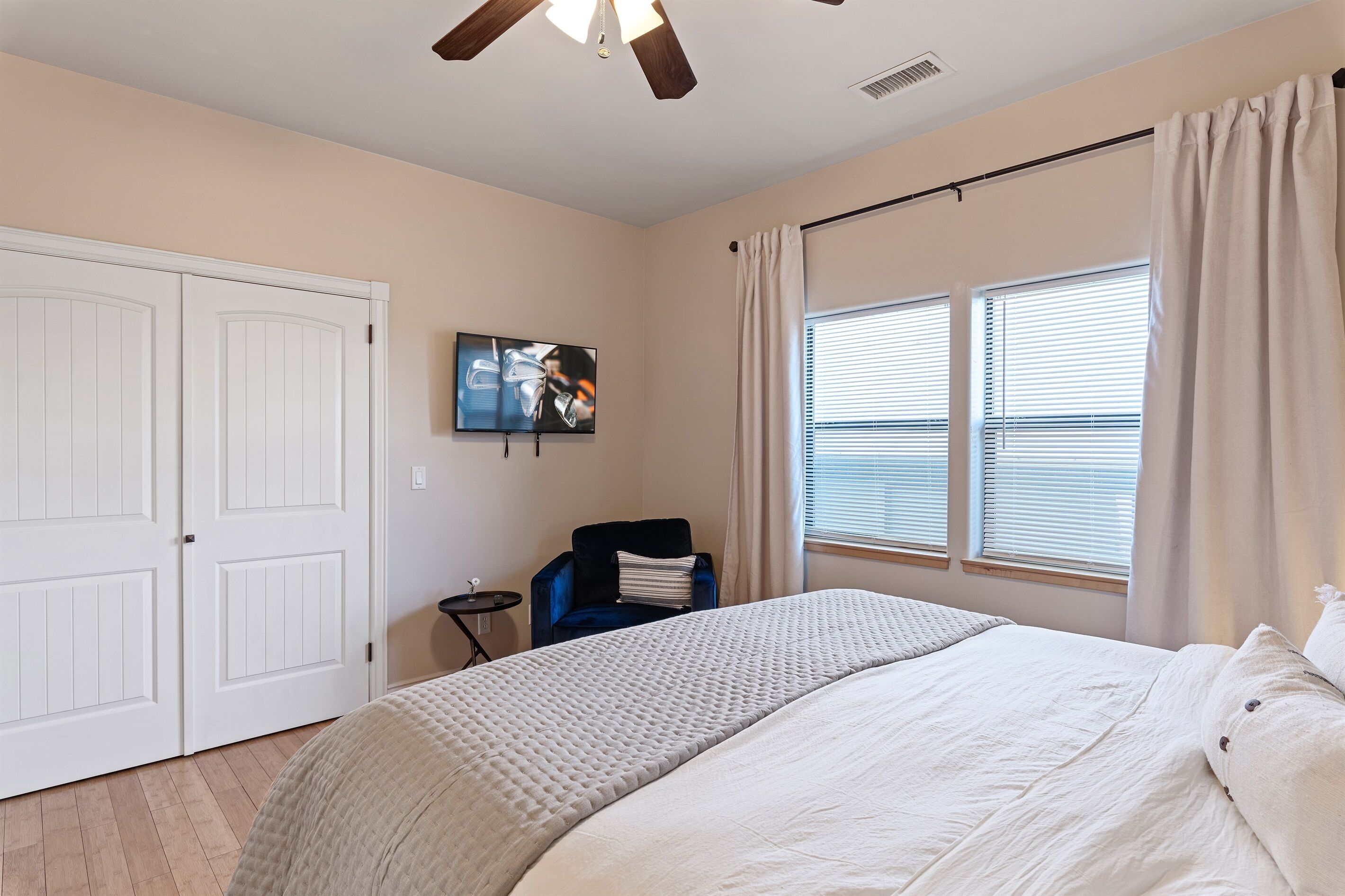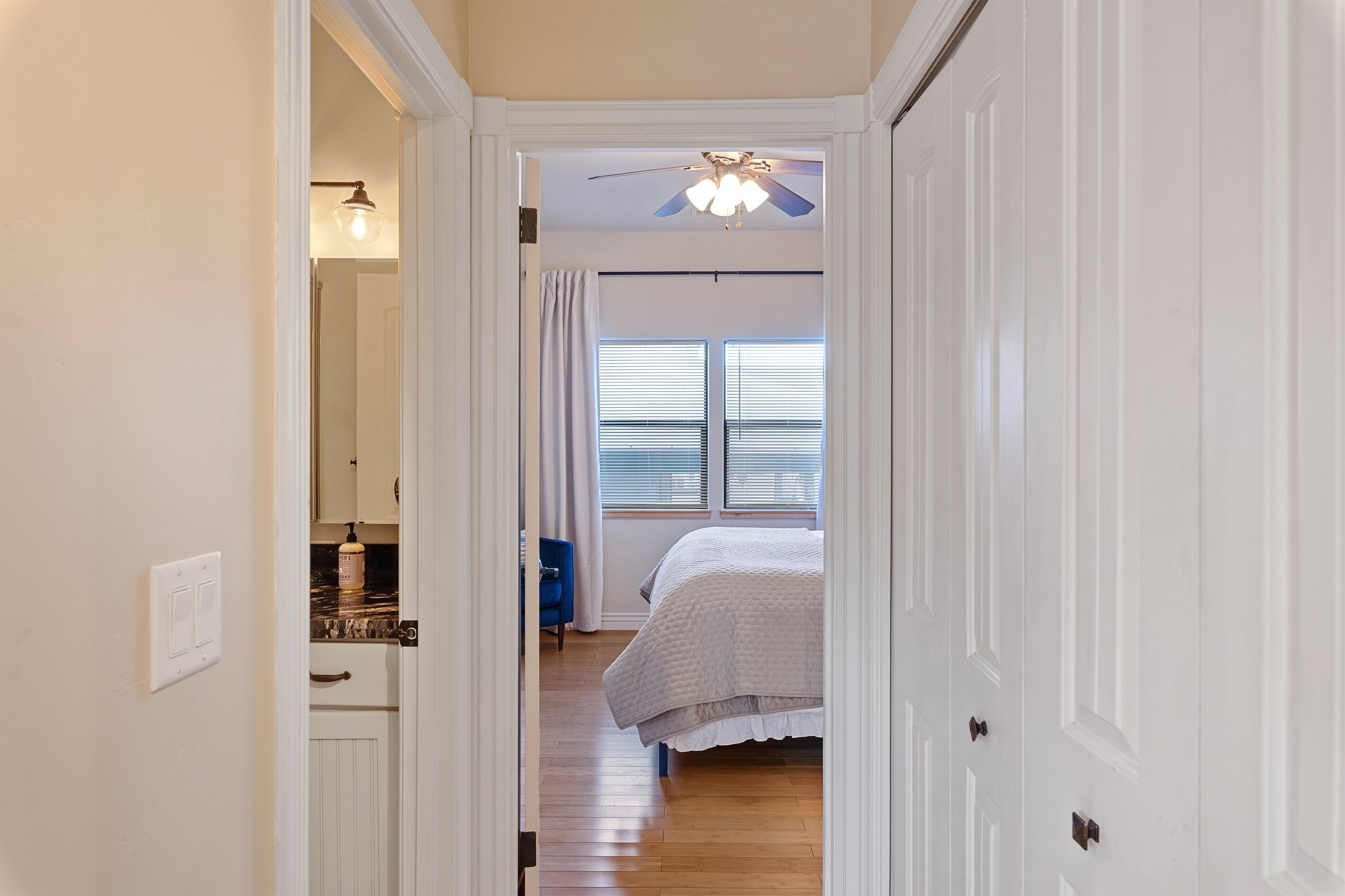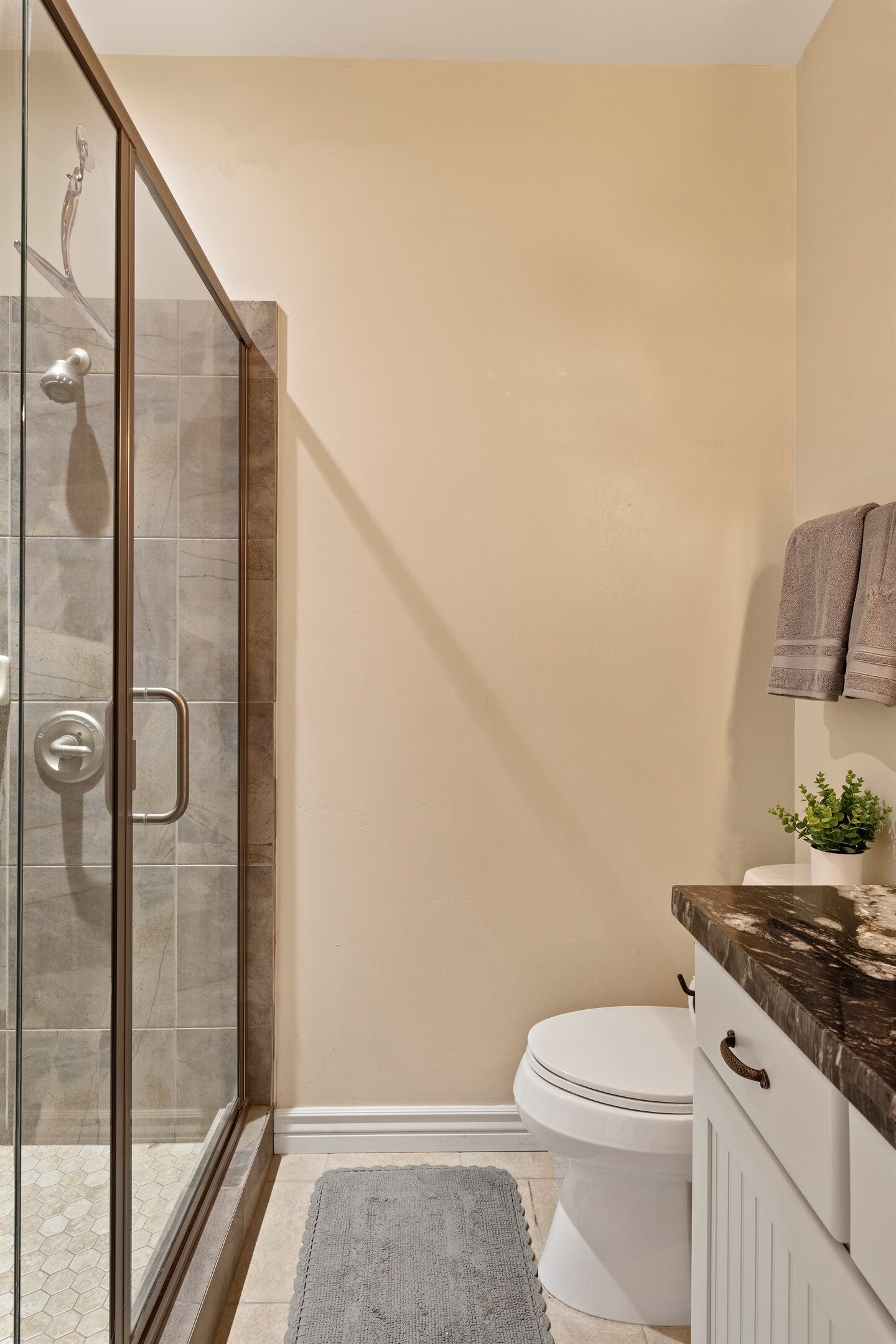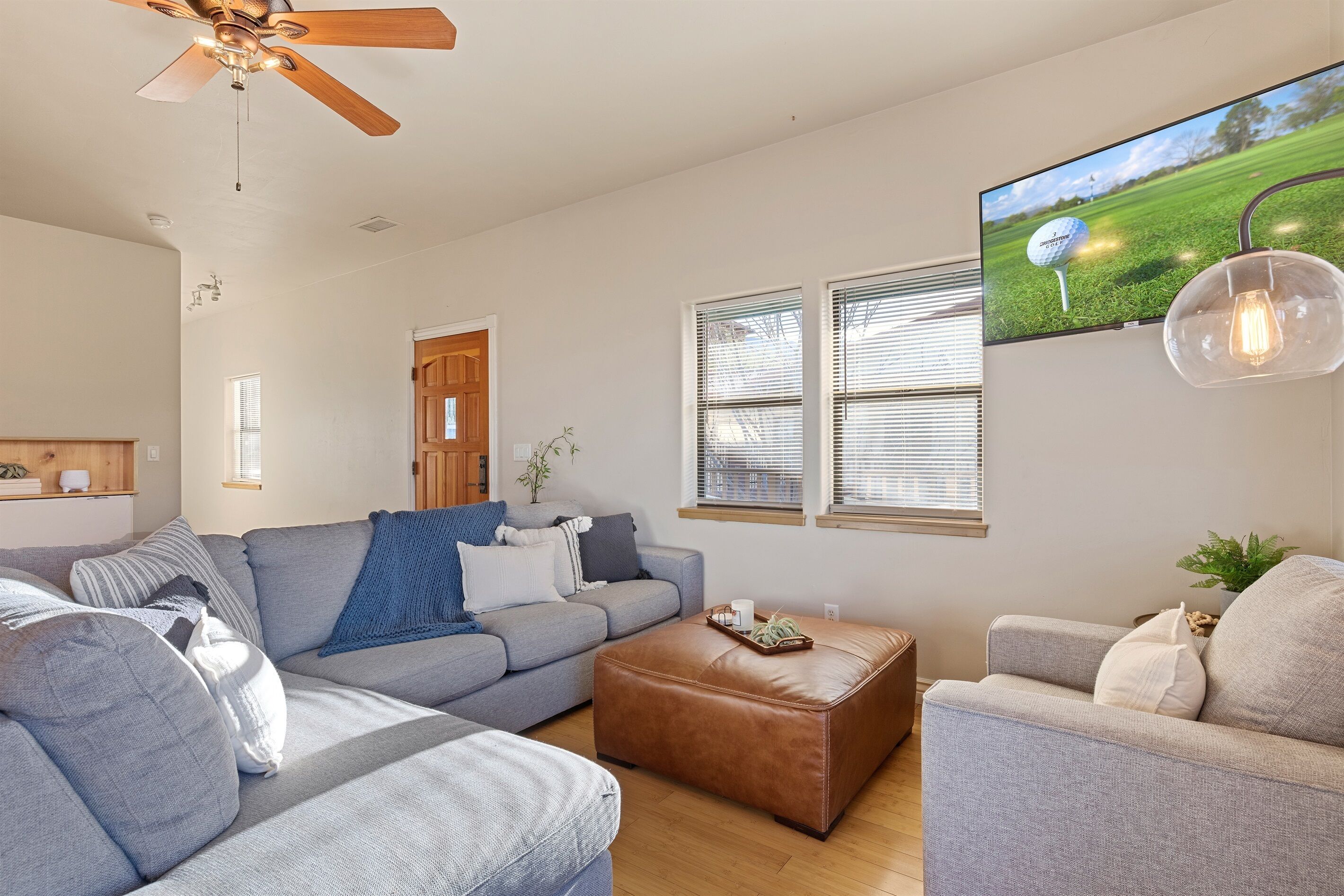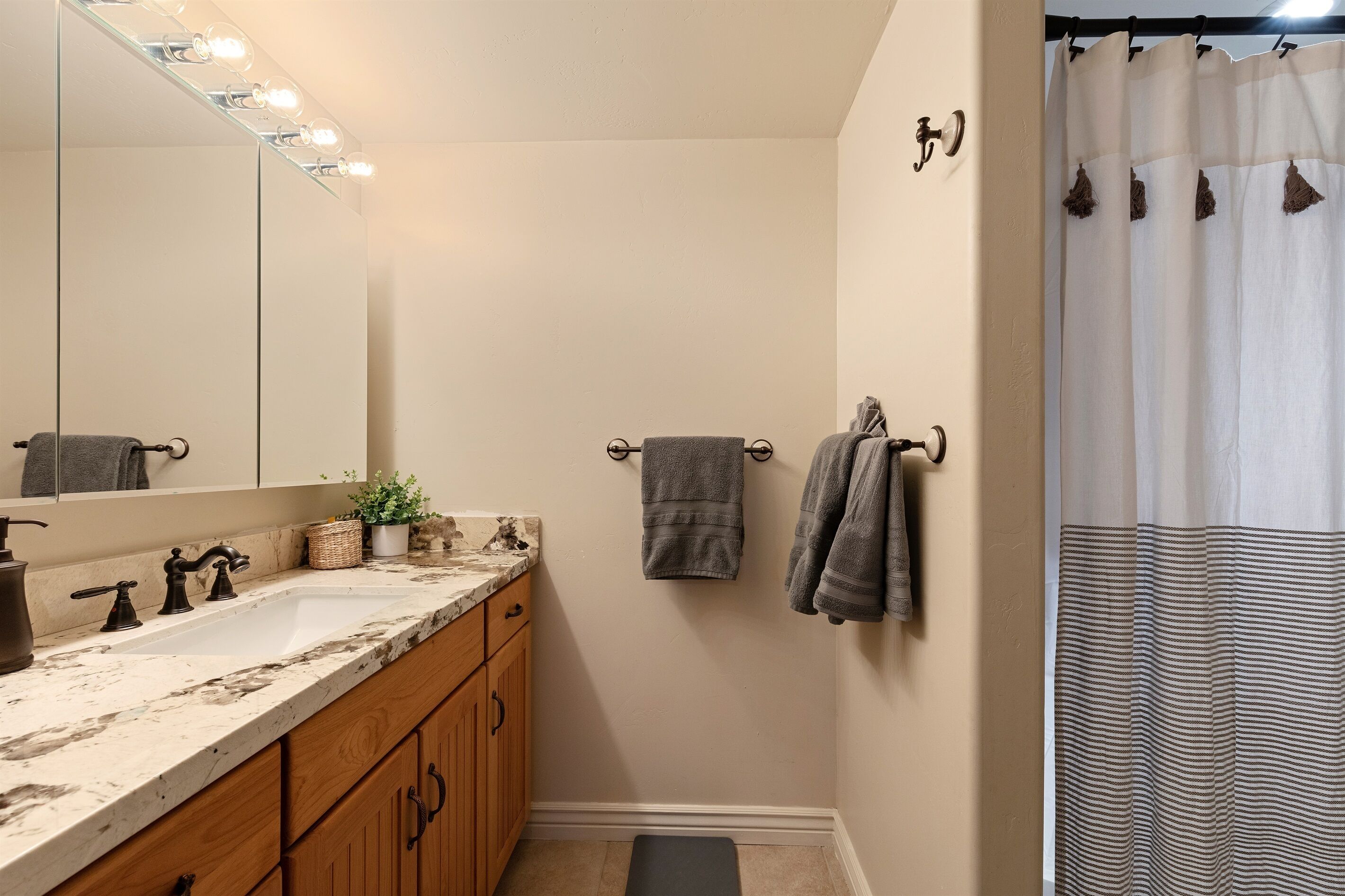 Fully Stocked Kitchen in AZ's Fav Mining Town, Shopping, Dining & Fun VIEWS! Stay with us in this brand new, 2-bedroom, 2 bath unit. Enjoy your cup of coffee in a rocking chair on a large deck overlooking the gorgeous panoramic views of the beautiful city on a hill (beautiful day and night), Verde Valley and Sedona red rocks in the distance. The bright, upscale and modern rustic design offers luxurious and homey feel with high-end furnishings and high thread count linens, 2 master bedrooms with comfy king beds you want to dive into, 700+ thread count linens, flat screen TV's in each room and a fully stocked kitchen, make it the perfect vacation home during any length of stay. The first level with attached garage features the living area, dining area, kitchen, bathroom #1 (with walk in shower and gorgeous onyx granite countertops) and bedroom #1. The lower-level (accessed by interior carpeted staircase) features one large bedroom on the lower level with a trundle day bed transforming into two very comfortable twin beds with ensuite bathroom with tub/shower combo bathroom. Note: we have a studio lock off with a separate entrance on the lower level of this home. Should you need more room for your party, inquire about adding this one bedroom, one bath with private deck and high-end kitchenette to your reservation, making the rental into a large three bedroom, three bathroom house with two decks! By renting this part of the house, you are acknowledging that you have the entire space to yourself with no access to the studio without having specifically rented the adjoining studio. Convenient parking is coveted in our town on a hill but that is no issue here with the attached two-car garage! People with mobility issues will find the first and main level very easy to maneuver. The kitchen is decked out with brand new white quartz countertops, navy blue custom cabinets, state-of-the-art copper-colored stainless-steel appliances including a third-row dishwasher, gas stove/oven with air fryer feature, upgraded lighting and great kitchen gadgets making family meal prep and entertaining enjoyable. There are features like old lanterns and copper penny backsplash giving a gentle nod to the old copper mining days that Jerome was built on in the late 1800's. Visitors to the historical and artsy city of Jerome will appreciate this upscale home conveniently located a short drive to hiking trails, cafes, wine tasting rooms, art galleries, famous Haunted Hamburger—this quaint town has all the charm. The top deck (the lower deck is reserved for our studio guests), with comfy outdoor lounge furniture, is a perfect spot for snack after a hike, sipping wine with a friends or working on your laptop (with our high speed wifi). Your new home-away-from-home is equipped with four smart tv's come with netflix and streaming options, board games and lots of space for the whole family to enjoy the beautiful surroundings! For those spending a full season in the area, this lock-and-leave home is a good place to use as a base for visiting the Grand Canyon, Sedona, Flagstaff, Prescott and Las Vegas. Nearby freeways/highways easily take you to Phoenix, Page Springs, Cottonwood, Flagstaff and beyond! Get all the comforts of home and then some in this great retreat in the serene and beautiful setting. Stay for a long weekend or an entire season. You just may return next year. This new property will book quickly so reach out today! We look forward to welcoming you as a future guest.
