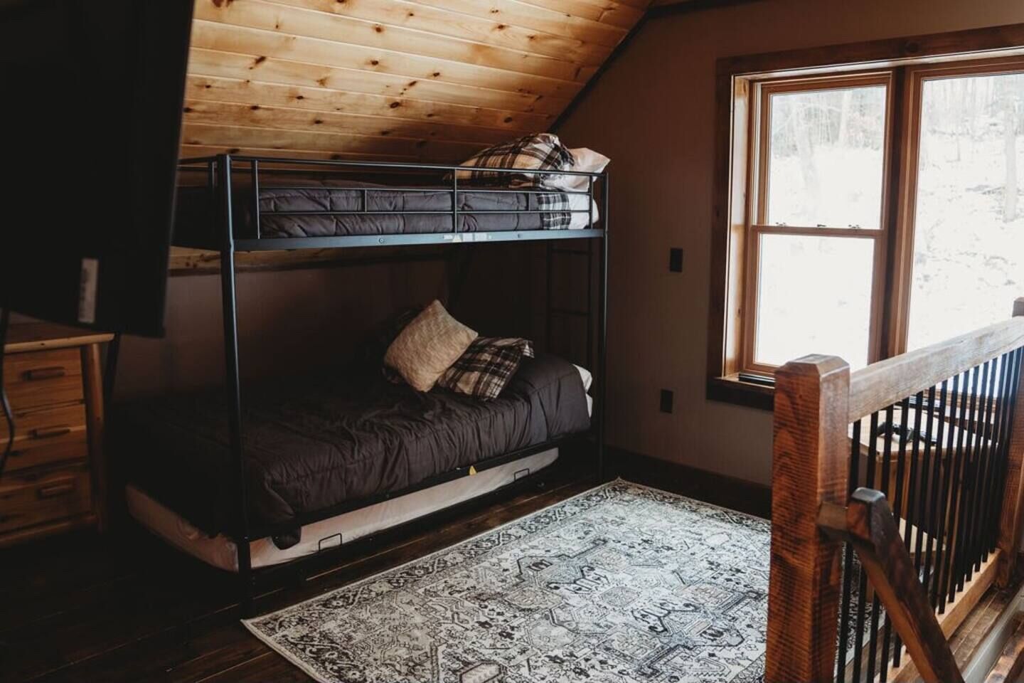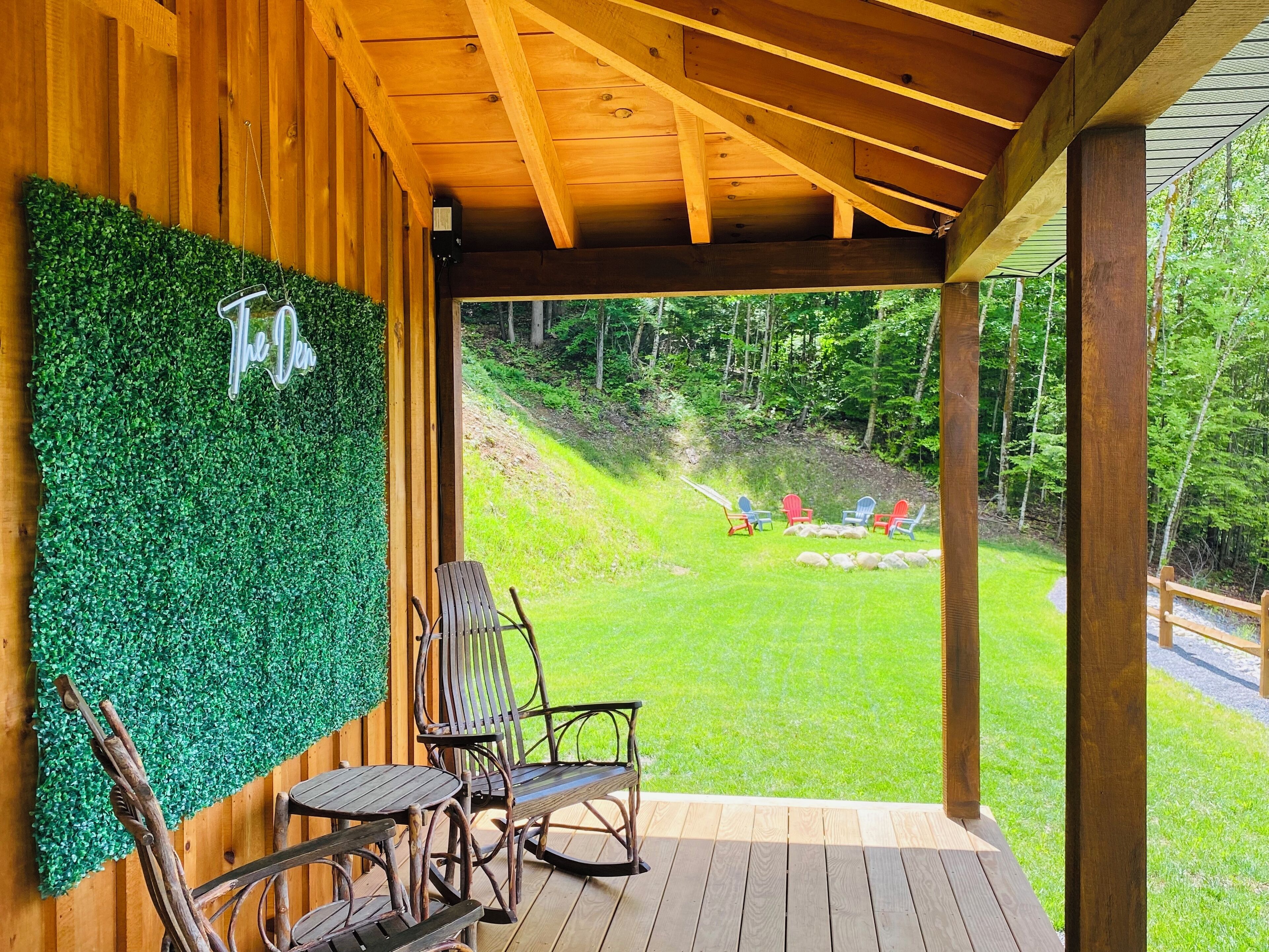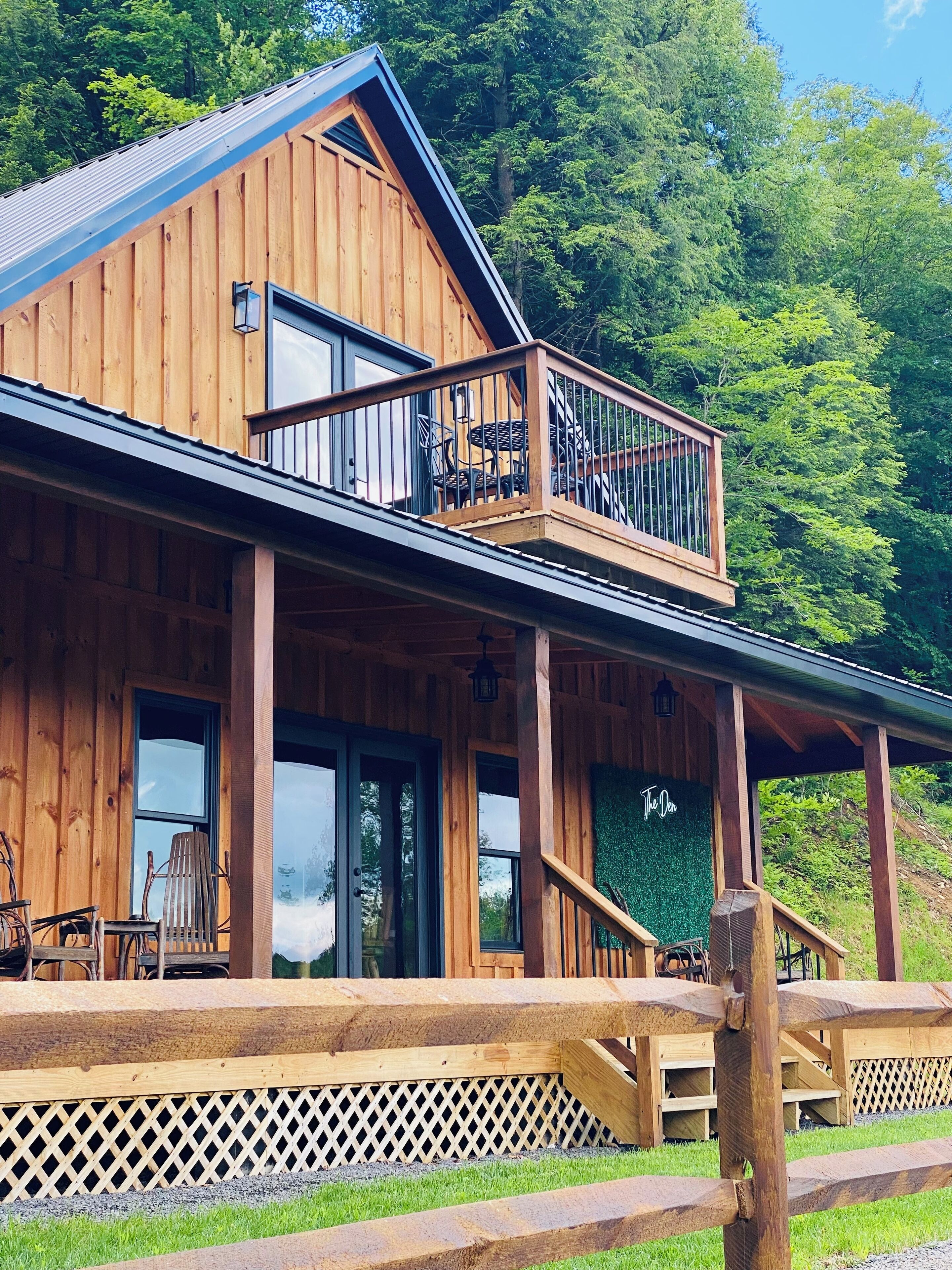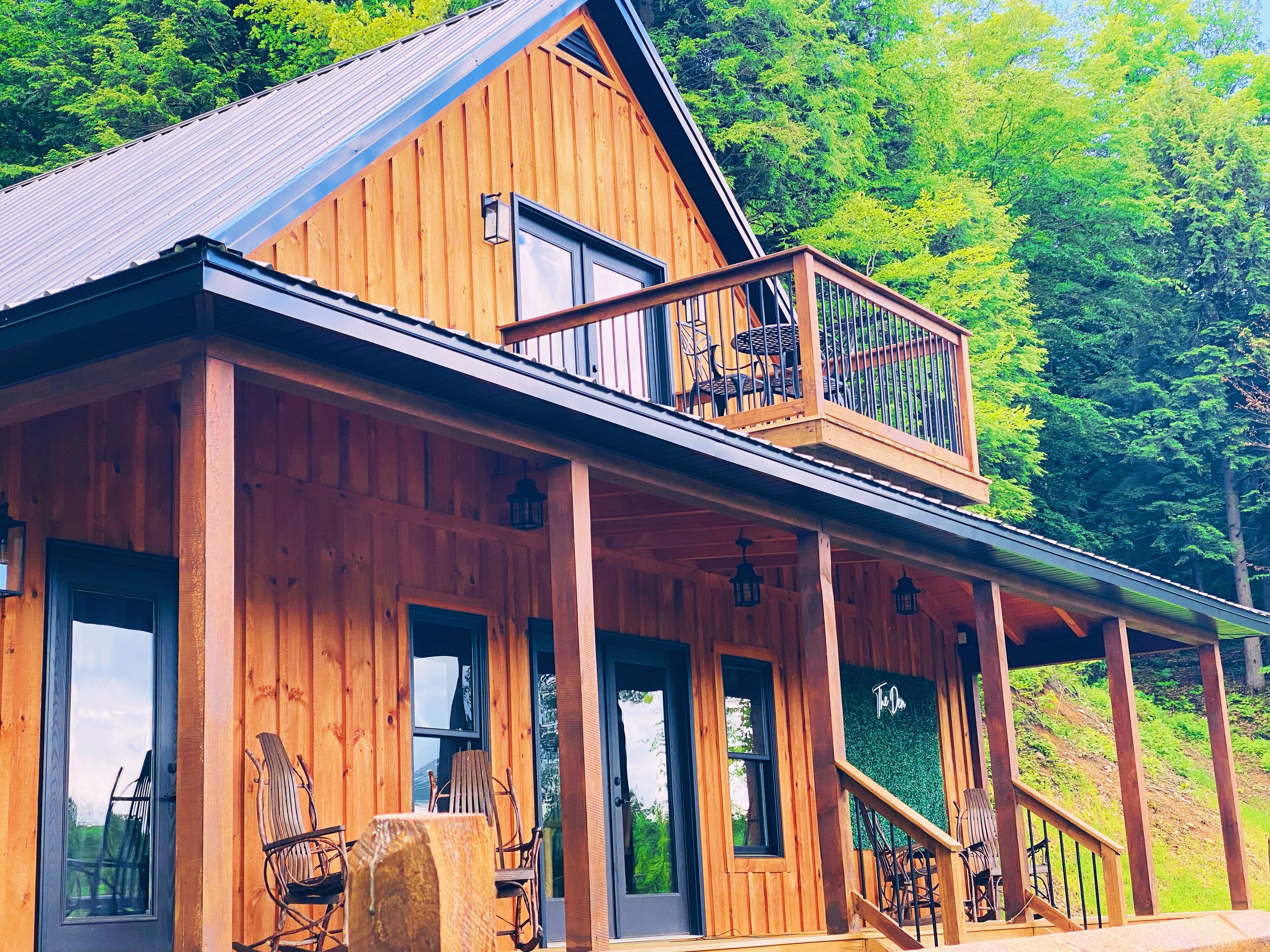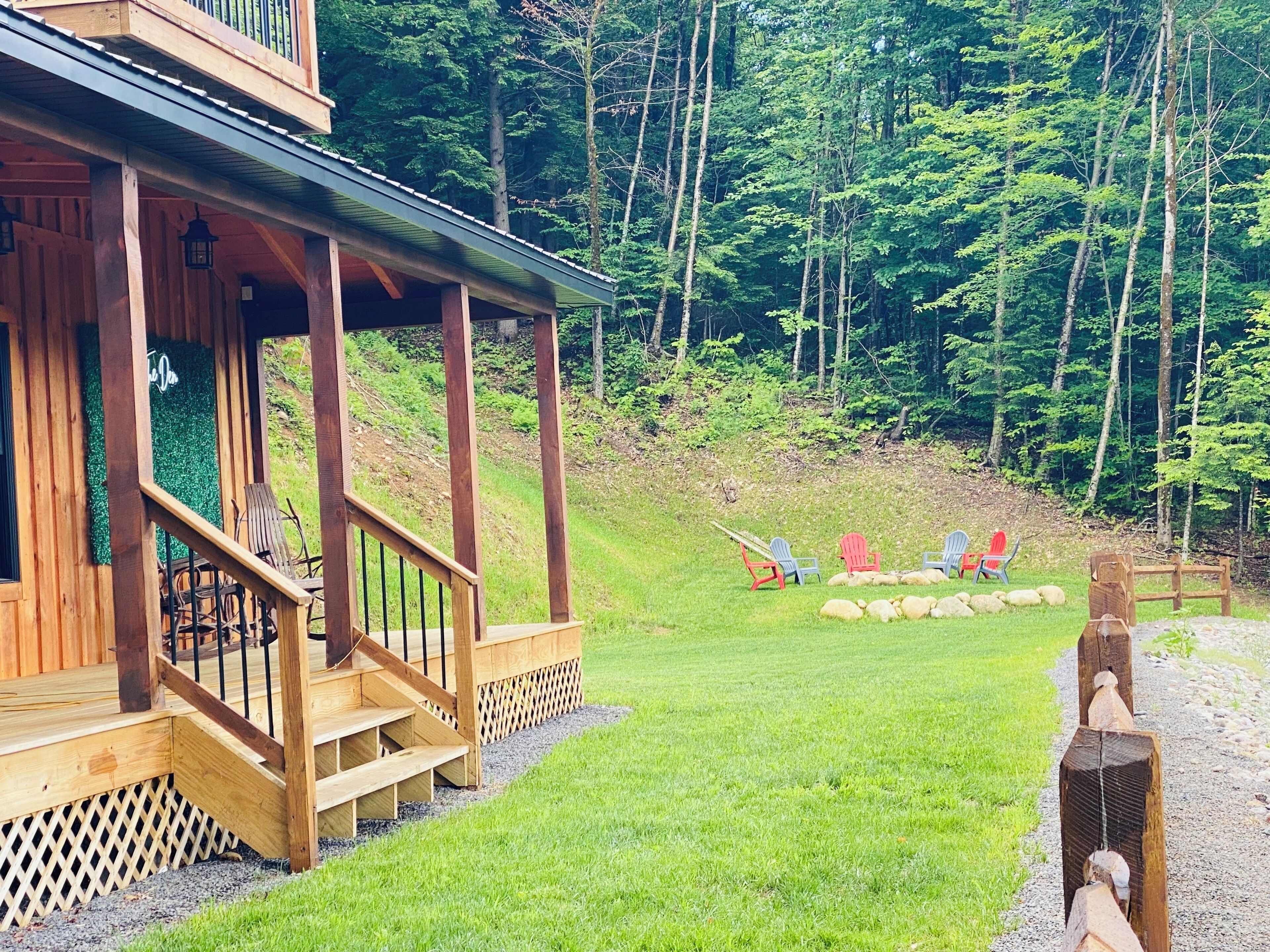 Luxury cabin on private drive Start your next adventure and step into The Den on Bear View Drive, our picturesque 3-bedroom cabin in the rolling landscape of the Adirondacks, where you’ll be greeted with incredible views. Our carefully designed cabin is the quintessential outdoor getaway, central to many of the adventures found in the Adirondacks. Perfect for family fun, steps from Hinkley Lake, short commute to two different Ski resorts, located on the C4B snowmobile Trail, and other activities for up to 7 guests!The spaceFirst floor: is an open concept so you can enjoy the rough cut exposed lumber beams! Beautiful Full kitchen with all modern amenities! Stylish den area to enjoy lounging around watching your favorite programs. Nice size bedroom with a queen bed! Full bathroom and stand up shower.Second floor: very nice size loft area with a bunk bed and trundle underneath. Full bathroom. Large bedroom with king bed, walk in closet outfitted with a beauty vanity and full length mirror. Yes guys now the queen of the castle won’t be hogging up the bathroom while you rush to make your event! Right off the master is the upstairs patio with a cute little bistro set to enjoy the picturesque surrounding landscape!Exterior: located on 2 acres of rolling terrain. giant back porch with BBQ gas grill. Wood fired fire pit (wood provided). Situated on a private drive so you can enjoy nature strolls and see what the great outdoors has to offer.Guest access2 acres of private property with an open yard. Private driveway.