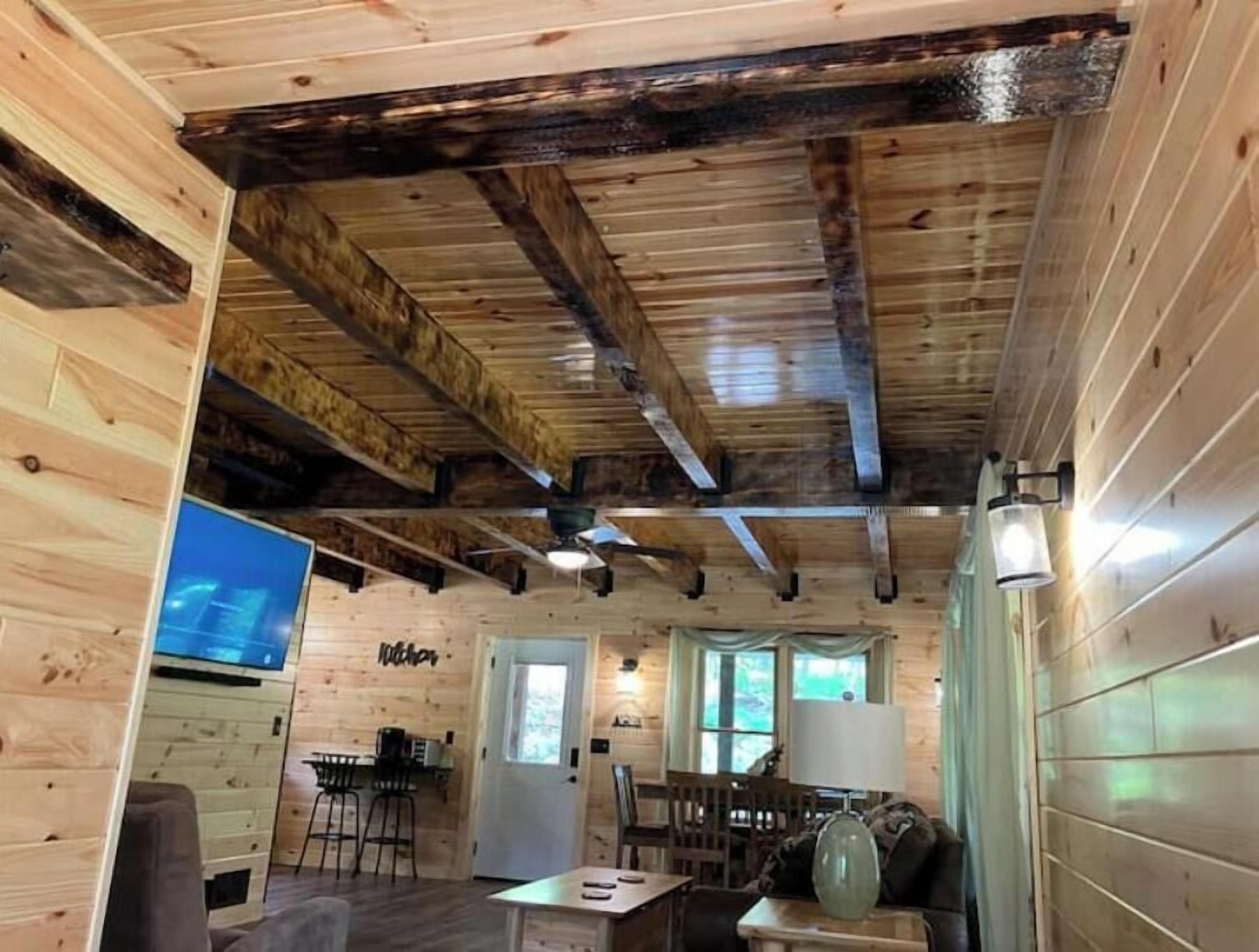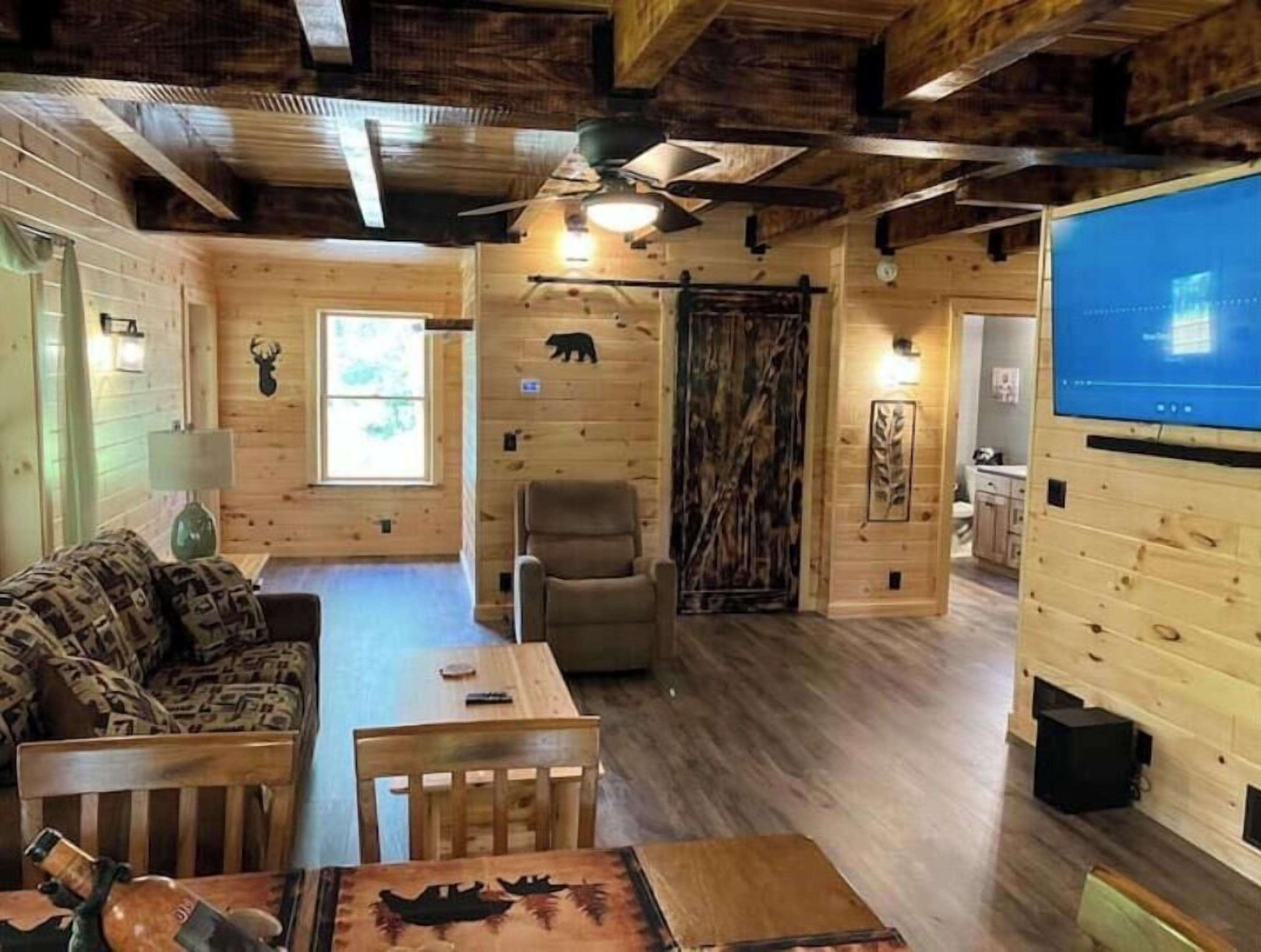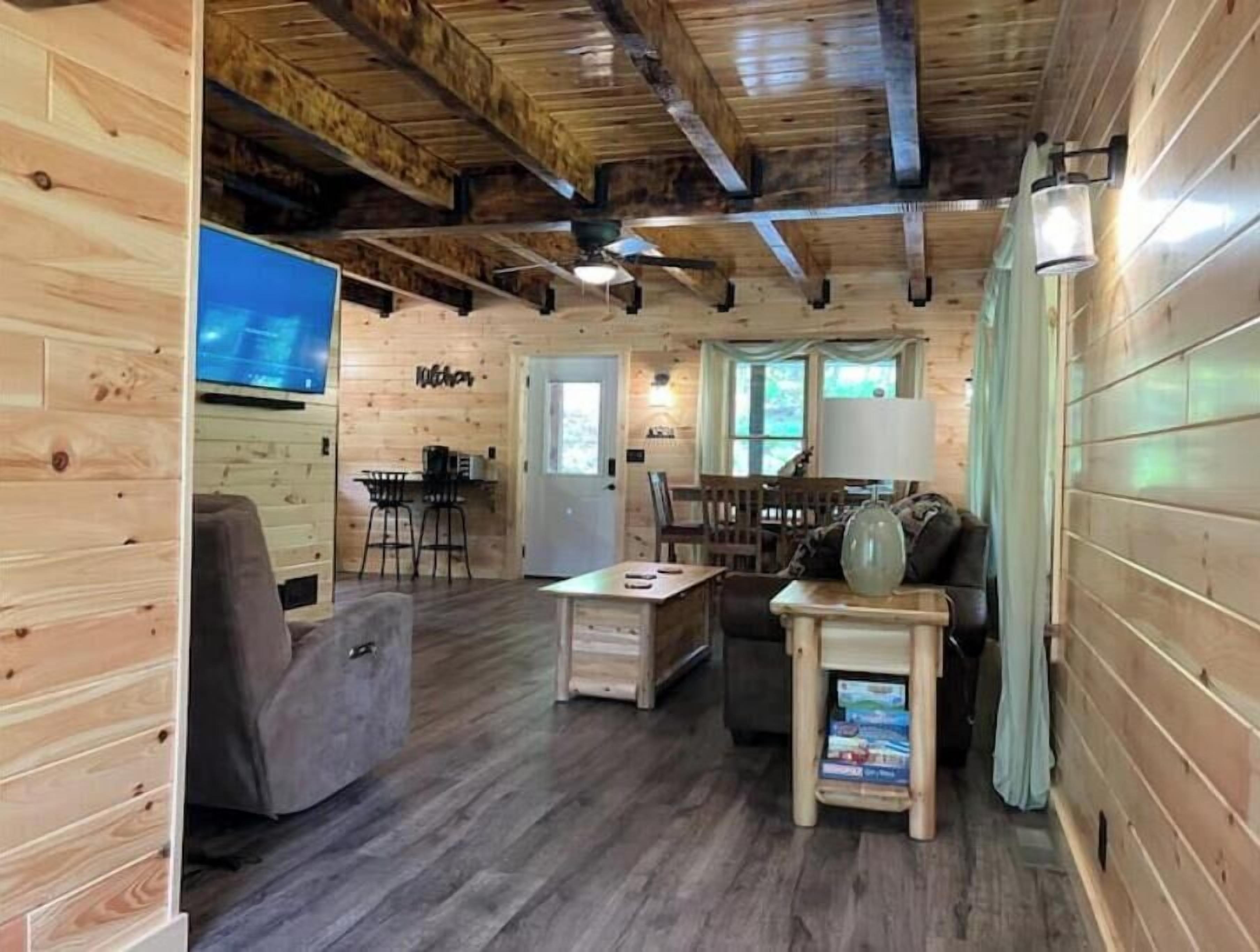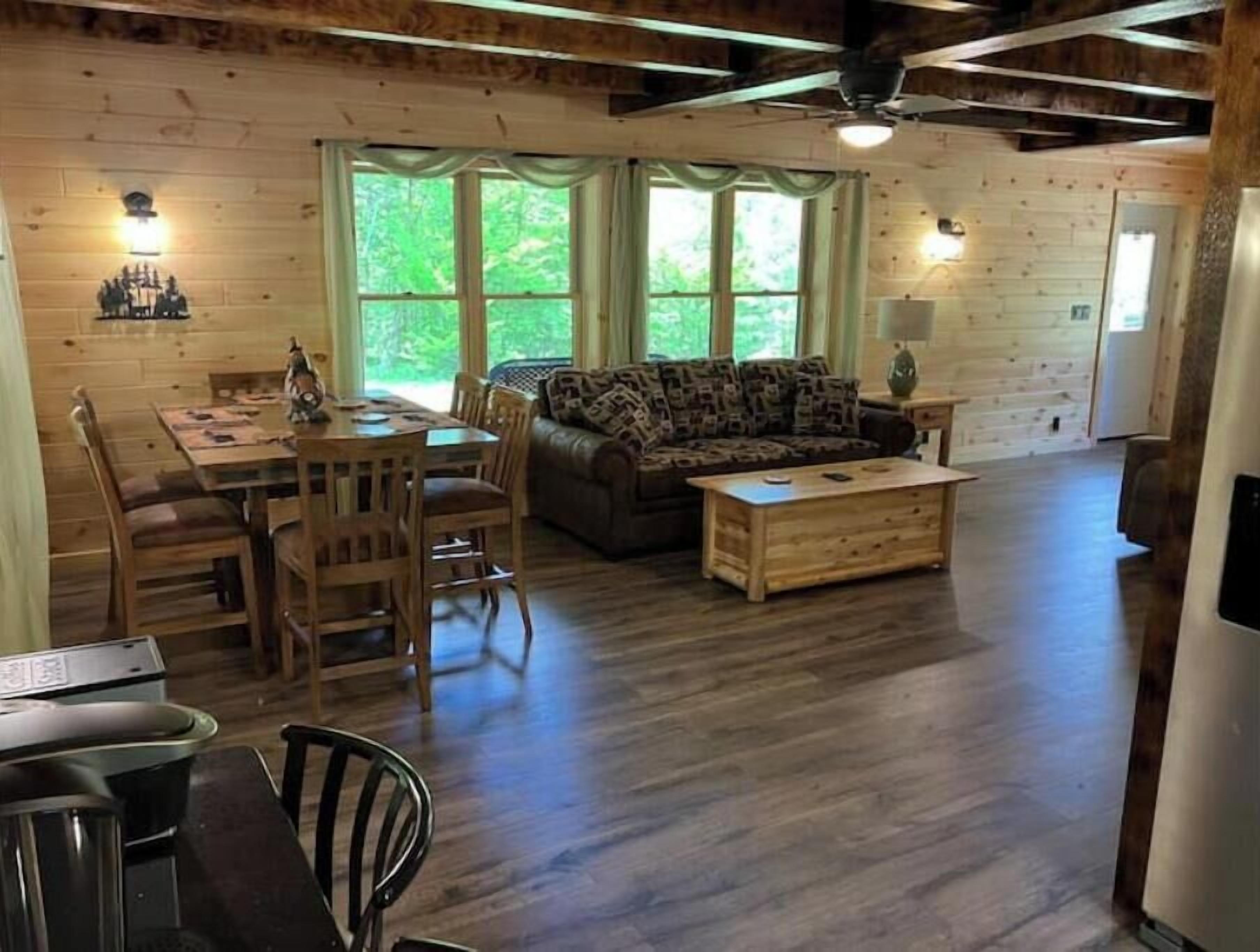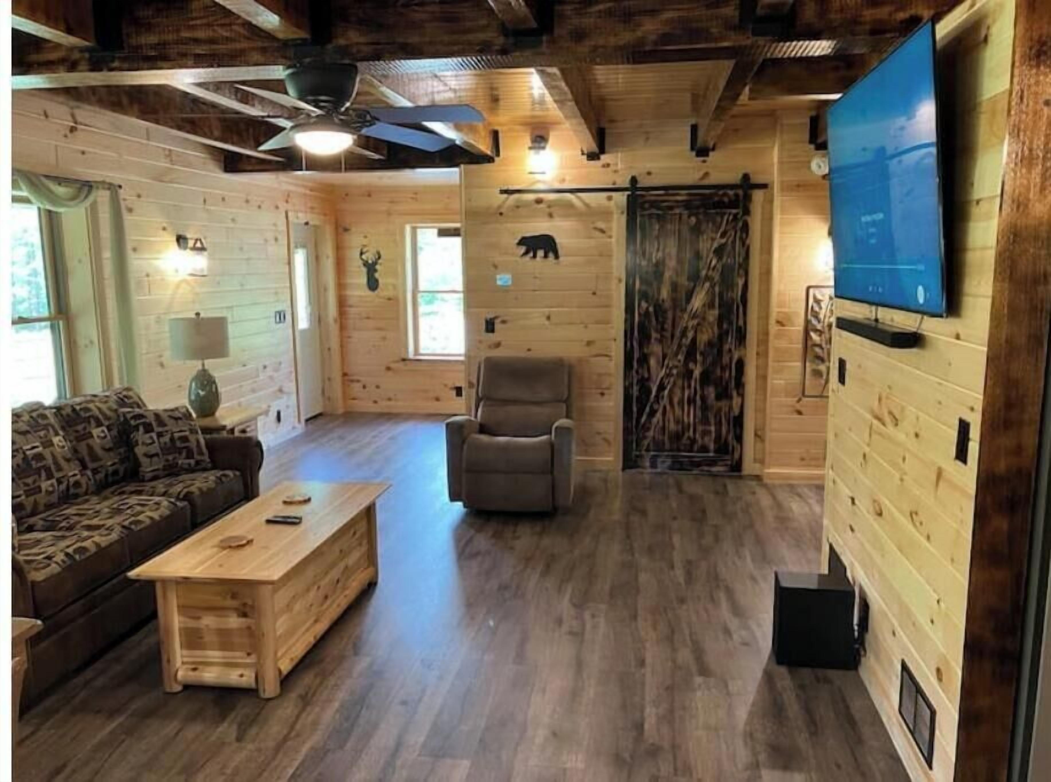 Creekside Cabin with Lake Access , Brand new build !!! About this spaceKick back and relax in this brand new built rustic adirondack themed cabin (spring 2024). Open floor plan with custom beams & knotty pine thoughout. Sleeps 6 with 2 bedrooms & sleeper sofa. 2 full bathrooms , Big screen smart tv's in both bedrooms & livingroom. Stunning hickory kitchen , spacious wrap around porch , outdoor fir...