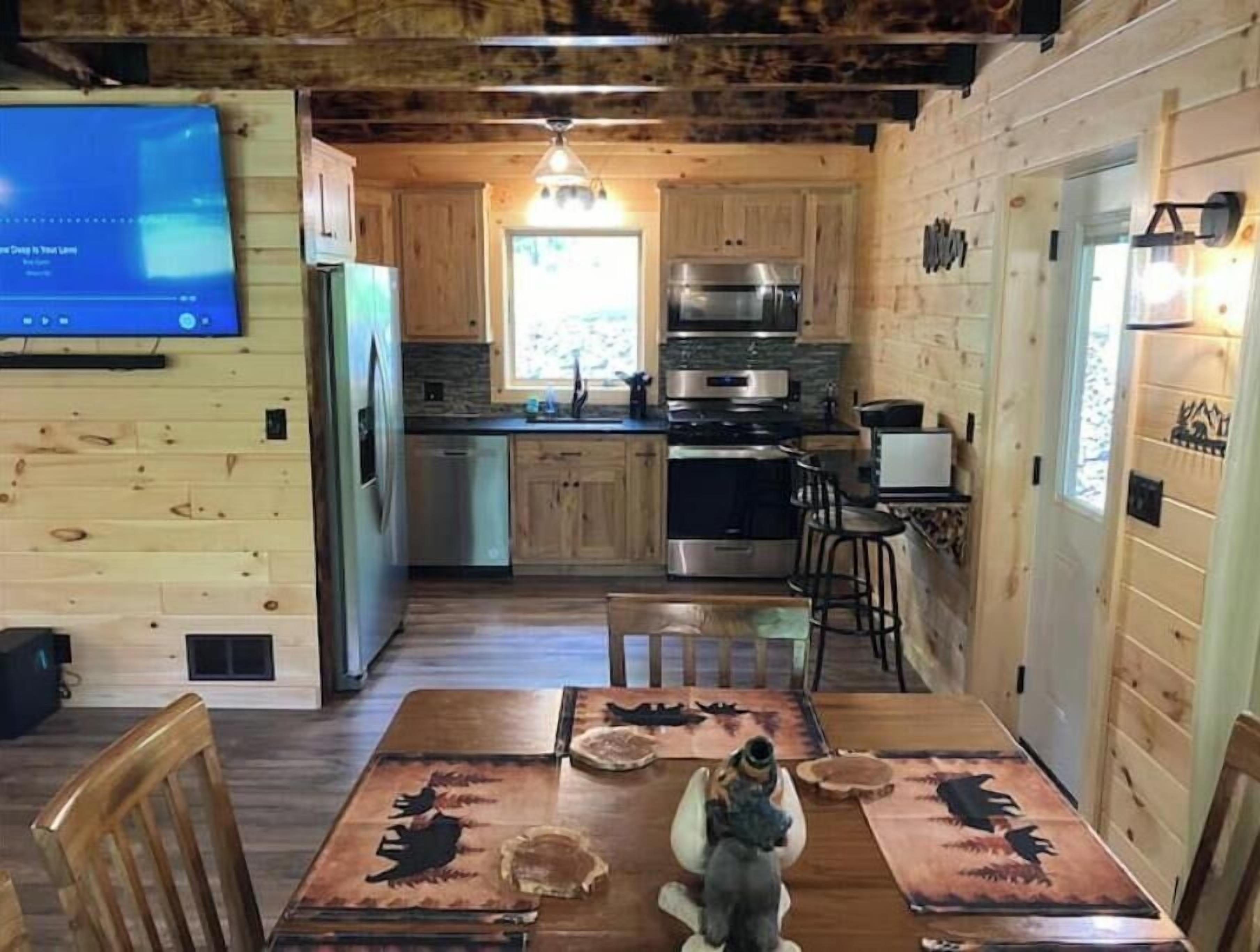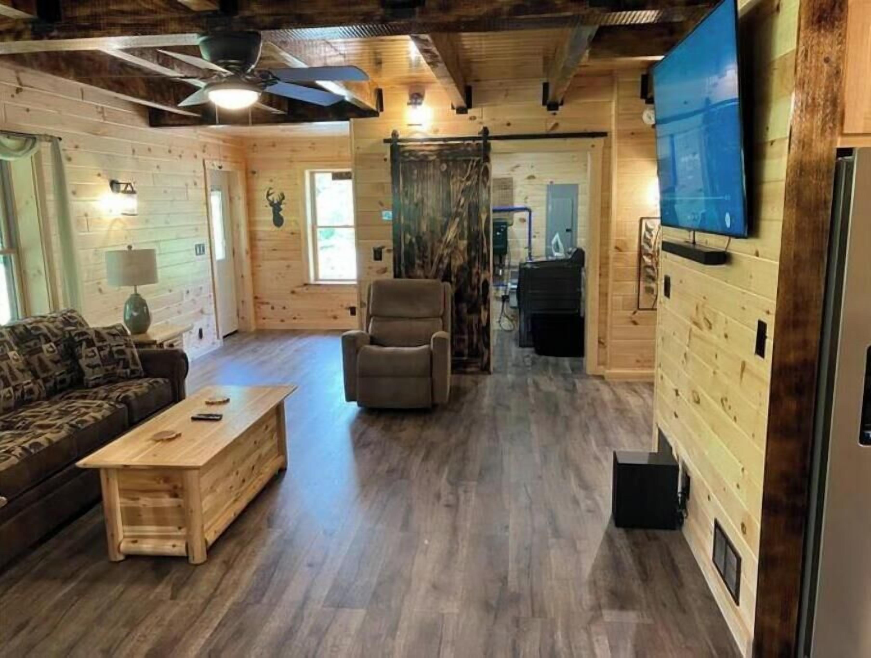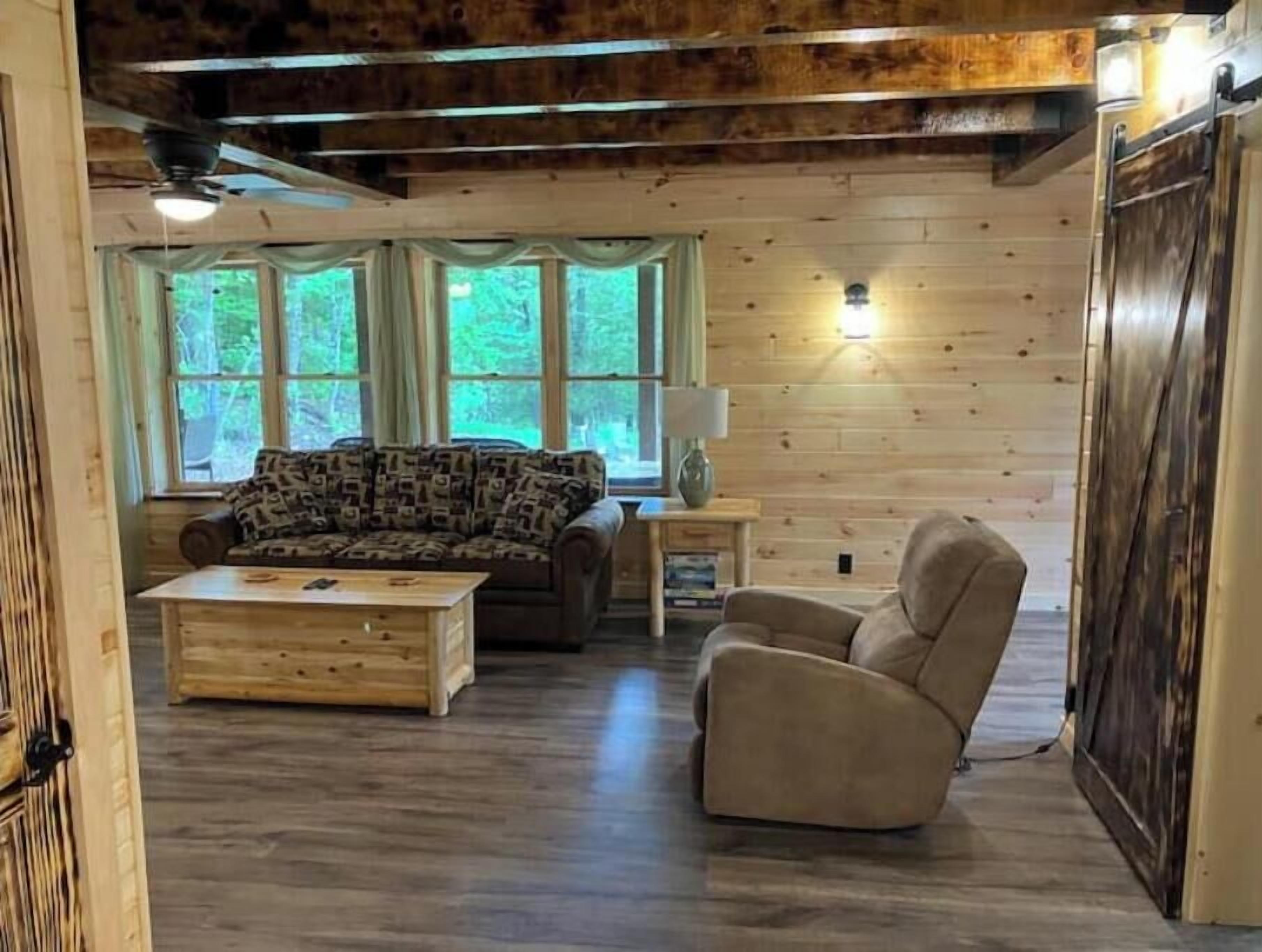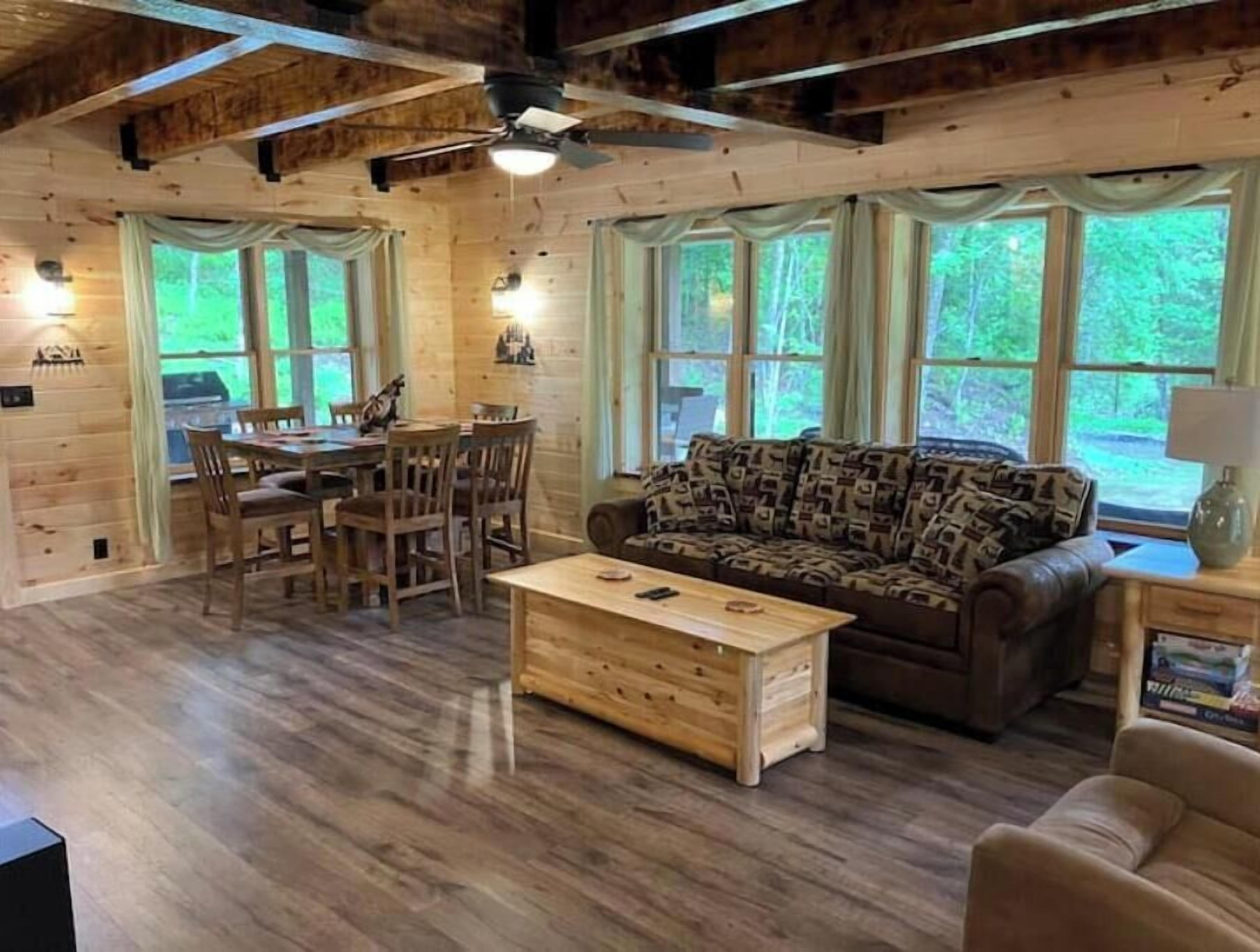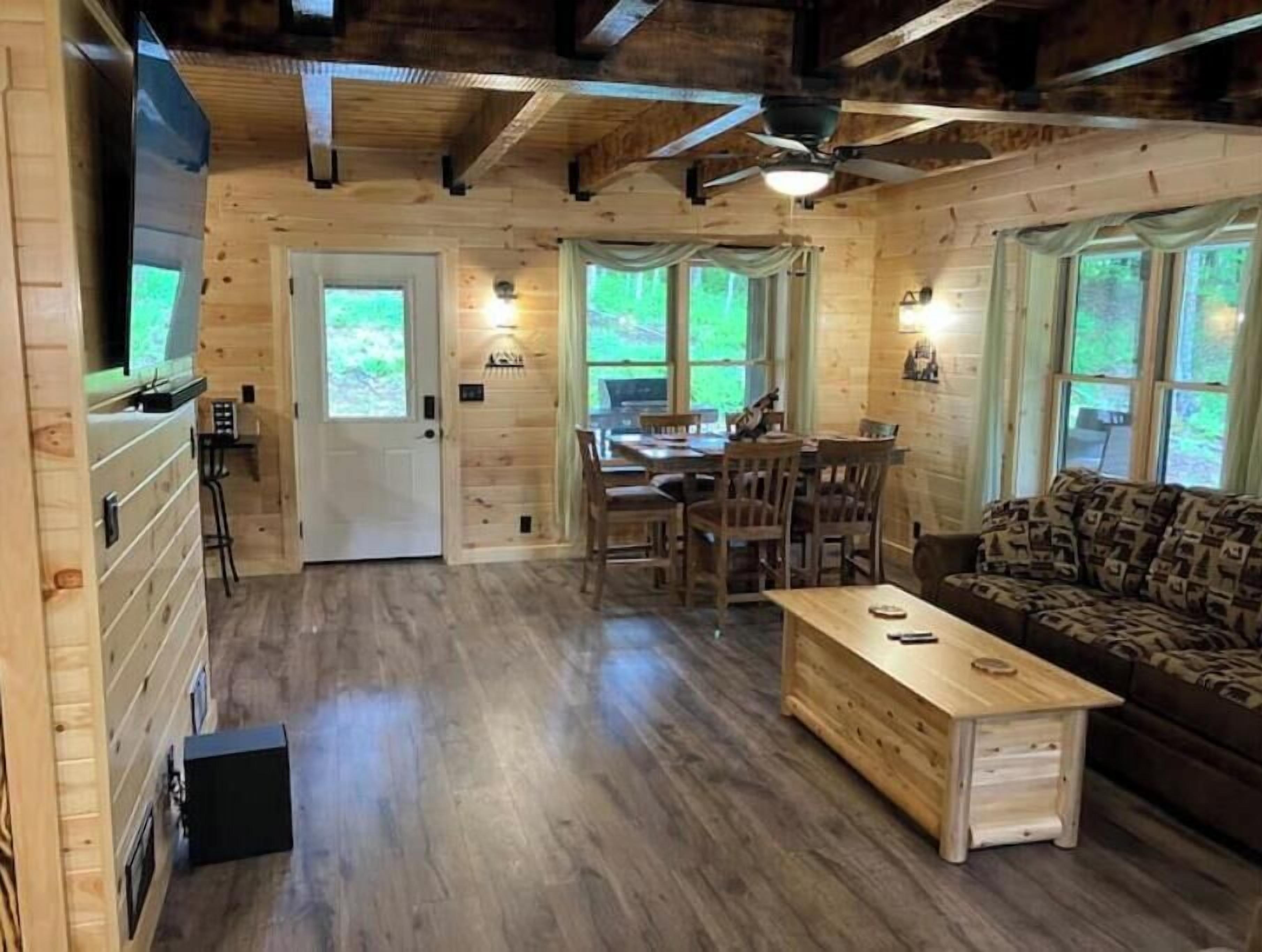 Creekside Cabin with Lake Access , Brand new build !!! About this spaceKick back and relax in this brand new built rustic adirondack themed cabin (spring 2024). Open floor plan with custom beams & knotty pine thoughout. Sleeps 6 with 2 bedrooms & sleeper sofa. 2 full bathrooms , Big screen smart tv's in both bedrooms & livingroom. Stunning hickory kitchen , spacious wrap around porch , outdoor fir...