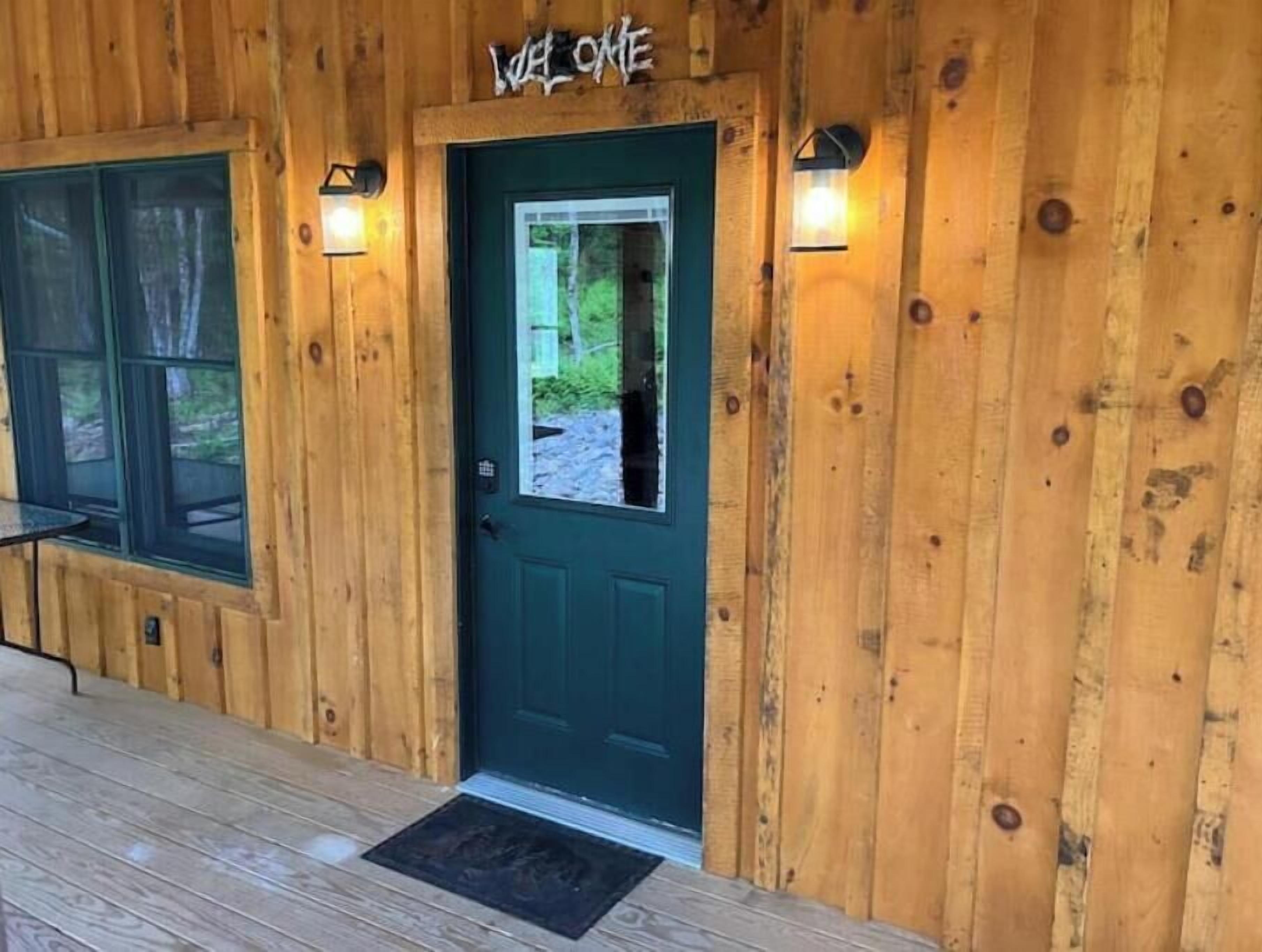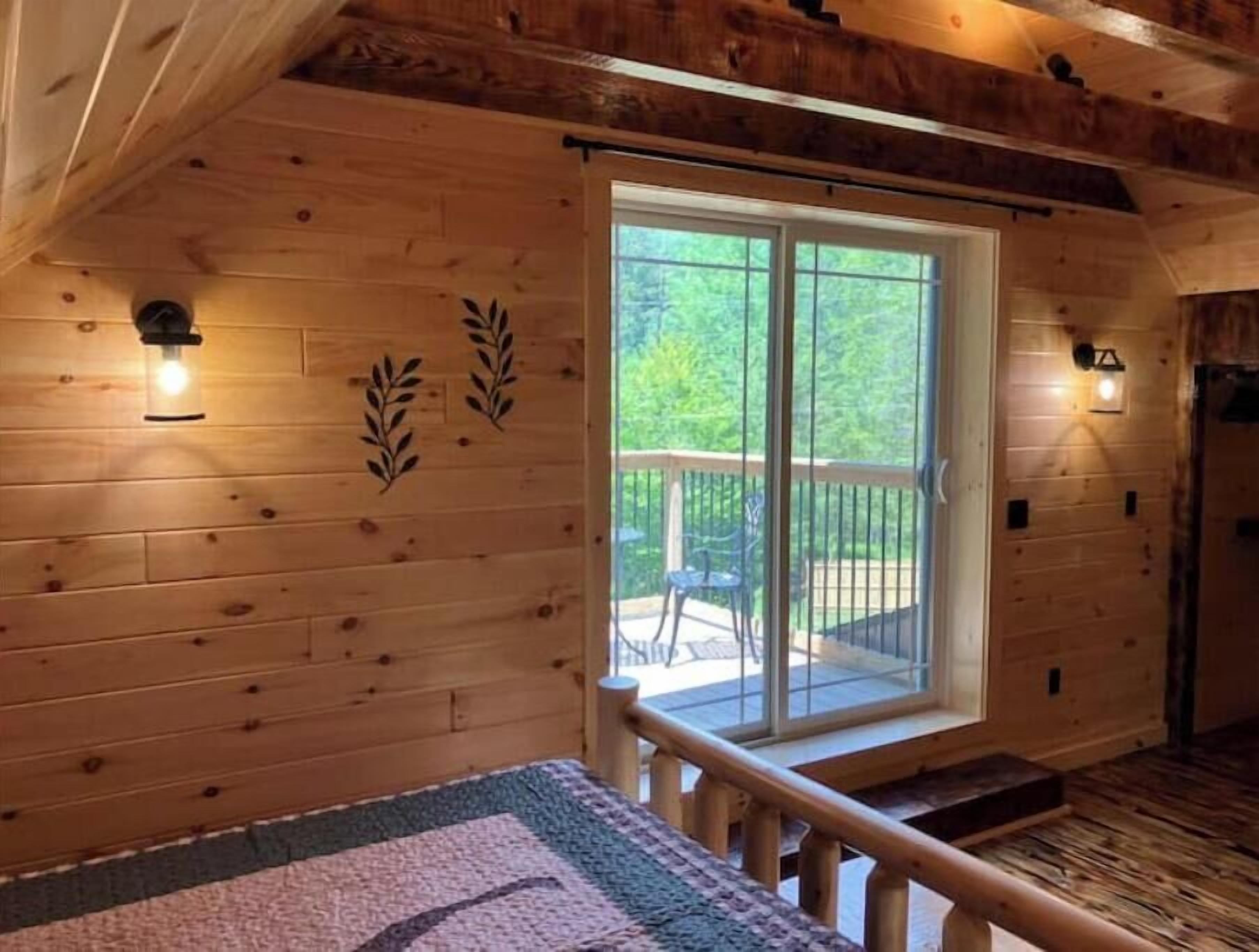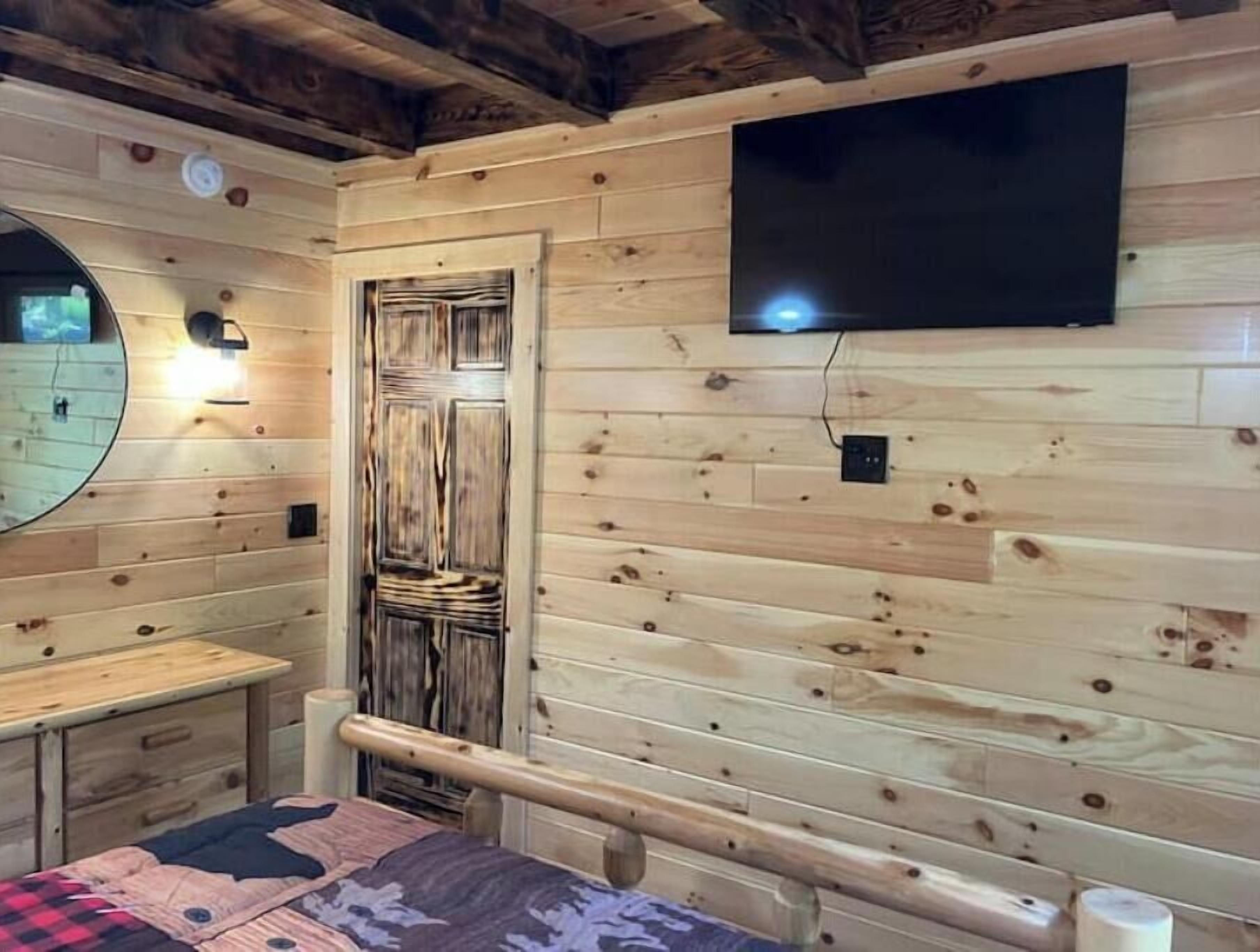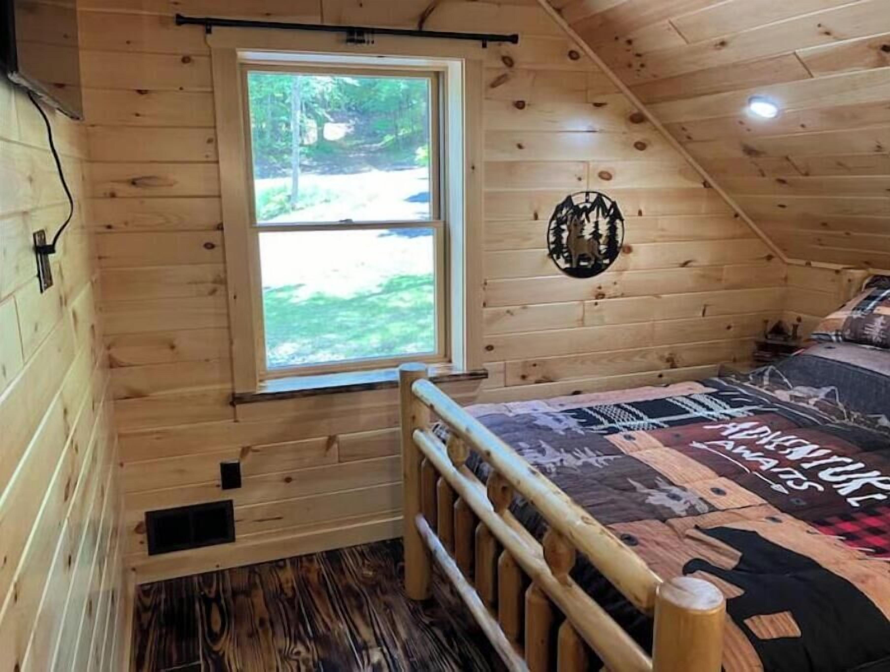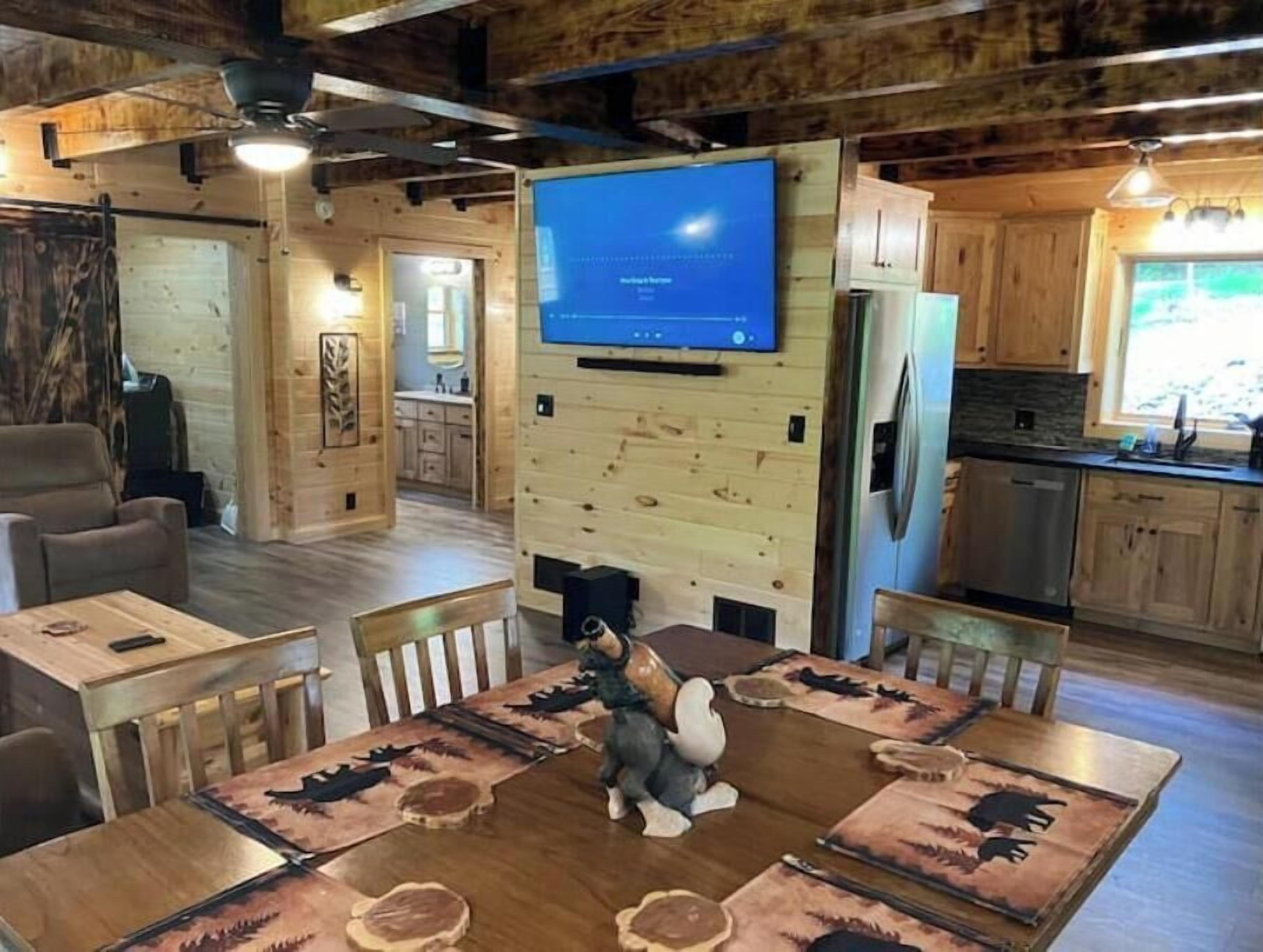 Creekside Cabin with Lake Access , Brand new build !!! About this spaceKick back and relax in this brand new built rustic adirondack themed cabin (spring 2024). Open floor plan with custom beams & knotty pine thoughout. Sleeps 6 with 2 bedrooms & sleeper sofa. 2 full bathrooms , Big screen smart tv's in both bedrooms & livingroom. Stunning hickory kitchen , spacious wrap around porch , outdoor fir...