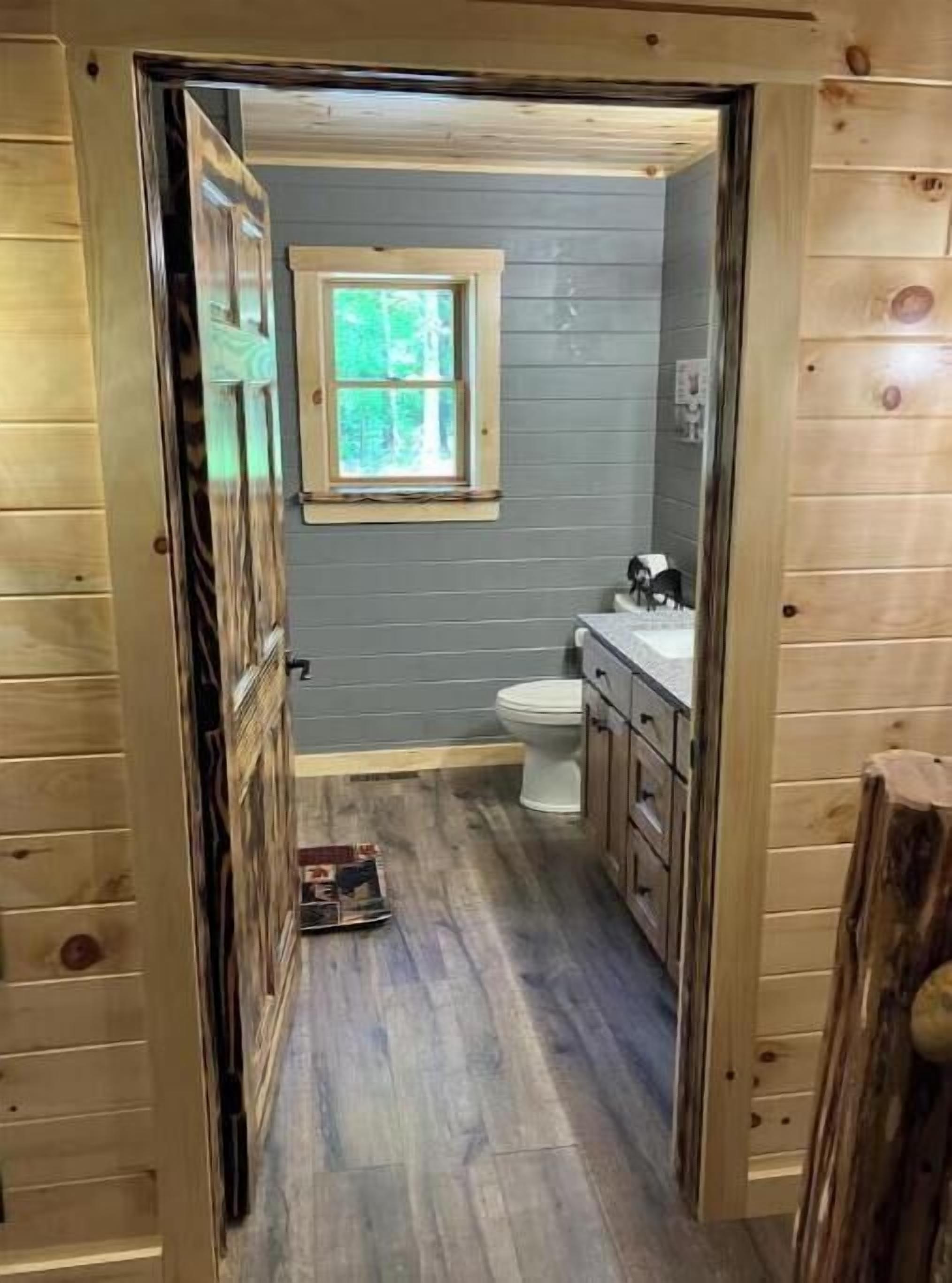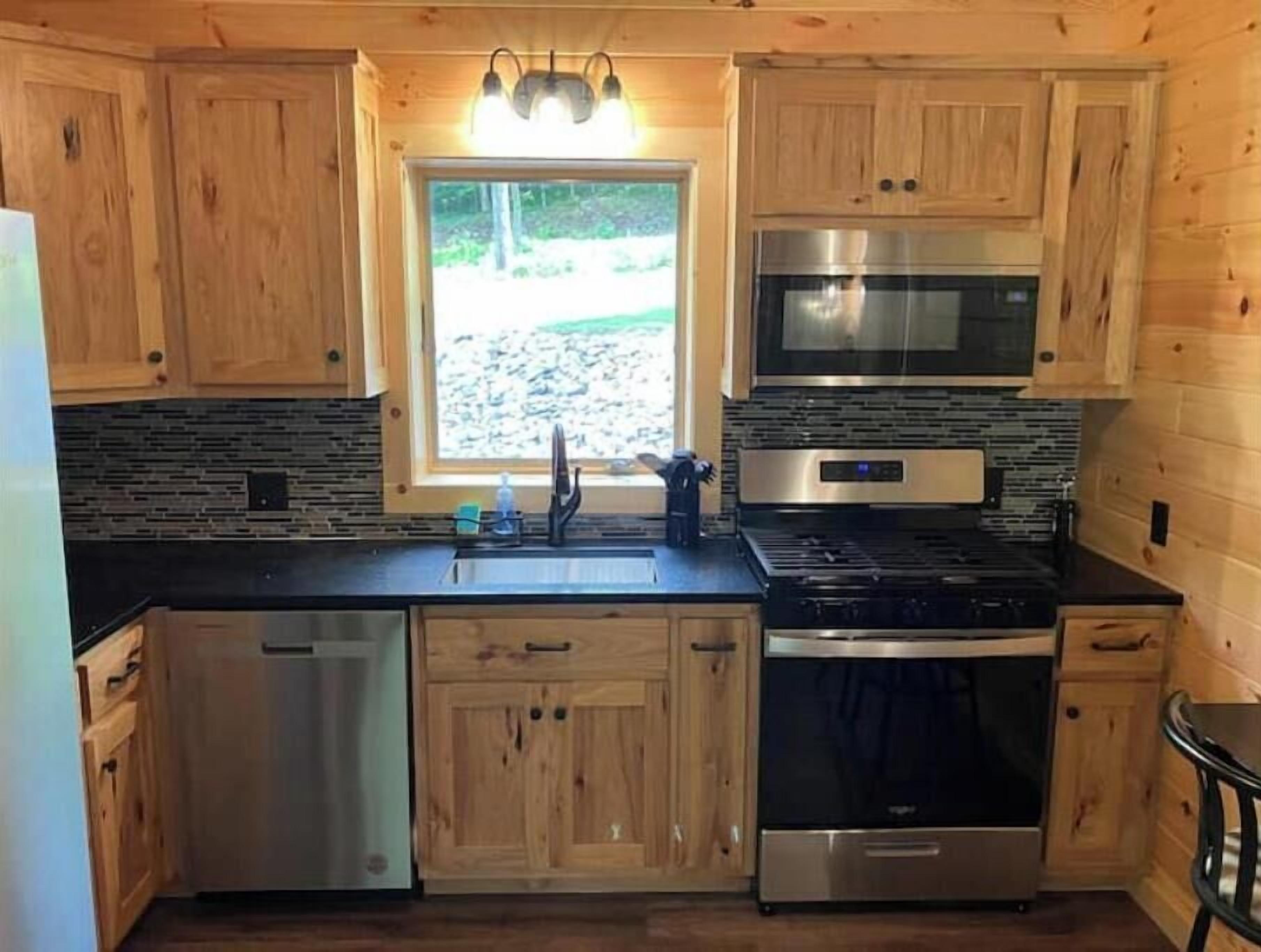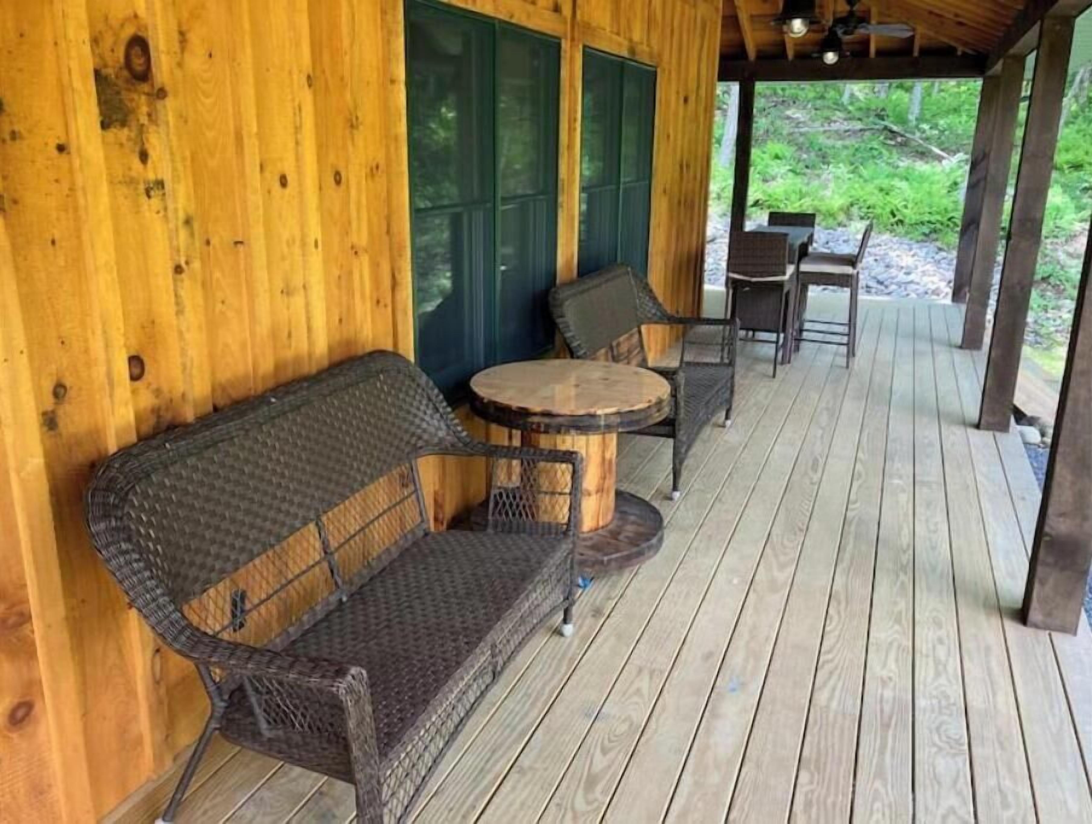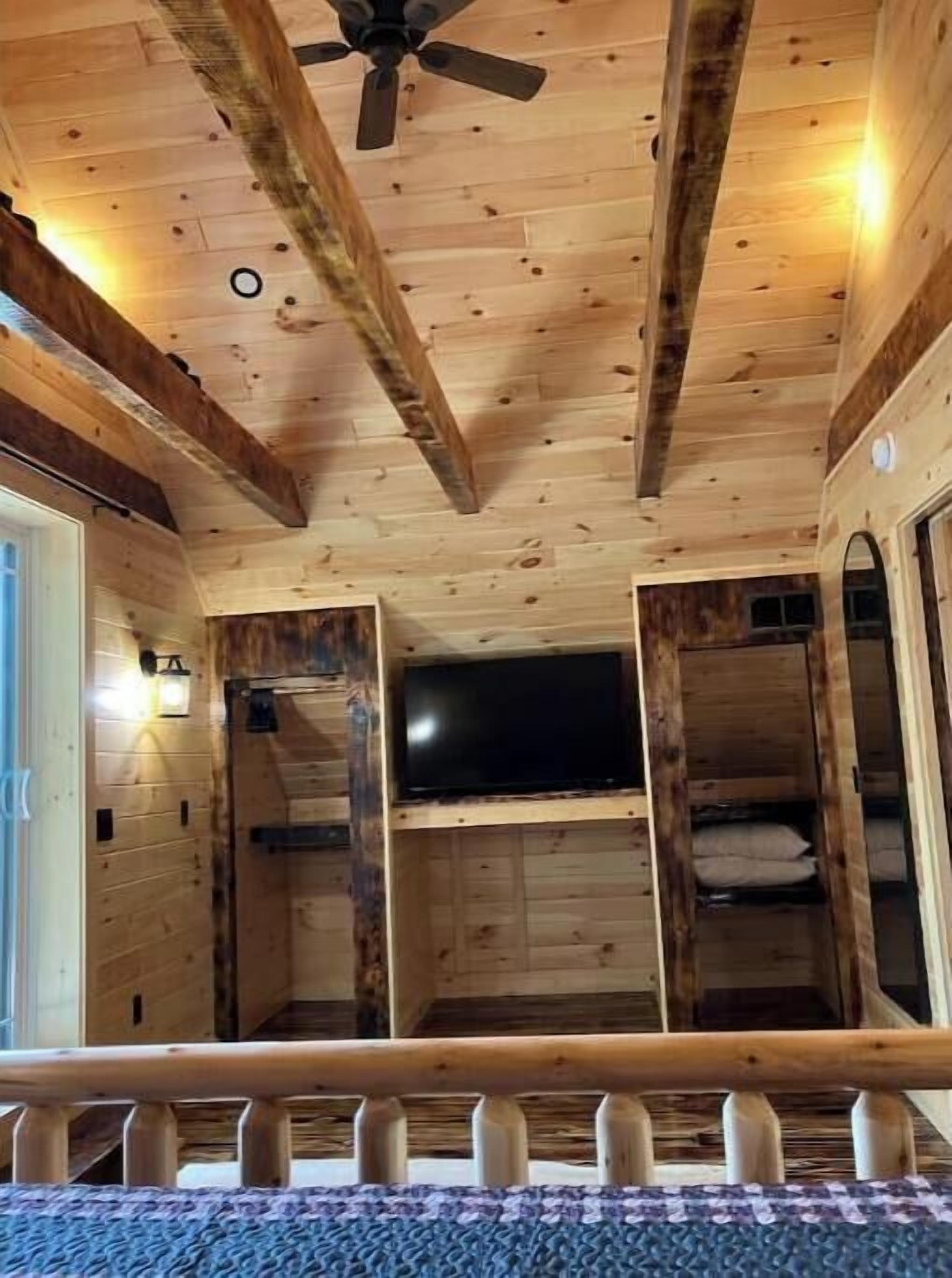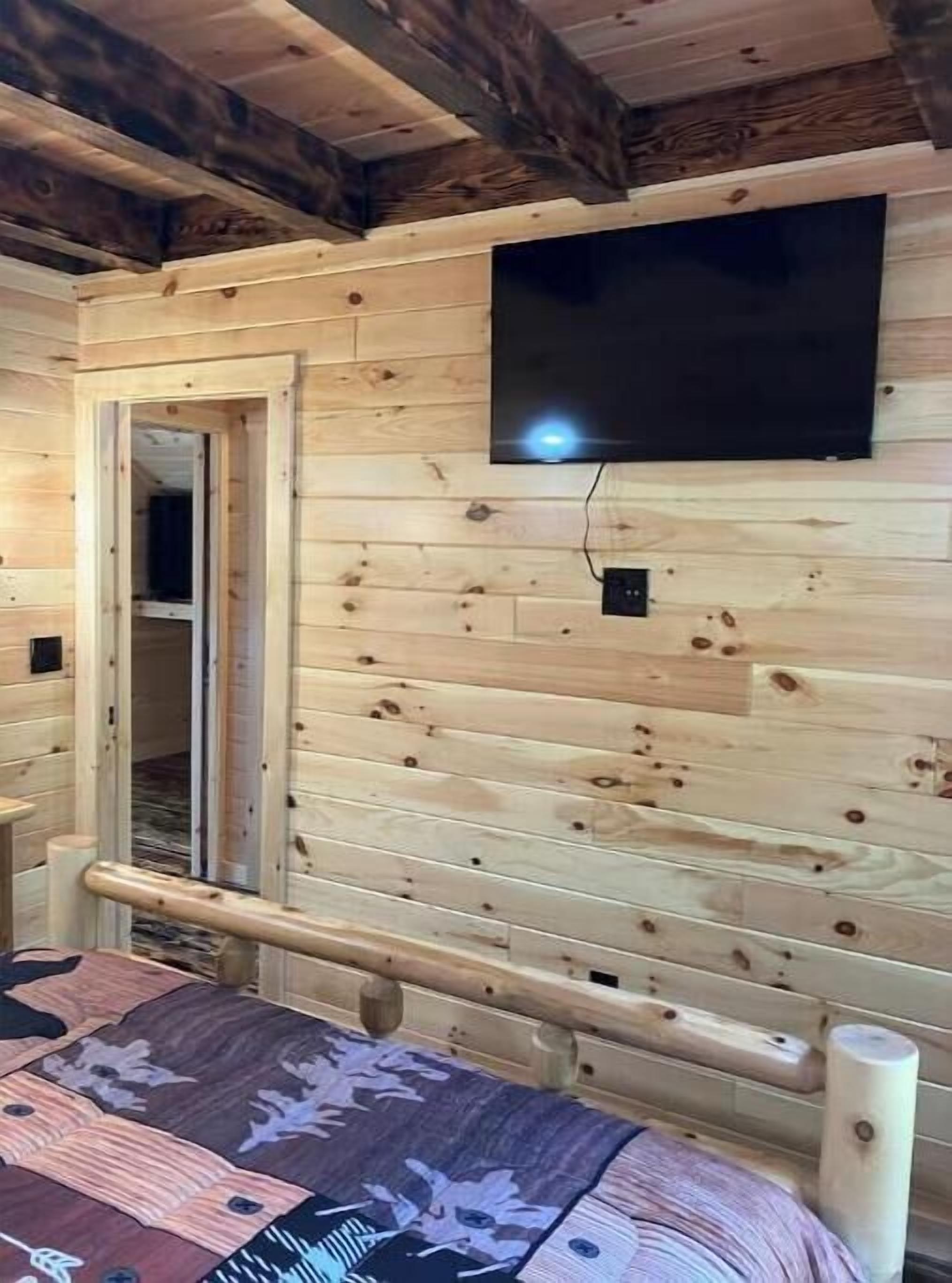 Creekside Cabin with Lake Access , Brand new build !!! About this spaceKick back and relax in this brand new built rustic adirondack themed cabin (spring 2024). Open floor plan with custom beams & knotty pine thoughout. Sleeps 6 with 2 bedrooms & sleeper sofa. 2 full bathrooms , Big screen smart tv's in both bedrooms & livingroom. Stunning hickory kitchen , spacious wrap around porch , outdoor fir...