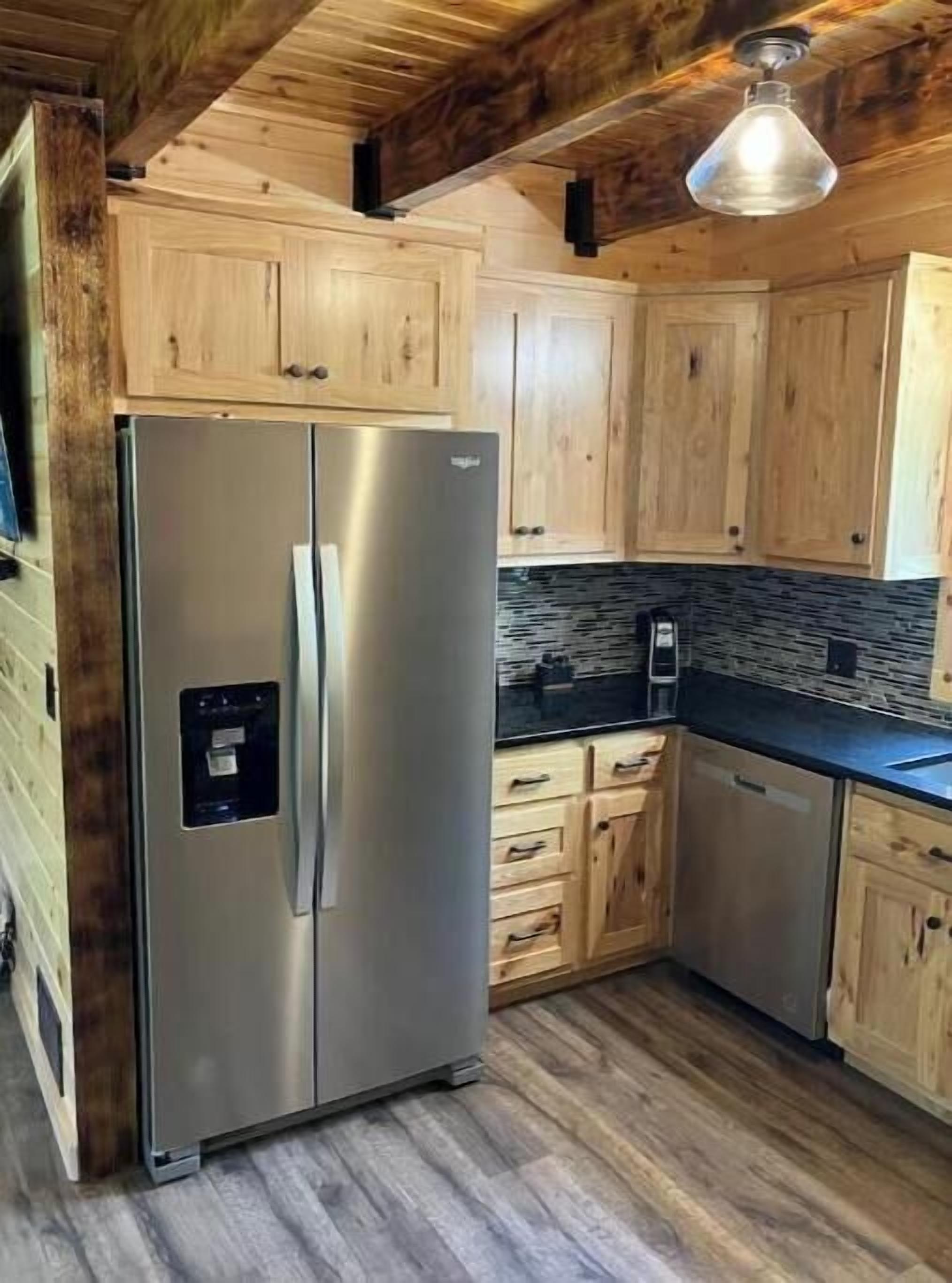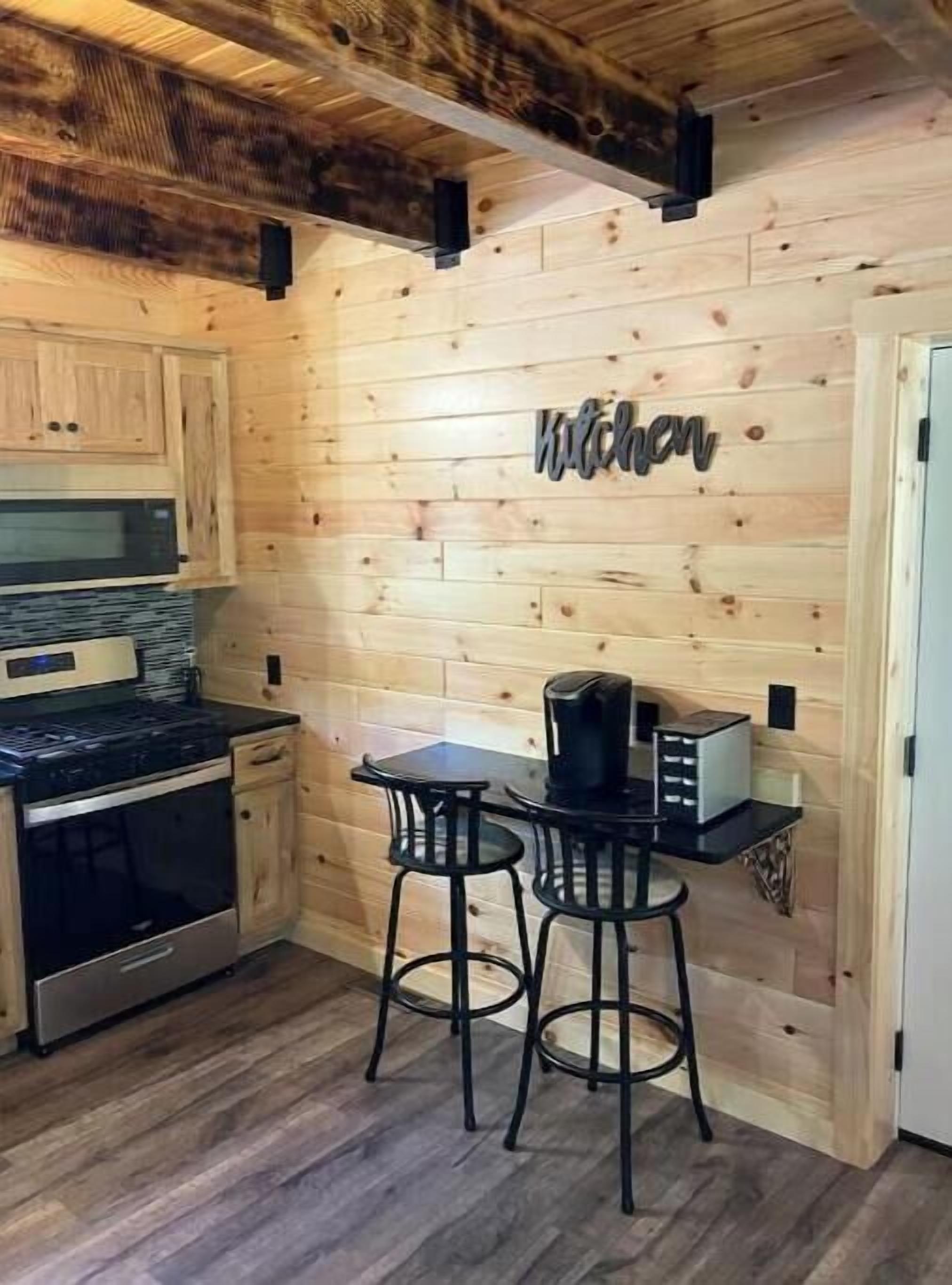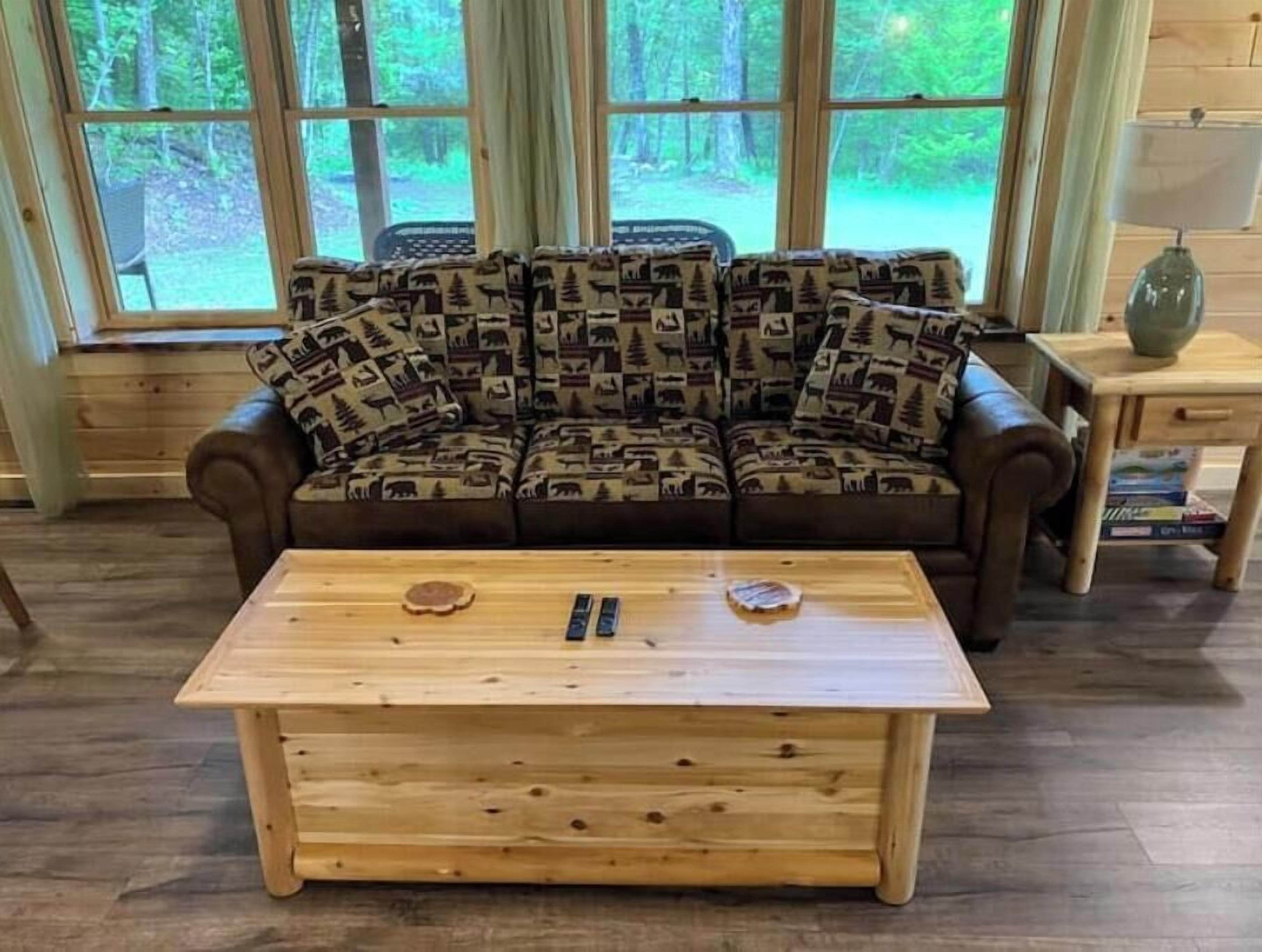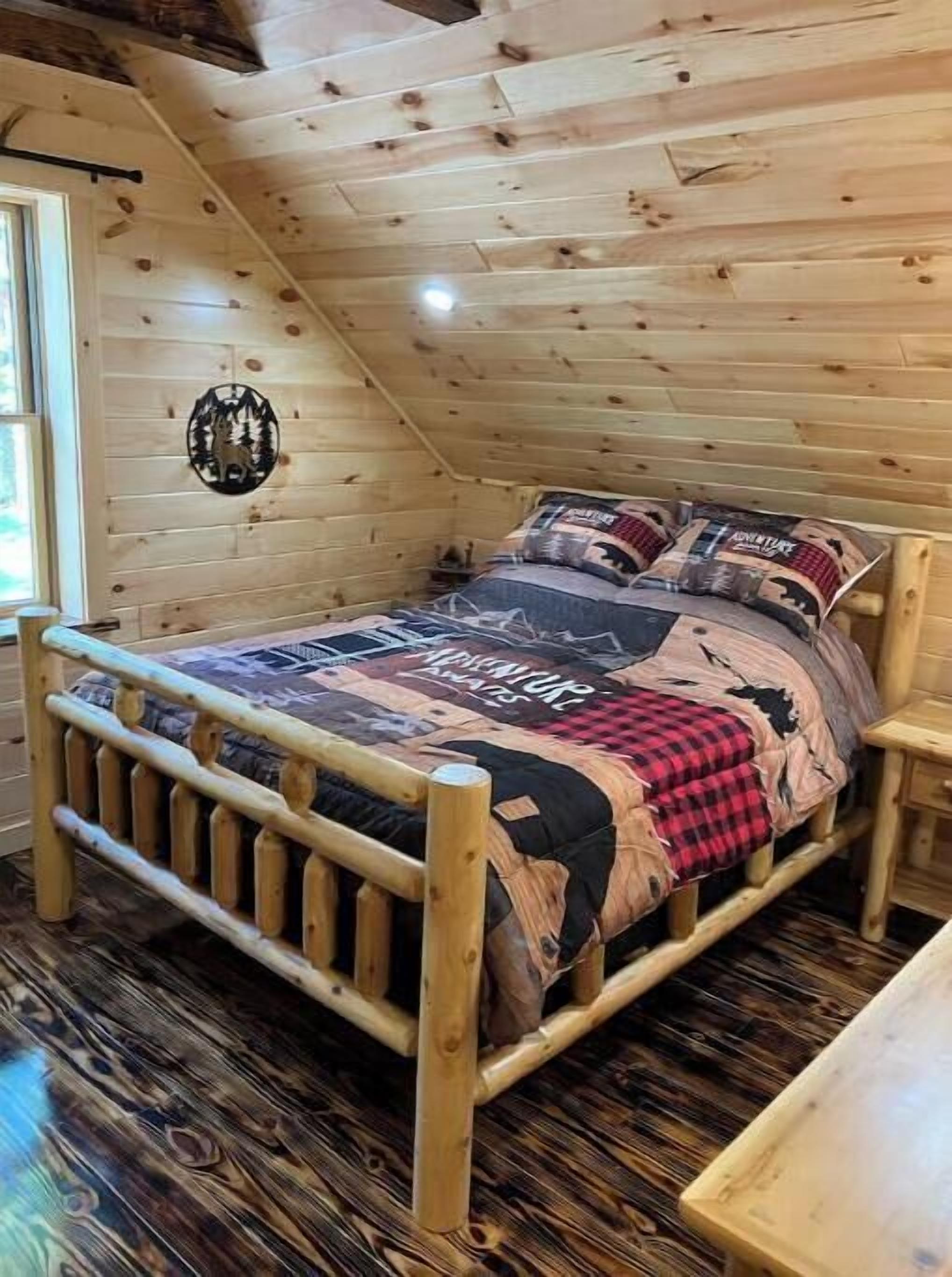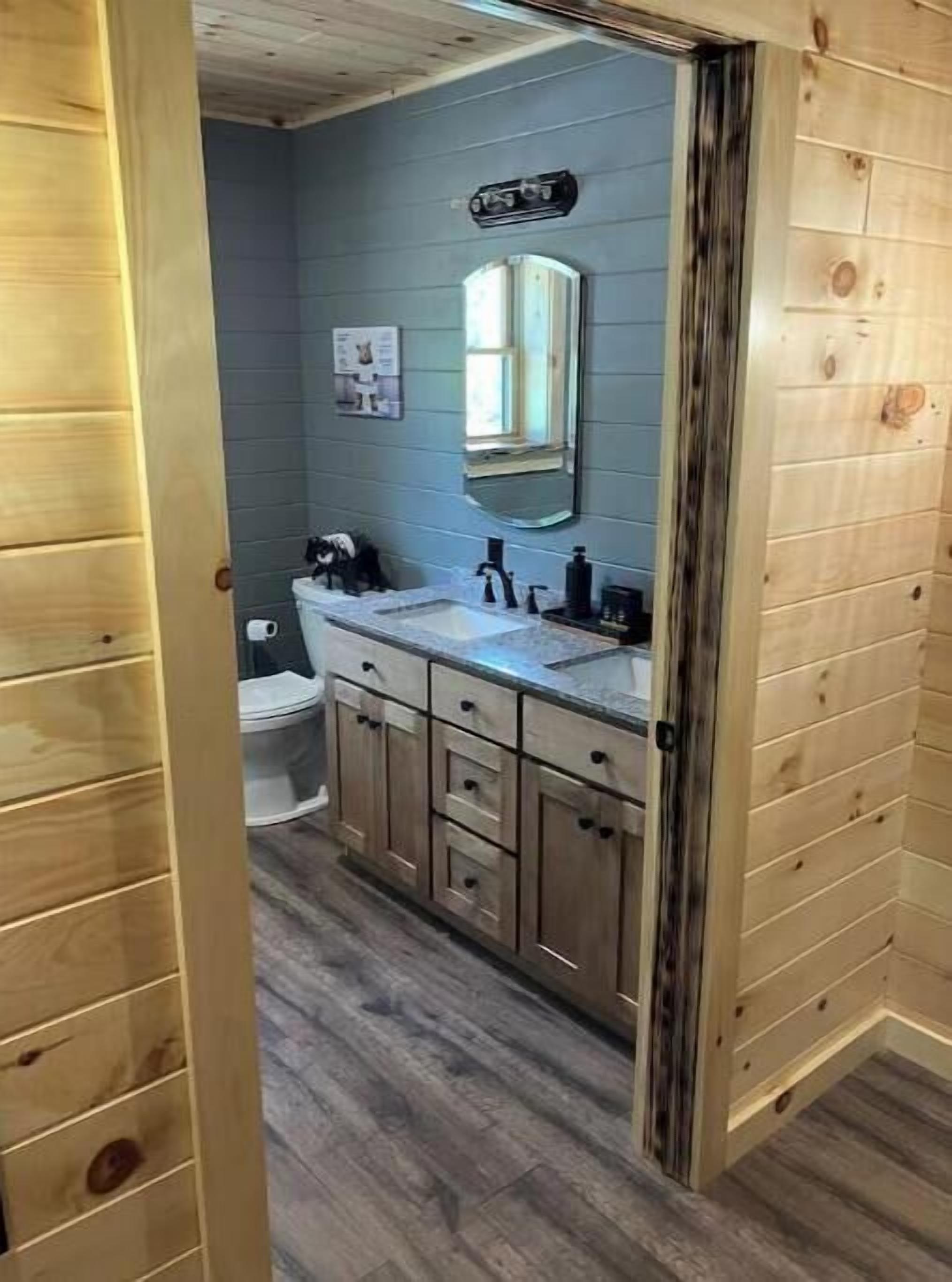 Creekside Cabin with Lake Access , Brand new build !!! About this spaceKick back and relax in this brand new built rustic adirondack themed cabin (spring 2024). Open floor plan with custom beams & knotty pine thoughout. Sleeps 6 with 2 bedrooms & sleeper sofa. 2 full bathrooms , Big screen smart tv's in both bedrooms & livingroom. Stunning hickory kitchen , spacious wrap around porch , outdoor fir...