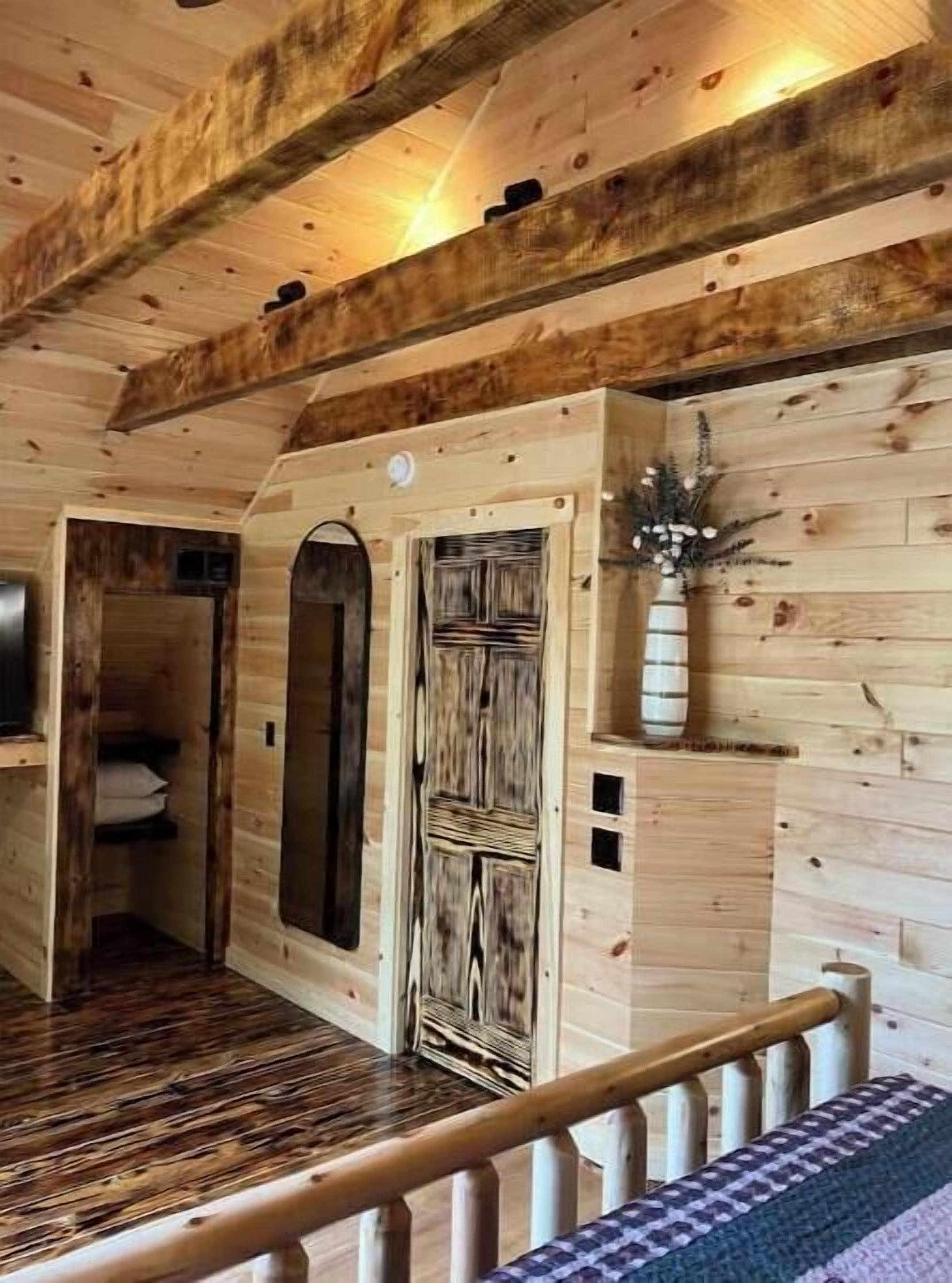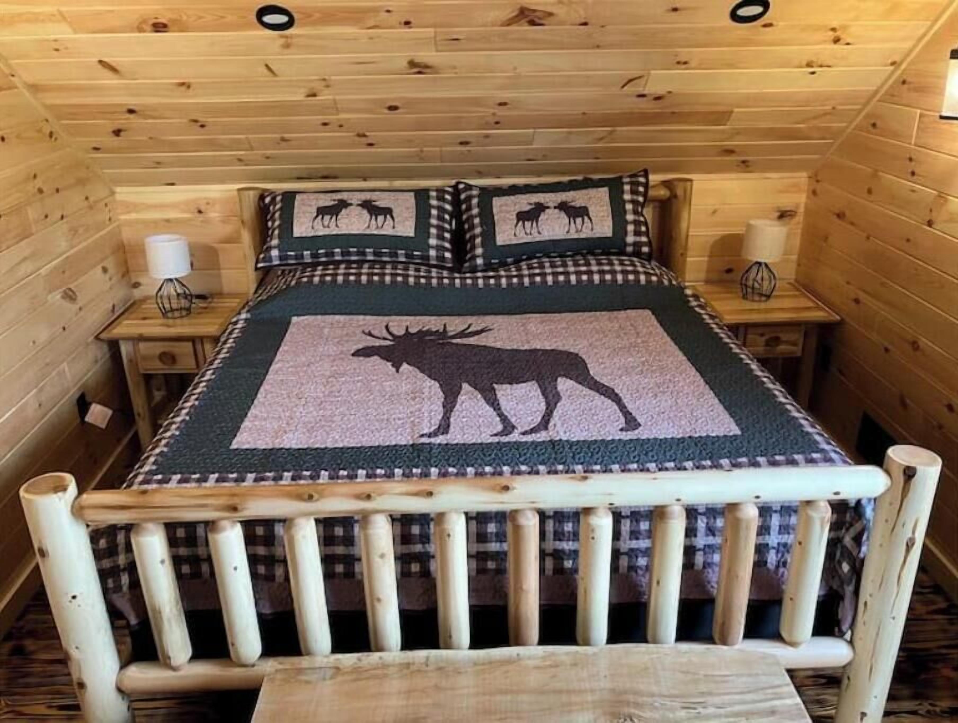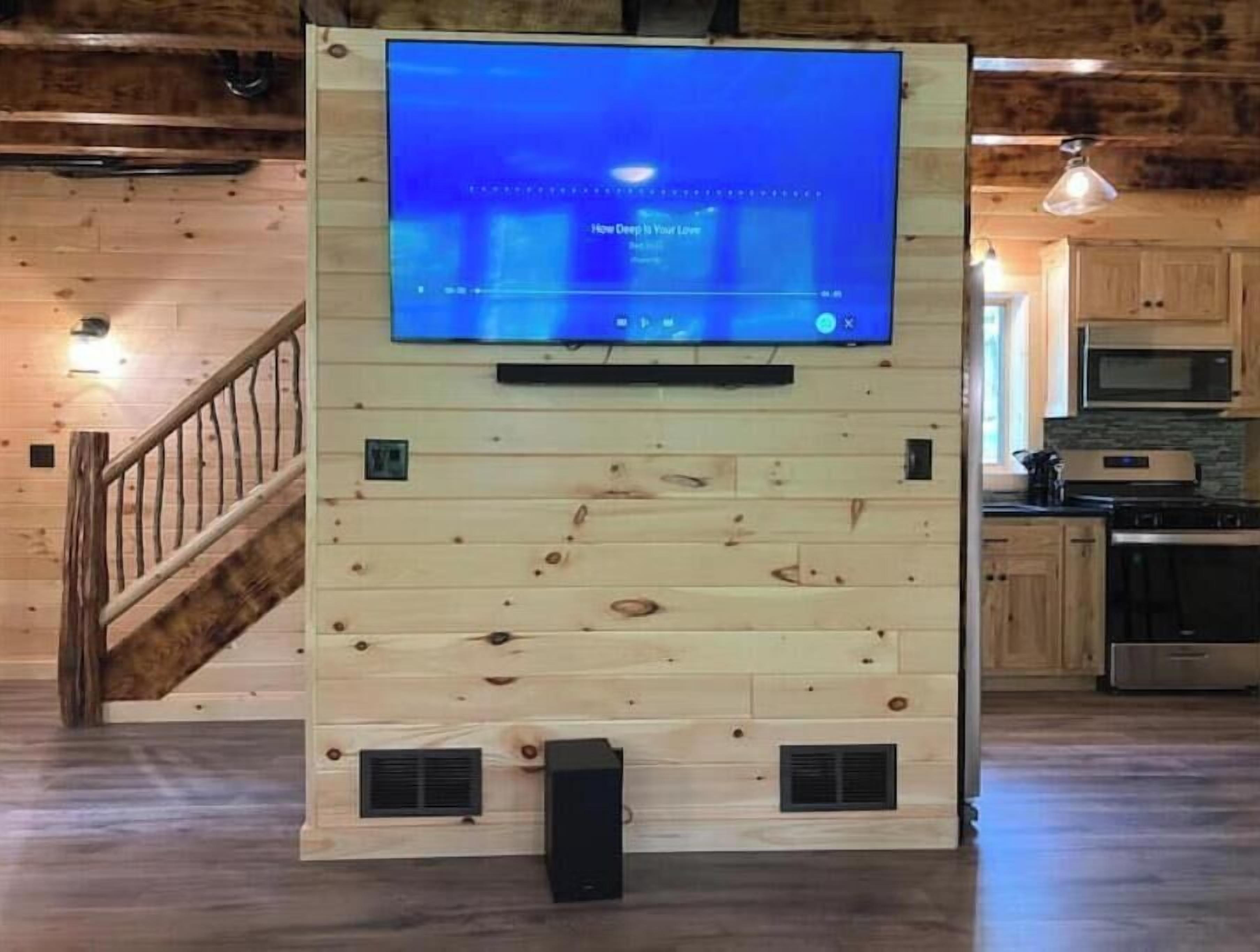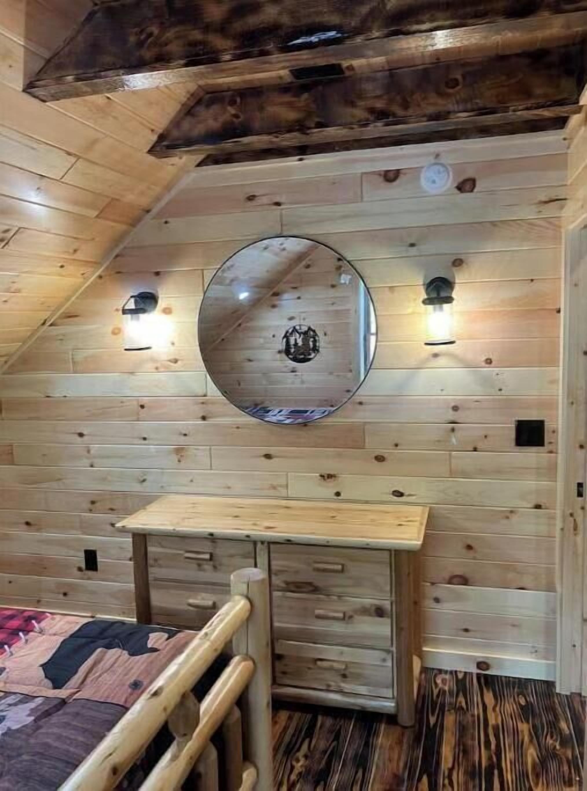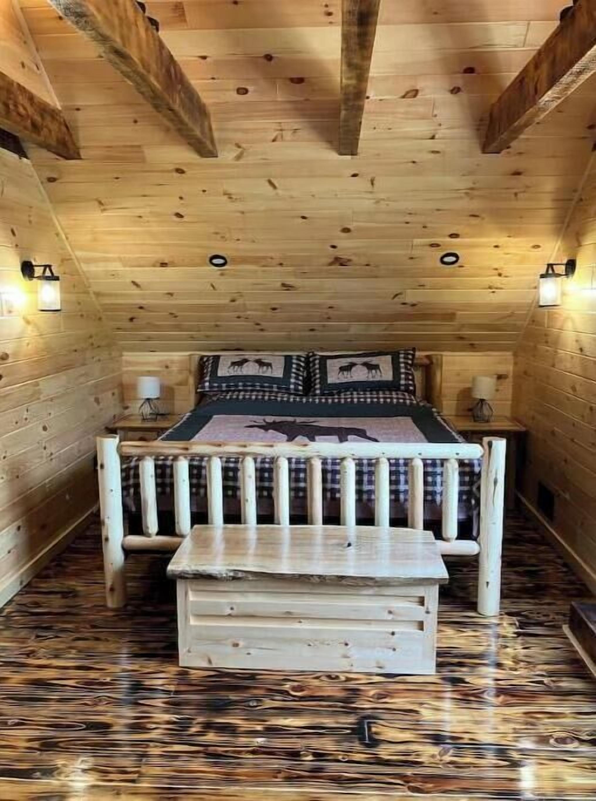 Creekside Cabin with Lake Access , Brand new build !!! About this spaceKick back and relax in this brand new built rustic adirondack themed cabin (spring 2024). Open floor plan with custom beams & knotty pine thoughout. Sleeps 6 with 2 bedrooms & sleeper sofa. 2 full bathrooms , Big screen smart tv's in both bedrooms & livingroom. Stunning hickory kitchen , spacious wrap around porch , outdoor fir...