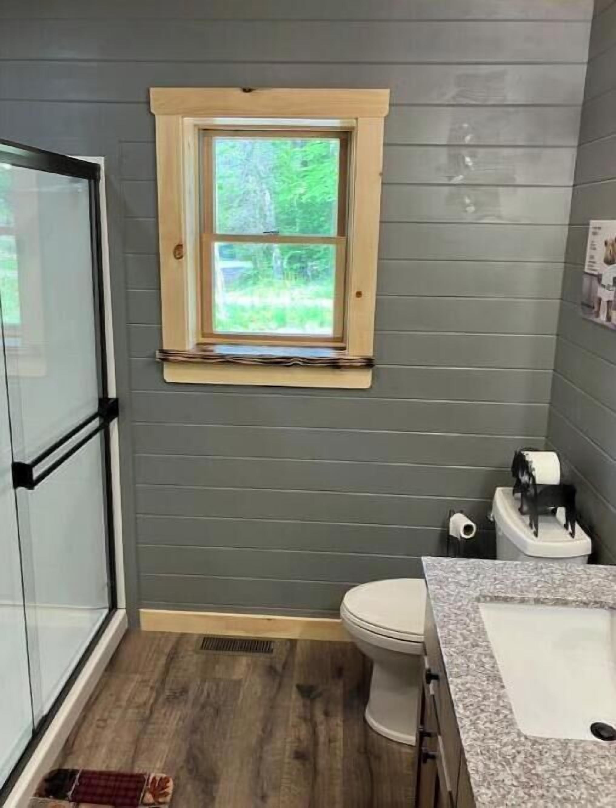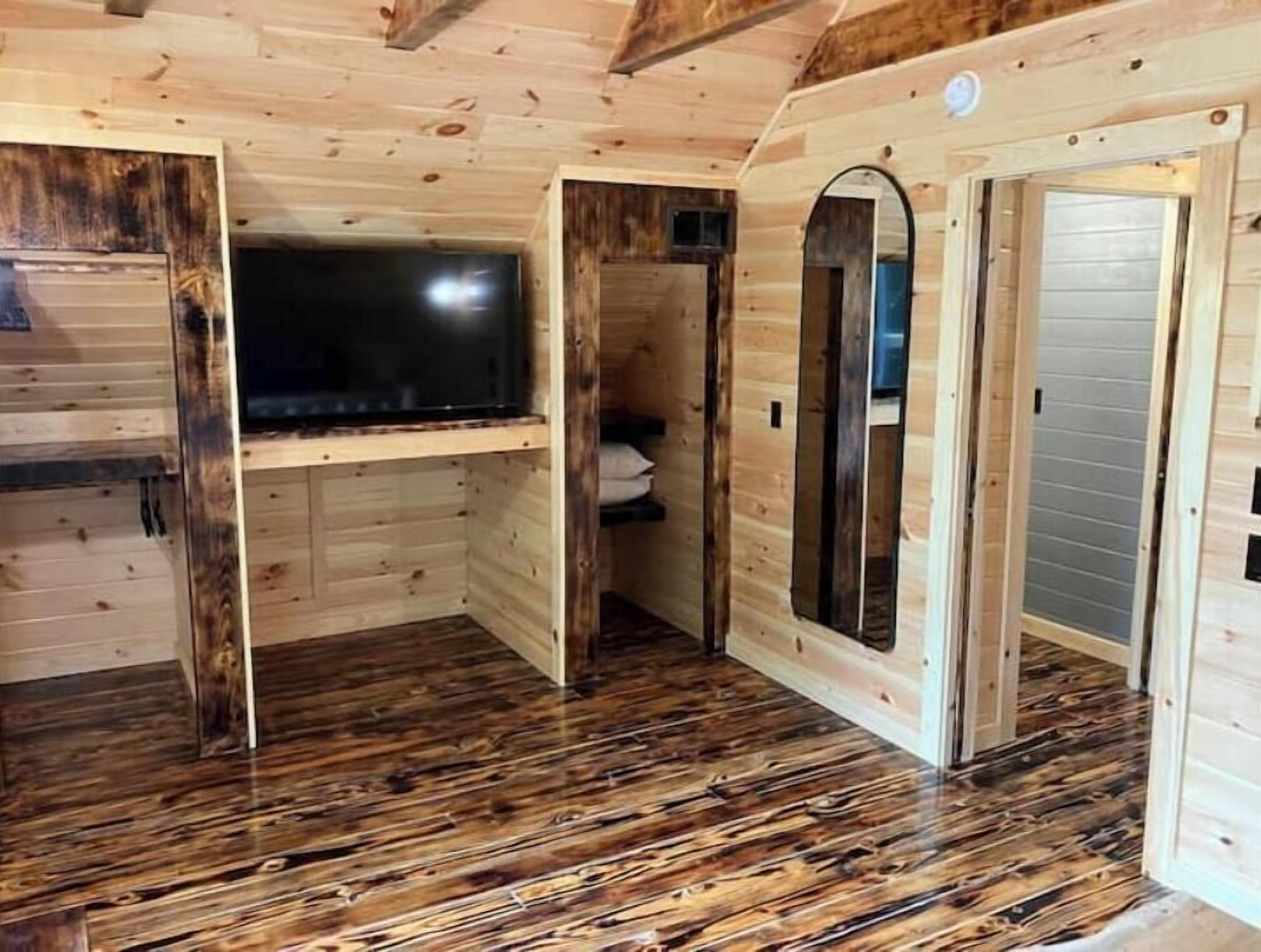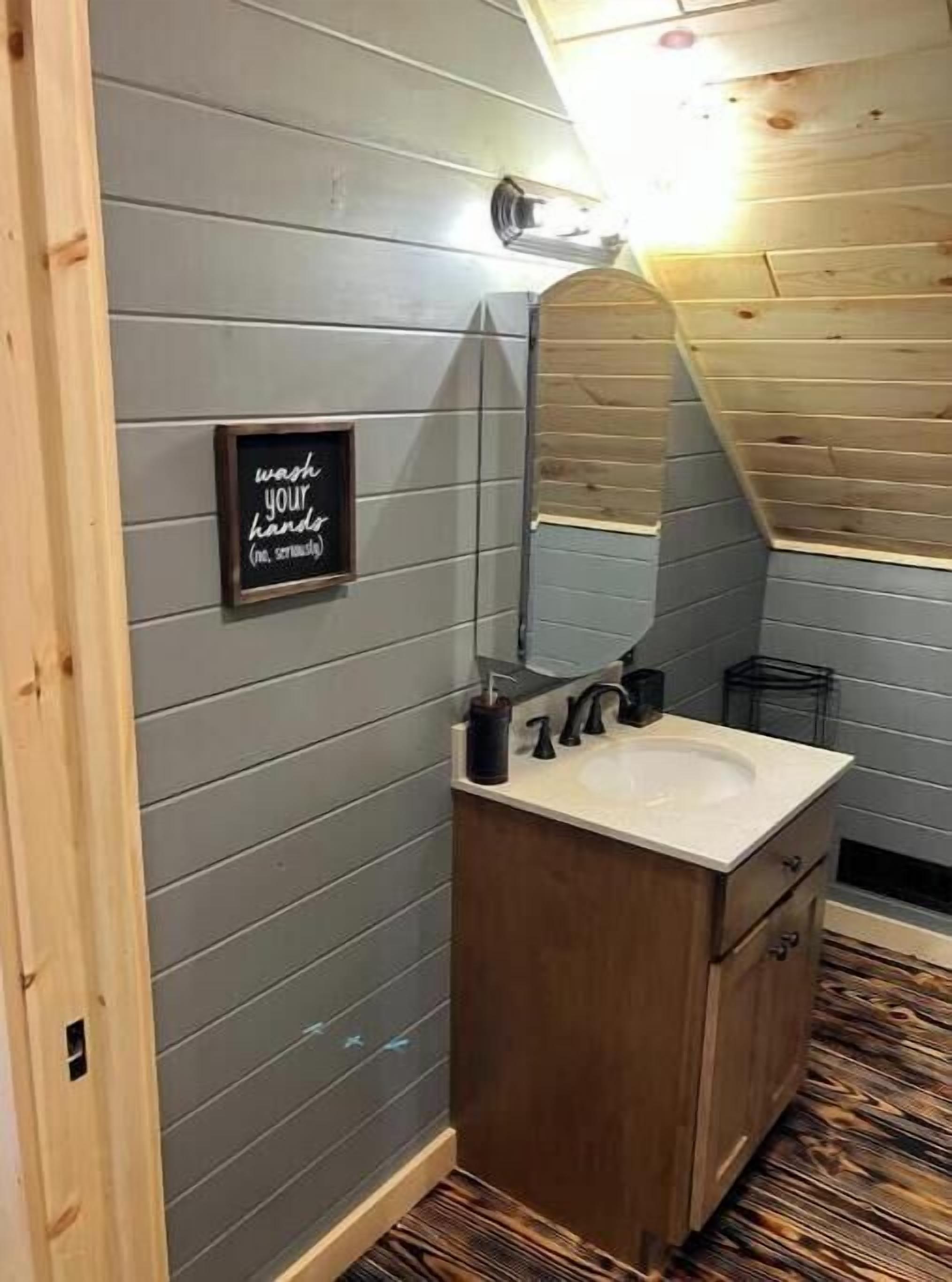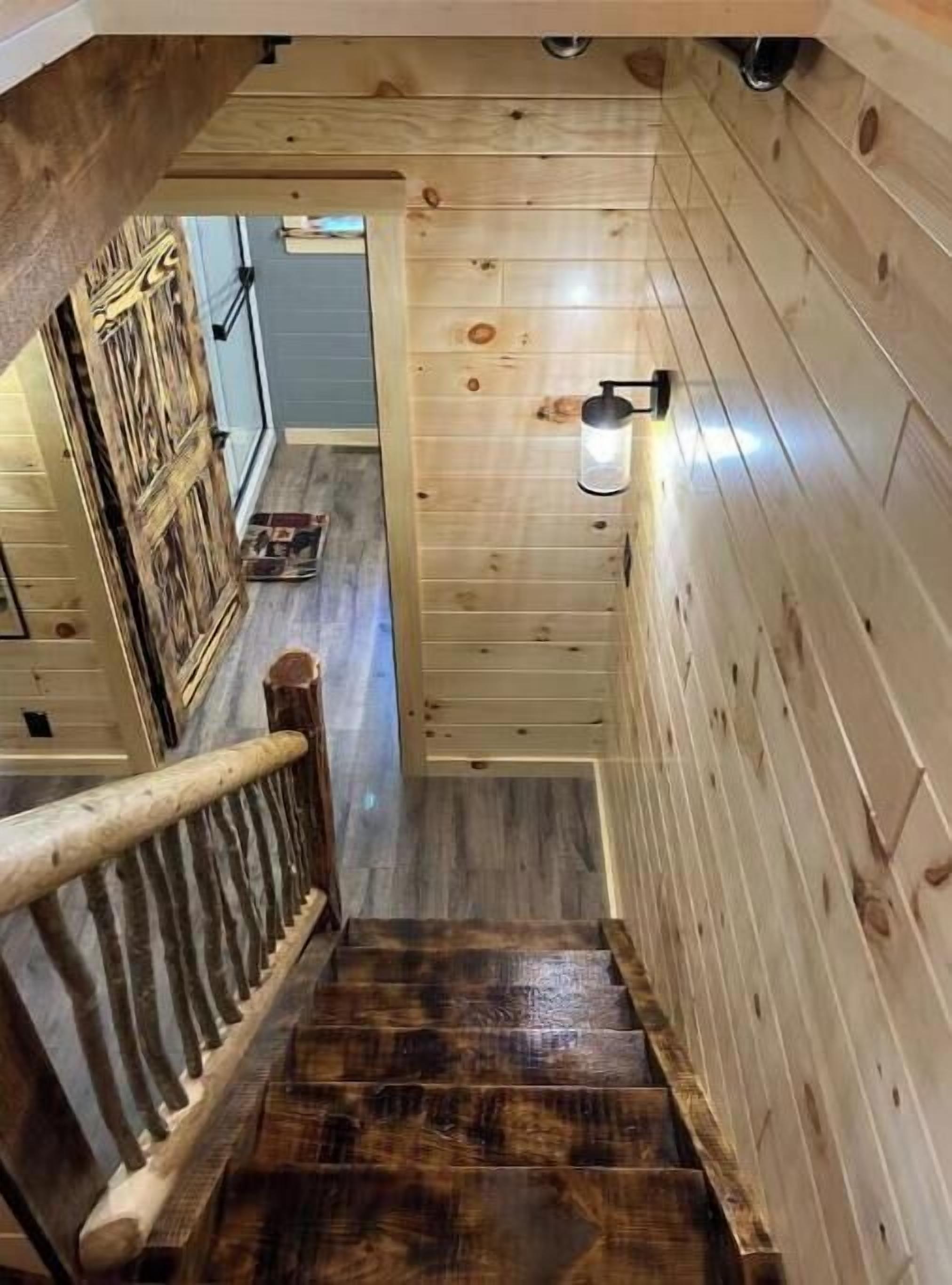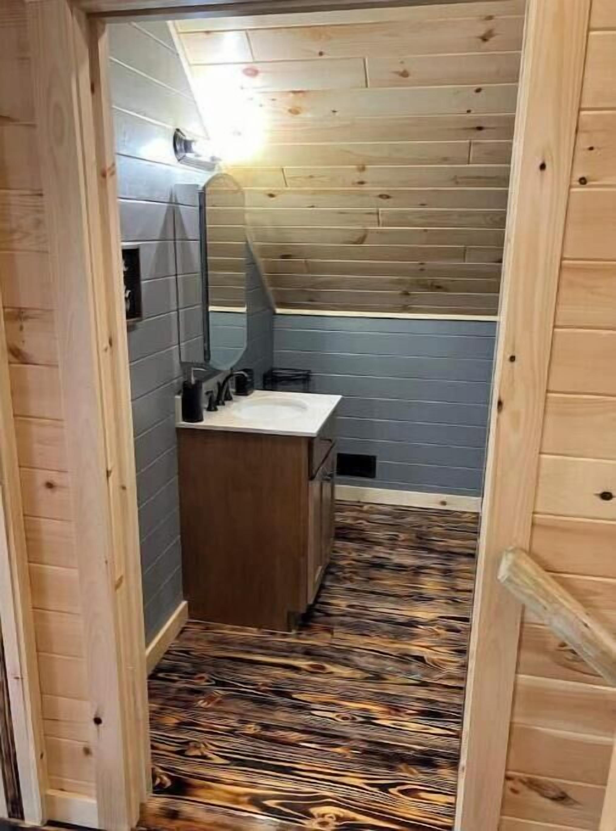 Creekside Cabin with Lake Access , Brand new build !!! About this spaceKick back and relax in this brand new built rustic adirondack themed cabin (spring 2024). Open floor plan with custom beams & knotty pine thoughout. Sleeps 6 with 2 bedrooms & sleeper sofa. 2 full bathrooms , Big screen smart tv's in both bedrooms & livingroom. Stunning hickory kitchen , spacious wrap around porch , outdoor fir...