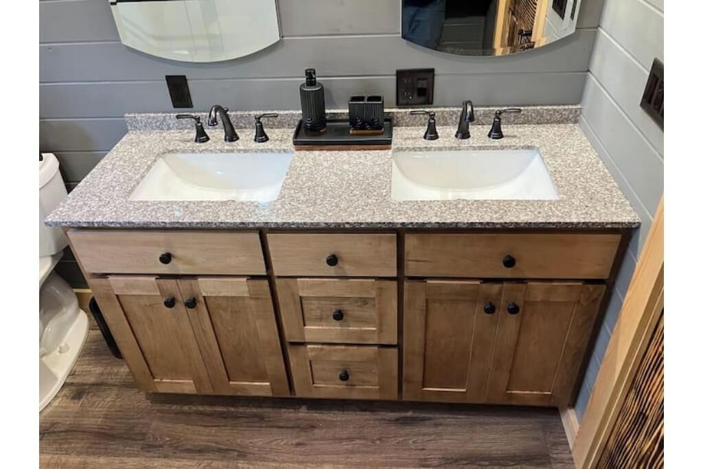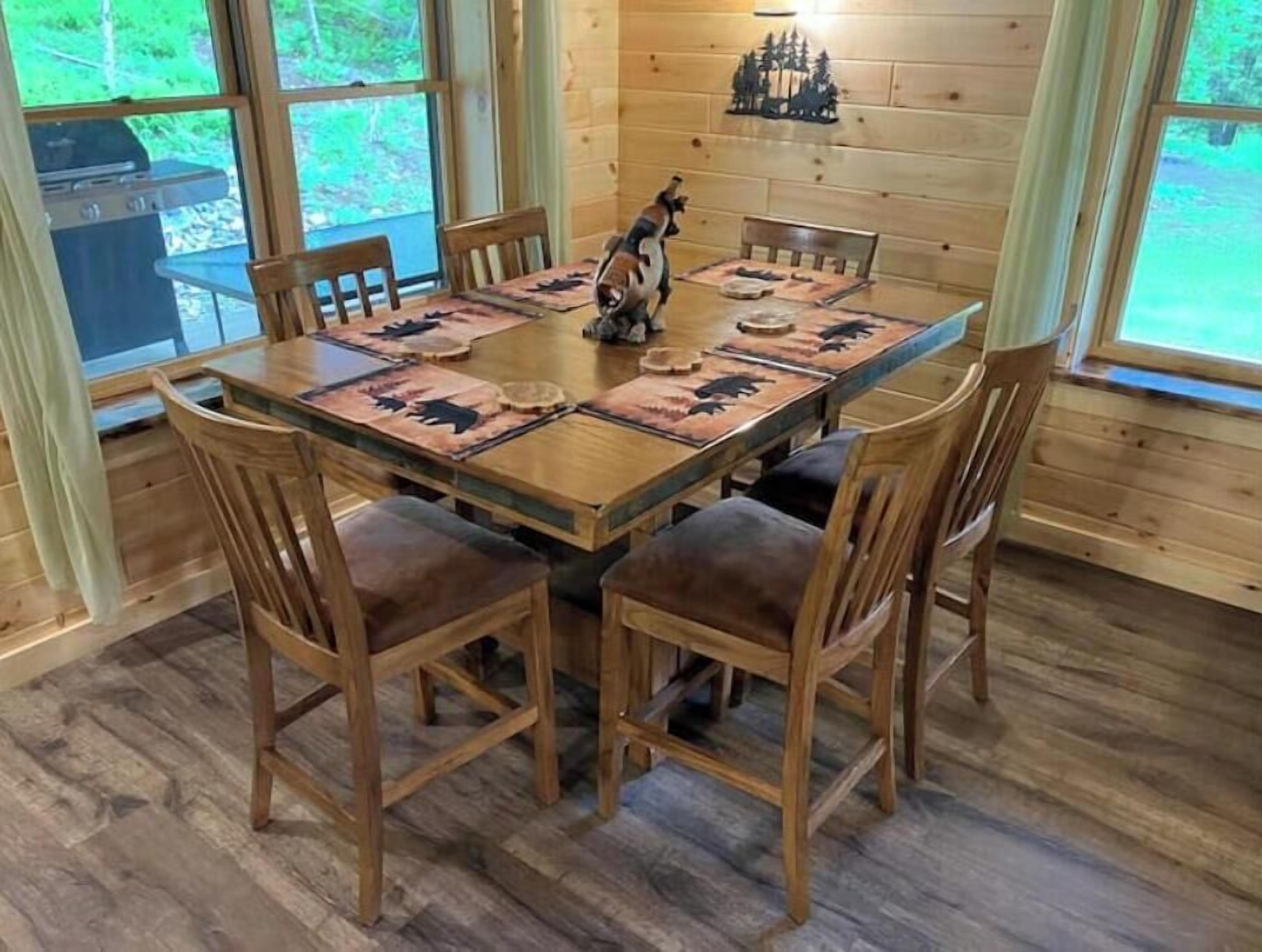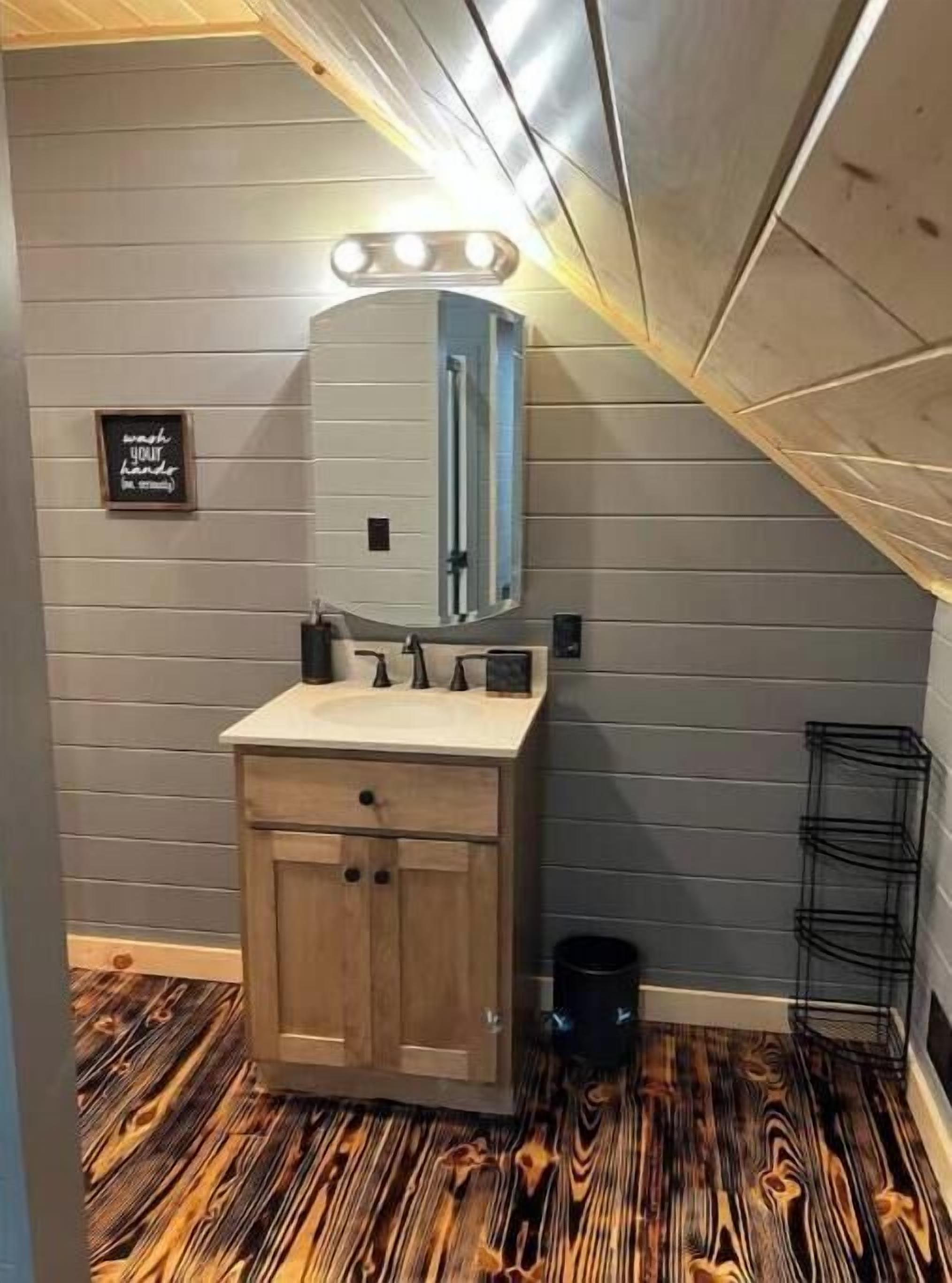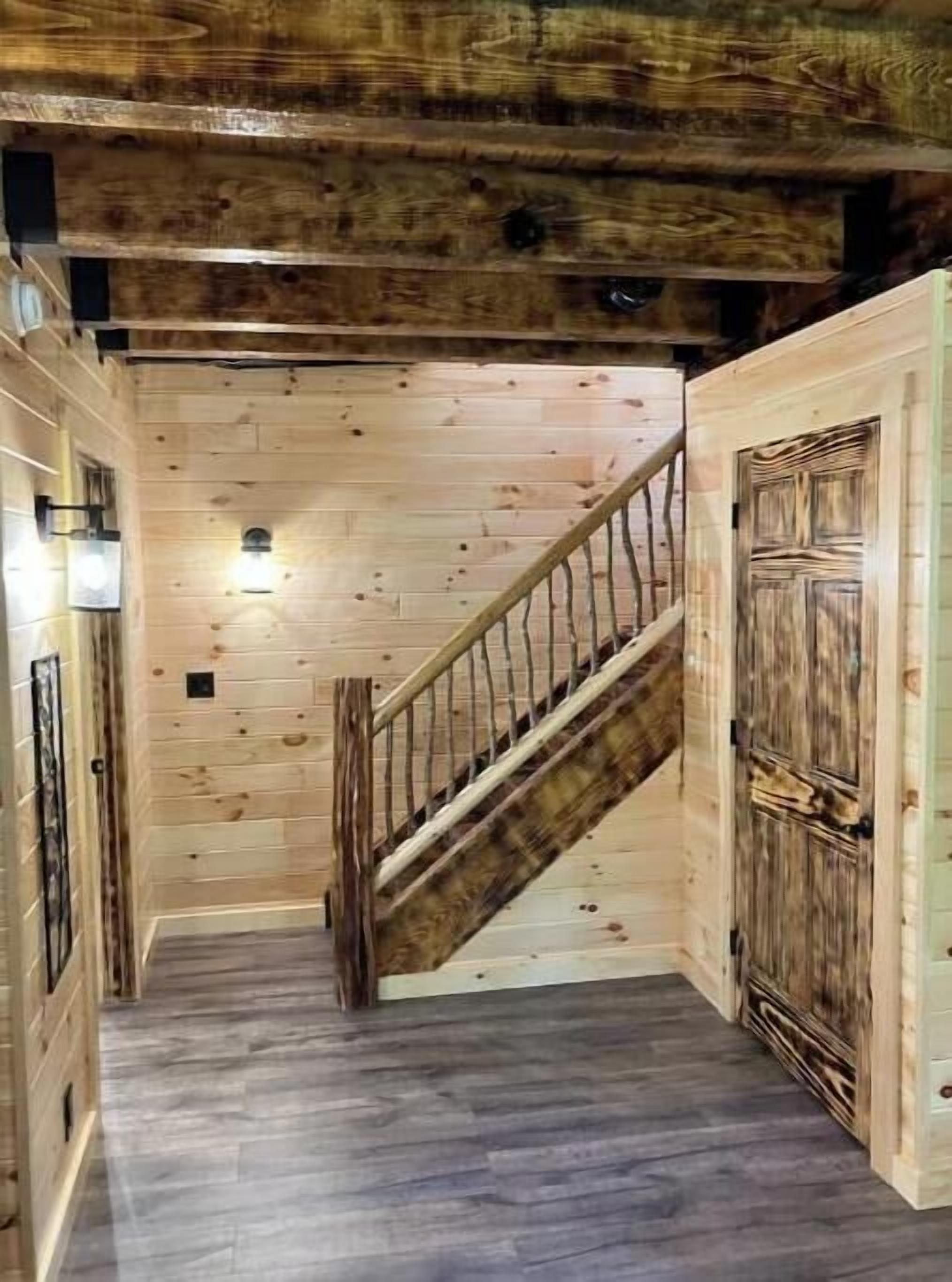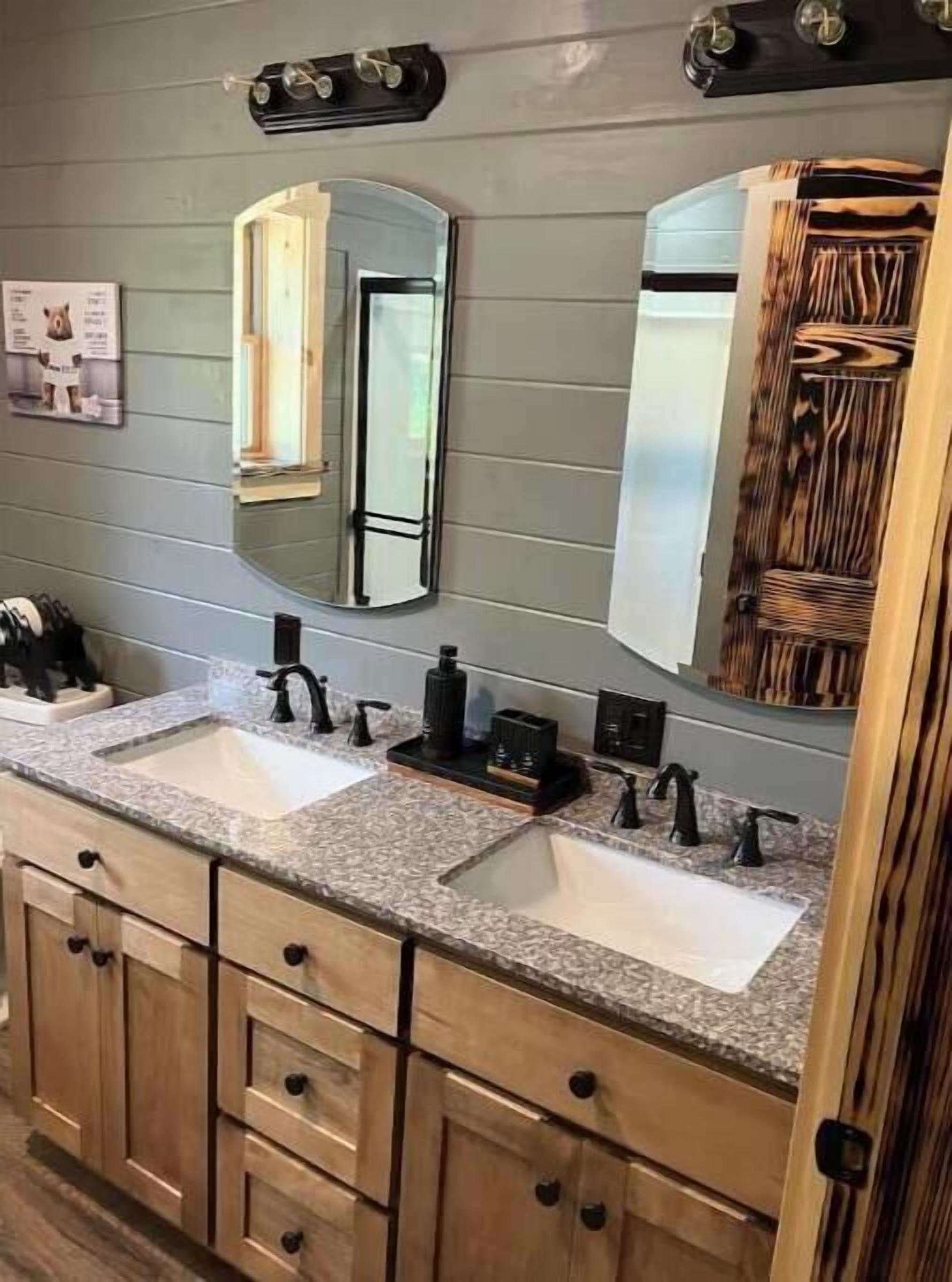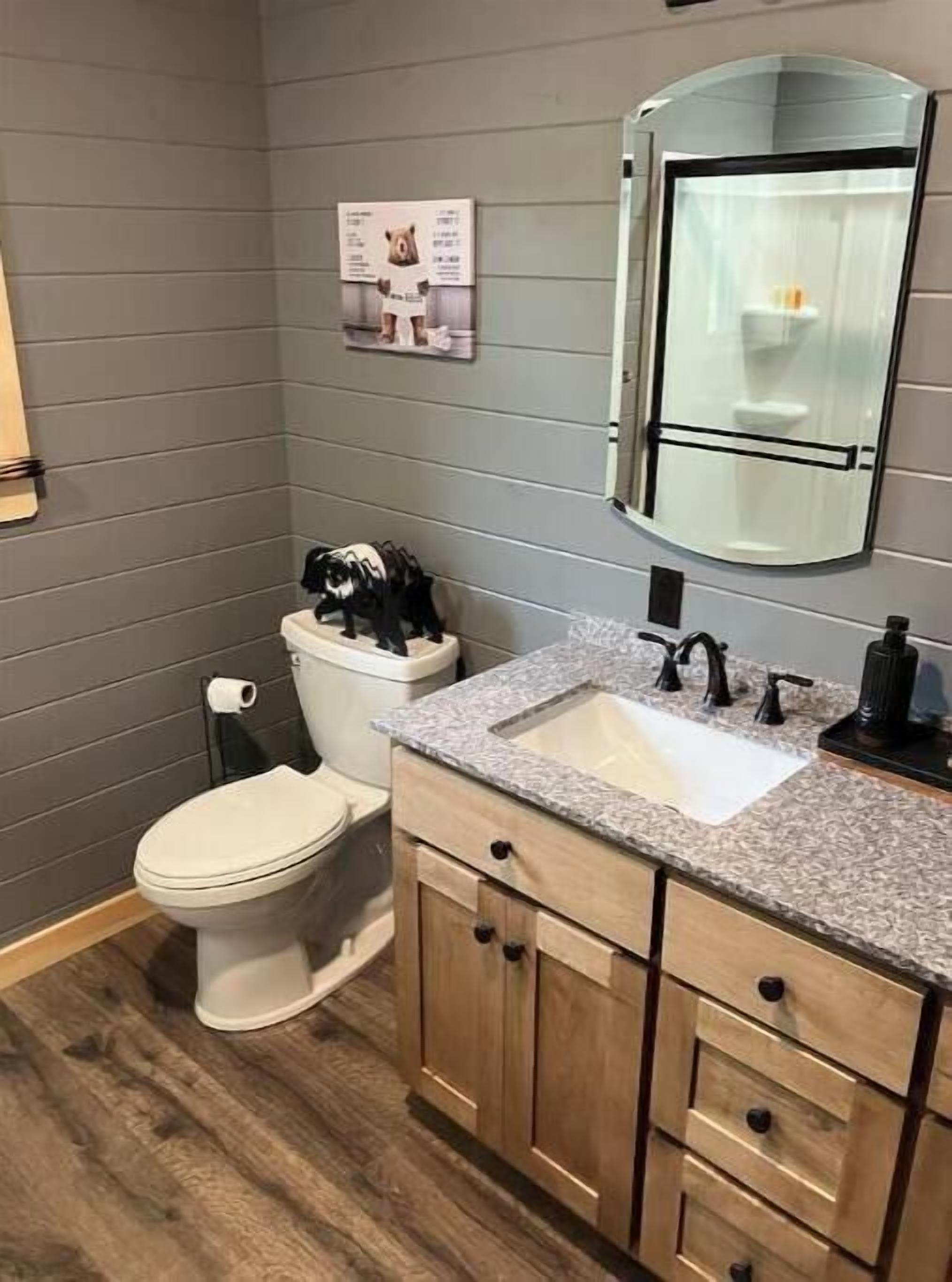 Creekside Cabin with Lake Access , Brand new build !!! About this spaceKick back and relax in this brand new built rustic adirondack themed cabin (spring 2024). Open floor plan with custom beams & knotty pine thoughout. Sleeps 6 with 2 bedrooms & sleeper sofa. 2 full bathrooms , Big screen smart tv's in both bedrooms & livingroom. Stunning hickory kitchen , spacious wrap around porch , outdoor fir...