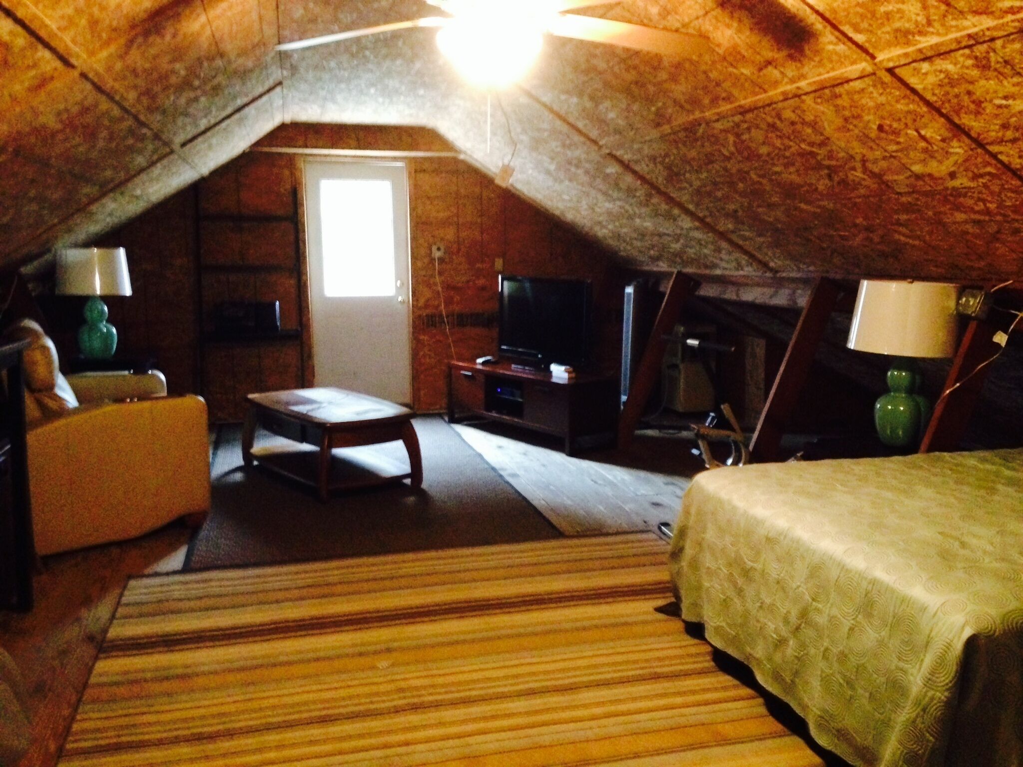 Rustic Cozy Loft Cabin Open loft space converted to a rustic loft apartment with a cabin feel! A double bed, two twin beds, TV, Internet, Wifi, sitting area, desk and private shower. Shared half bath with a meeting space named the "Rustic Room" that has a mini kitchen area. Stairs with two balconies. Dogs onsite often being trained on the 40 acres.More than 2 people will result in additional charges. Please inquire.If you need a bigger space please inquire as we have some short term rental spaces NOT listed due to security reasons!No smoking. Dogs with prior permission. This is a rustic space located on 40 acres. Sheets and towels provided. Very unique, cozy and private. All rules and guidelines for Camp Claircrest.