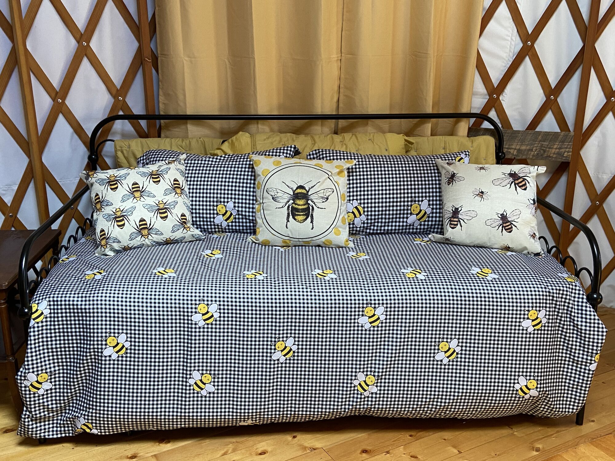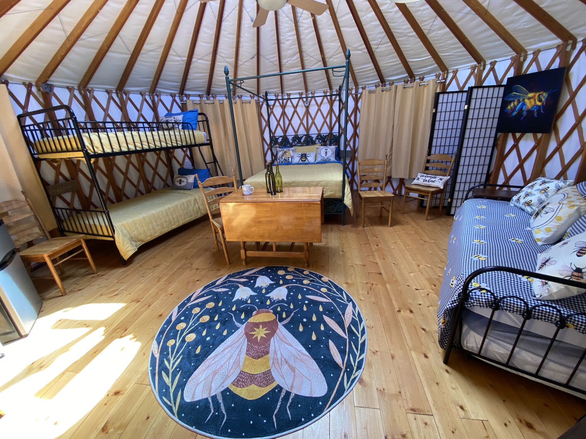 A Unique Glamping Experience in Up-State New York If you love being under canvas and having all the comforts of a hotel room, then our Yurt tents are for you. Luxuriously equipped they are the ultimate under canvas experience. We provide everything for a cosy stay, just bring the food and wine and let your adventure begin. Enjoy fully equipped great outdoors glamping accommodation at Andelyn Farm.Honey Bee yurt is the smallest of our Yurts and comfortably accommodates up to 6 Adults and/or Children. Perfect for a couple or small family group who want to camp in style with all the comforts of a hotel room. 2 night minimum stay.All of our Yurts are equipped with a Charcoal BBQ grill and Fire Pit. Additional items, such as a propane BBQ grill and additional bedding are available for hire when you arrive.Come in the summer months for lush green countryside and wild flower fields. Come in the fall for spectacular displays of autumn leaves.