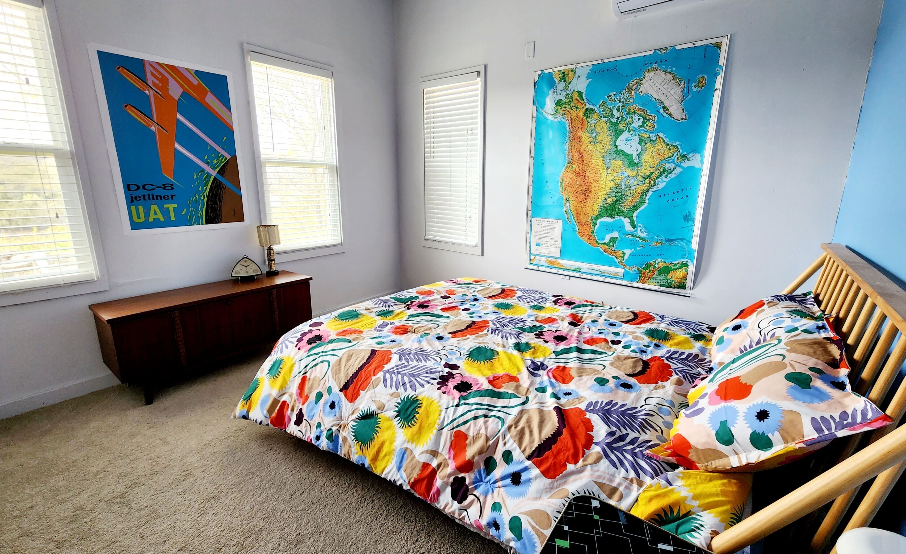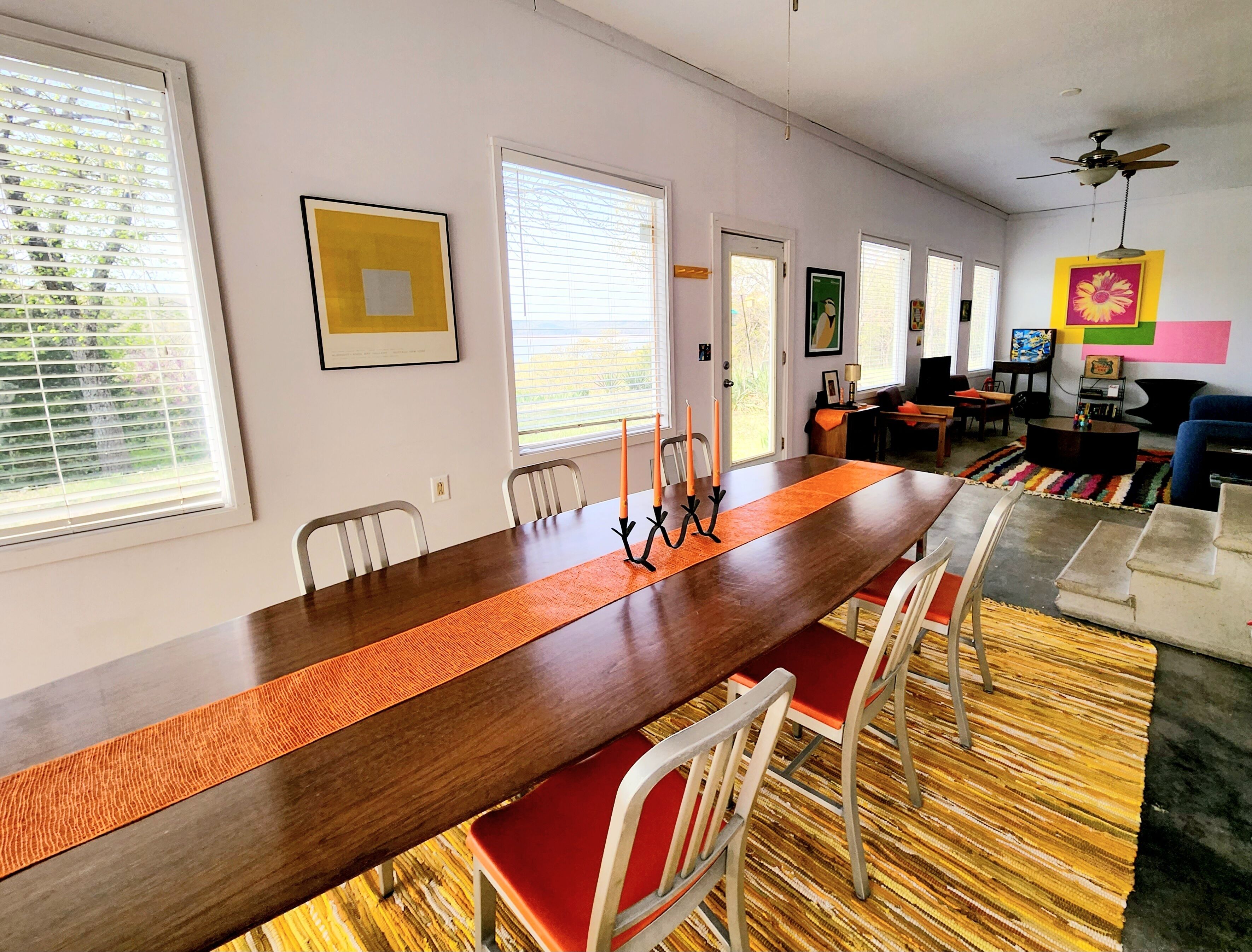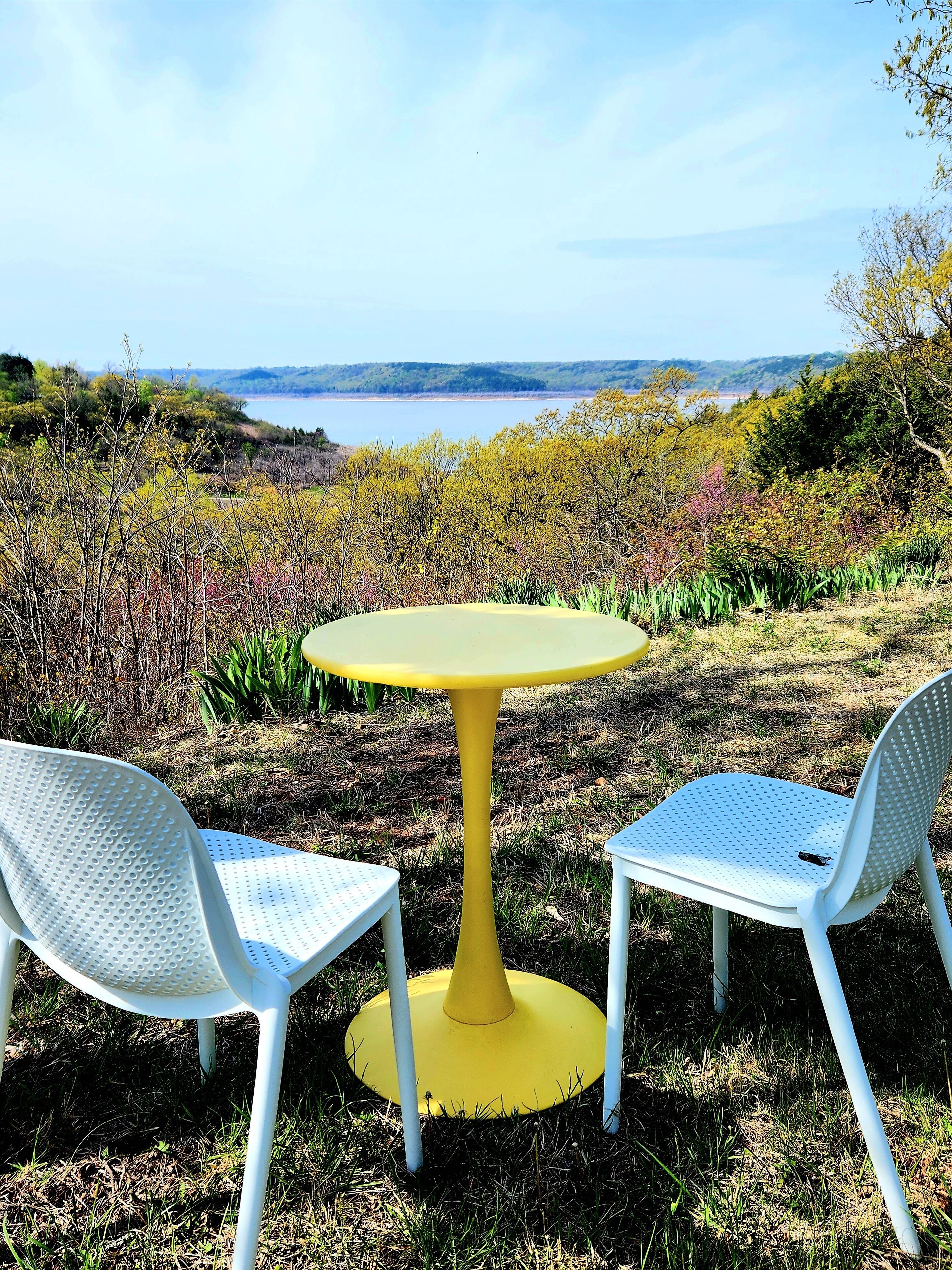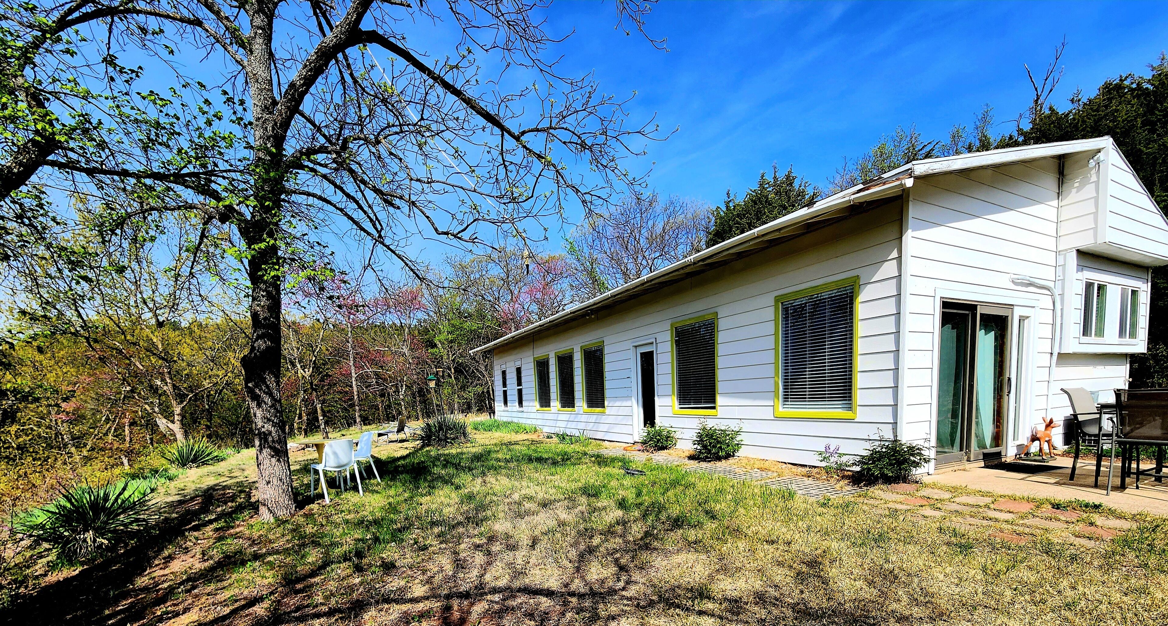 Flint Hills Lake House Tucked high in a canyon overlooking Tuttle Creek Lake, Bluff Cottage is the perfect place to unwind. Surrounded by trees, the house is private and tranquil. Have your morning coffee outside overlooking the lake while a lovely breeze blows, then walk down the hill to the lakeshore and dip your toes in the water, hunt for fossils (the shore is full of them!), or forage for driftwood. The interior of the home is bright, clean, colorful, and fun. The large, well-appointed kitchen is a perfect place to cook up whatever you fancy. The roomy and bright living and dining area offers gorgeous views of the lake, plenty of seating, Roku smart tv, dvd player, vintage pinball machine, and lots of games and books. Oh, and the internet is super high speed fiber-optic broadband, so you can seemlessly stream without buffering!The master bedroom has a super comfy queen bed and plenty of storage for your personal items. The second bedroom contains bunk beds designed for adults, storage, and a vaulted ceiling.The bathroom is small but stylish, with a tub and a very powerful shower.Located only 25 minutes from Manhattan, the drive out to the house through the northern Flint Hills is so beautiful! Stop at the dam or one of the scenic overlooks to take in the splendor of the prairie.PLEASE NOTE: The last 8 minutes of the drive are on a well maintained dirt road. T canyon road can be quite rugged. A high clearance vehicle is recommended. Low to the ground vehicles may bottom out.