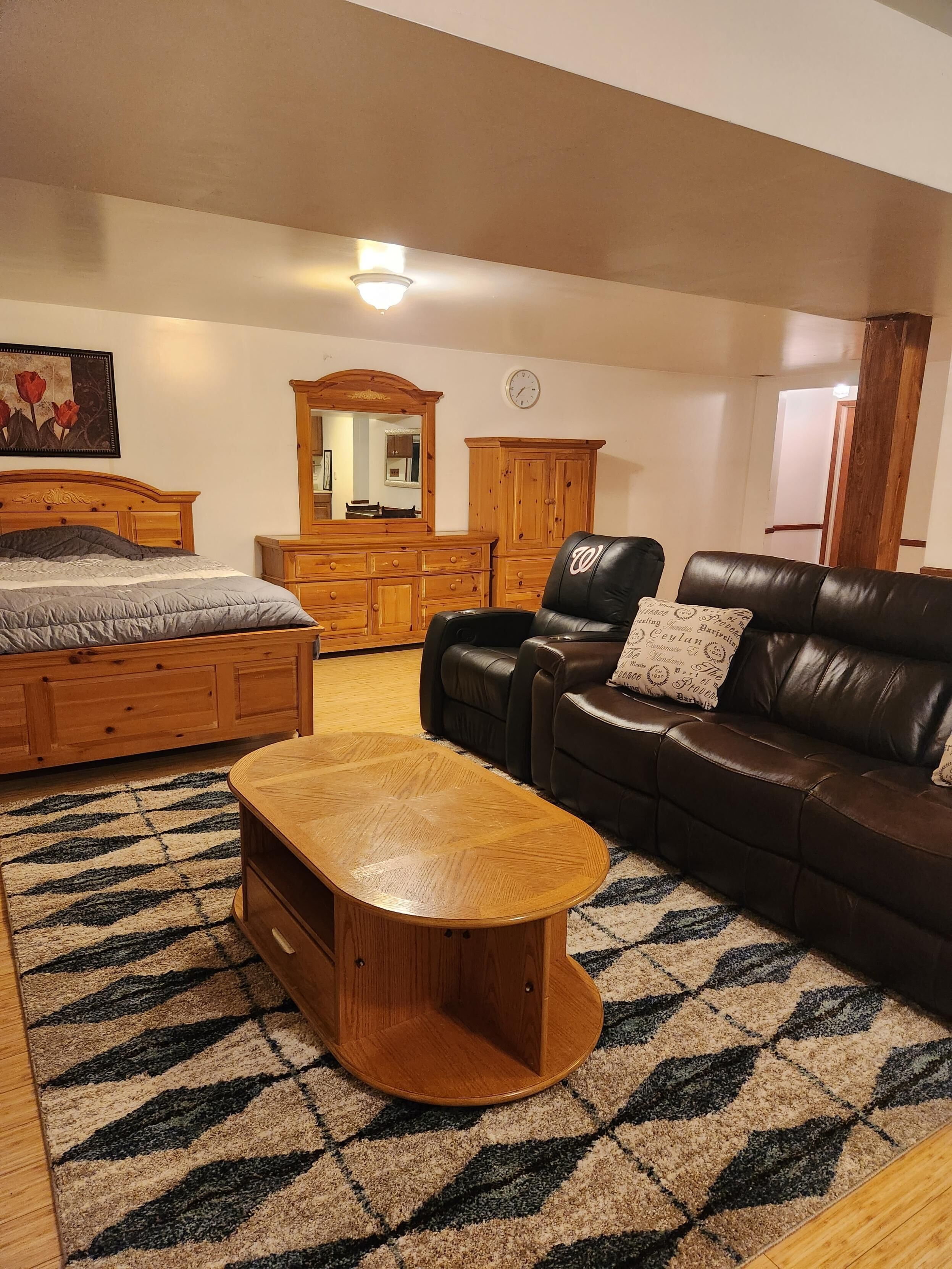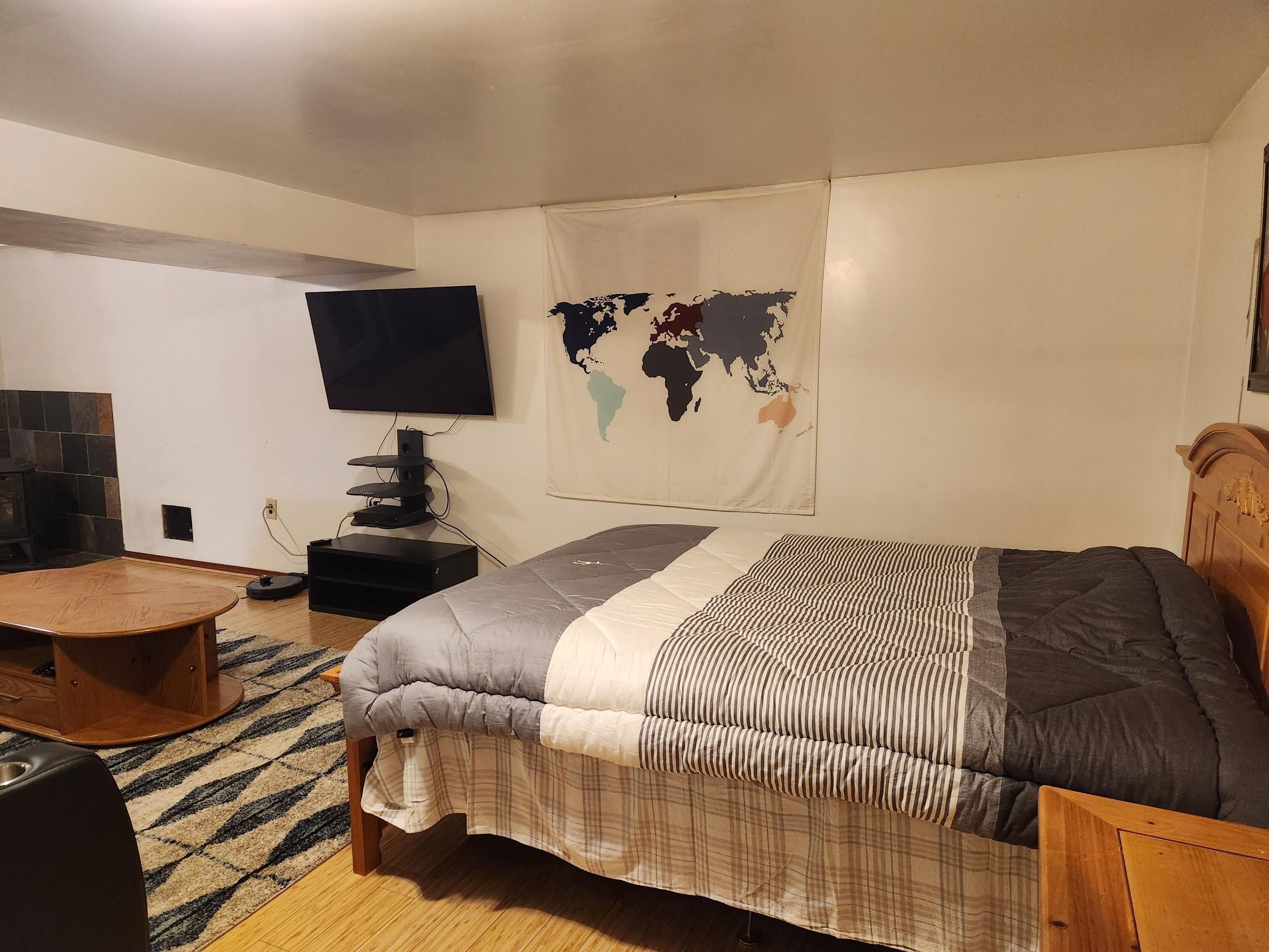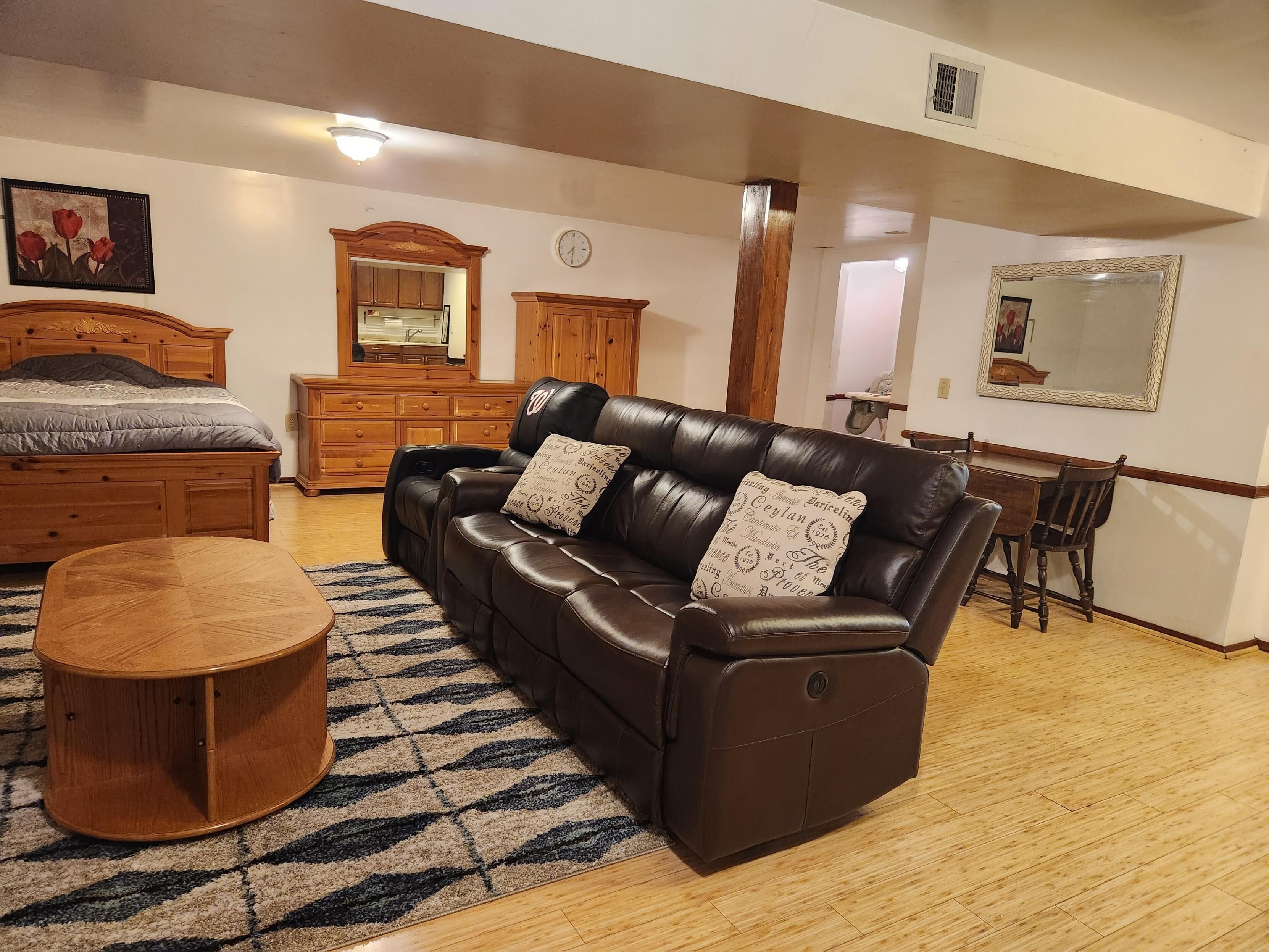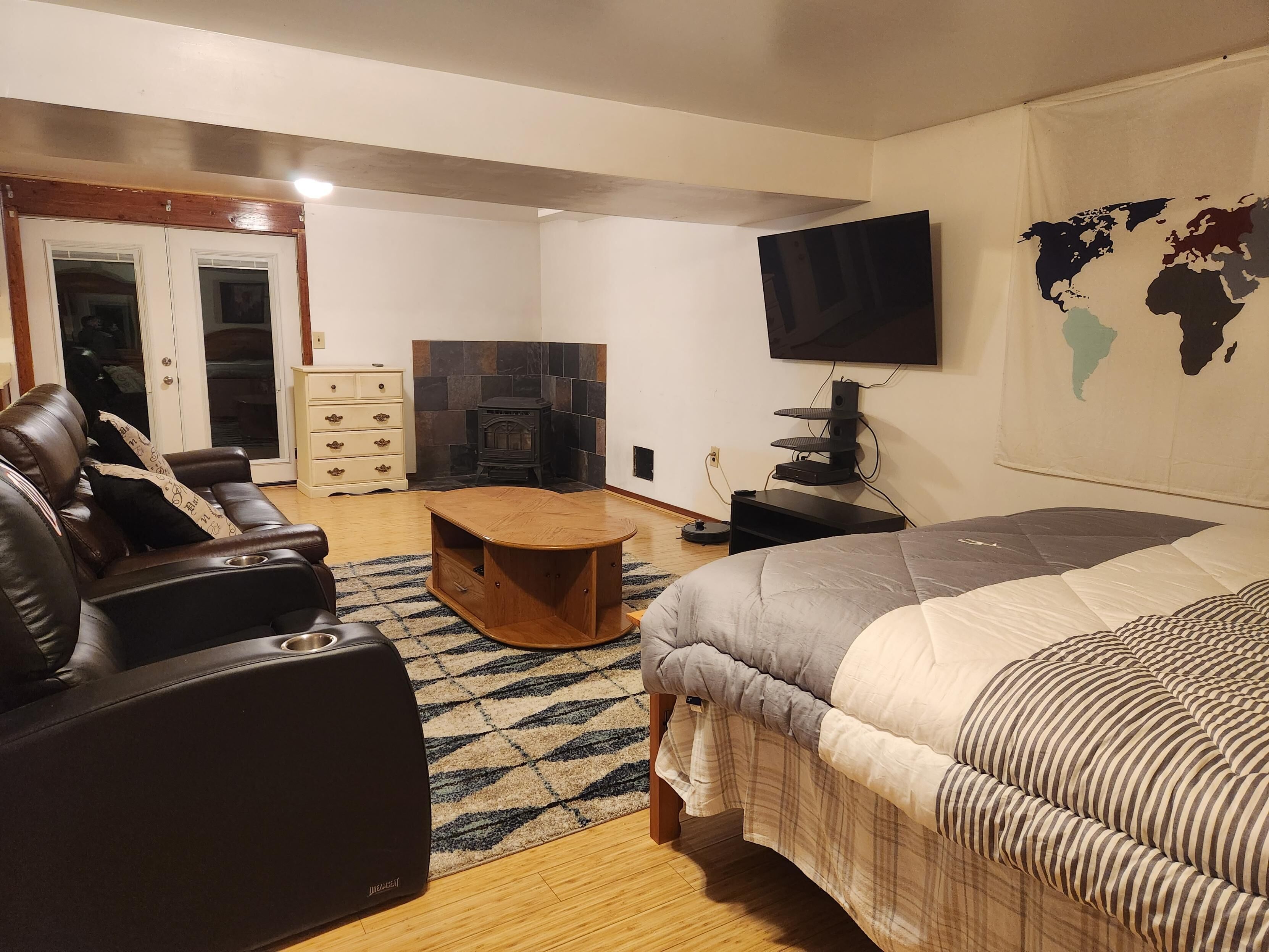 Studio w/3 beds, 1 Queen, two twin, couch, pellet stove, full amenities, shower. Spacious 900 sq foot private entrance basement with pellet stove, queen size bed, two single beds, couch, dresser and drawer, small table for eating or coffee, 55-inch LG TV with cable and streaming options, Keurig coffee maker with coffee provided. Leather couch, highchair, hairdryer, towels and linens provided, bat...