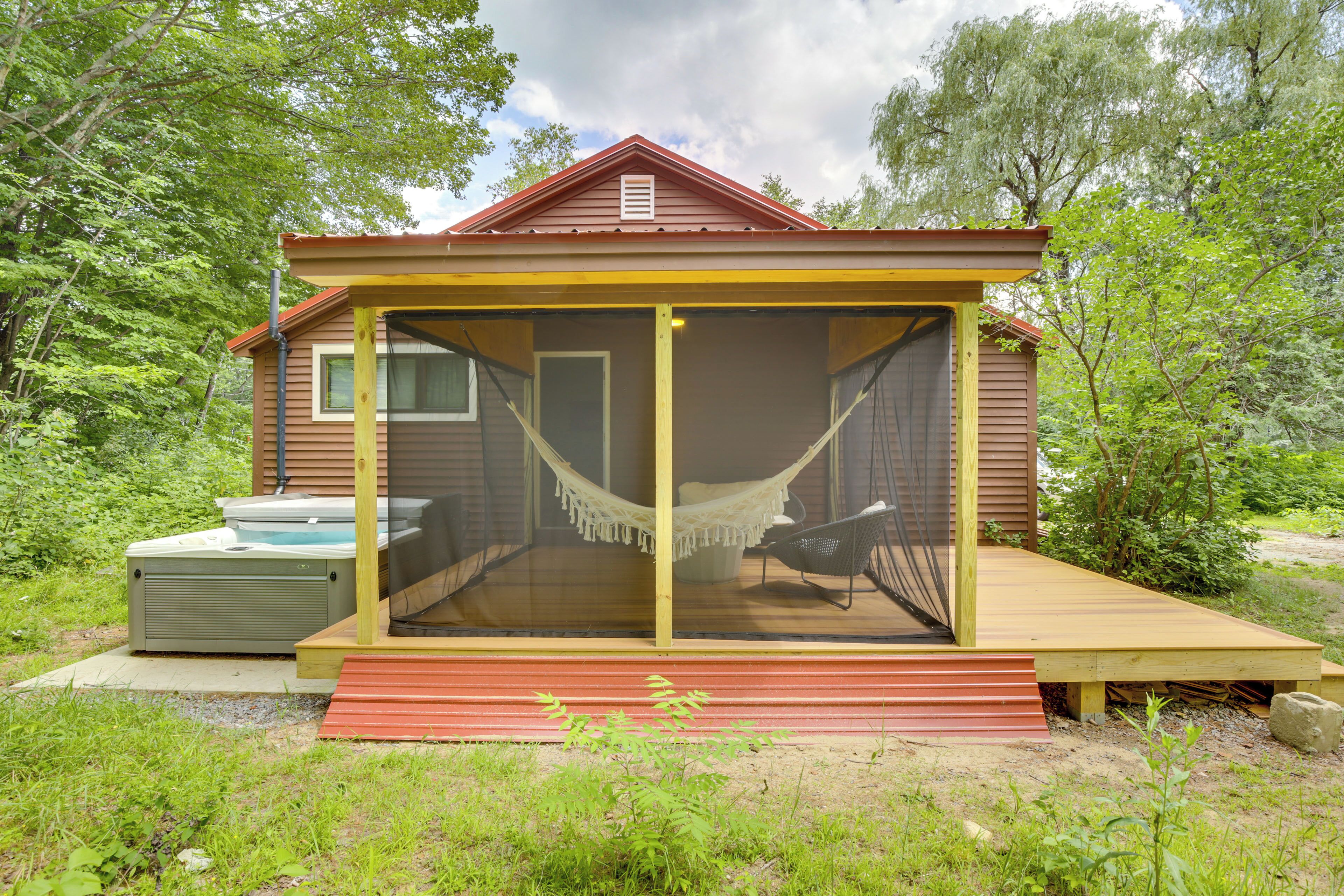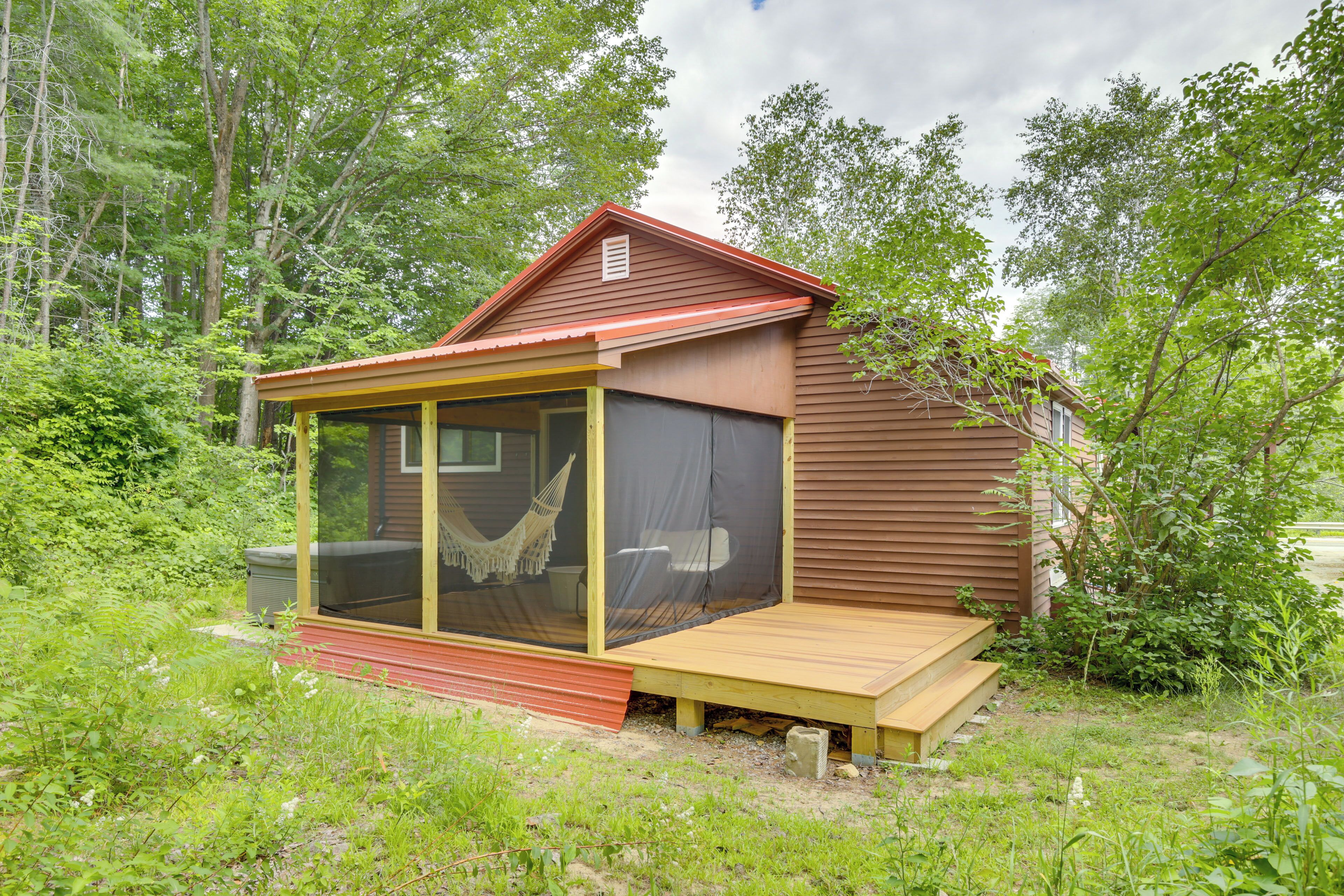 Gorgeous Sunday River Cabin w/ Saltwater Hot Tub! Traditional cozy cabin meets chic mid-century modern abode at this 3-bedroom, 1-bath vacation rental in Hanover, Maine. Within a short drive, choose to shred the slopes in winter, admire breathtaking foliage in autumn, or maybe visit in summer and hike, swim, and hunt for wild blueberries. When the day's adventures are complete, come home to warm u...