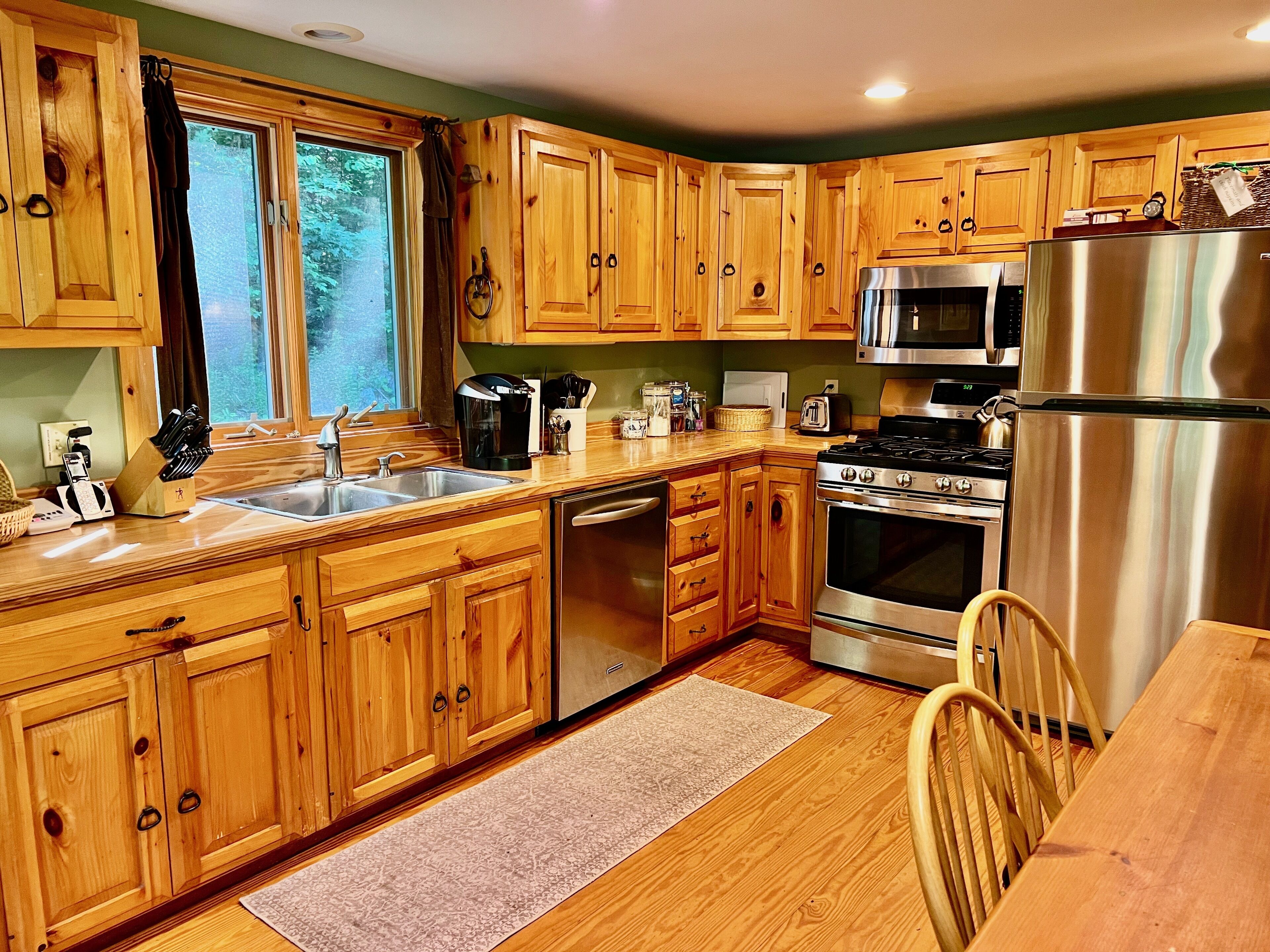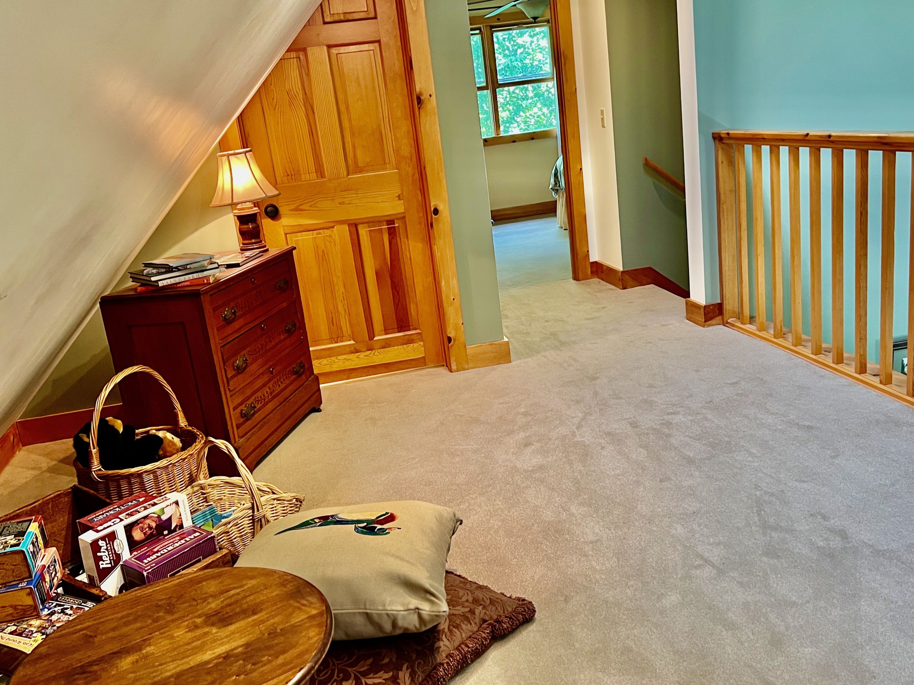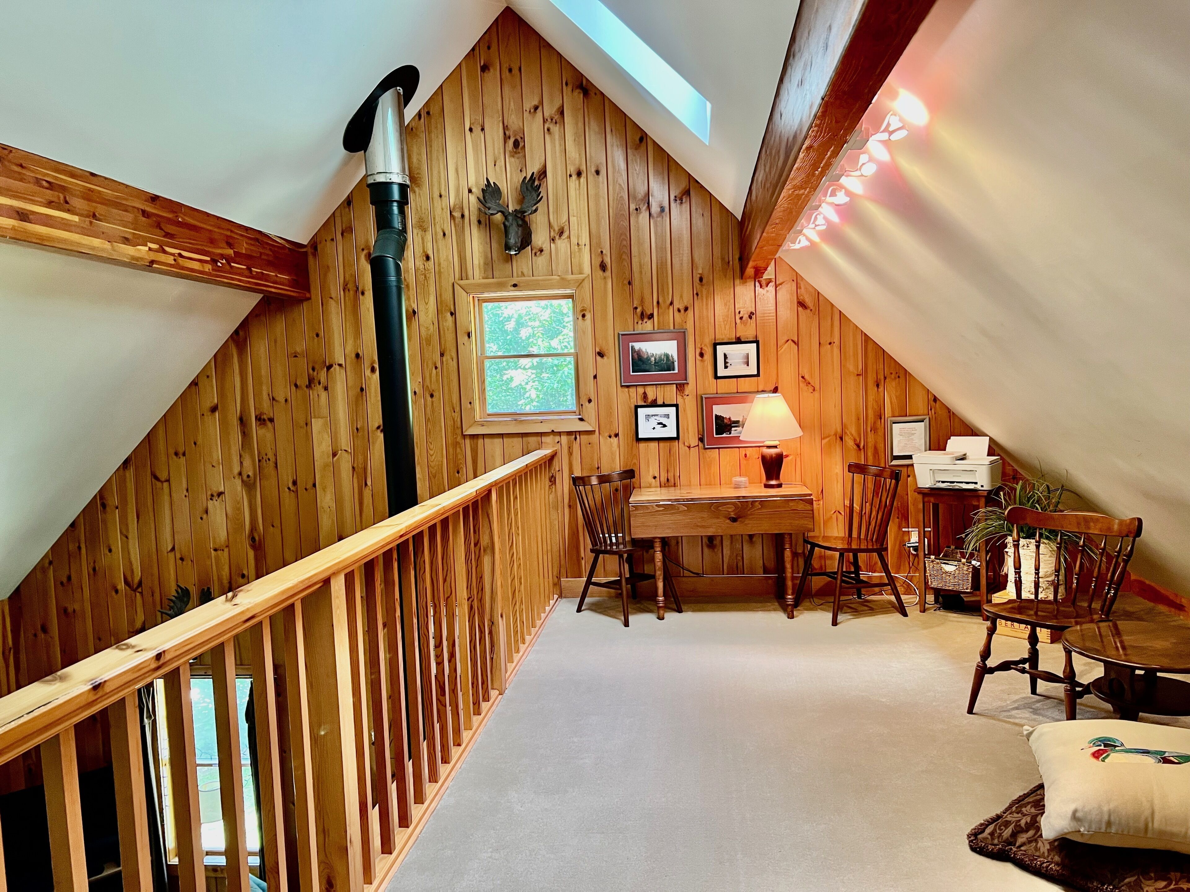 Charming Private Vacation Home - 15 Minutes to Sunday River The House on the Hill will not be available for reservations 2024 because of restorations due to a plumbing leak. Check back with us for 2025.This charming private retreat is nestled among Maples, Birches, and Firs with a view of Howard Pond. The tastefully decorated three-bedroom, two-bath cottage sleeps six with two queen beds and two twin beds. The inviting open living/dining/kitchen features a vaulted cathedral ceiling with roof windows that allow light to fill the home. The 6' pine dining table accommodates everyone. The primary suite with the adjoining loft living area is located on the second floor. The pine paneling, cabinets, and pine wood floors add to the warmth and ambiance of this Maine woods retreat. There will be the slightest sigh (ahh) of approval and excitement as you enter this gracious, welcoming environment. This is a place that can restore your soul. After a day full of activity, you can sit by the fire and watch the leaves or the snowflakes fall. Relax and while away the hours in the rocking chairs on the 8'wide farmers' porch that spans the front of the house.Howard Pond is a pristine Maine pond that prohibits noisy watercraft and is home to a loon family. There is a public swimming area and a dock near the dam. Adventurous hiking --including the Appalachian Trail & other hikes in the White mountains-- and quiet walks are just outside your door. You may even see a moose!Downhill and cross-country skiing, snowshoeing, ice skating, snowmobiling is all within 10 or 15 minutes of the house. The Sunday River Golf Club is one of the premier courses in New England. The Bethel Inn and Country Club also provides a challenging 18-hole course.Minutes away from the Androscoggin River, canoeing, kayaking, and guided trips are within easy access.Keywords: skiing, snowboarding, cross-country skiing, golfing, house, canoeing, hiking, swimming, fishing, relaxing, private, romantic, non-smoking, charming, cottage