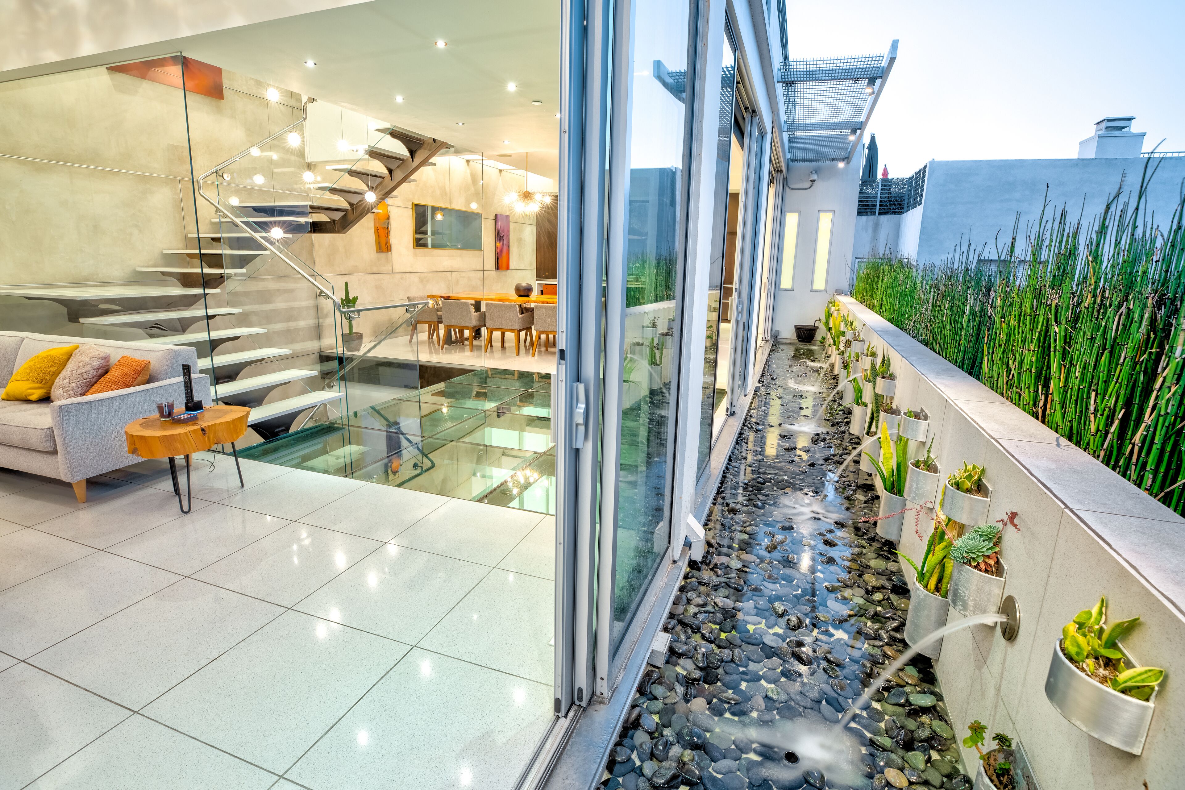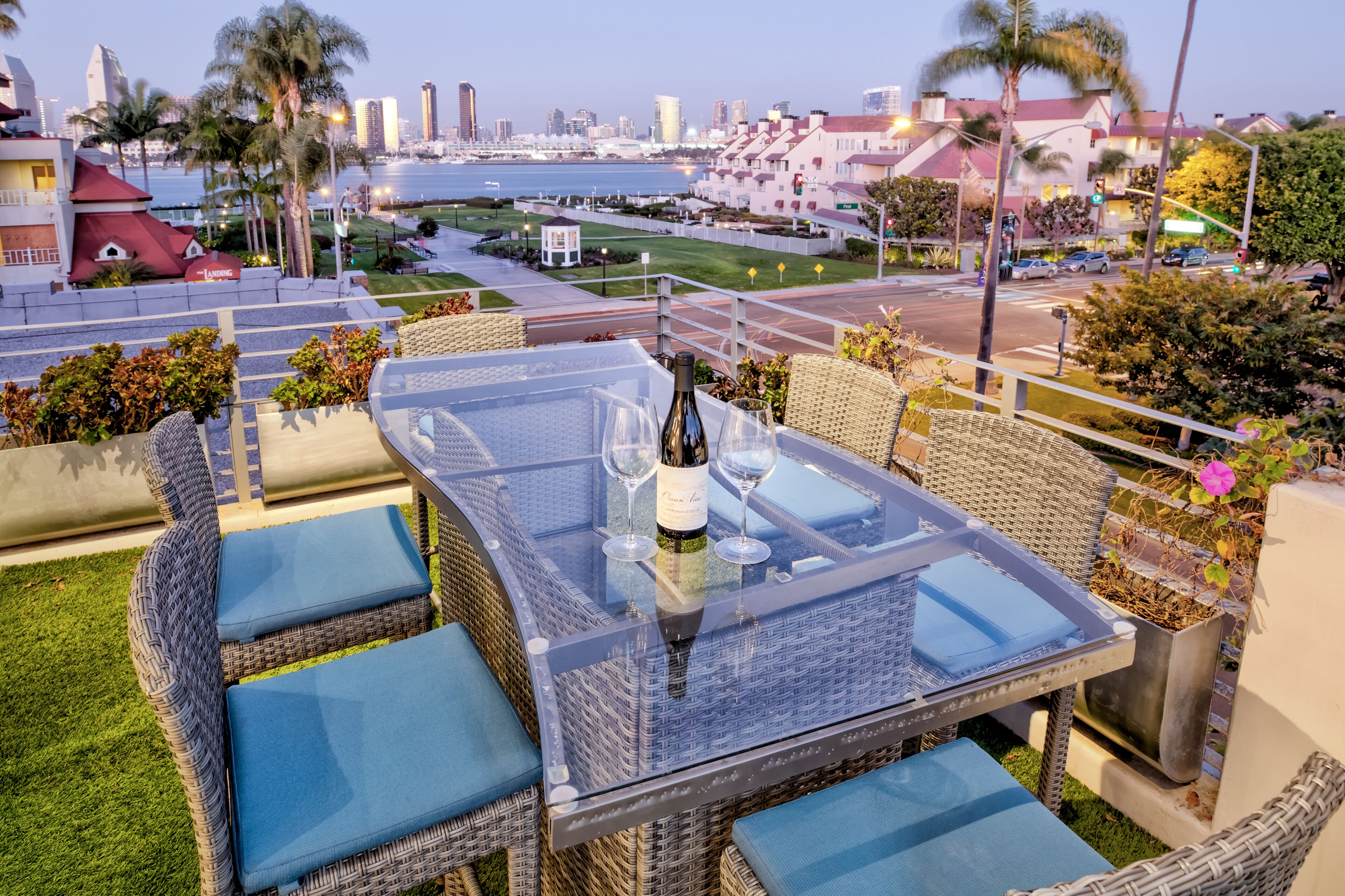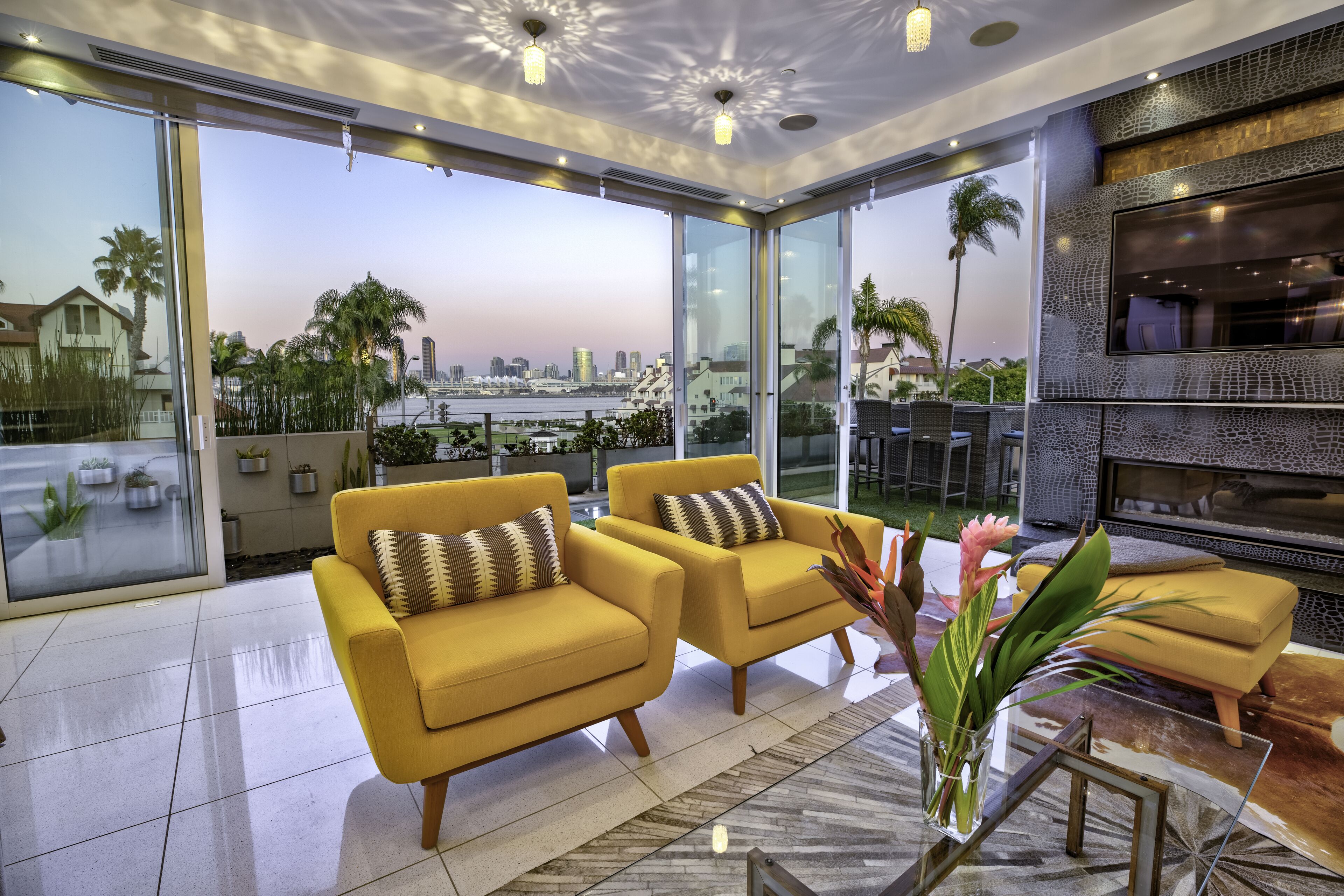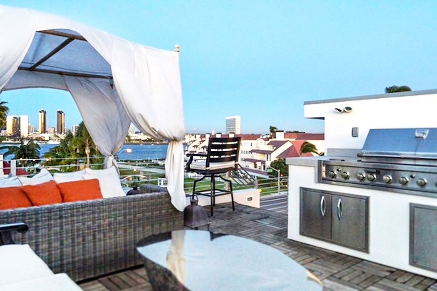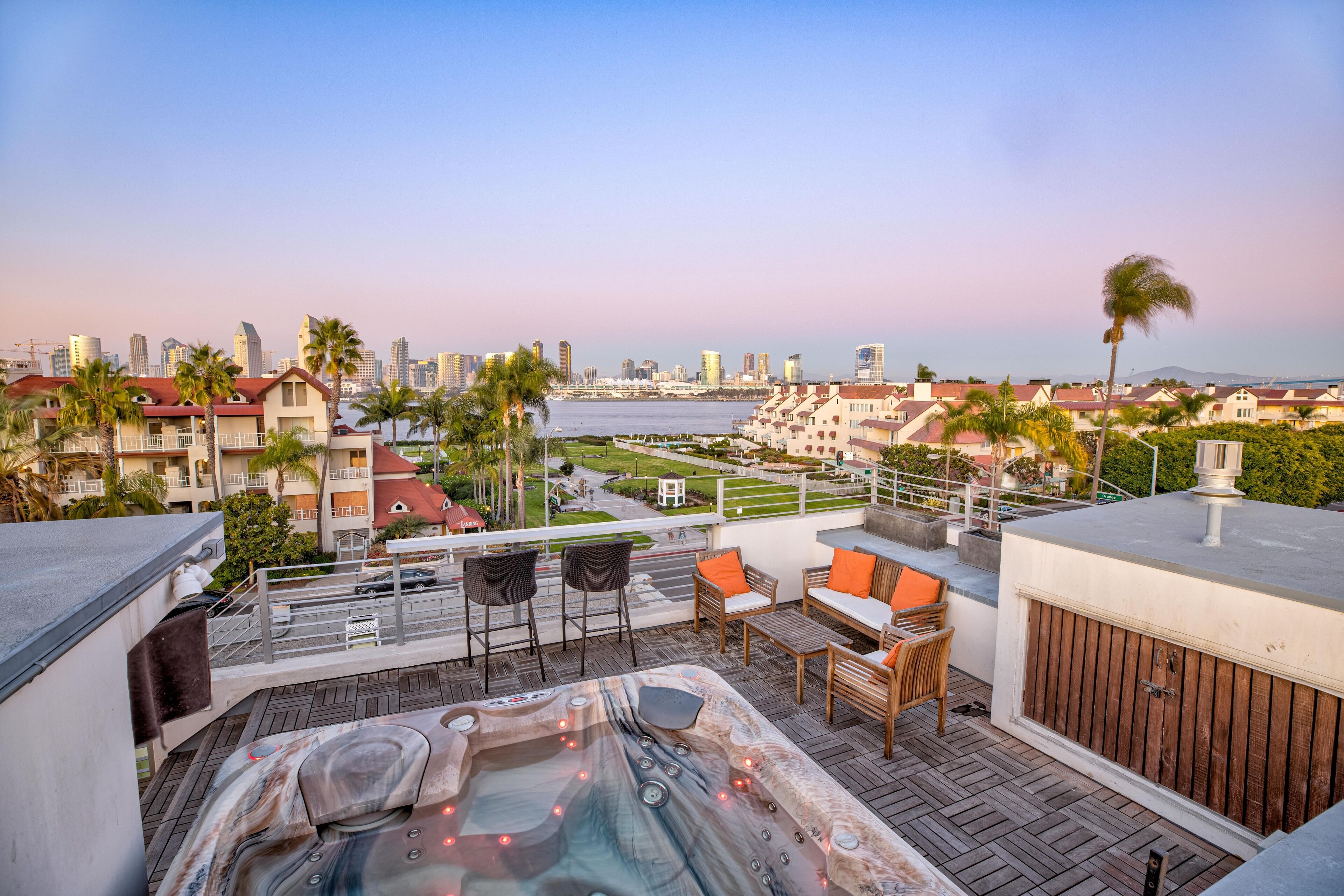 The Glass Haus Ultra Modern Luxury Retreat on Coronado Island Exquisite modern luxury on Coronado Island! Steps from bayside beach, parks, sushi, a market and so much more. An architectural and design masterpiece with sliding glass walls and glass floors! Enjoy true luxury living with constant captivating views of the San Diego skyline, the San Diego Bay, the Coronado Bridge and fireworks! Steps to the ferry to Convention Center, Gas Lamp & Seaport Village. Ride one of our beach cruiser bikes to the Surf or walk across the street for a Paddle on the Bay.Walk up the sleek formal entry that leads to the second floor foyer and spectacular floating stairway. Delight in the open living space, high ceilings, white granite tile, and floor to ceiling glass walls that completely open for an indoor/outdoor lanai living experience. The living area features a custom floor to ceiling warming fireplace, integrated flat screen with Apple TV, Blue-Ray and sound system with Bluetooth and Auxiliary capabilities. Don't forget to look through the Starfire glass floor at your friends and family on the lower levels!Enjoy the gourmet chef's kitchen complete with dual ovens, a wonderful gathering island, kitchen TV, and grain matched solid walnut cabinets. Sit down for dinner and spectacular views from the custom designed dining room table (seats 10 comfortably). The living/dining area space flows to a fabulous finished grassy patio area, floating water fountain & botanical feature.Continue up to the fourth level roof top which offers 360' panoramic views of the entire Island, City/Coronado Bridge/Coronado Shores/Point Loma/Mission Bay. Soak in the Jacuzzi Spa while simultaneously watching ships float by and the beautiful sunset. The rooftop is a tranquil spa-like space with outdoor lounge bed, complete outdoor kitchen & grill perfect for entertaining, outdoor bar seating, outdoor couch, wood floor tiles, and a portable Sonos sound system.The large bedrooms on the second floor have spacious closet systems. The guest bath features beautiful Italian tile tub and shower. Full size washer/dryer on second level for your convenience. The Master Bedroom features artistic 1" glass swinging doors, custom designer bath with large steam shower and tub, and large custom walk-in closet.Kids and adults alike will love the movie room/game room on the first floor! Equipped with surround sound stereo system, 70 inch TV, foosball, ping-pong, air hockey tables, queen size murphy bed and full bathroom. Parking is simple with a secured private parking space in gated rear courtyard (plus plenty of street parking). Double entrances both from street front and rear courtyard.With the attention to detail in the custom design, finishes, and pop art pieces throughout our home, you are sure to love your stay!Please follow on Instagram @the_glass_haus_coronado to see more pics and updates