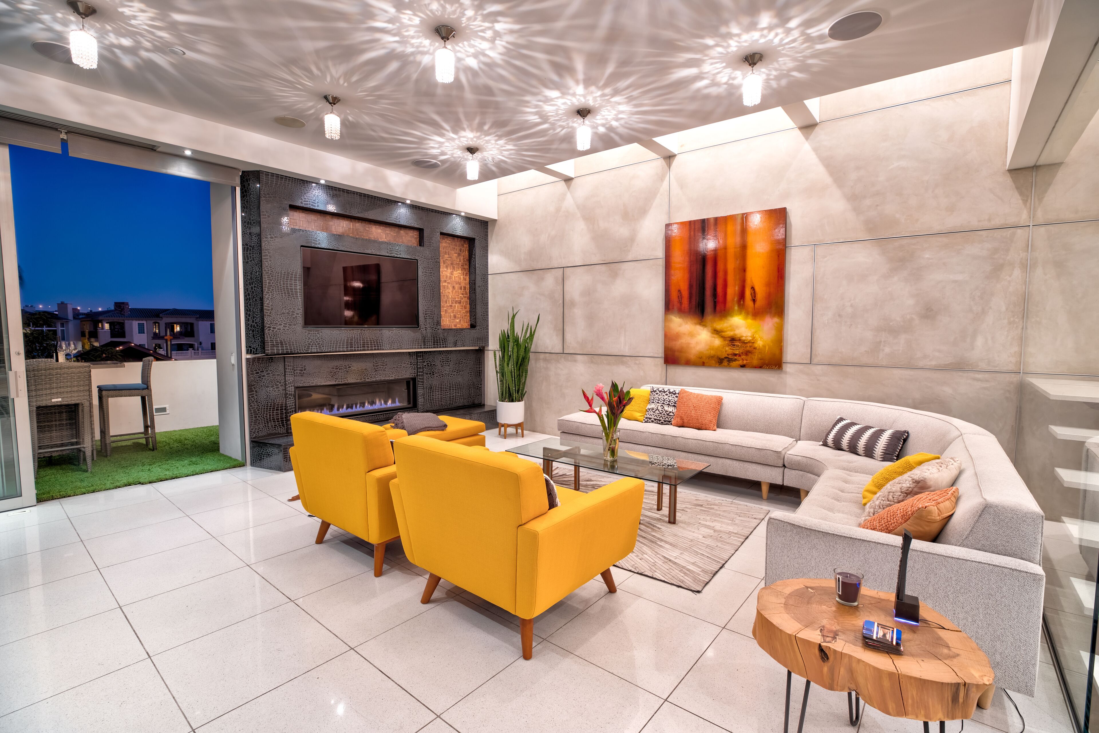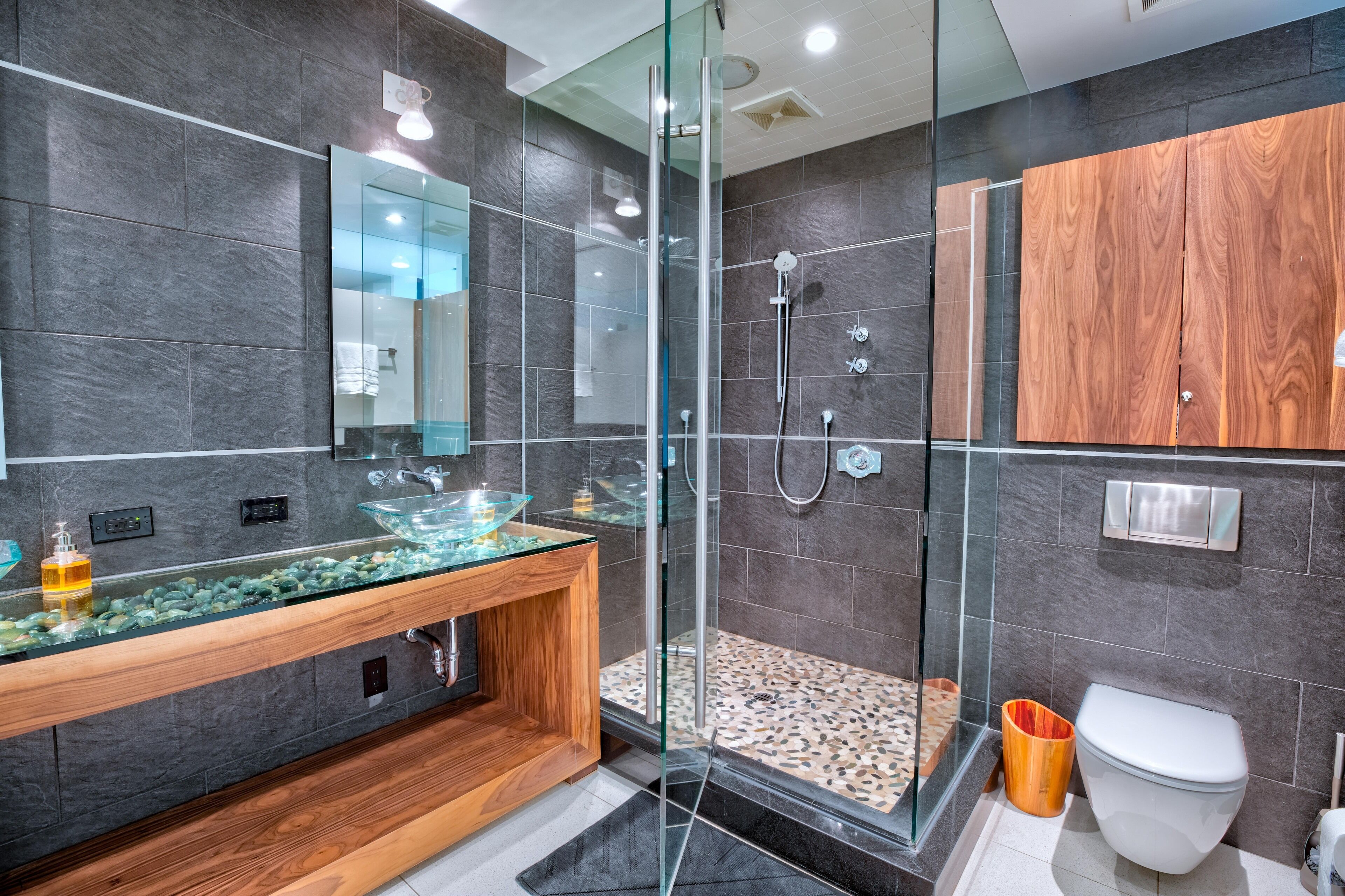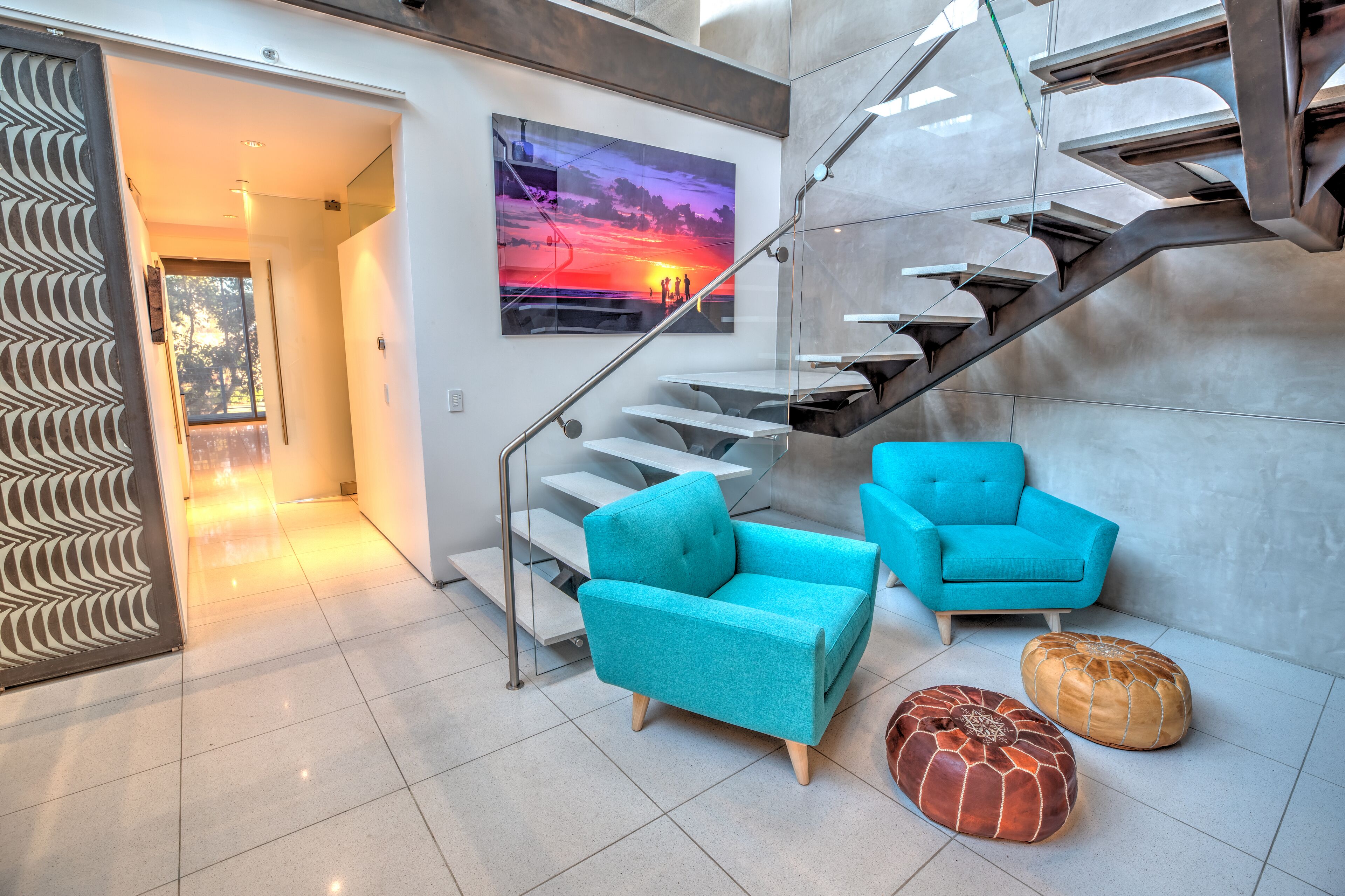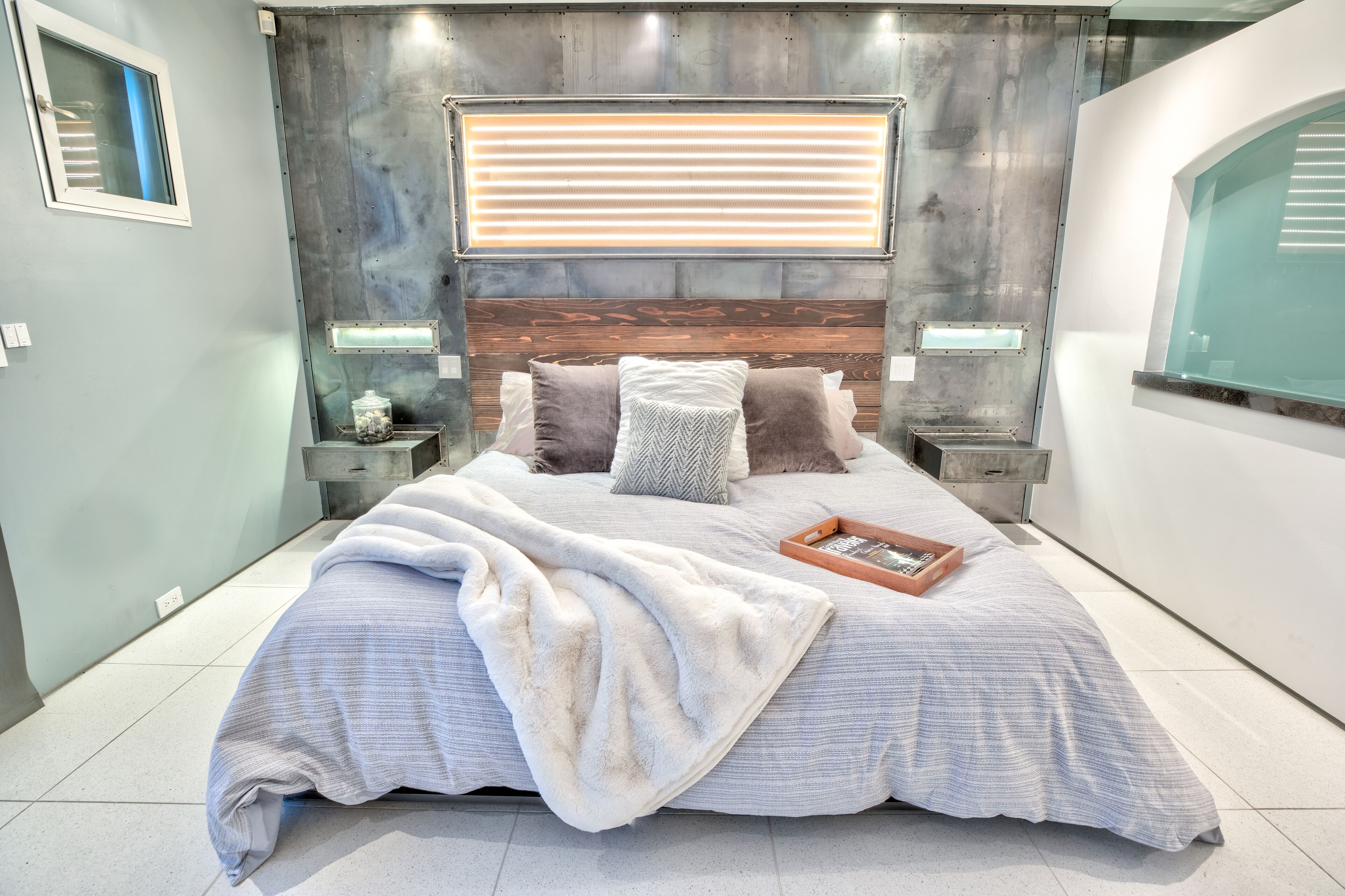 The Glass Haus Ultra Modern Luxury Retreat on Coronado Island Exquisite modern luxury on Coronado Island! Steps from bayside beach, parks, sushi, a market and so much more. An architectural and design masterpiece with sliding glass walls and glass floors! Enjoy true luxury living with constant captivating views of the San Diego skyline, the San Diego Bay, the Coronado Bridge and fireworks! Steps to the ferry to Convention Center, Gas Lamp & Seaport Village. Ride one of our beach cruiser bikes to the Surf or walk across the street for a Paddle on the Bay.Walk up the sleek formal entry that leads to the second floor foyer and spectacular floating stairway. Delight in the open living space, high ceilings, white granite tile, and floor to ceiling glass walls that completely open for an indoor/outdoor lanai living experience. The living area features a custom floor to ceiling warming fireplace, integrated flat screen with Apple TV, Blue-Ray and sound system with Bluetooth and Auxiliary capabilities. Don't forget to look through the Starfire glass floor at your friends and family on the lower levels!Enjoy the gourmet chef's kitchen complete with dual ovens, a wonderful gathering island, kitchen TV, and grain matched solid walnut cabinets. Sit down for dinner and spectacular views from the custom designed dining room table (seats 10 comfortably). The living/dining area space flows to a fabulous finished grassy patio area, floating water fountain & botanical feature.Continue up to the fourth level roof top which offers 360' panoramic views of the entire Island, City/Coronado Bridge/Coronado Shores/Point Loma/Mission Bay. Soak in the Jacuzzi Spa while simultaneously watching ships float by and the beautiful sunset. The rooftop is a tranquil spa-like space with outdoor lounge bed, complete outdoor kitchen & grill perfect for entertaining, outdoor bar seating, outdoor couch, wood floor tiles, and a portable Sonos sound system.The large bedrooms on the second floor have spacious closet systems. The guest bath features beautiful Italian tile tub and shower. Full size washer/dryer on second level for your convenience. The Master Bedroom features artistic 1" glass swinging doors, custom designer bath with large steam shower and tub, and large custom walk-in closet.Kids and adults alike will love the movie room/game room on the first floor! Equipped with surround sound stereo system, 70 inch TV, foosball, ping-pong, air hockey tables, queen size murphy bed and full bathroom. Parking is simple with a secured private parking space in gated rear courtyard (plus plenty of street parking). Double entrances both from street front and rear courtyard.With the attention to detail in the custom design, finishes, and pop art pieces throughout our home, you are sure to love your stay!Please follow on Instagram @the_glass_haus_coronado to see more pics and updates