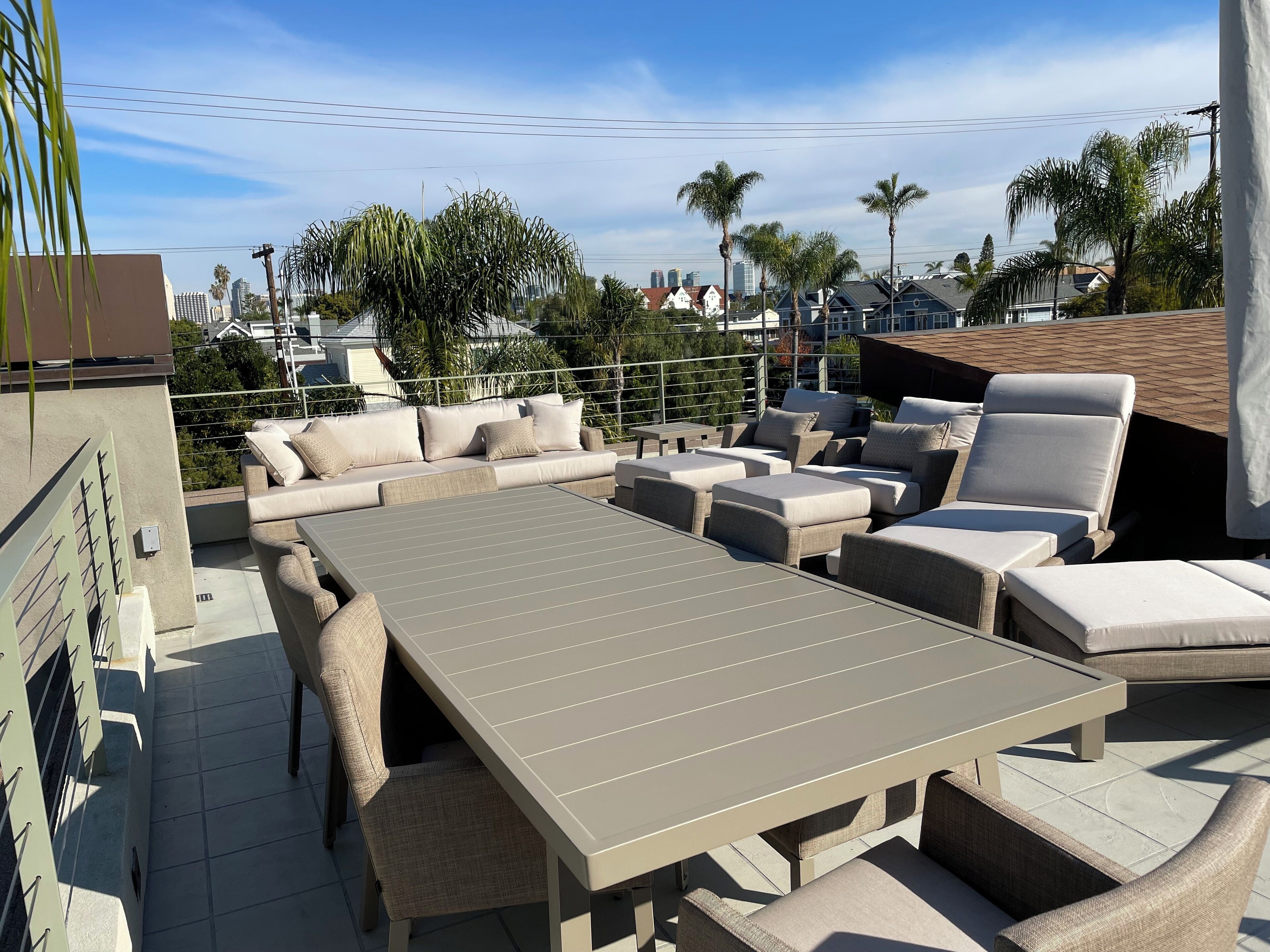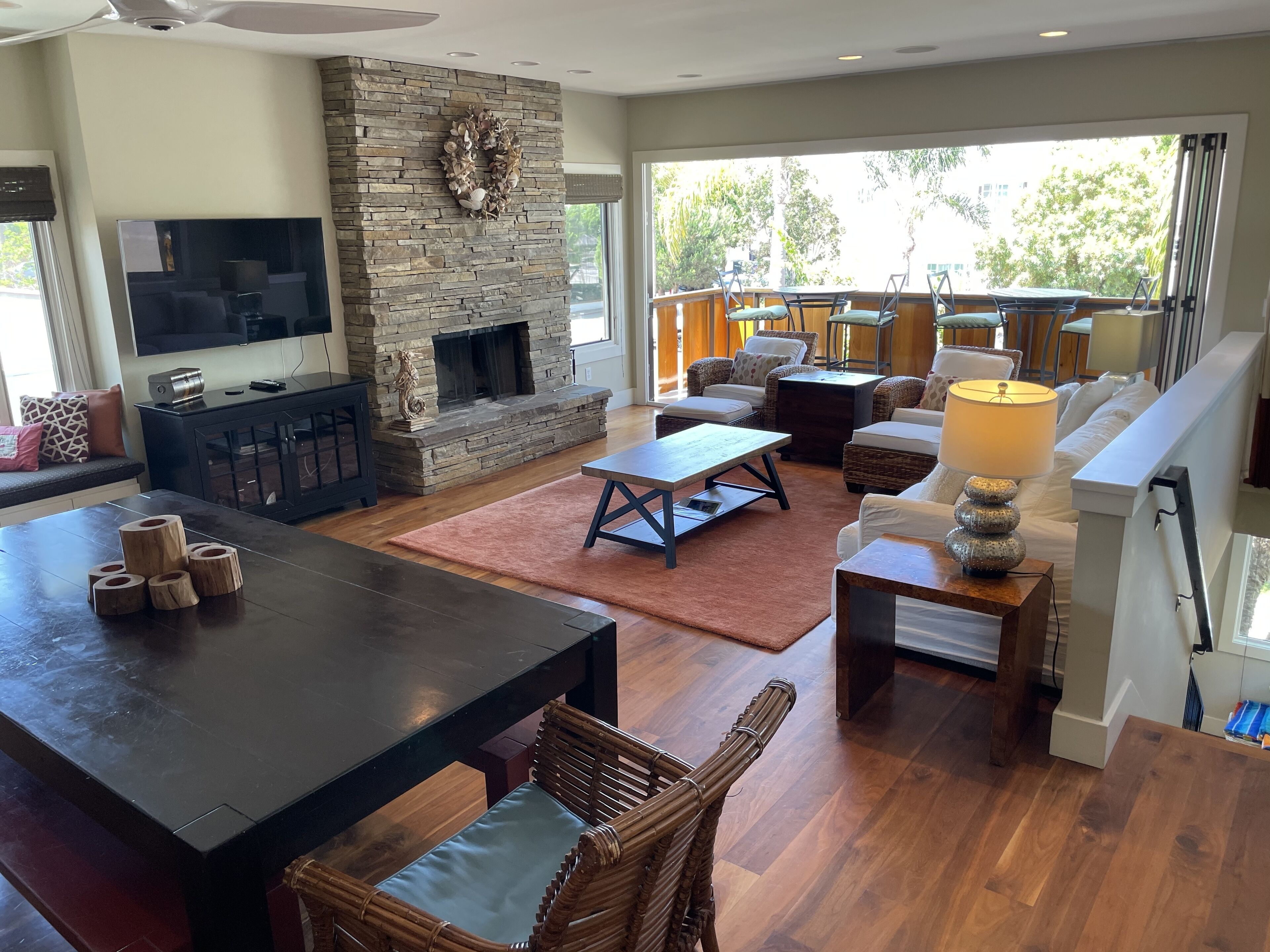 New Beautiful, Modern House with Huge Roof Top Deck & Balcony Beautiful, modern tri-level home, centrally located with a large roof top deck with gas fireplace, gas bbq and refrigerator. Dining table and lounge chairs are strategically placed for best day and night time views of the city skyline and Coronado bridge.Four cruiser bikes are available for your use while on the island along with lots of beach chairs, beach umbrella, boogie boards and a picnic table.The great room has a disappearing wall of glass that opens to a large balcony. It is perfect for large gatherings and great conversation. Kitchen, dining and balcony, all have views of the stone fireplace place and television. The kitchen is large and perfect for multiple cooks to prepare their dishes. Plenty of seating is available, either at the island, at the dining table, in the club chairs and couch or outside on the balcony.A second television is in the master bedroom.Four large bedrooms each with either a king or queen sized bed. Two have their own private bathrooms. A large Jack and Jill bathroom with dual sinks is available on the first level for the 3rd and 4th bedroom.If you need baby equipment, this company can provide clean and safe high chairs, strollers, beds...ect and will deliver and remove them at the end of your stay. https://www.babyquip.com/a/gz62ahKeywords: New, large, clean, modern, lots of indoor/outdoor areas, centrally located,
